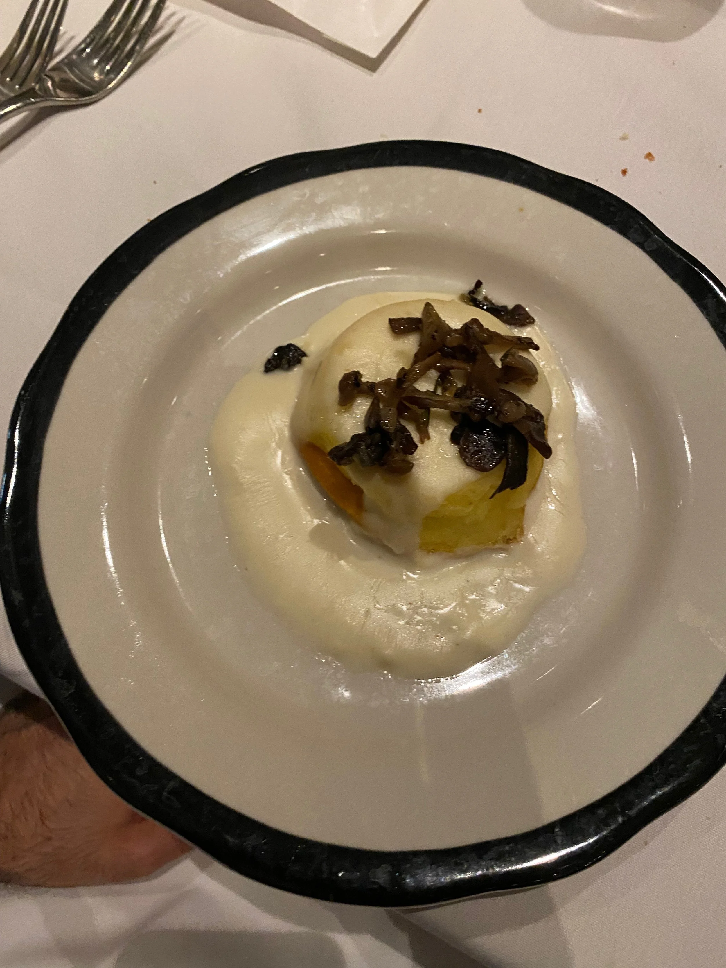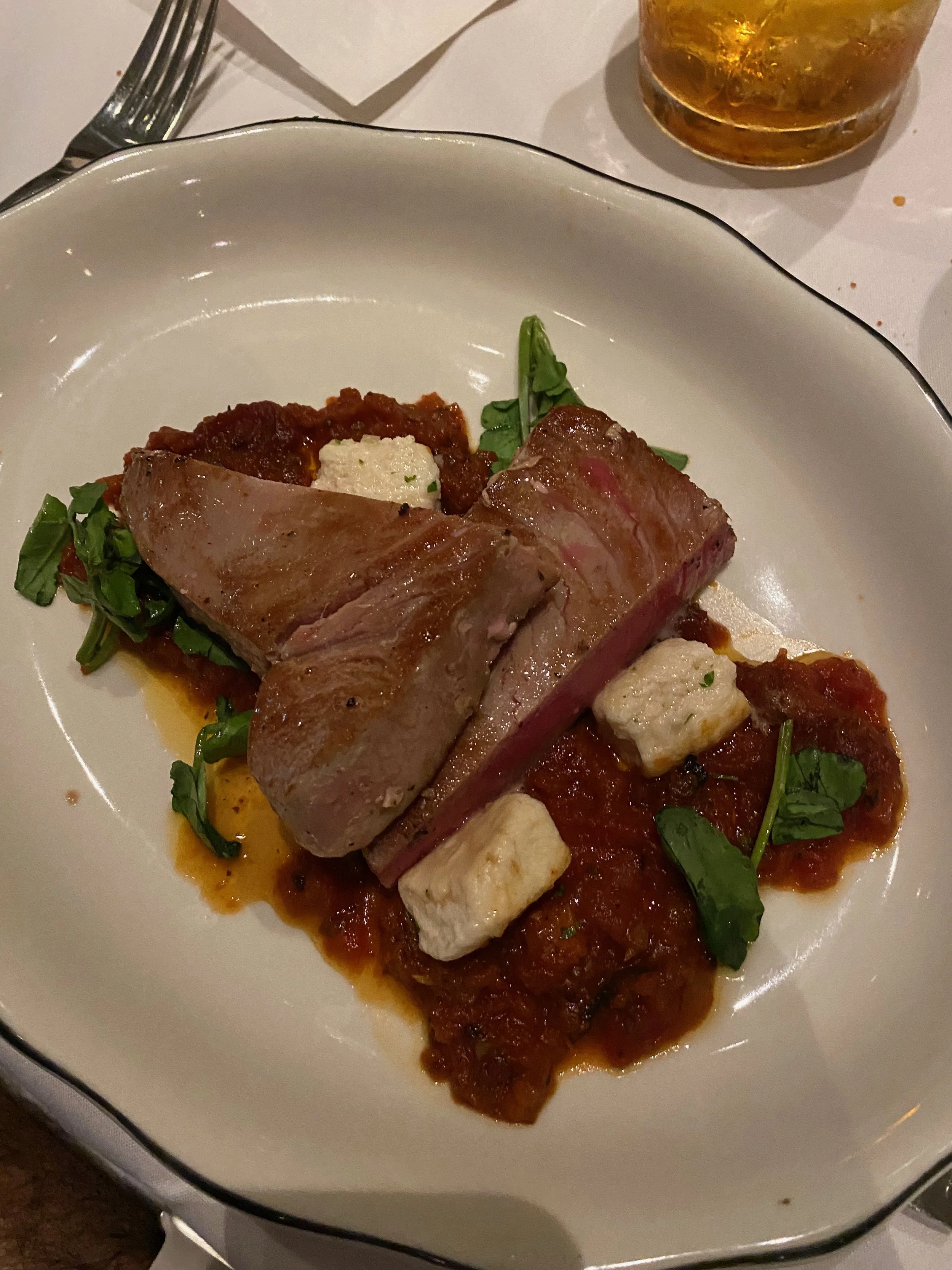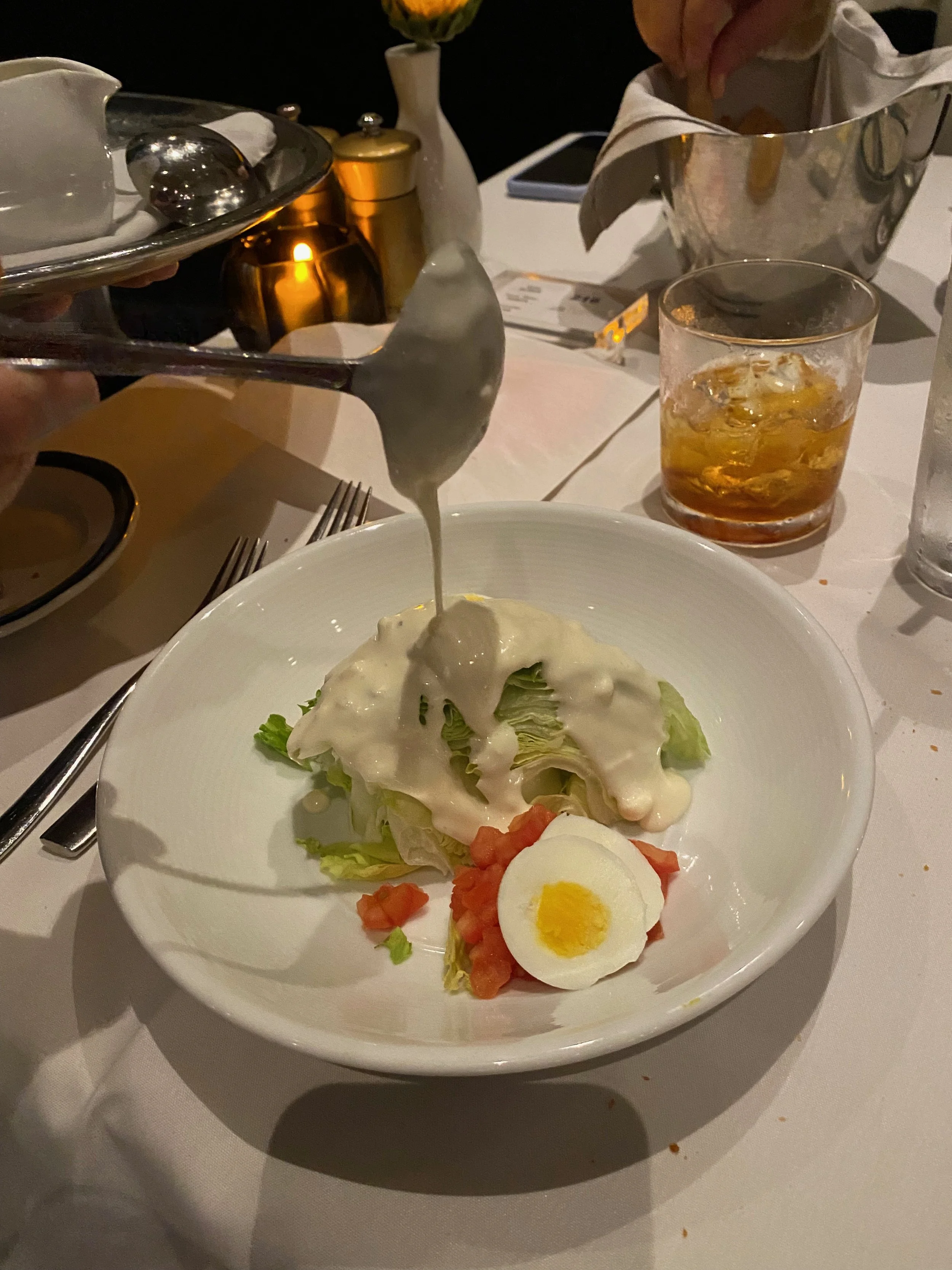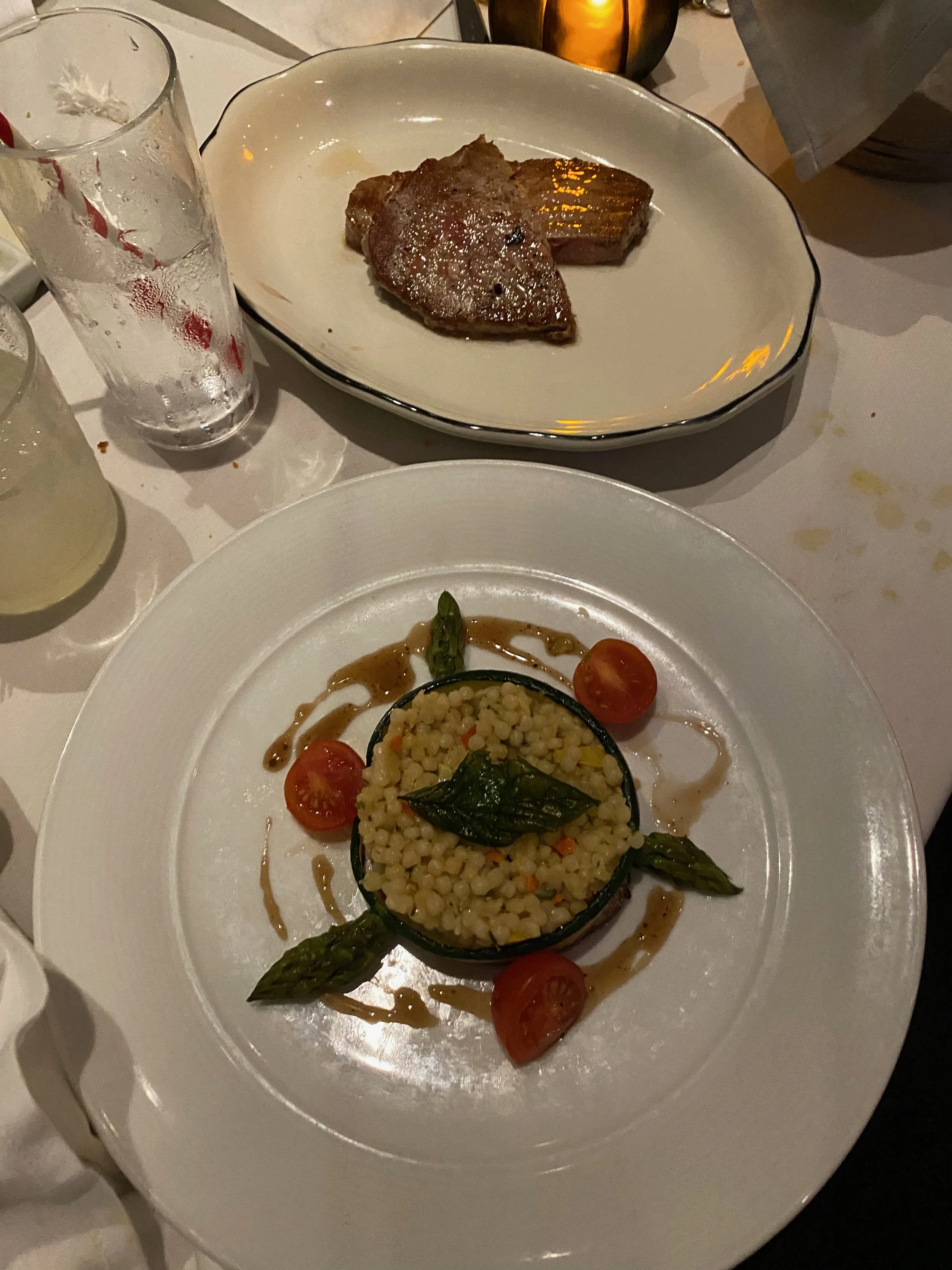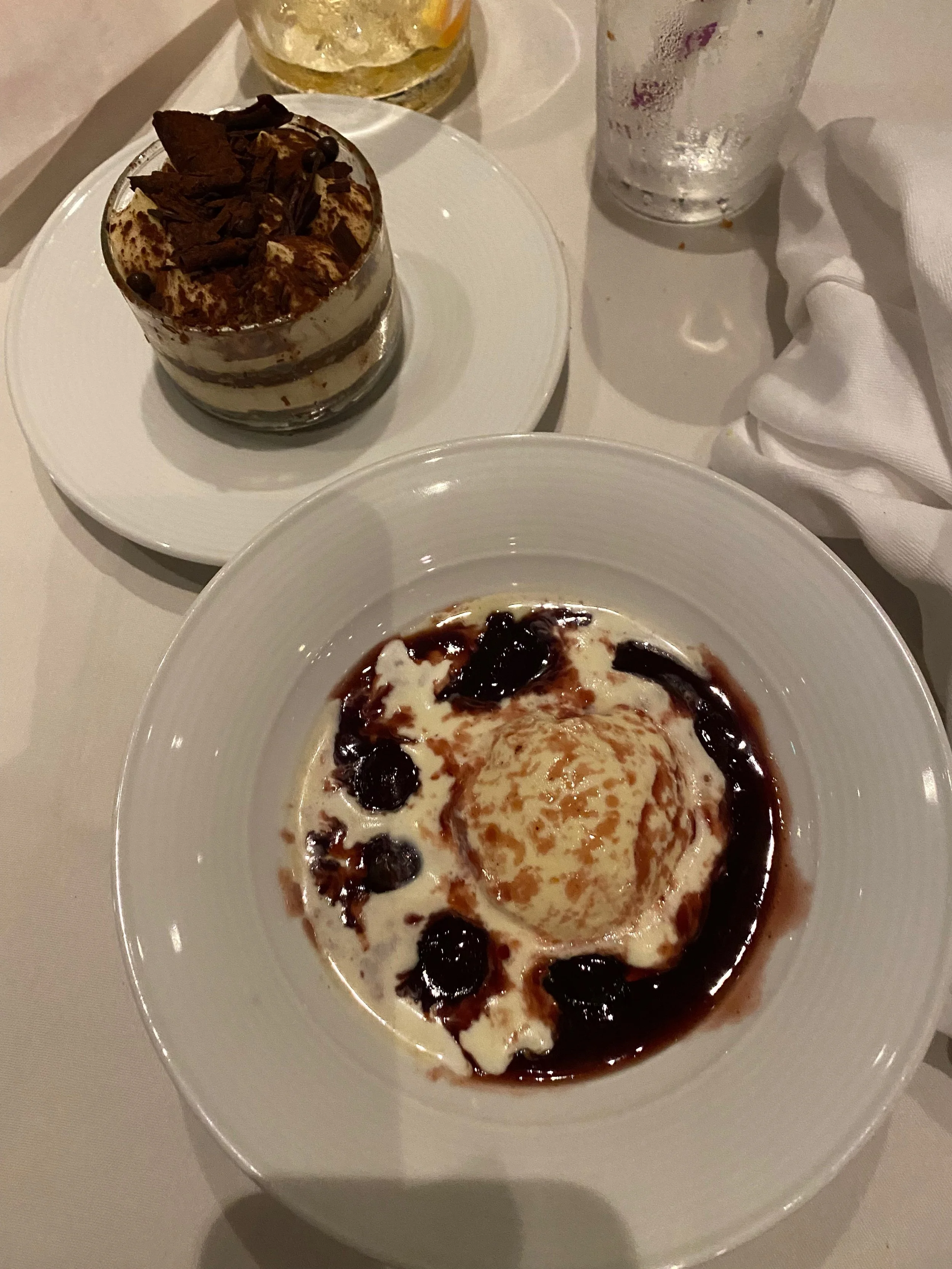 Tonight’s dinner was in the Tuscan dining room. There are four different main dining rooms, each with a different theme – each one serves the same daily menu as well as a menu that’s unique to that dining room. The dining room was pretty empty so we got a large table away from the few other people who were there. I had butternut squash soup, grilled tuna, and a cous cous thing. For dessert I had a strawberry angel food cake thing. Tzvi had a cheese soufflé thing with mushrooms, a wedge salad with blue cheese and grilled tuna. For dessert Tzvi had some kind of flambé cherry thing with ice cream and a tiramisu.