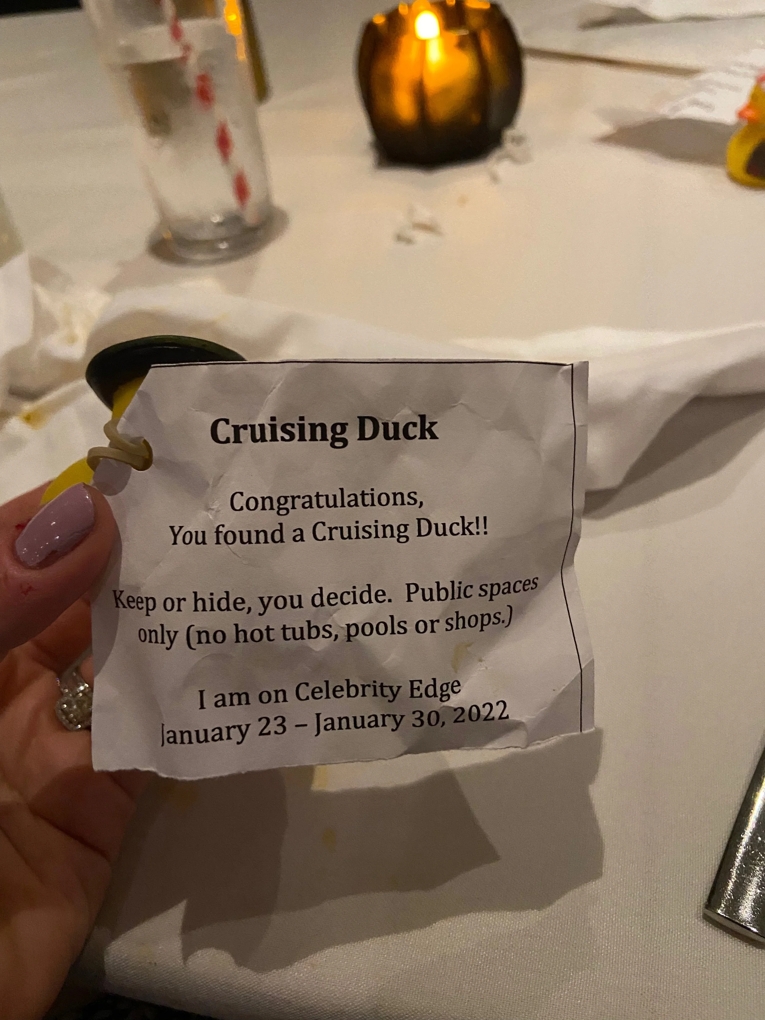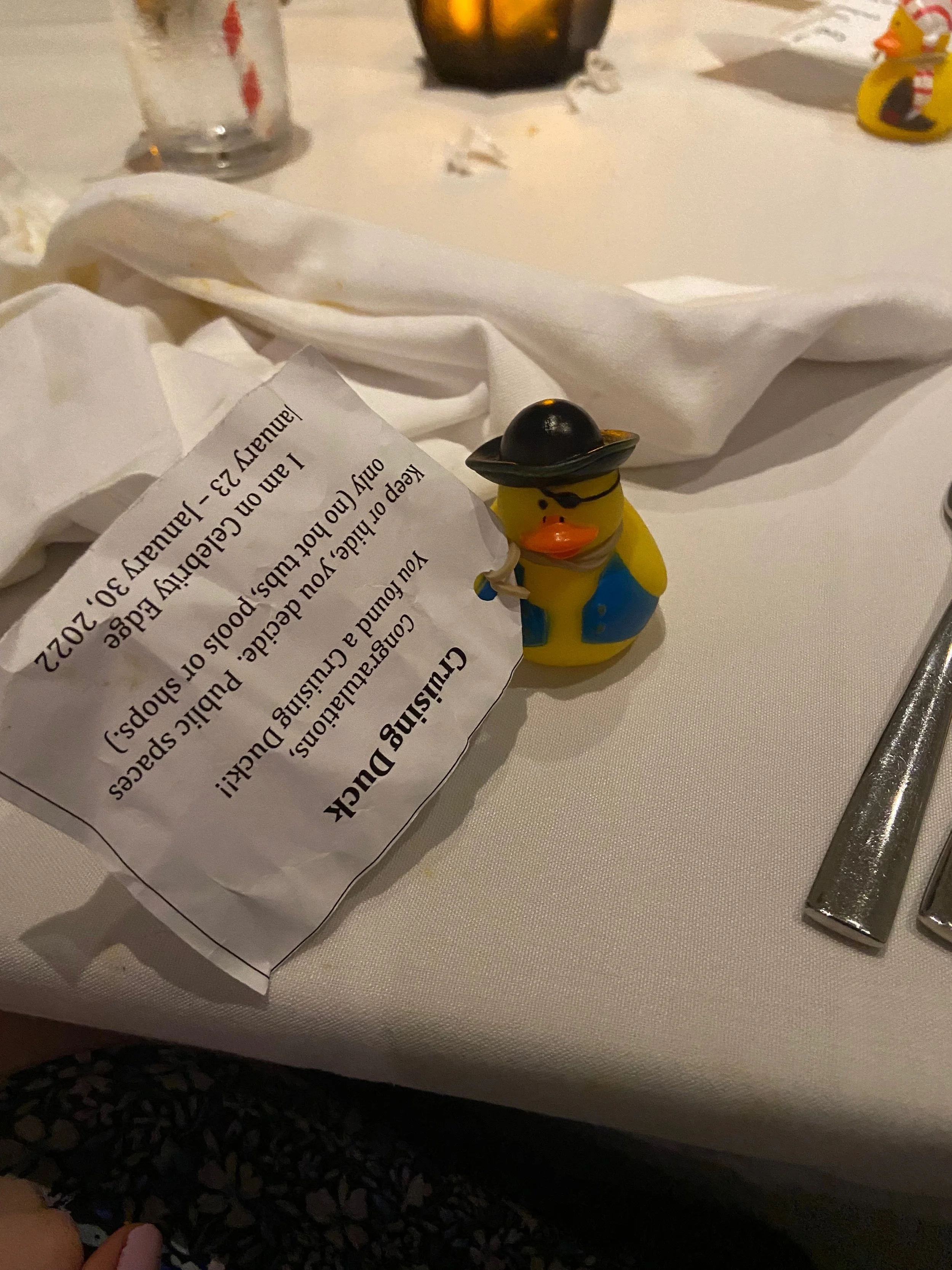 As we finished dinner, another passenger randomly came over and handed us two smaller rubber duckies. Okay then.