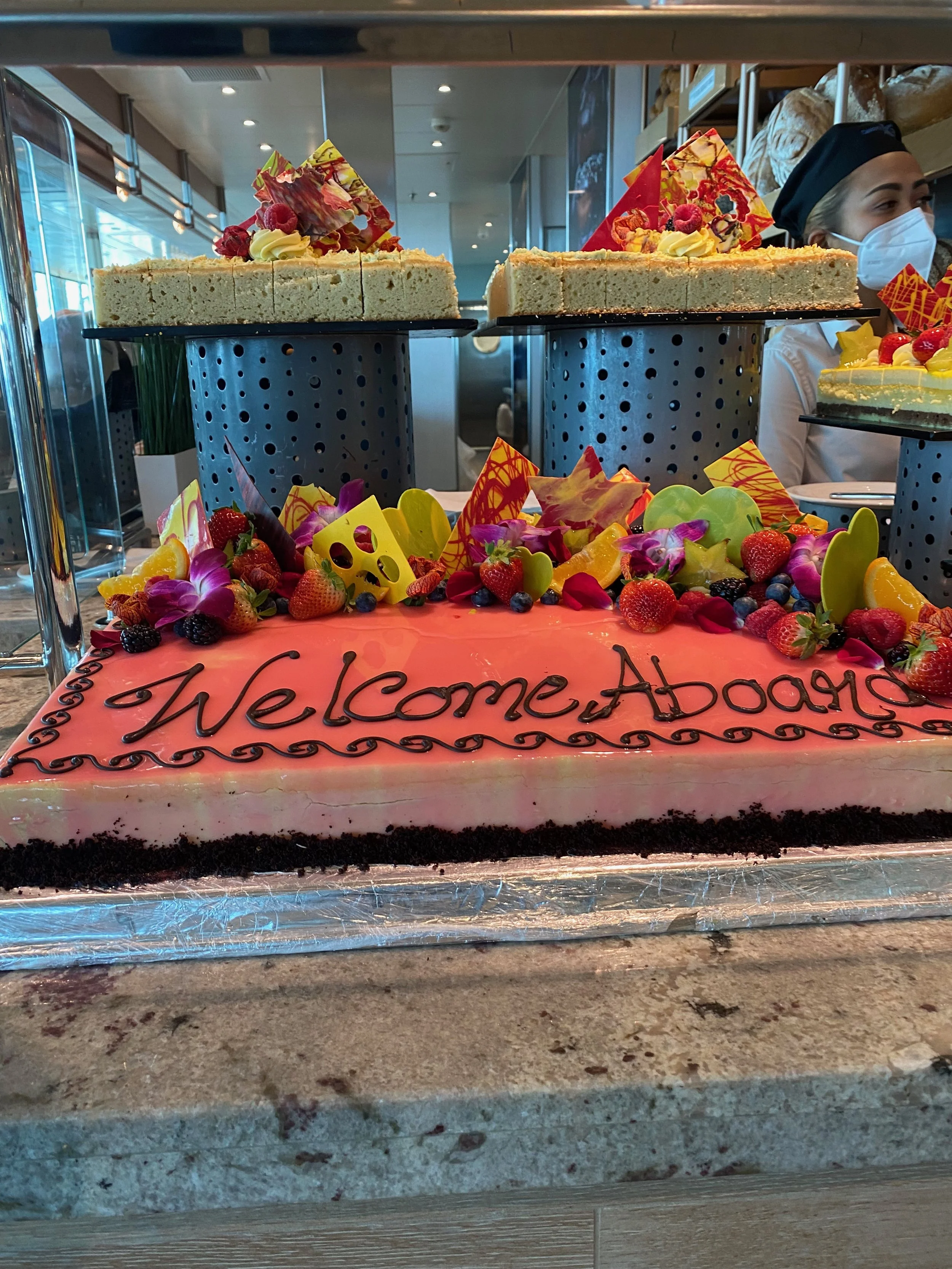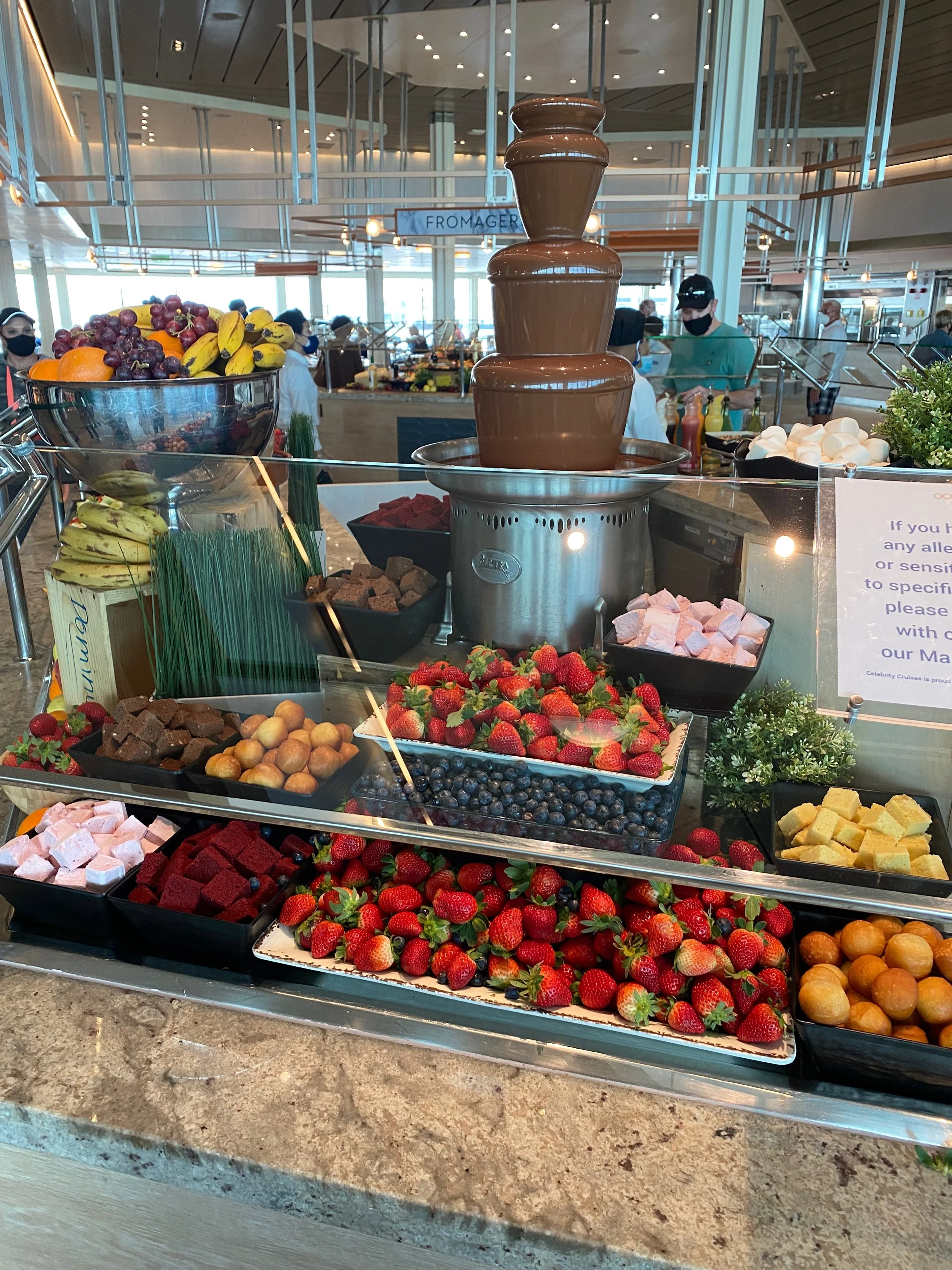 After getting our keys, our first stop was our muster drill. Thankfully they’ve made these drills so much easier. You used to have to gather in a dining room at a specific time to be counted and sit through a half hour thing. Now you just go to your muster station, check in, and you’re done. After that, our first real stop was the Oceanview Café (the buffet) for lunch! It was a great looking buffet with pasta, Indian, sandwiches, fruit, cheeses, desserts, chocolate fondue and lots more. Also, I really like that the buffet is sort of centralized on this ship – there’s a bunch of different stations in one spot, as opposed to other ships where you need to walk one really long line that wraps around the back of the ship. The only problem was that I was still full from breakfast. The kids had pizza obviously. We finished lunch and it was time to explore.