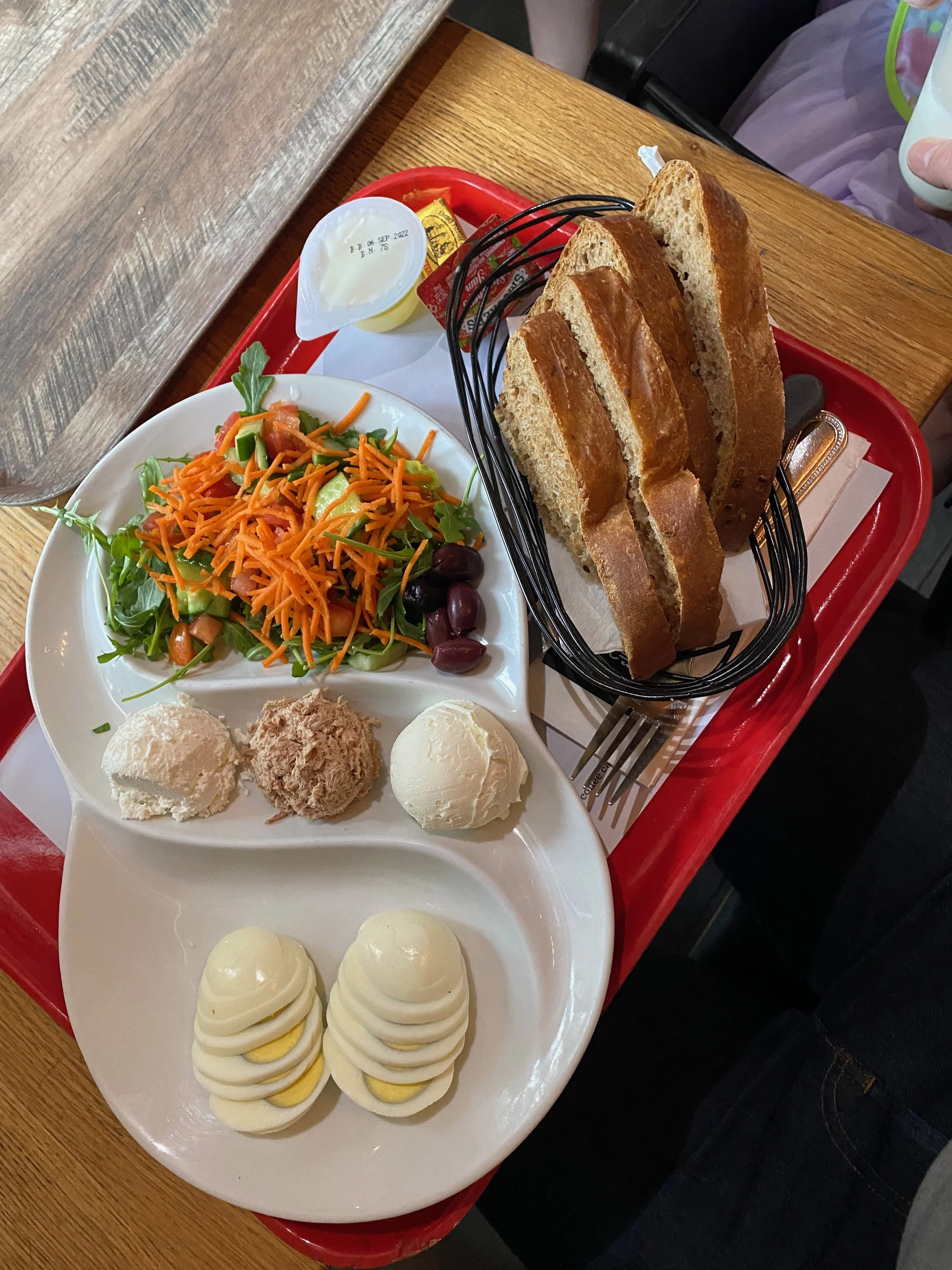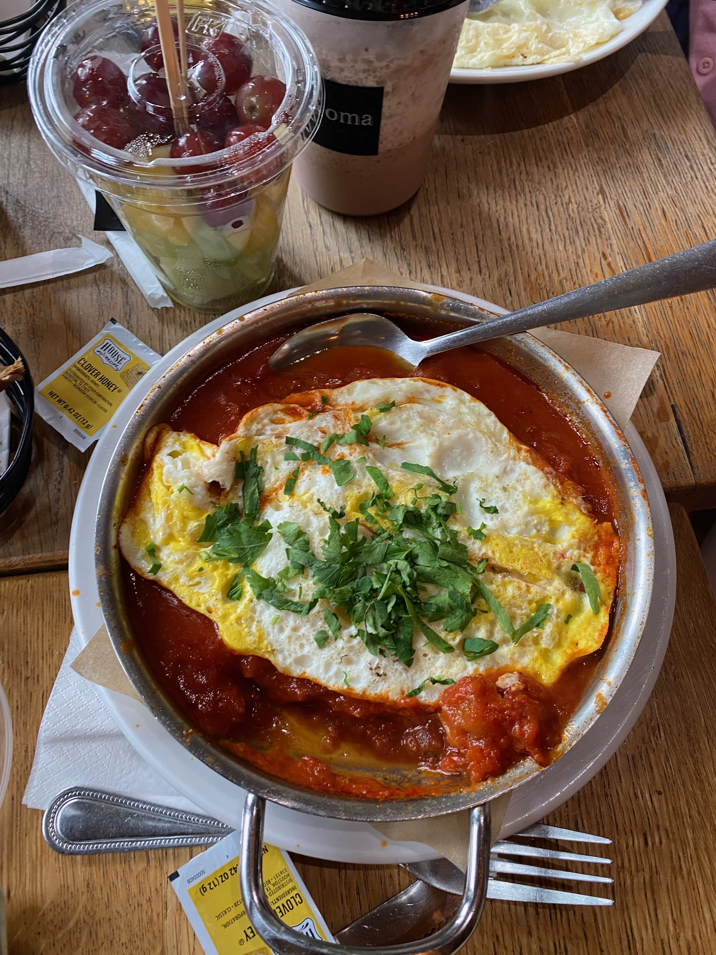 We didn’t get out of the room until maybe 9:20 when we went down to the Aroma for breakfast. I got shakshuka, which was very good. Tzvi had a “power breakfast,” which could’ve been called Israeli breakfast because it reminded him of that – a plate with salad, tuna, feta cheese and cream cheese, two hardboiled eggs and a stack of bread.