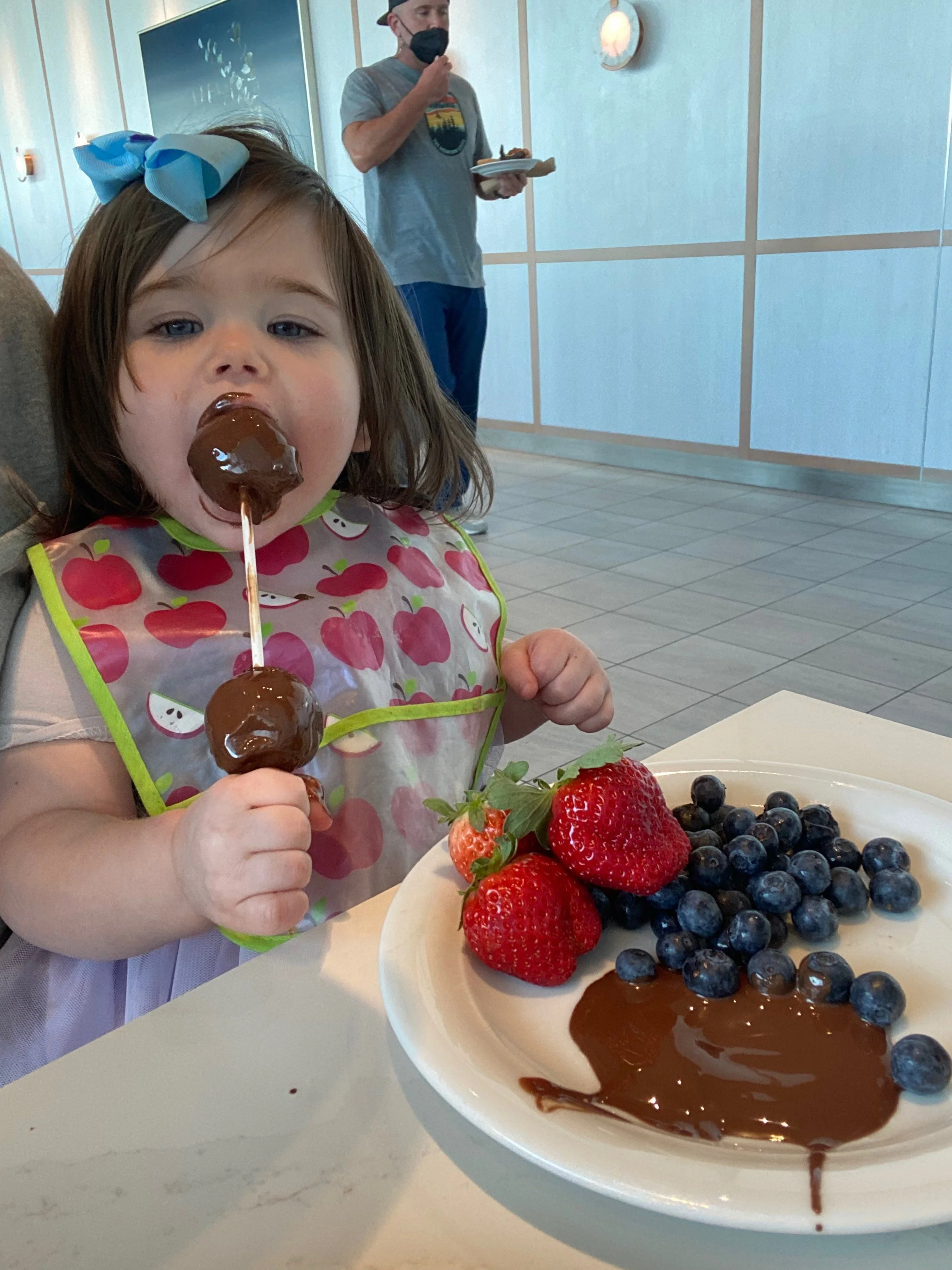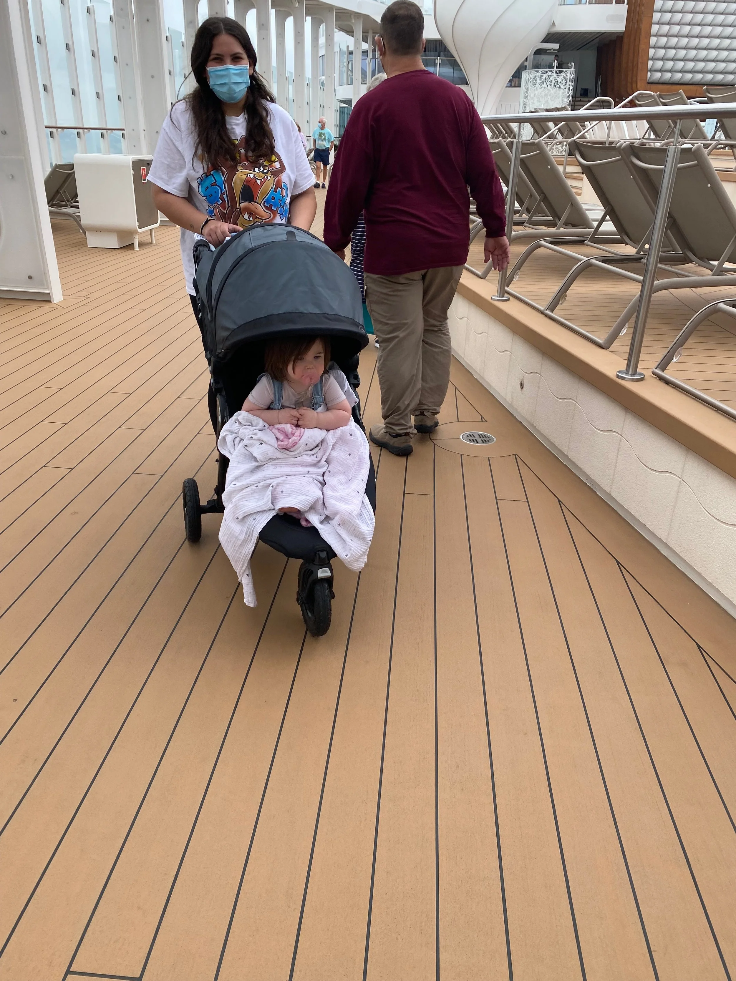 Next we checked out the kids club, where they told us it was drop off only and that Madeleine was too young. They also said they used to have toddler time where you could stay with the too-young kids and play, but they got rid of that during COVID. They did say that you could borrow toys, so we got some balls and pool toys. They also said there are 11 kids on the ship. Well, we knew it wasn’t a kid friendly ship, so I guess 11 is pretty good?