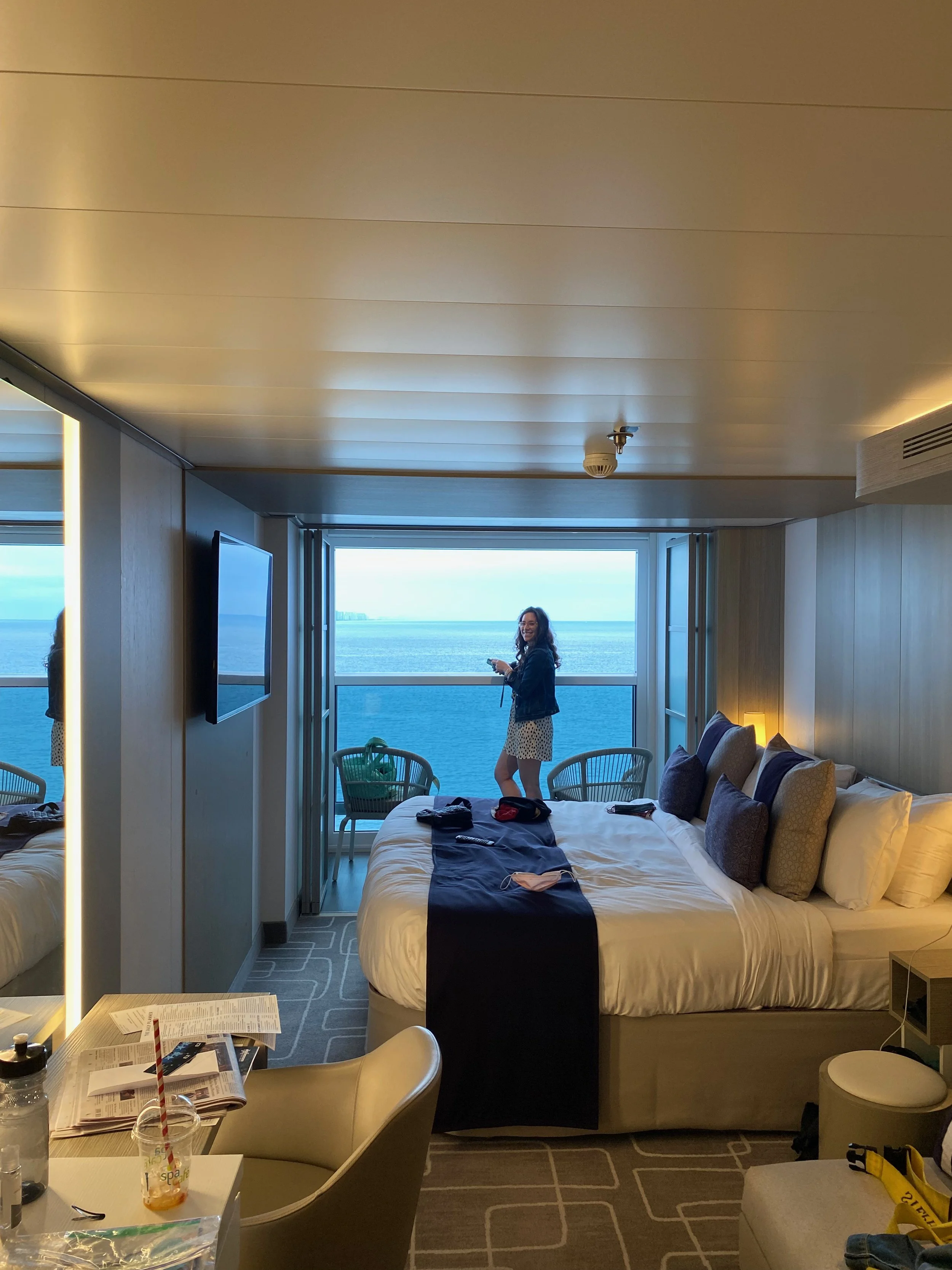 As soon as you get on they send you straight to your room where your keys are waiting outside the door. The rooms is really great and really spacious. We have two connecting rooms that are “Infinity Veranda” rooms. It’s kind of a cross between a balcony room and an oceanview room. The infinity veranda is basically a floor to ceiling window that can be opened (it goes from the top down about half way). But unlike a regular non-balcony room, you actually get the balcony space (and technically could close off the balcony from the rest of the room). Especially for traveling with little kids, these rooms are great – you get the extra space of balcony but you can actually use it, and you’re still able to open up to the outside. We actually ended up putting Madeleine’s crib on the balcony area. It really made the room feel so much more spacious (and I think these rooms are already more spacious width wise).