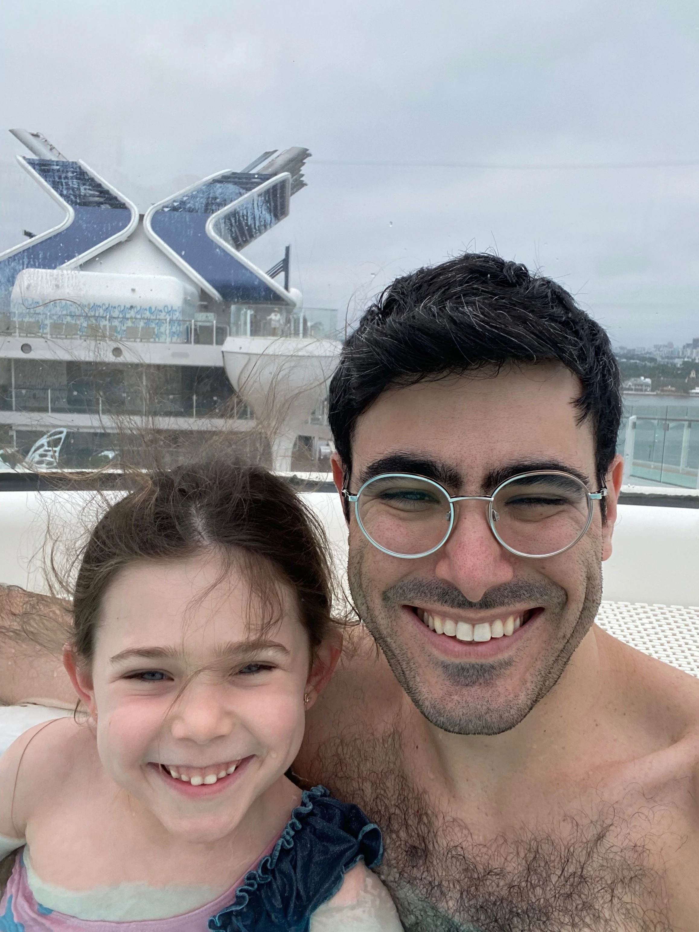 After that Robyn took Madeleine for a walk around the ship to try to get her to sleep, but it didn’t work out. She was too excited hanging out of the stroller looking at everything, and all of the staff were so excited to see her and kept saying hi to her. I spent some time unpacking, while Tzvi and Hallie went in the hot tub. It was kind of cold out, but nice enough for the hot tub.