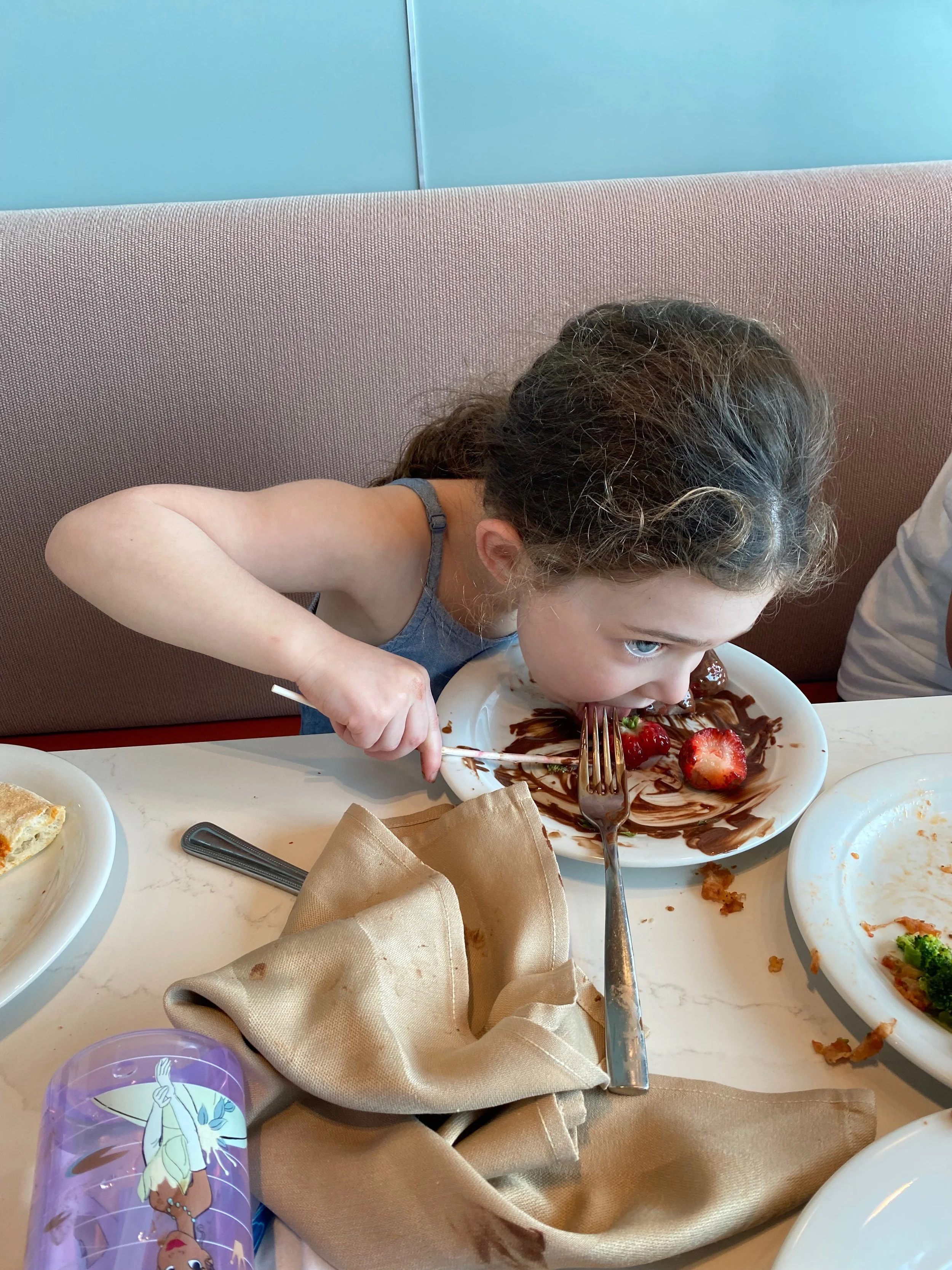 We went back to the room and got ready for dinner quickly. Hallie showered with goggles on because we don’t have a bathtub and she doesn’t like showers, and the neighbors banged on the wall, I guess because she sang too loudly in the shower.