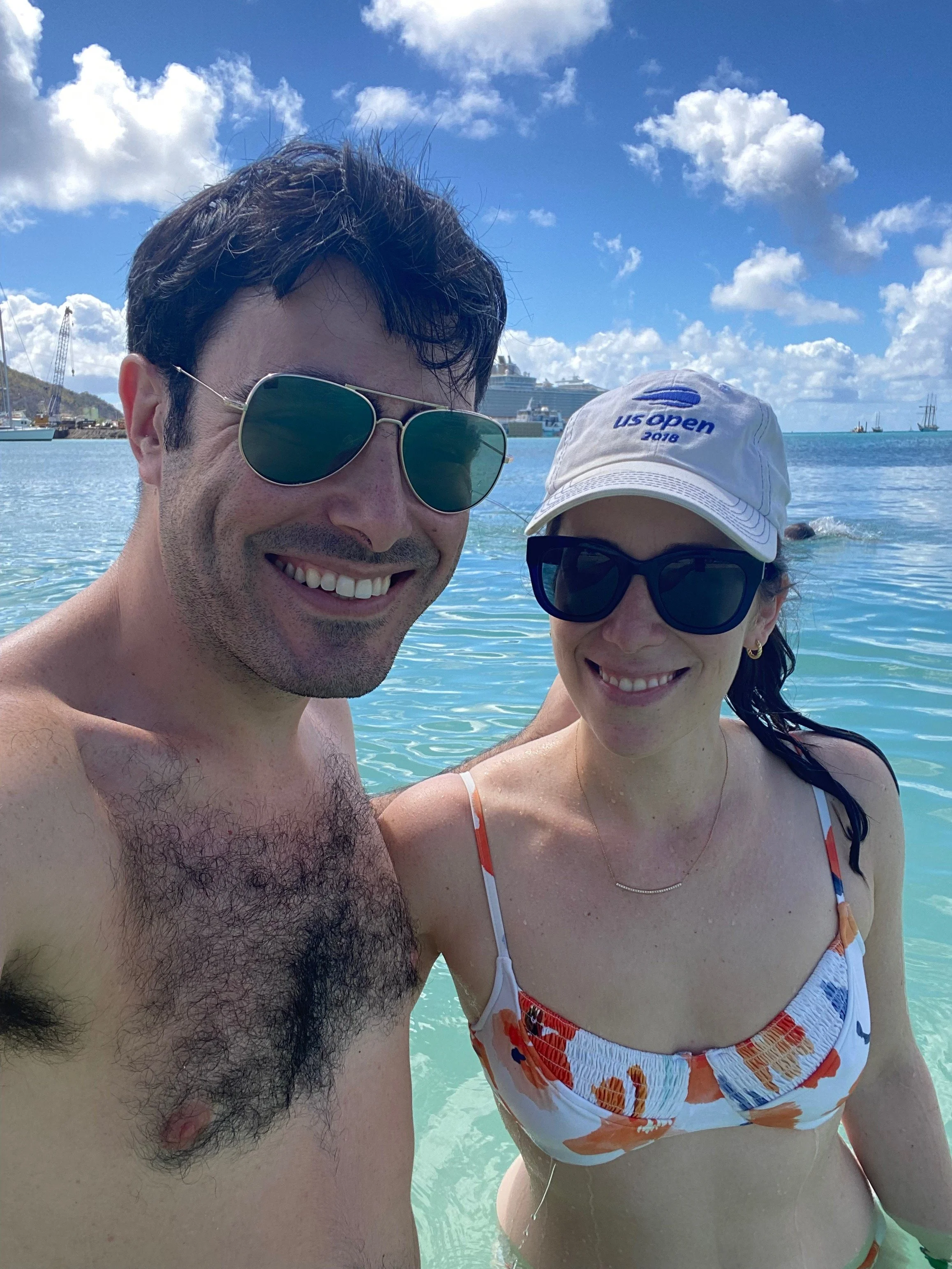 We made it off the ship and then ended up waiting until 10 to actually start moving. We had to walk through the dock (again, herded) until we got to the water taxi that was taking us to the beach. I think the water taxi was owned by Diamonds International (the diamond shops they have in every Caribbean port, which apparently is owned by a Jewish family from Great Neck), because the whole ten-minute ride was basically just a pitch to go buy things. They also gave us a coupon for a free bracelet. Great.