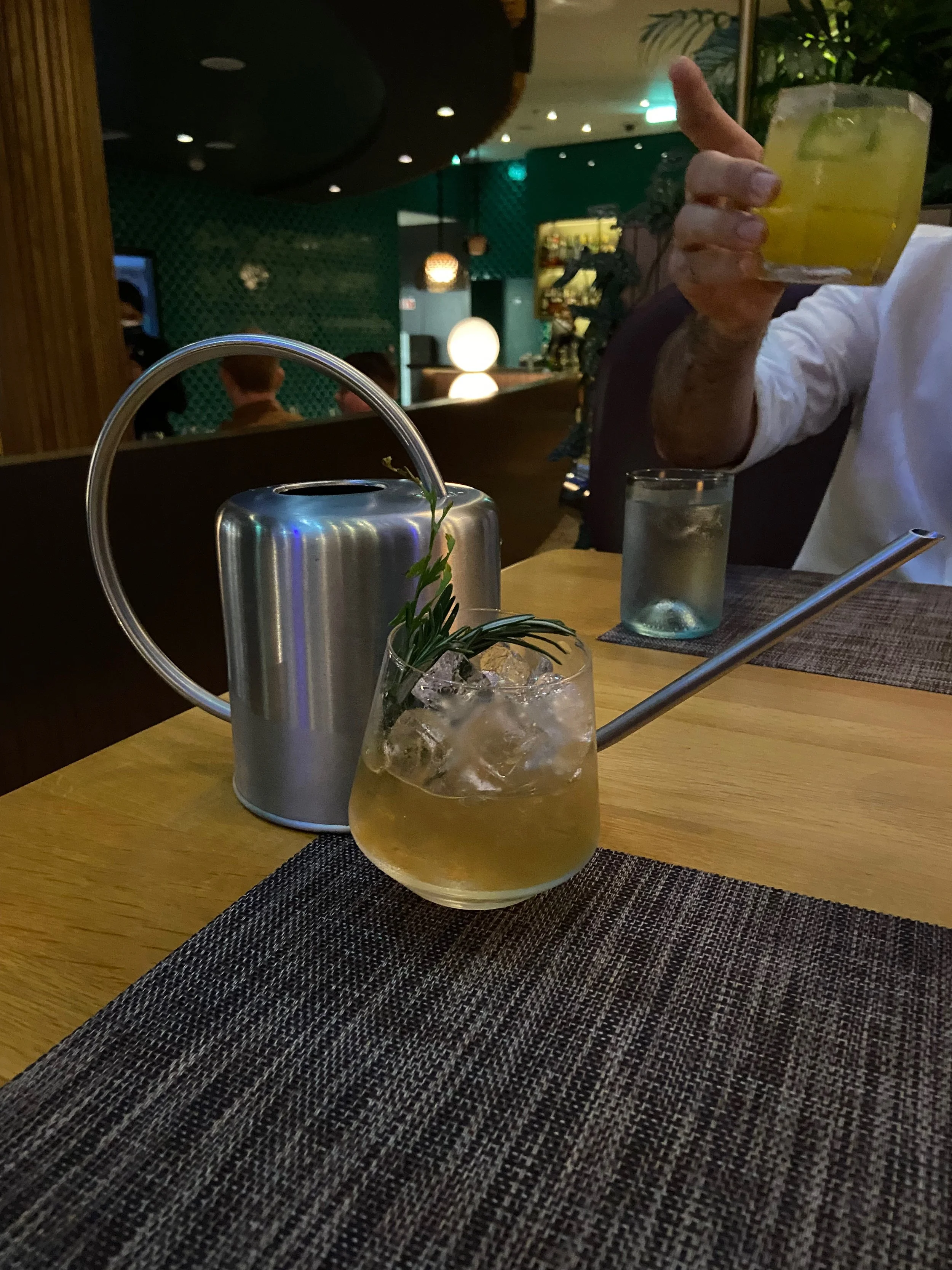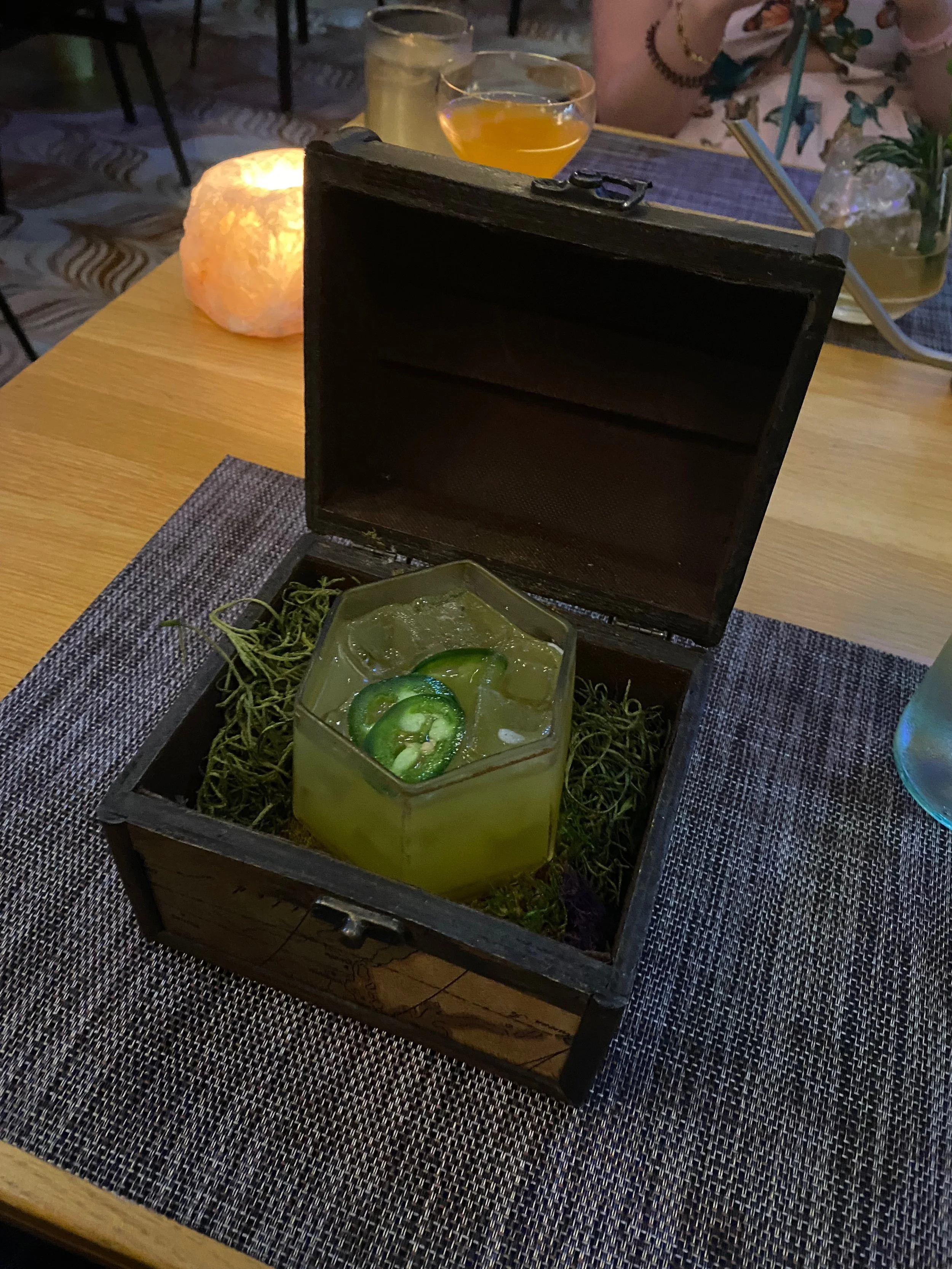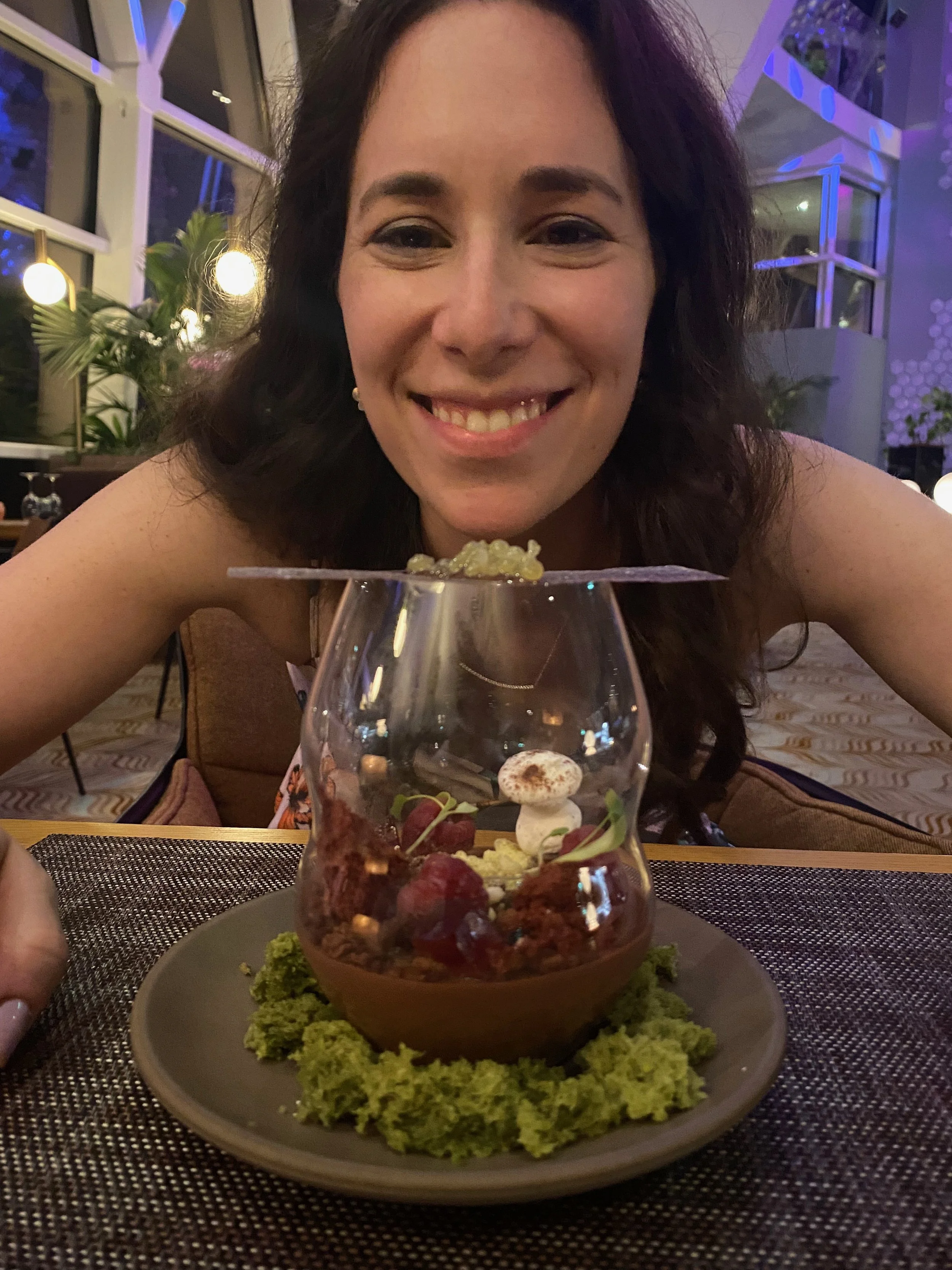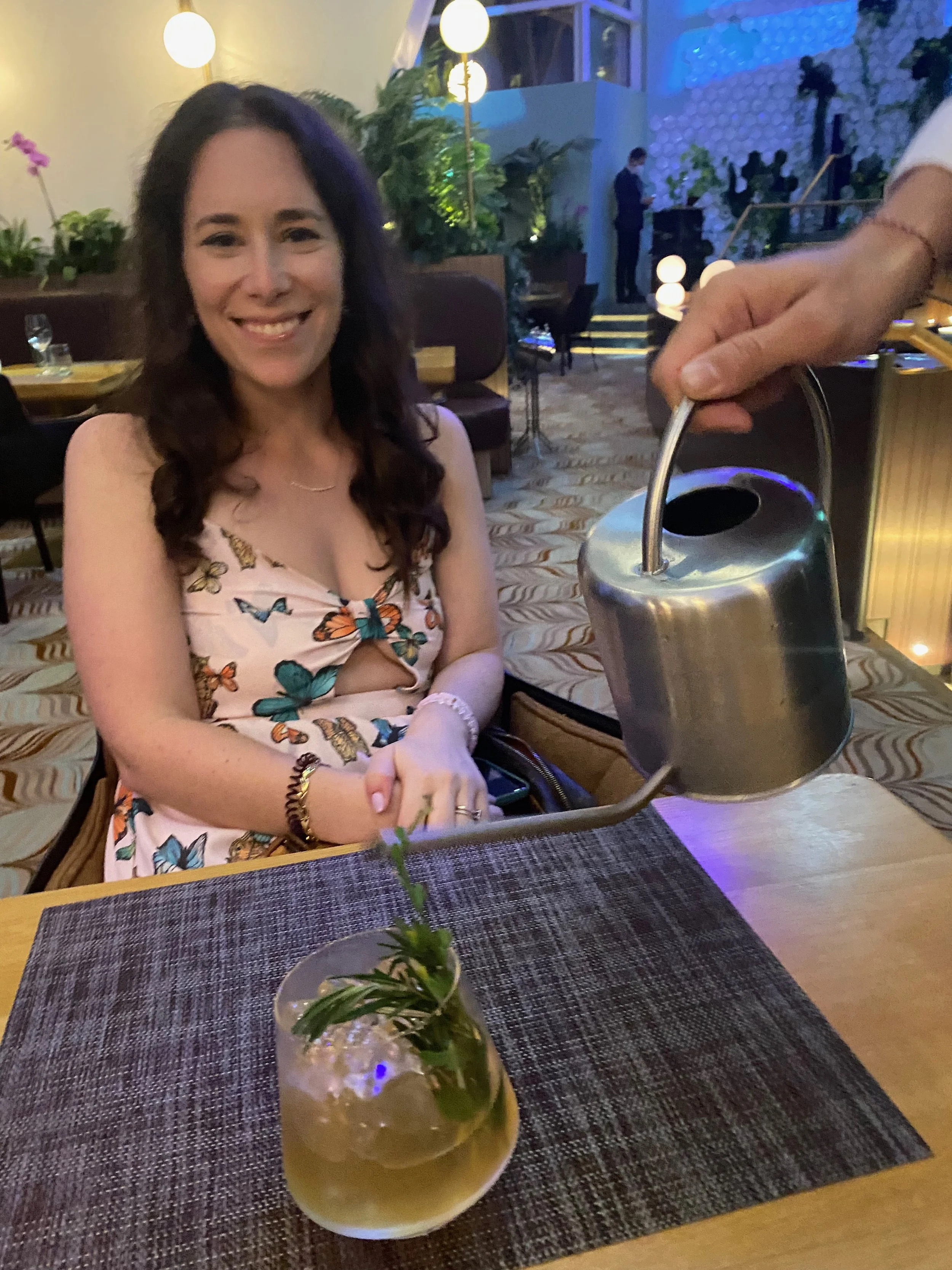 Anyway, dinner was very nice. Eden is the area at the very back of the ship and it’s kind of like an indoor garden with a bar, restaurant and performance space where there’s always acoustic music. The meal is a five course pre-fixe menu, but they have a vegetarian option. We started with cocktails. When you arrive, they give you a signature drink which was delicious, but then we ordered our own drinks. Eden is supposed to have the most “craft” cocktails on the ship. They were certainly the most creative. I had a “Garden,” which was basically a whiskey sour with honey syrup but was served sort of like watering a garden where the sommelier poured it from a watering can into a class with tons of herbs. Tzvi had a “Veldt,” which was served inside of a treasure chest. It was mezcal and something called Verdita, which they apparently brew on board out of pineapple juice, jalapeno and cilantro. He said it was good, but a little spicy.