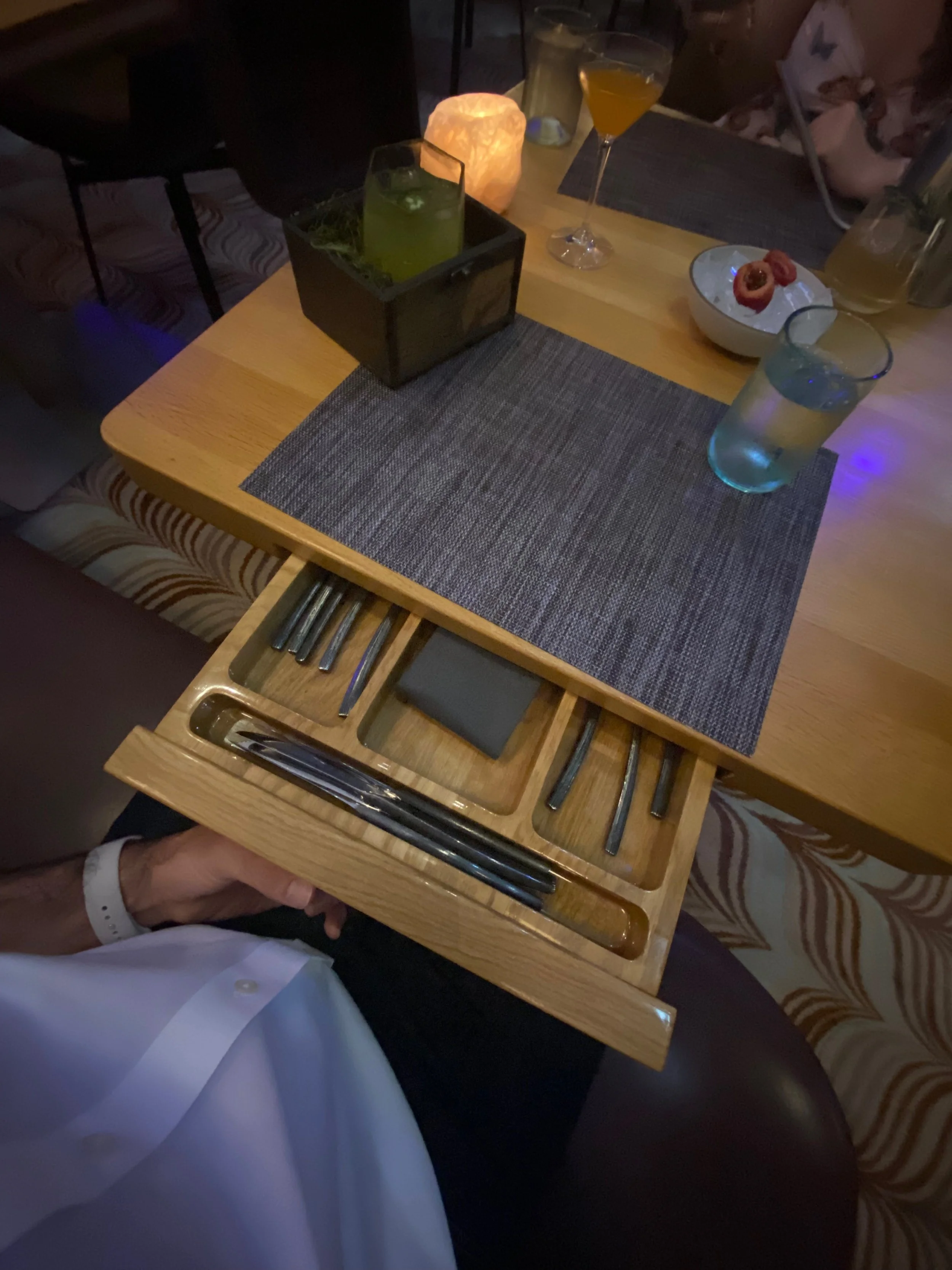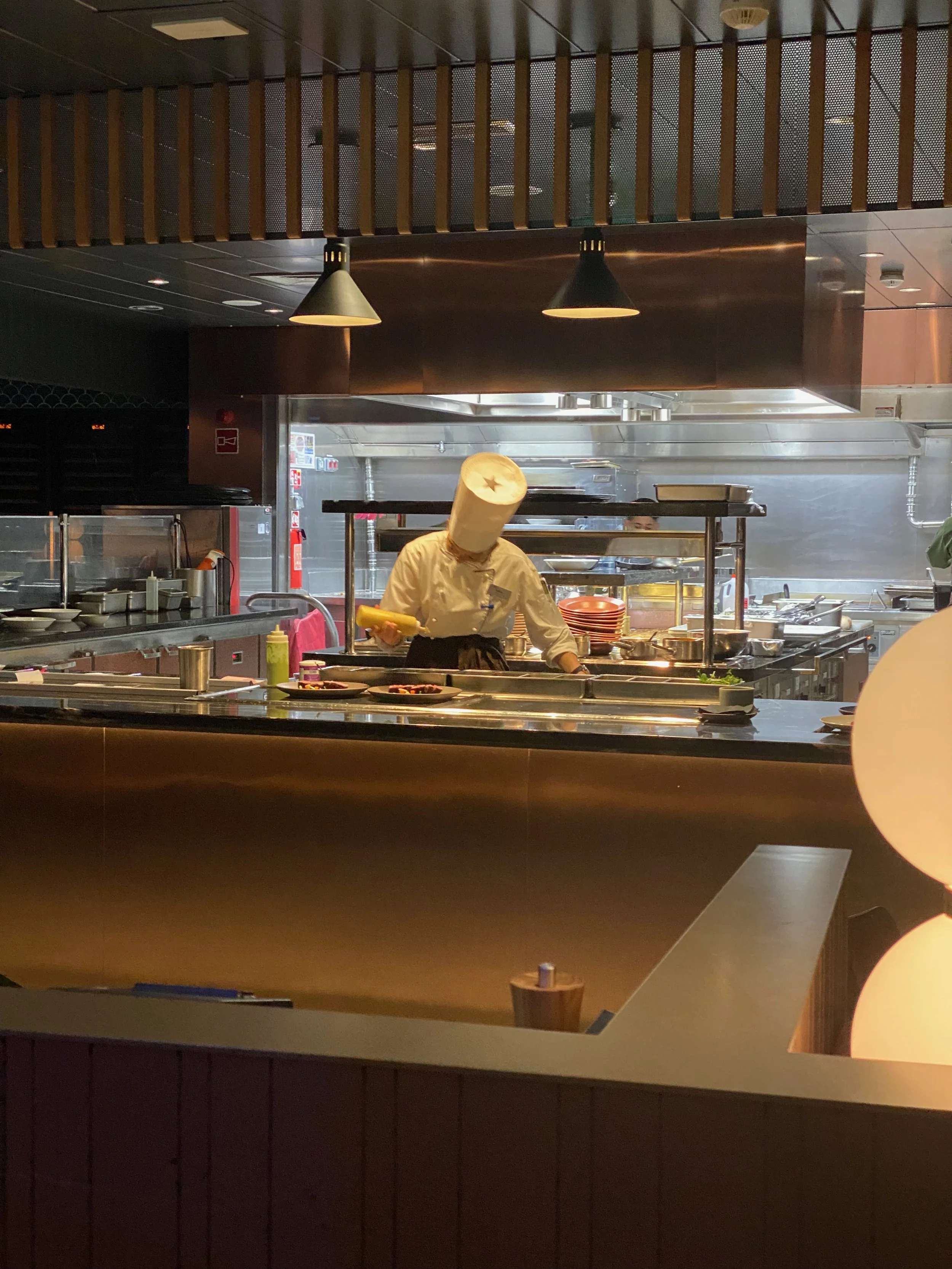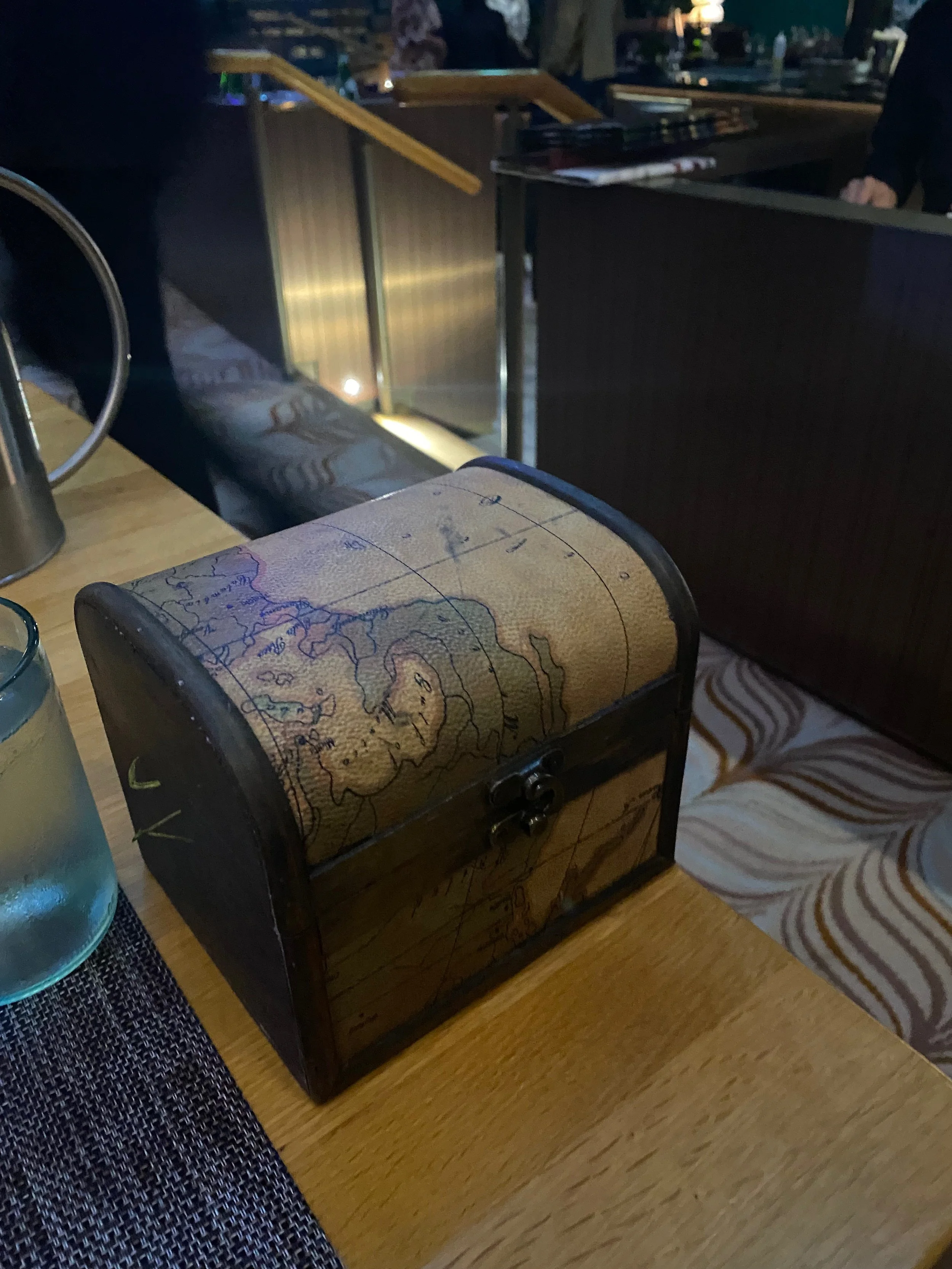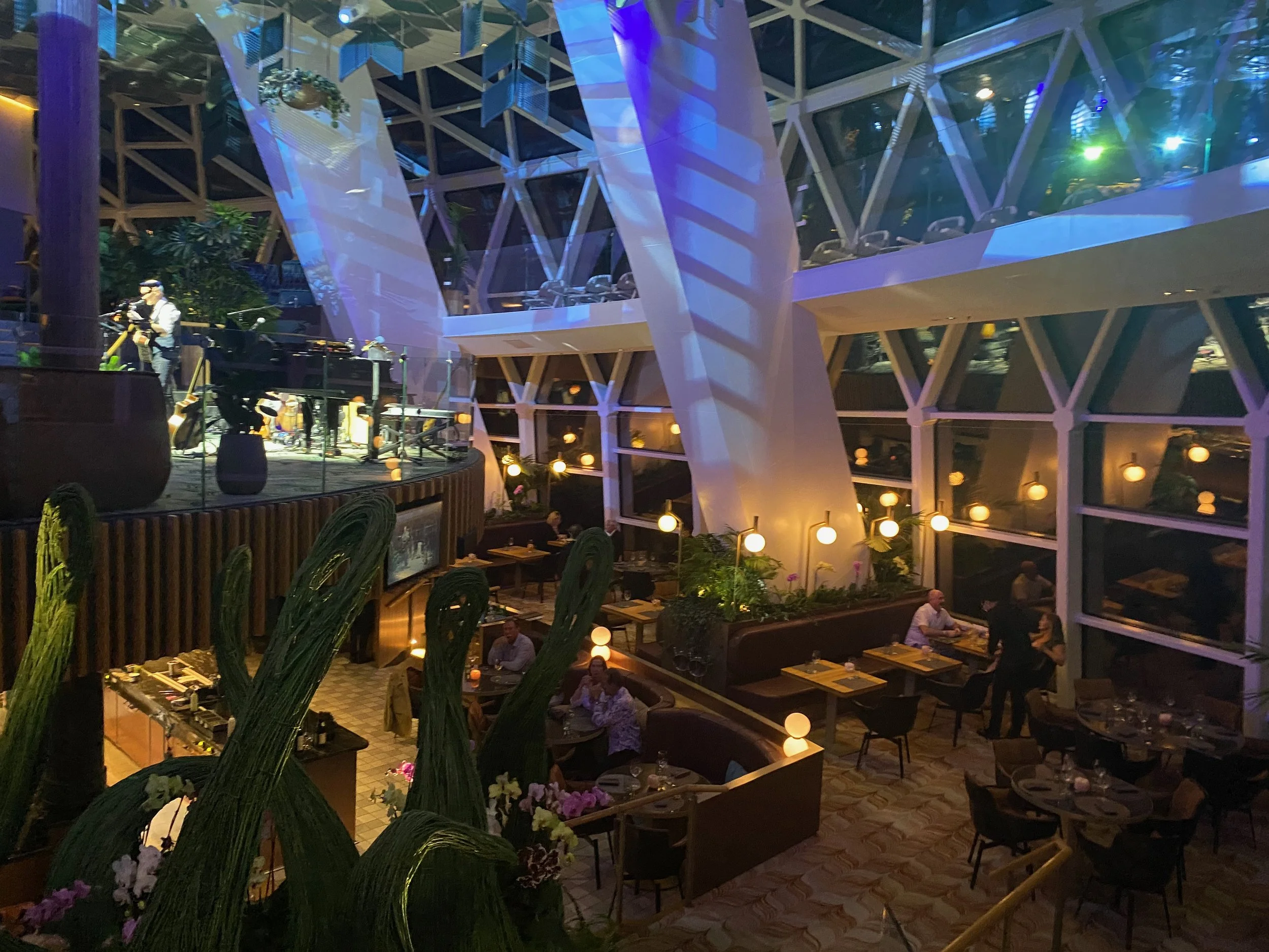 Anyway, dinner was very nice. Eden is the area at the very back of the ship and it’s kind of like an indoor garden with a bar, restaurant and performance space where there’s always acoustic music. The meal is a five course pre-fixe menu, but they have a vegetarian option. We started with cocktails. When you arrive, they give you a signature drink which was delicious, but then we ordered our own drinks. Eden is supposed to have the most “craft” cocktails on the ship. They were certainly the most creative. I had a “Garden,” which was basically a whiskey sour with honey syrup but was served sort of like watering a garden where the sommelier poured it from a watering can into a class with tons of herbs. Tzvi had a “Veldt,” which was served inside of a treasure chest. It was mezcal and something called Verdita, which they apparently brew on board out of pineapple juice, jalapeno and cilantro. He said it was good, but a little spicy.