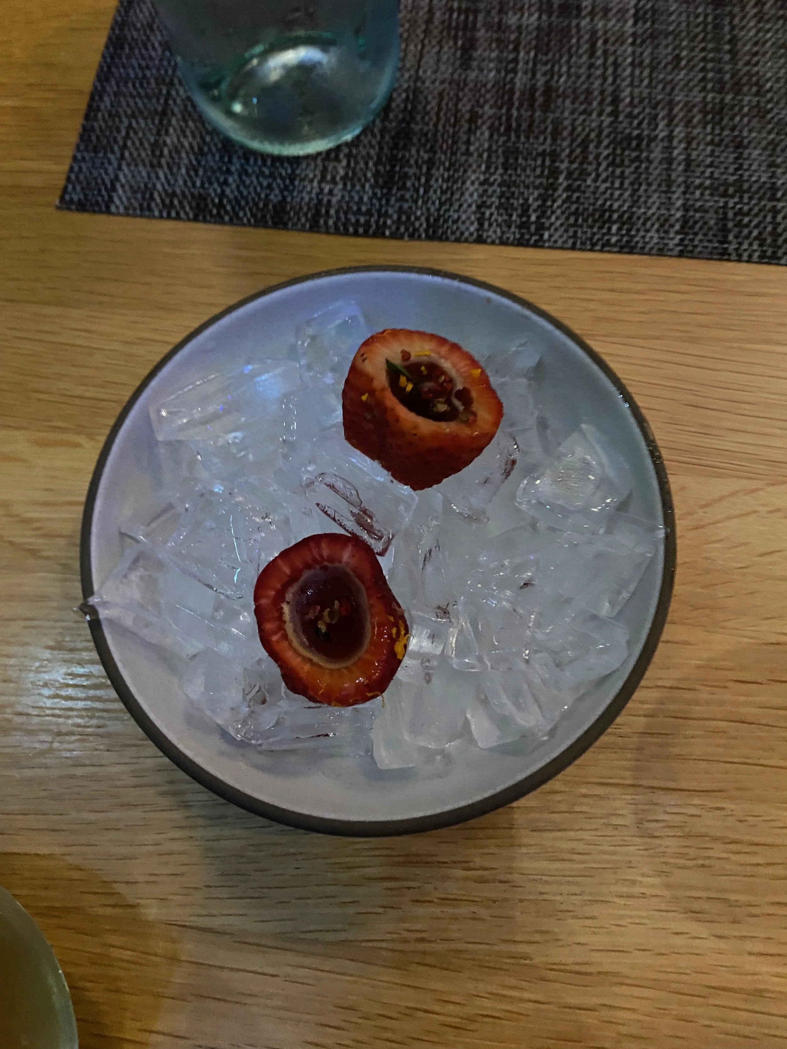 For the actual meal we started with an amuse bouche that was some kind of strawberry that came in a dish of ice and was stuffed with something jellied that we didn’t eat because it probably had gelatin. Now I’ll just list out the dishes we had. They were all so odd I can’t really describe them, so I’ll just tell you what the menu said and you can see the photos.