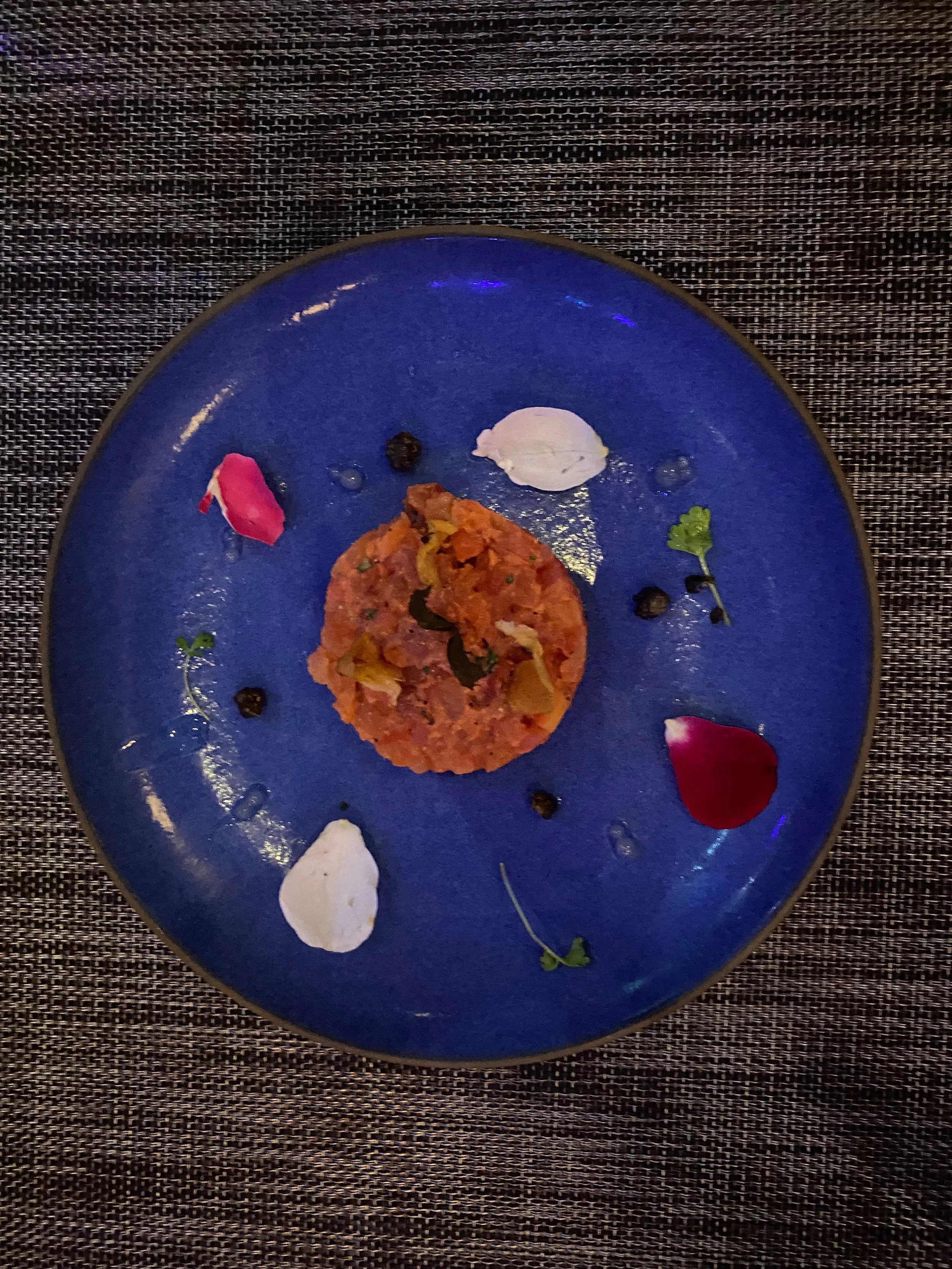 · Soleil –tomato tartar with capers, fingerling potato and tomato water (Tzvi had this)