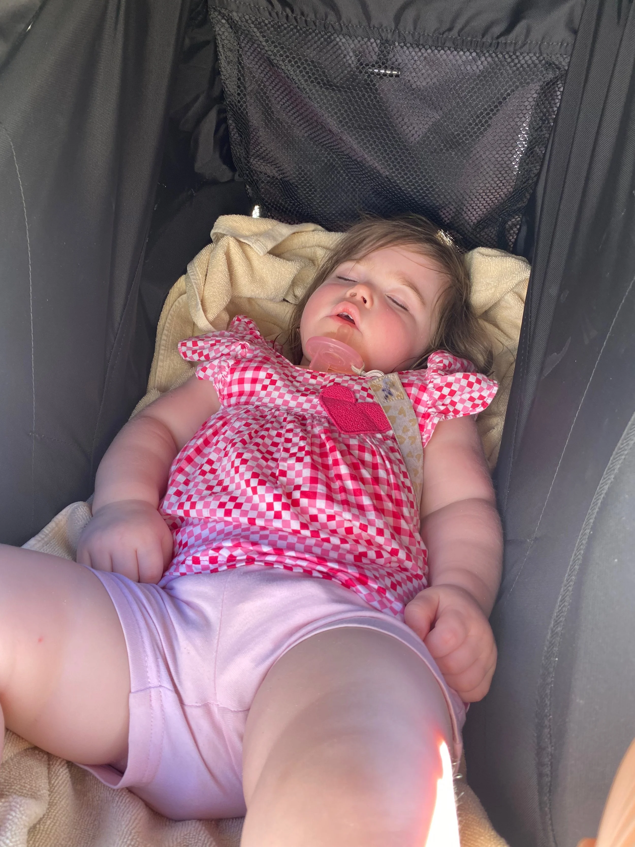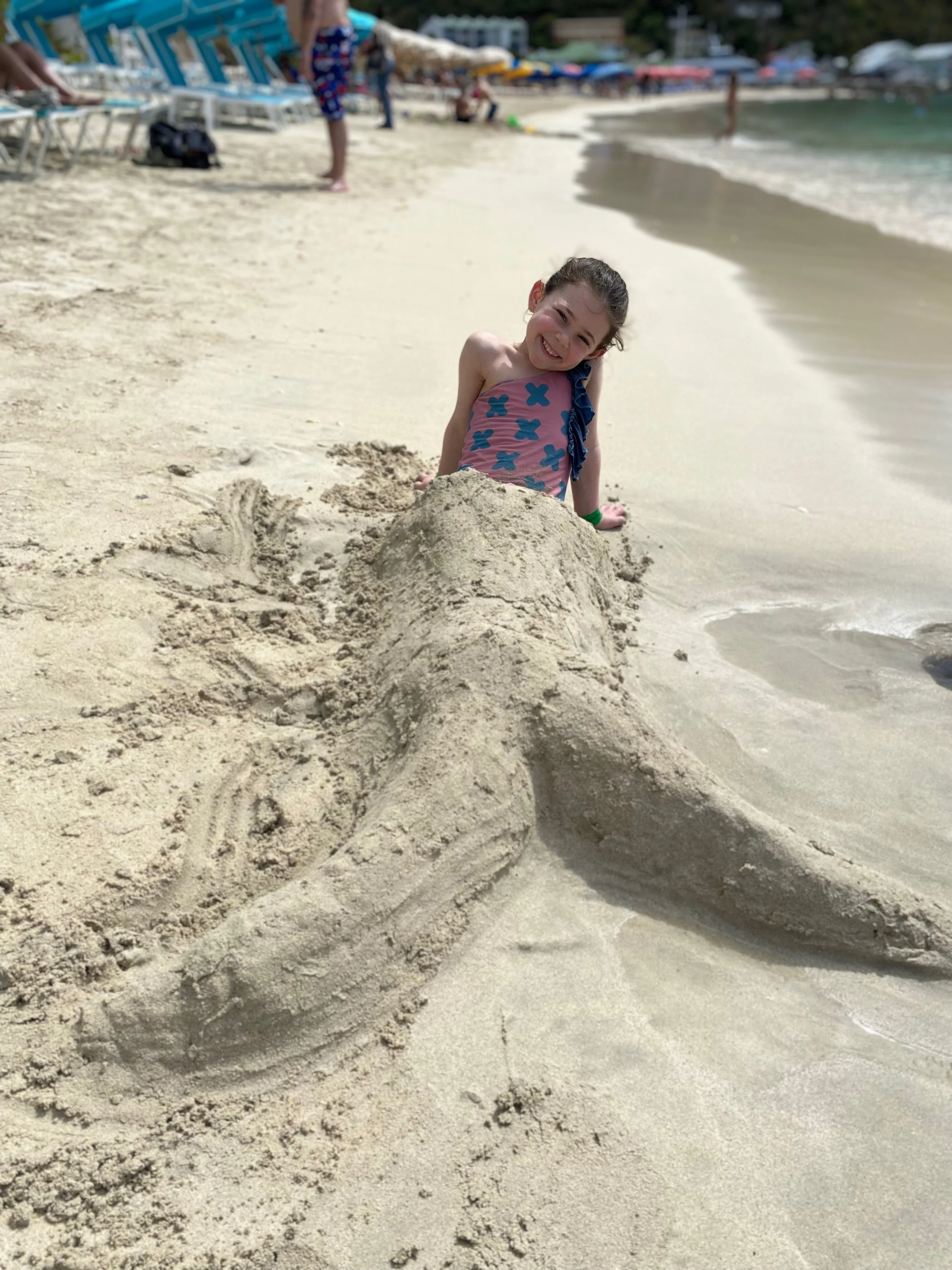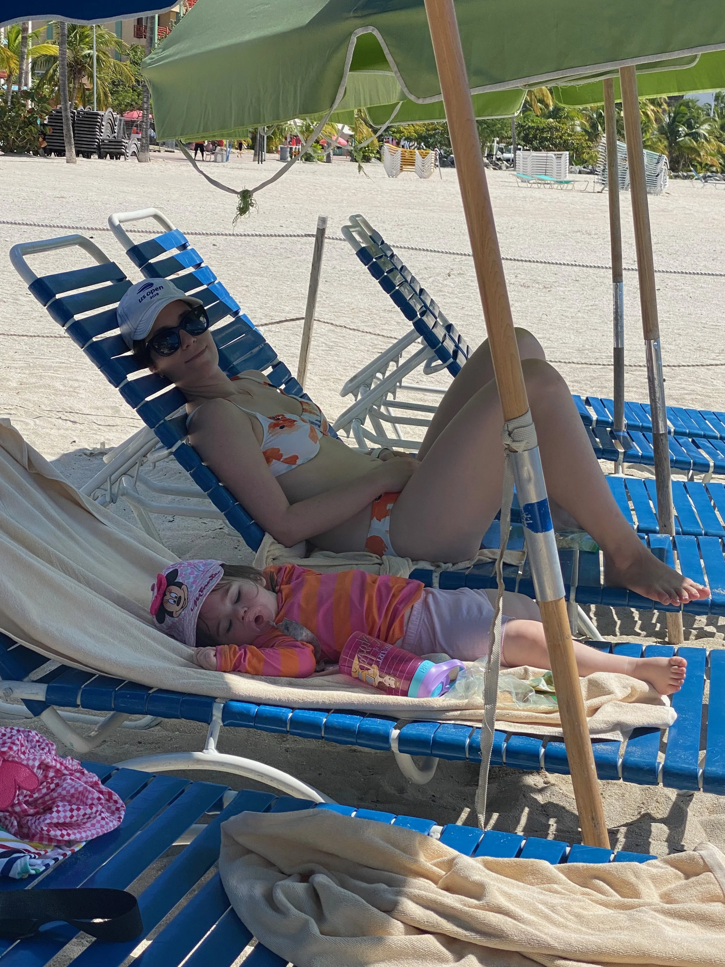 We all had fun on the beach. Robyn helped Hallie become a mermaid and they collected a lot of shells together and filled up two big Ziploc bags of shells. Around 12:30 Madeleine said she was tired and wanted a nap, which kind of messed up the nap plans, but I couldn’t say no, so I walked her around.