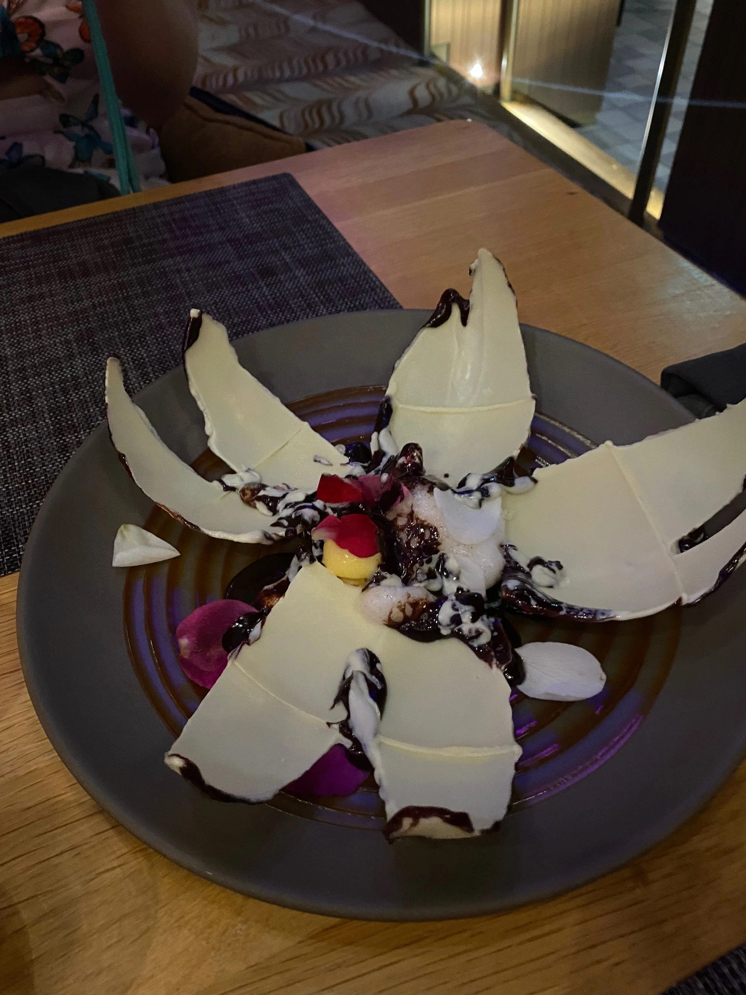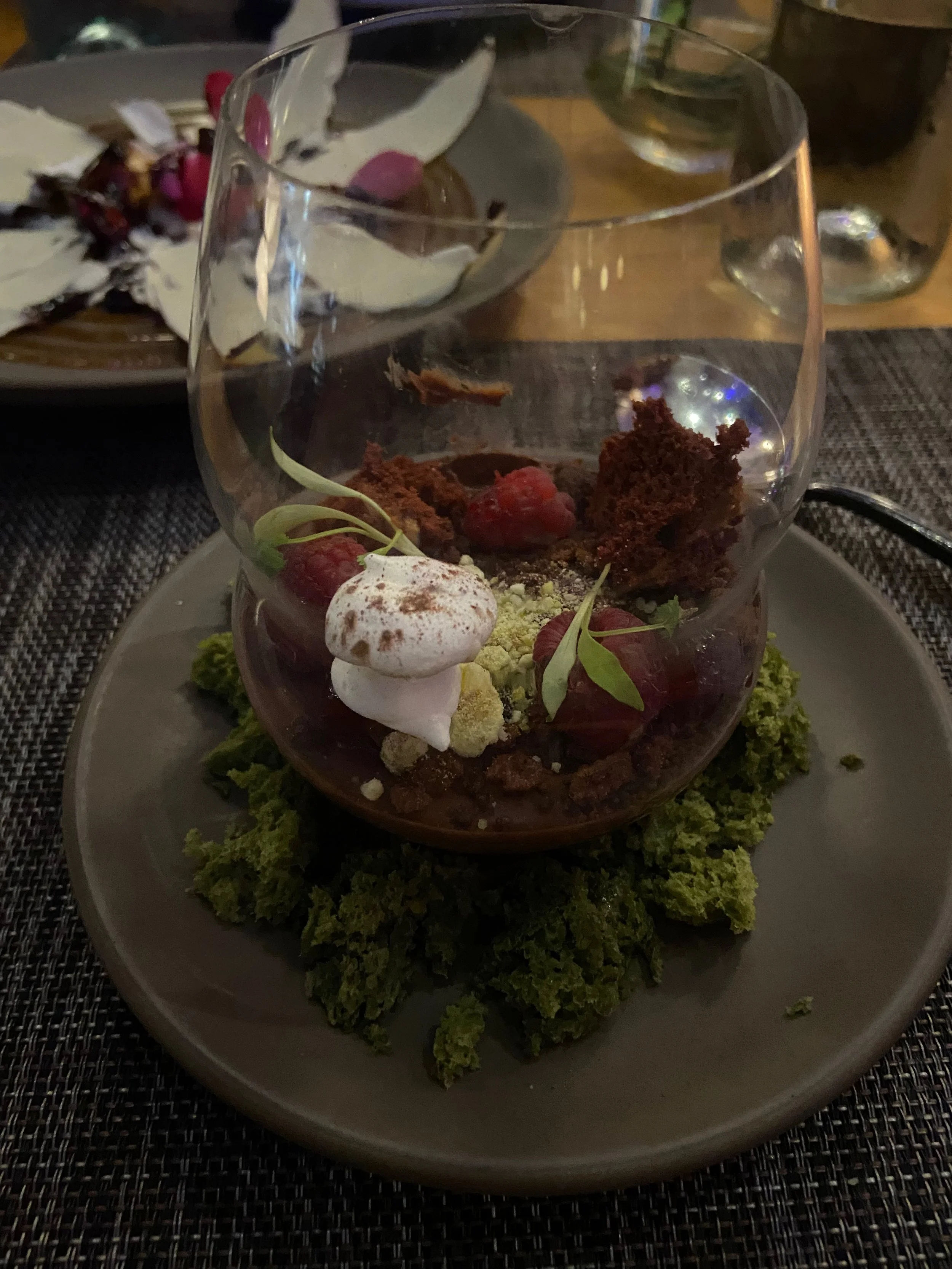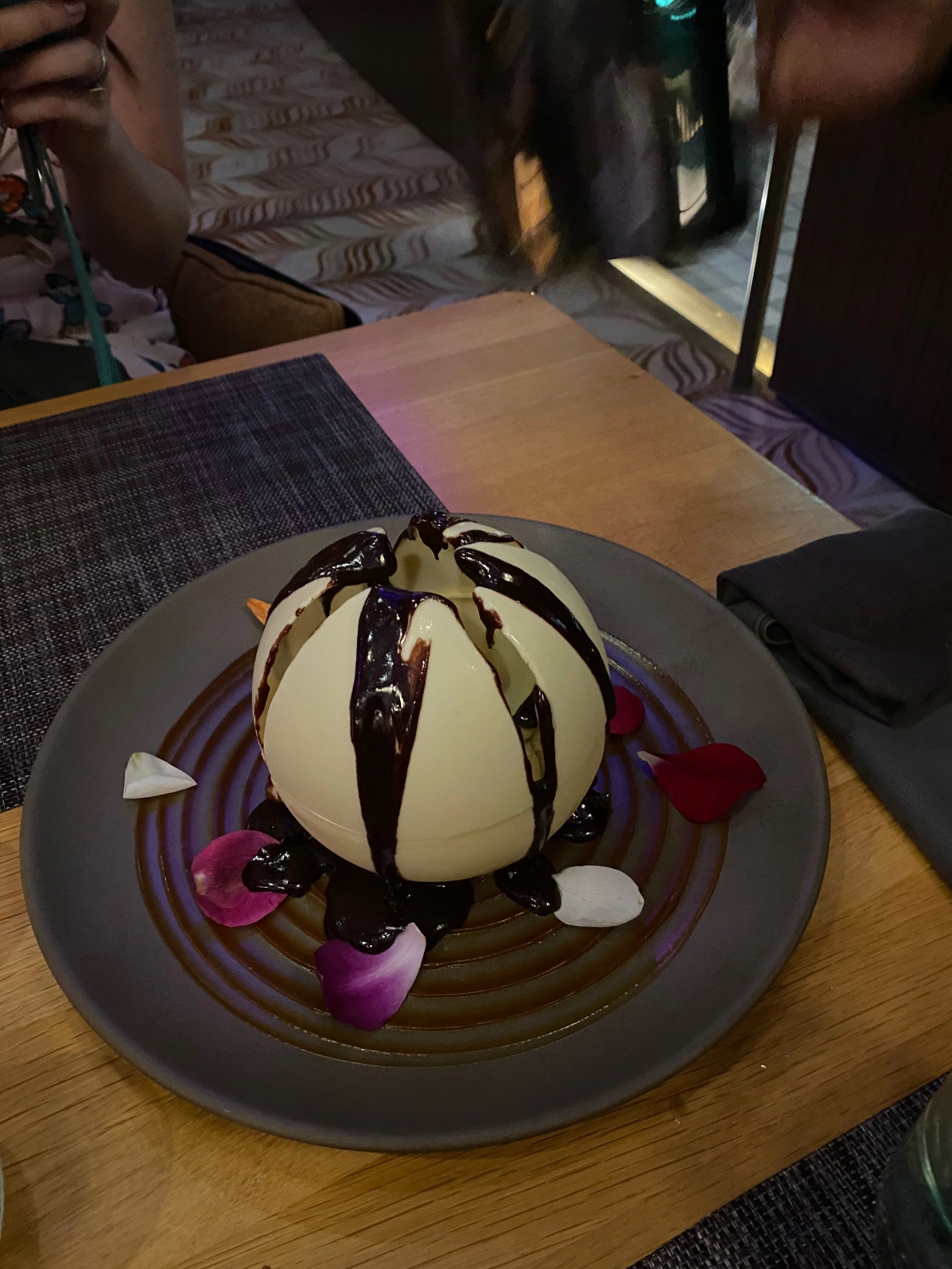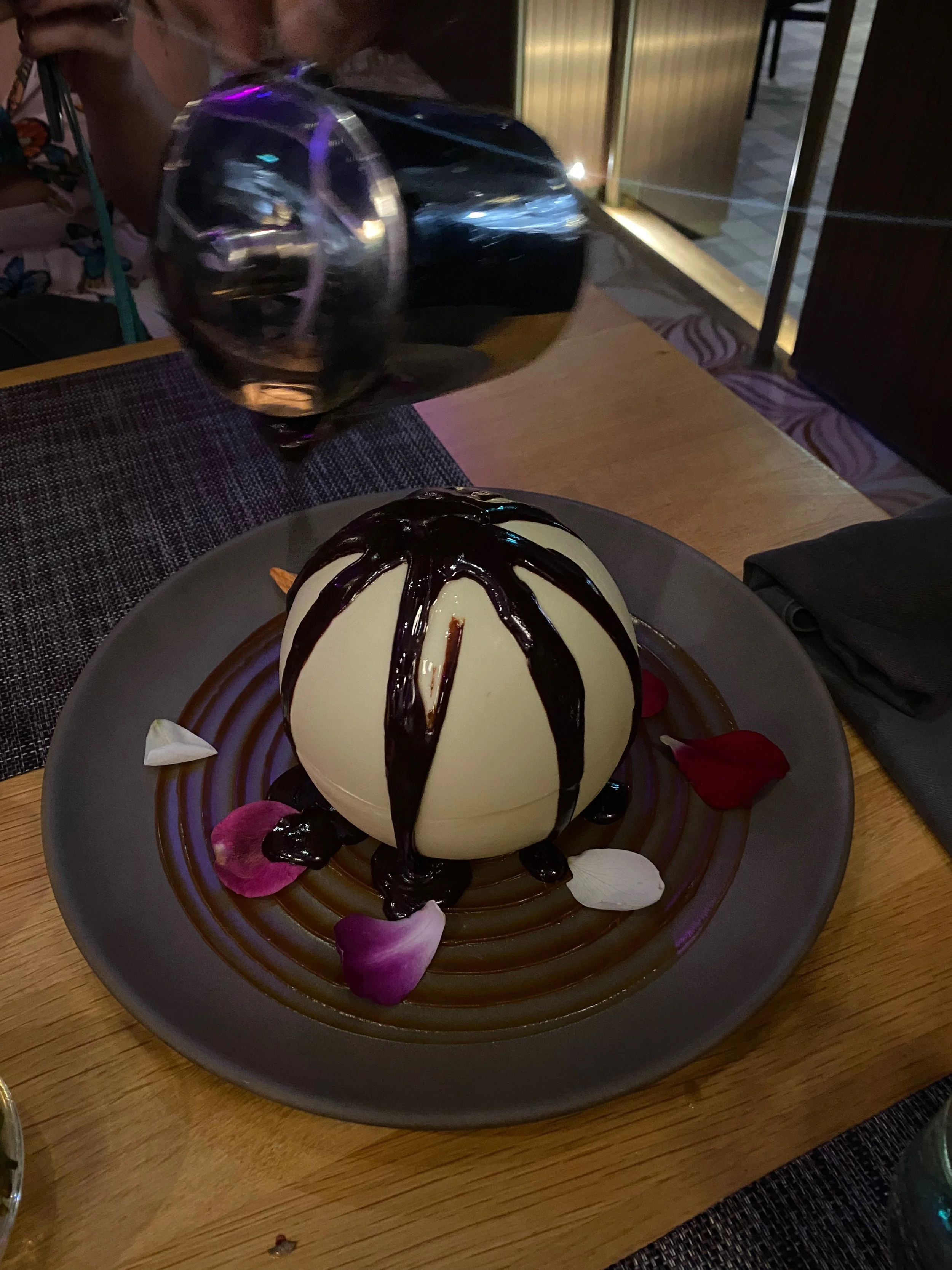 For dessert I had the “Looking Glass,” which was actually delicious. It also looked like a garden in a cup. It was pieces of pistachio cake and chocolate mouse and raspberry and chocolates and lemon and I don’t know what else. Both options on the menu had nuts, so Tzvi got a crème Brule instead, which was actually very good. They also brought us a dessert (which everyone gets) that was a white chocolate orb that they pour hot chocolate over and it cracks open like a flower. Inside was more chocolate. I was almost licking the plate by the end.