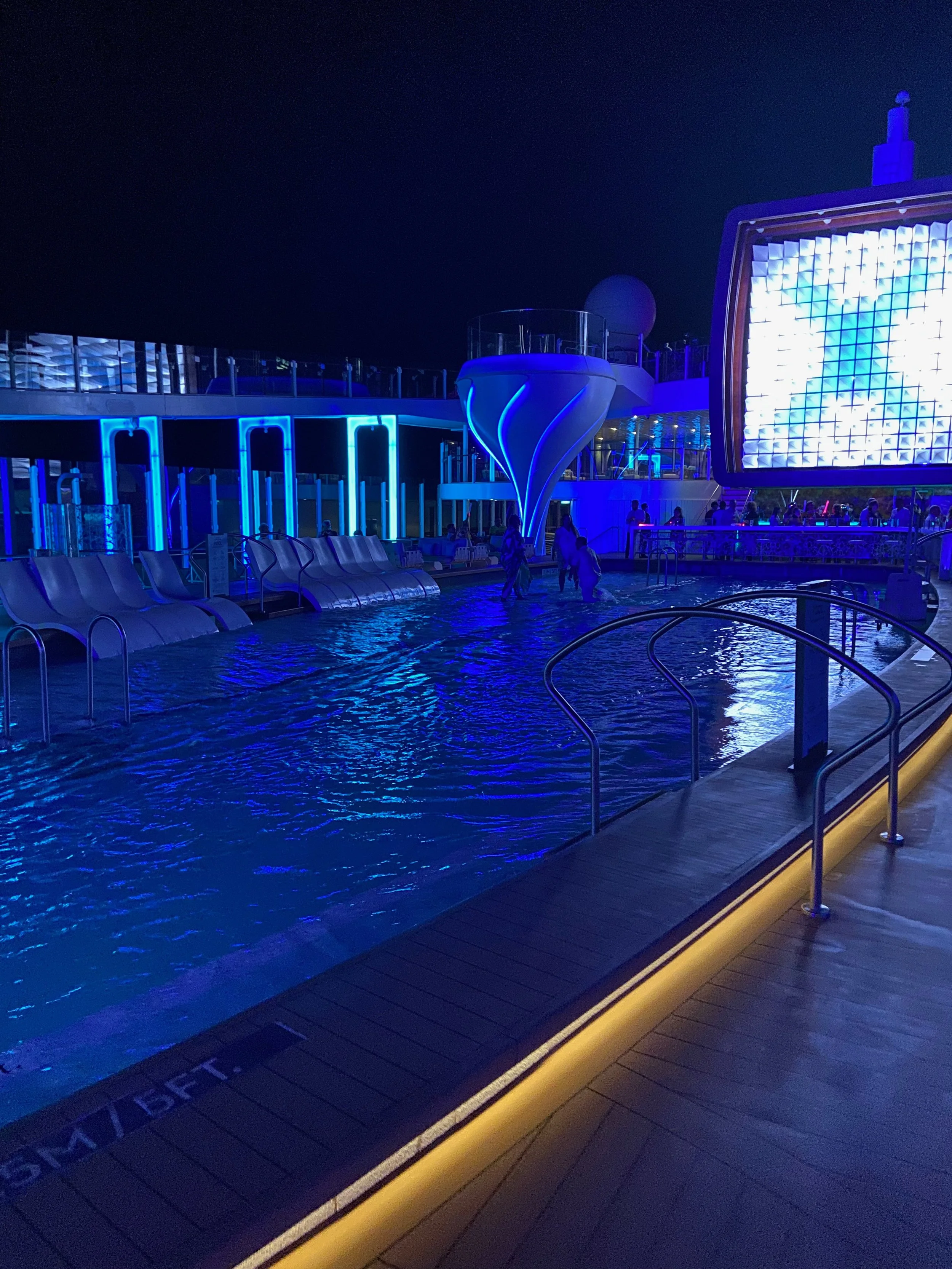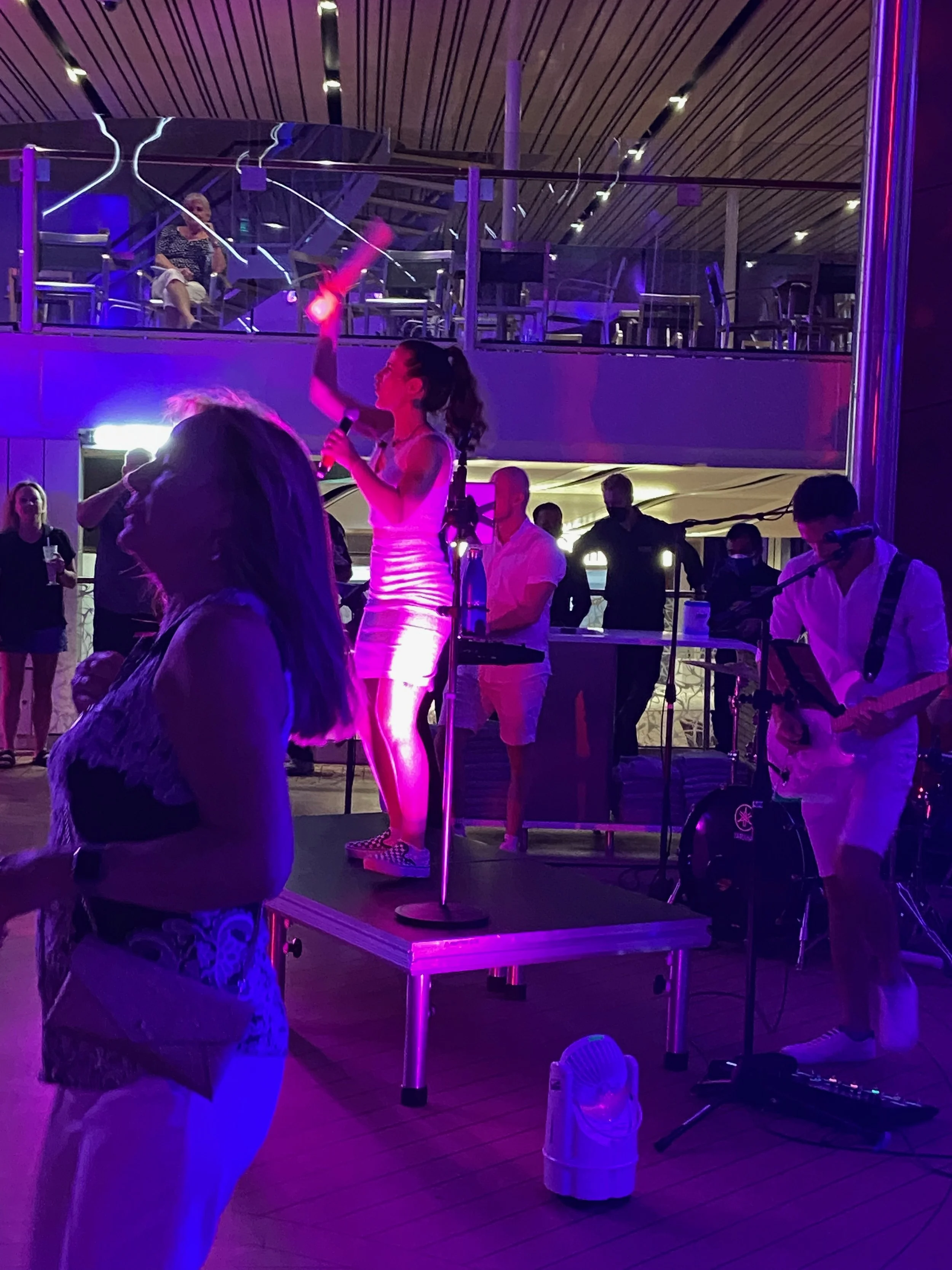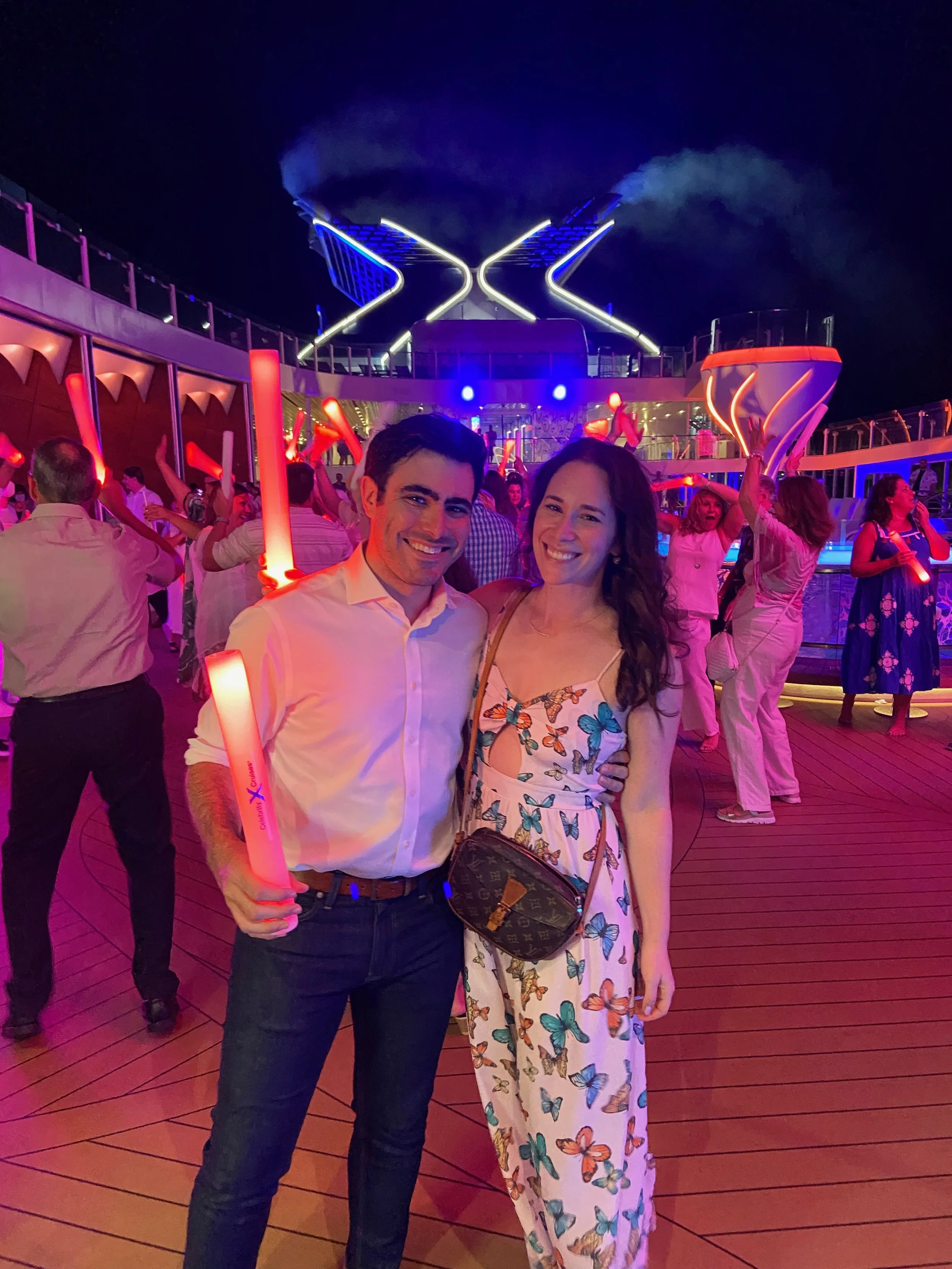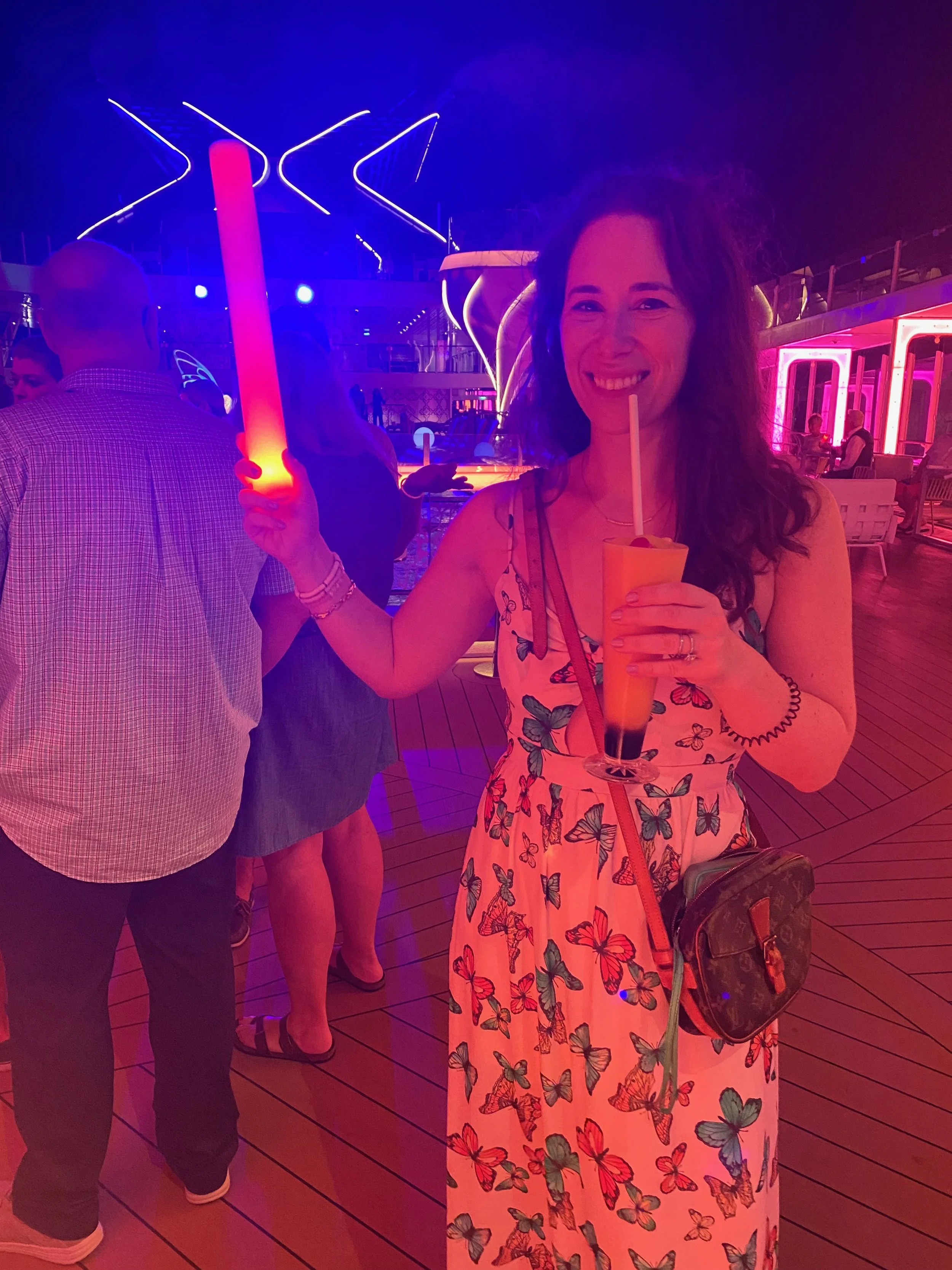 After dinner we went up to the pool deck for the White Party. Woo woo. Actually, it was one of the better white parties I can remember (every cruise has one). This one was actually fairly well attended considering how few people are on the ship, and was actually fun. They gave out flashing light sticks and the house band was playing. Also, having been through all of our usual drinks we decided to try one of the frozen cocktails from the pool bar, and it turns that they are delicious. We got a drink called a French Caribbean that had rum, raspberry liquor and passionfruit puree. Thank you Jen for the recommendation. It was basically a smoothie and Tzvi drank most of it despite having been too snobby to drink frozen cocktails all week. [Tzvi: Yes, I am a snob, but yes I am sad that it took me this long to discover how wonderful the blended cocktails are.]
