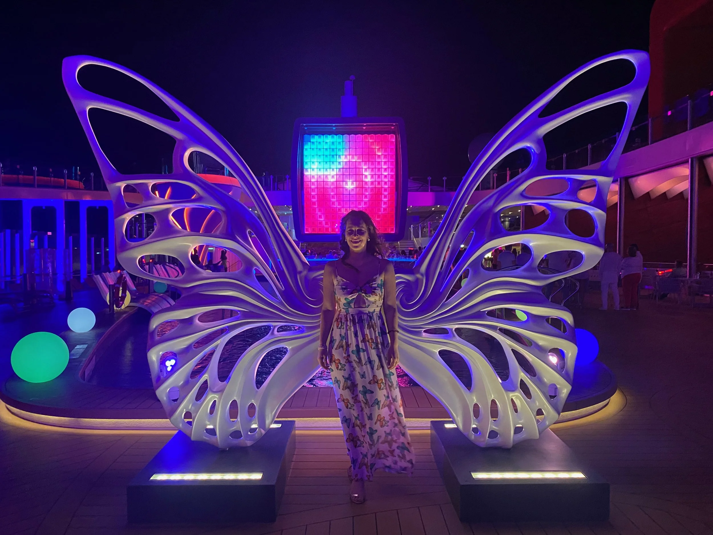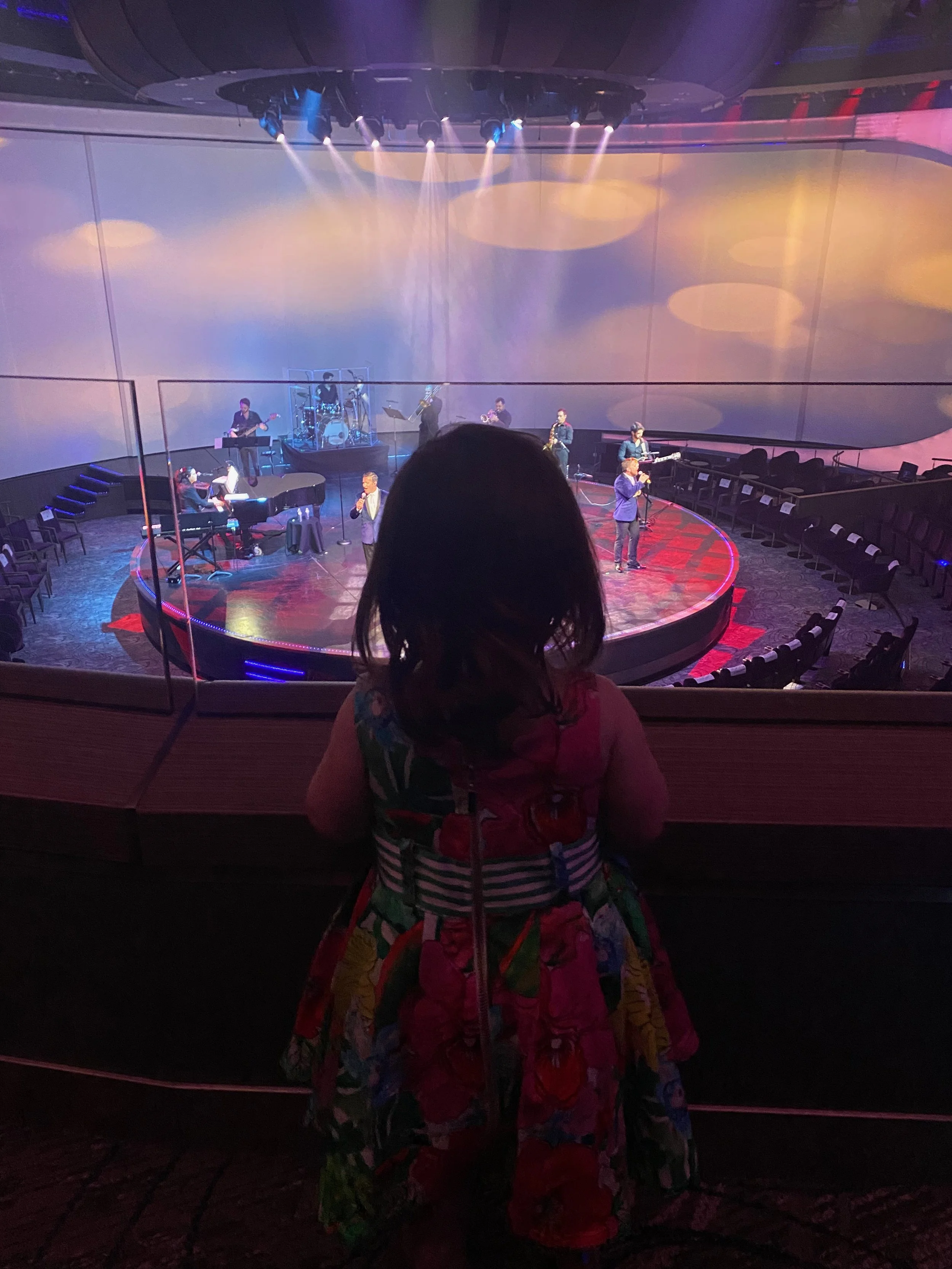 For dinner Tzvi and I were scheduled to eat late in one of the specialty restaurants, so Tzvi went with Robyn and the girls to the Normandie dining room so the girls could eat, and I went to see the show. Tonight was a performance by the Barricade Boys, a group of three guys who all met in the theater and all of them had been in some iteration of Les Mis. One in London, one in New York, and one in the movie. Of course, when I saw them later and asked who he has in the movie, he was just a guy standing in the rain. Anyway, they did a bunch of random Broadway songs but it was a very good show.