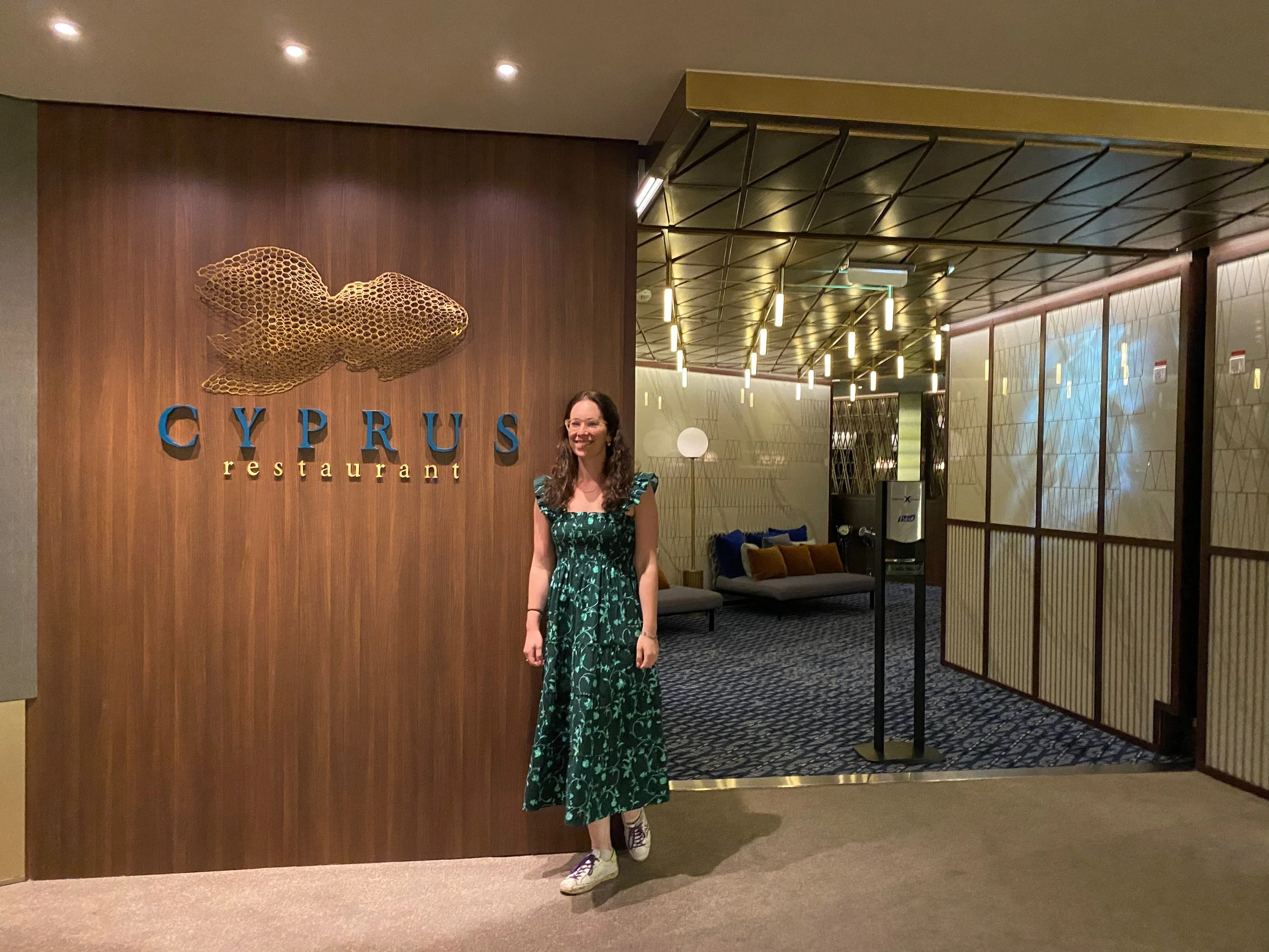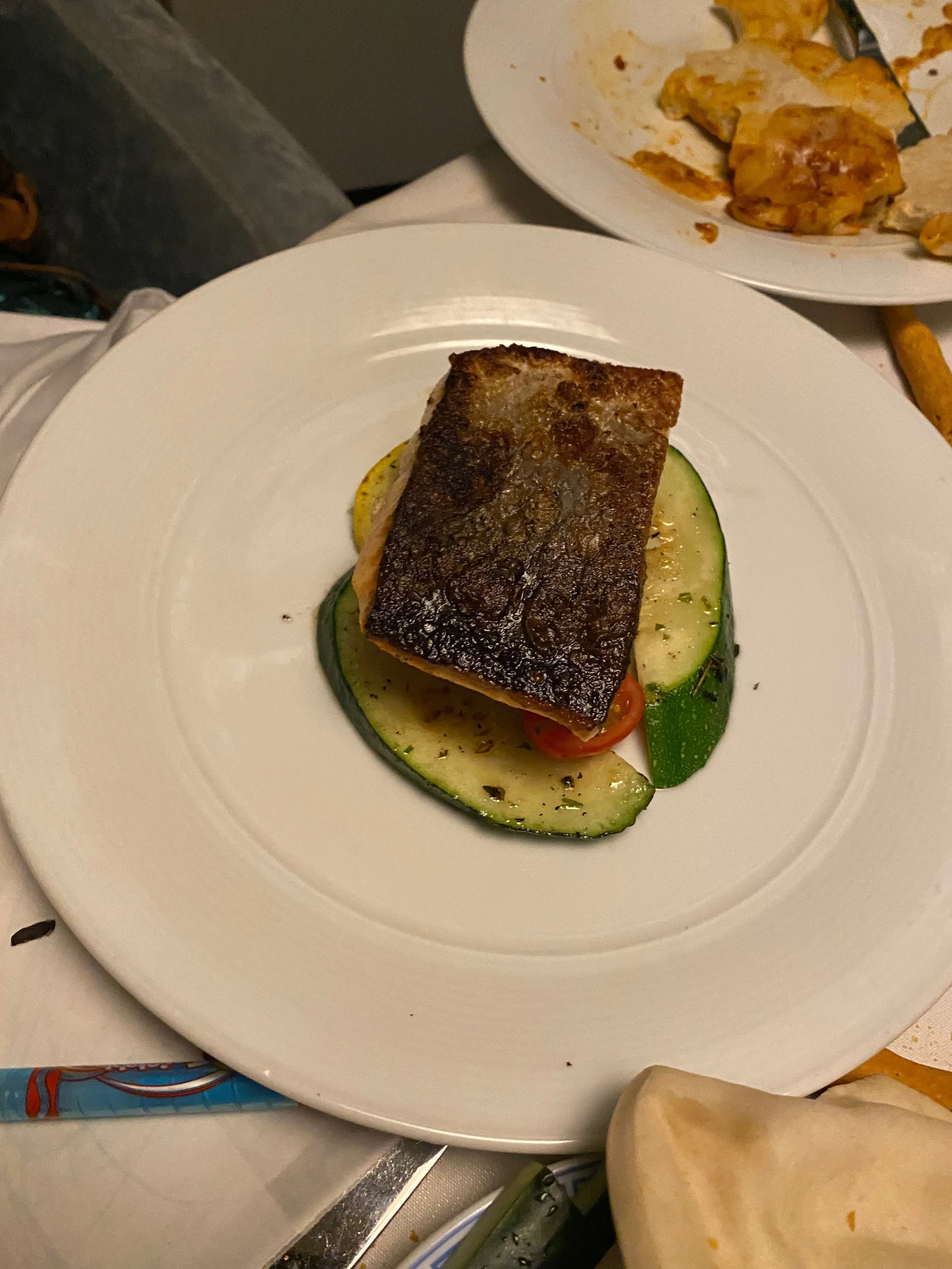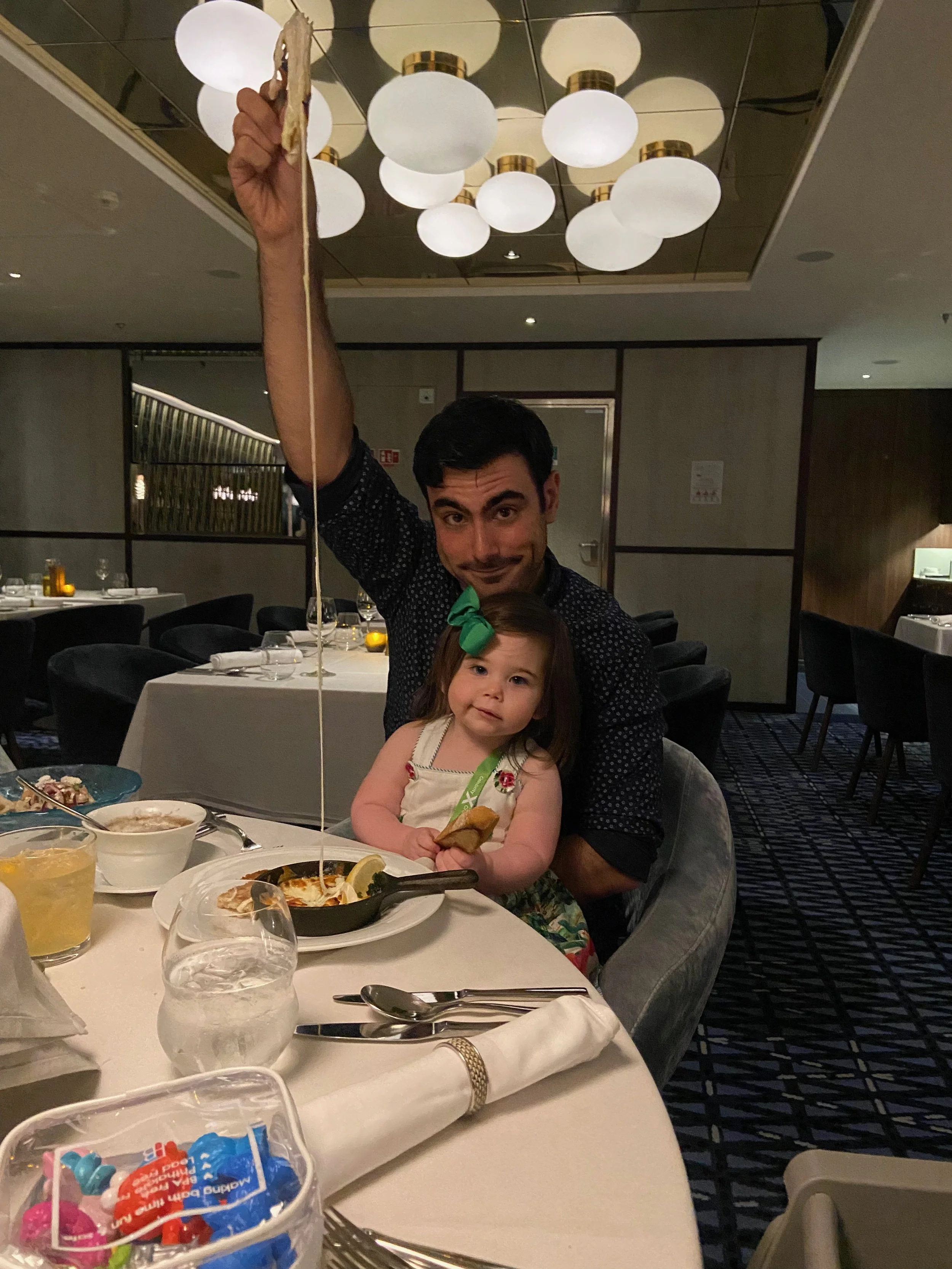 We showered and changed for our final dinner. Before dinner Tzvi took Madeleine to the Martini Bar to sit and listen to music, which she loved. Then we met for dinner in the Cyprus dining room, which we haven’t eaten in before. One of our waiters was Adityi, the guy who made the Caesar salads at the buffet. The girls were nuts, but we had a nice table near a window. I’m not sure what we ate, but Madeleine ate a lot of bread. Didn’t we all. [Tzvi: I think I had a cheese sagnaki, which was just a pot of hard melted cheese with bread. I also had a seabass seviche and a cream of mushroom soup. For mains we both had salmon.]
