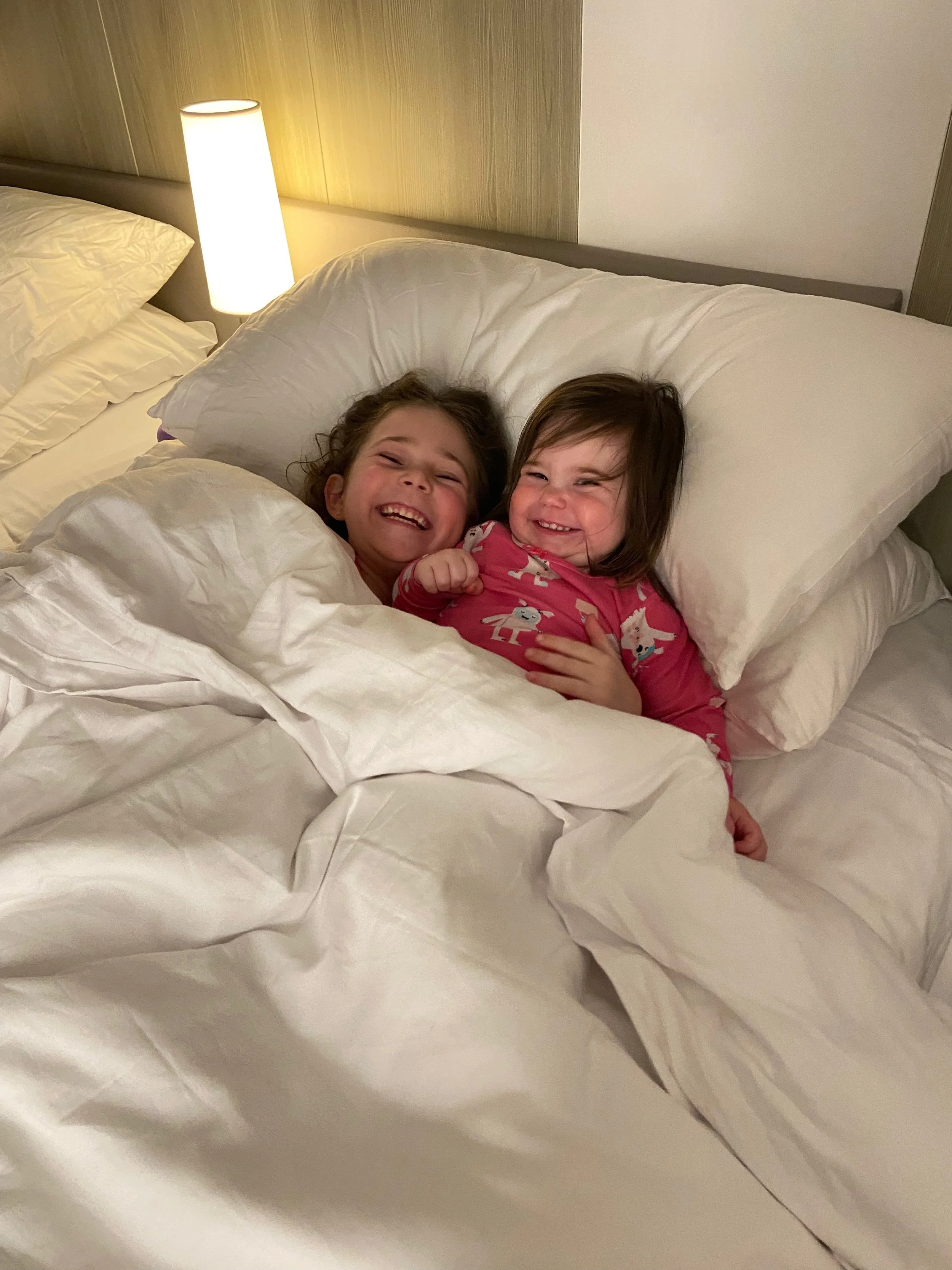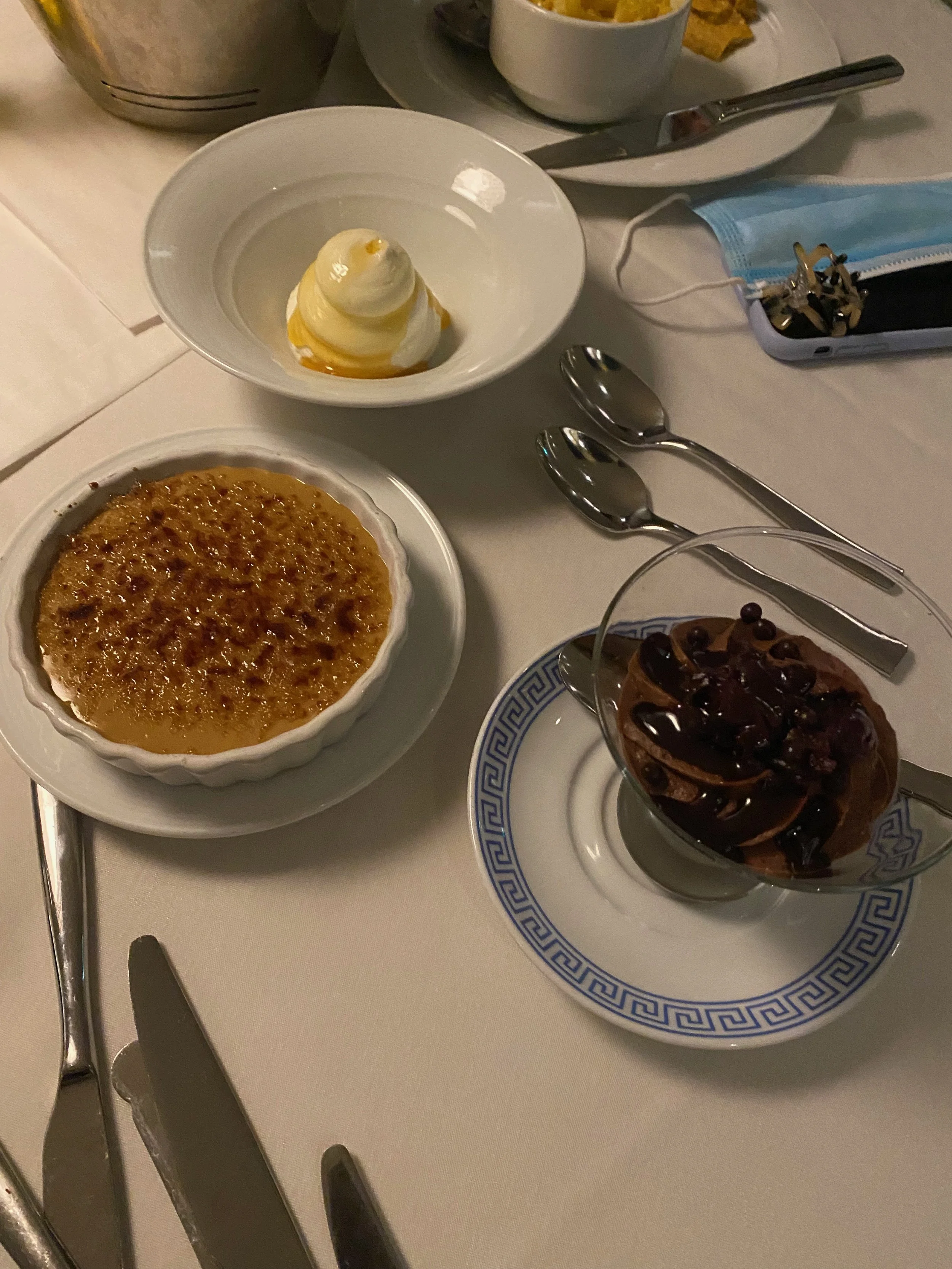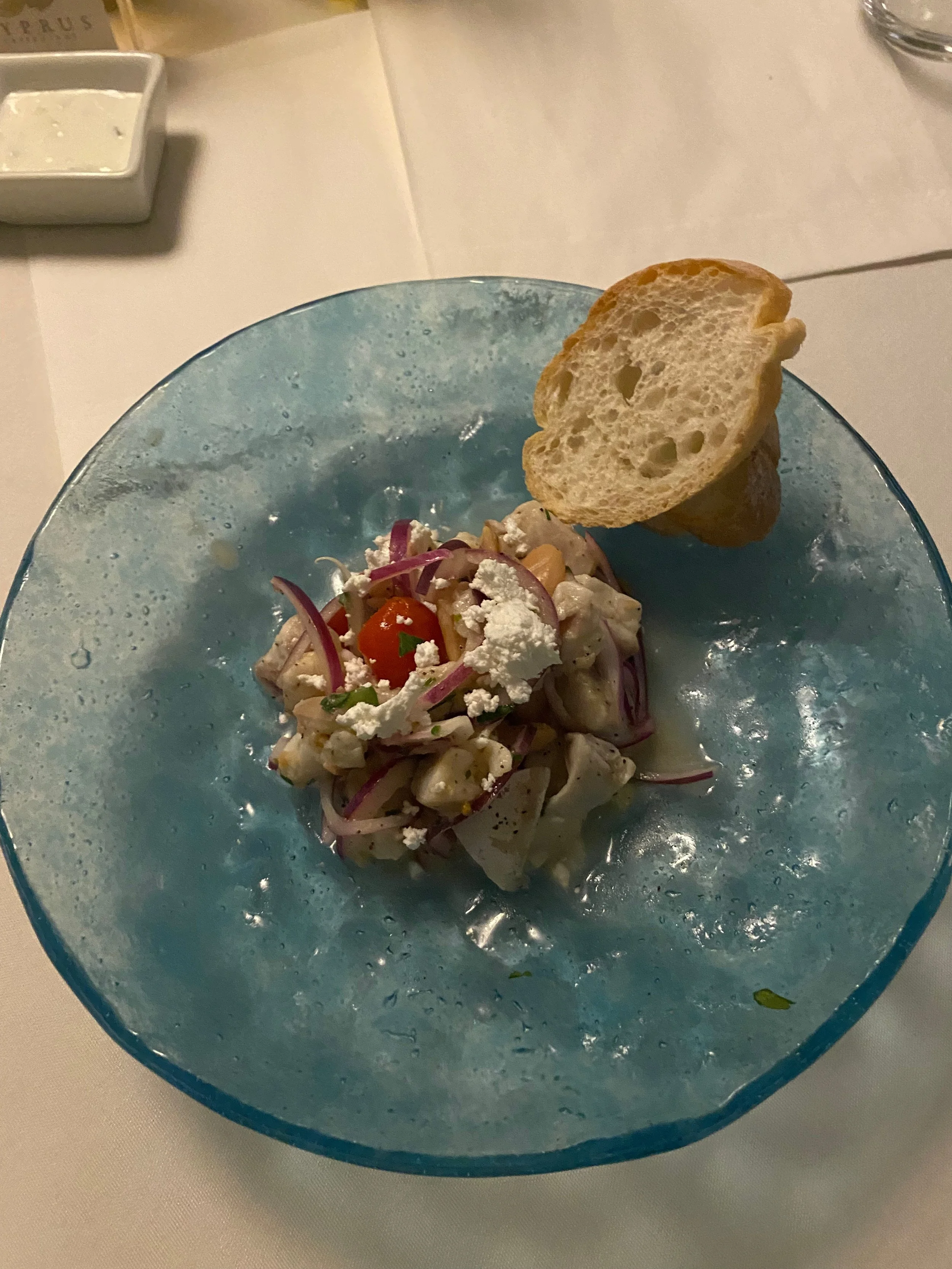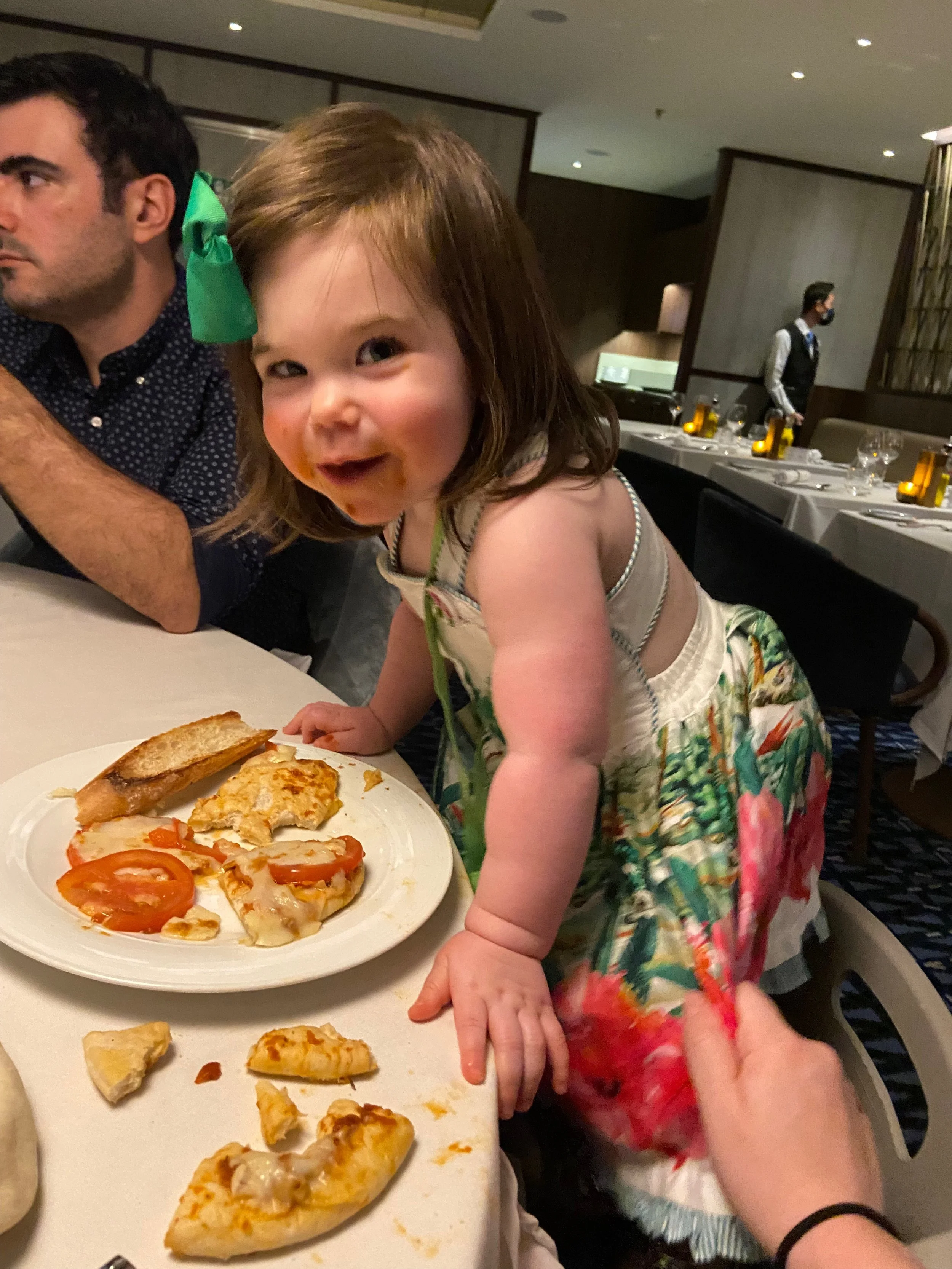 We showered and changed for our final dinner. Before dinner Tzvi took Madeleine to the Martini Bar to sit and listen to music, which she loved. Then we met for dinner in the Cyprus dining room, which we haven’t eaten in before. One of our waiters was Adityi, the guy who made the Caesar salads at the buffet. The girls were nuts, but we had a nice table near a window. I’m not sure what we ate, but Madeleine ate a lot of bread. Didn’t we all. [Tzvi: I think I had a cheese sagnaki, which was just a pot of hard melted cheese with bread. I also had a seabass seviche and a cream of mushroom soup. For mains we both had salmon.]