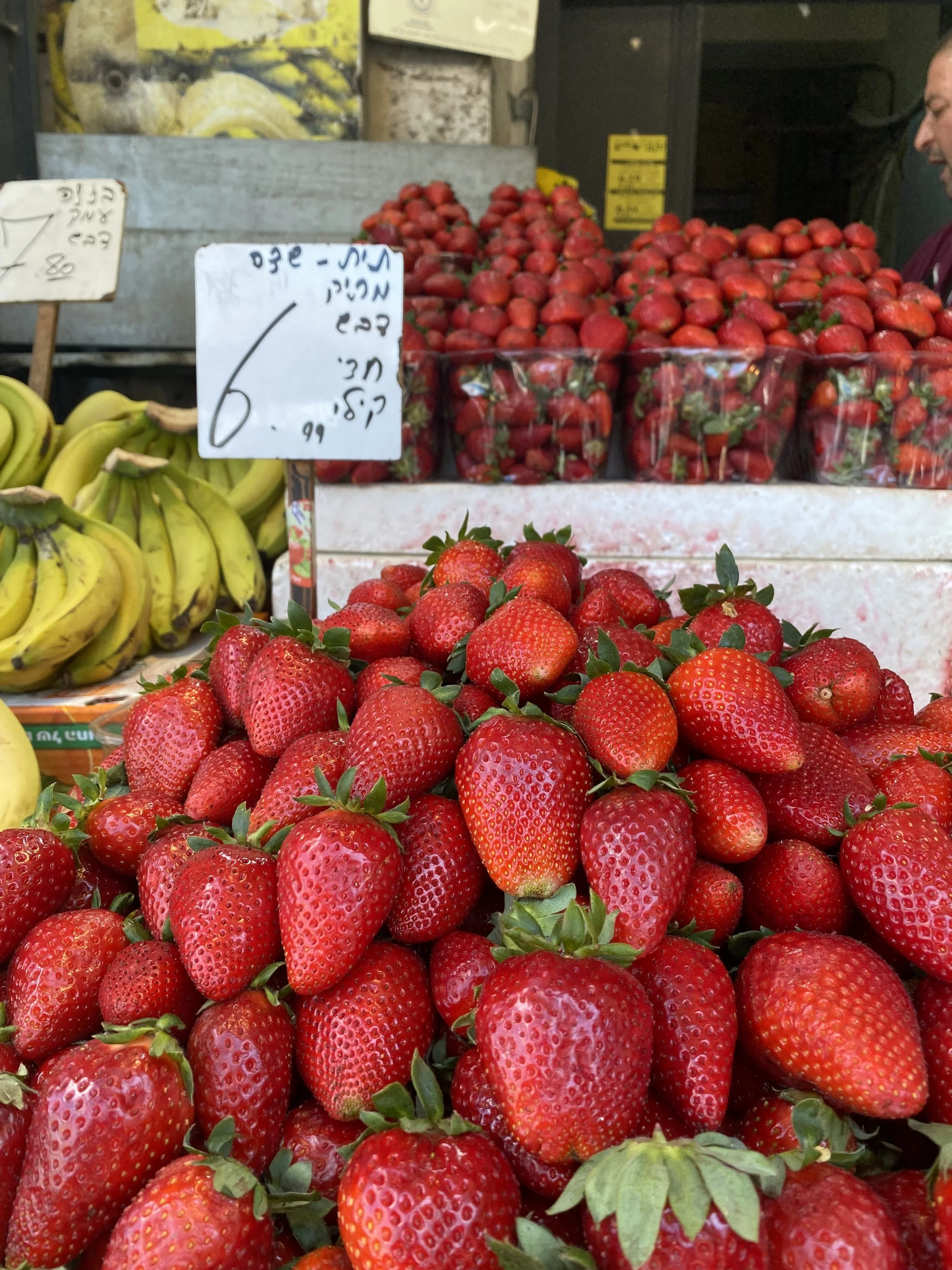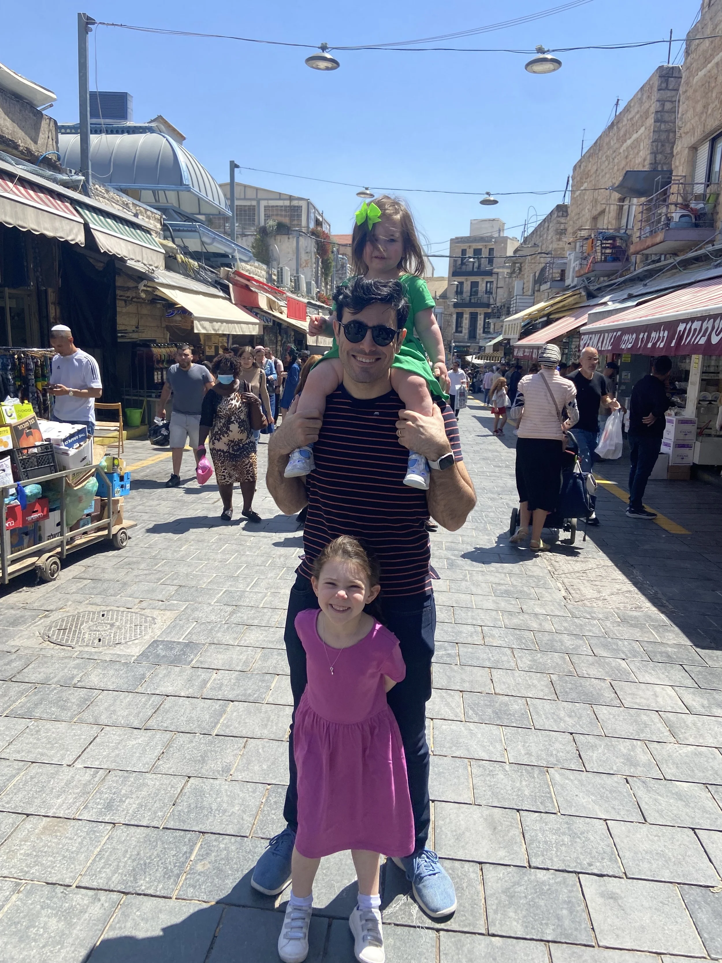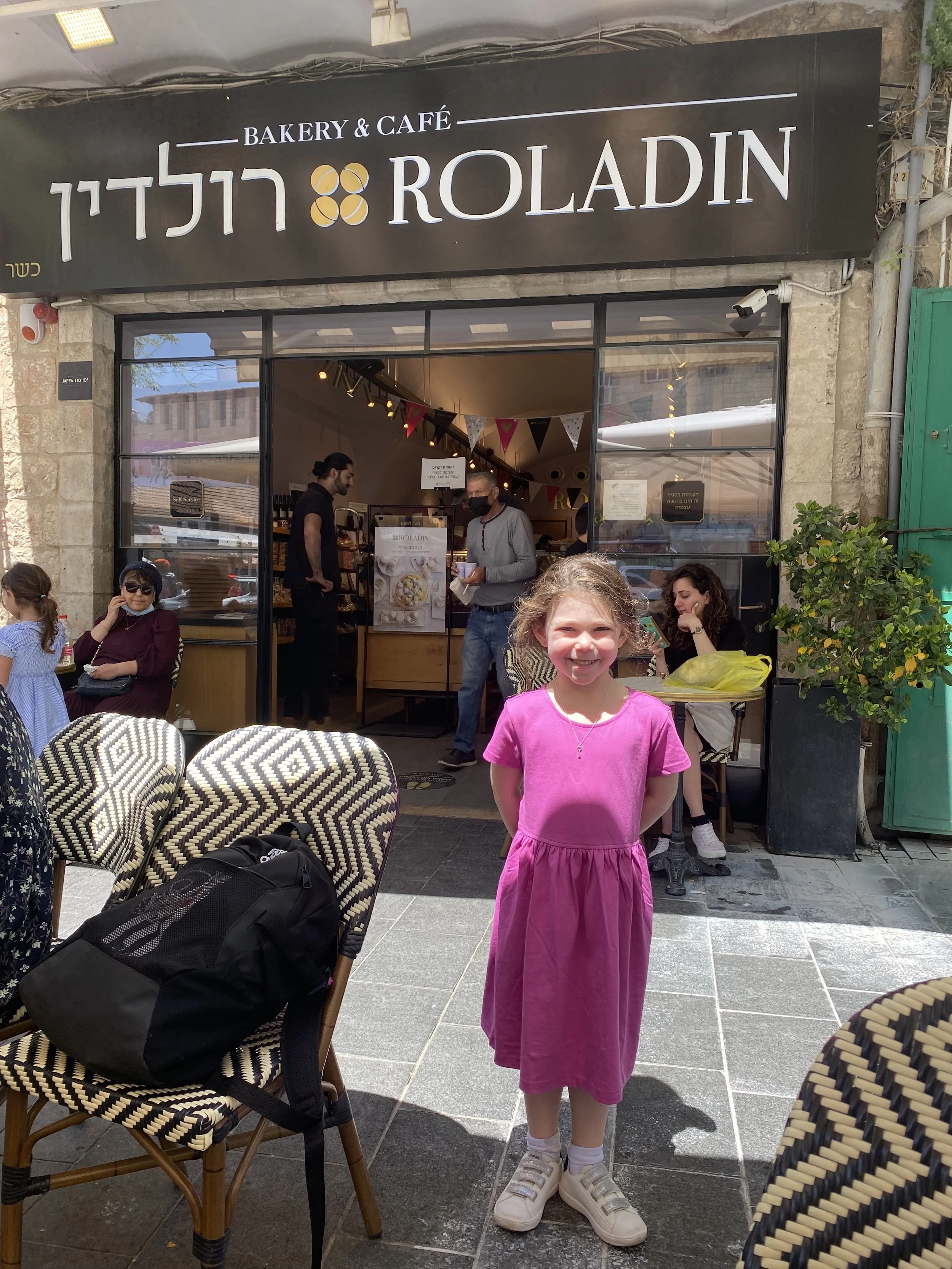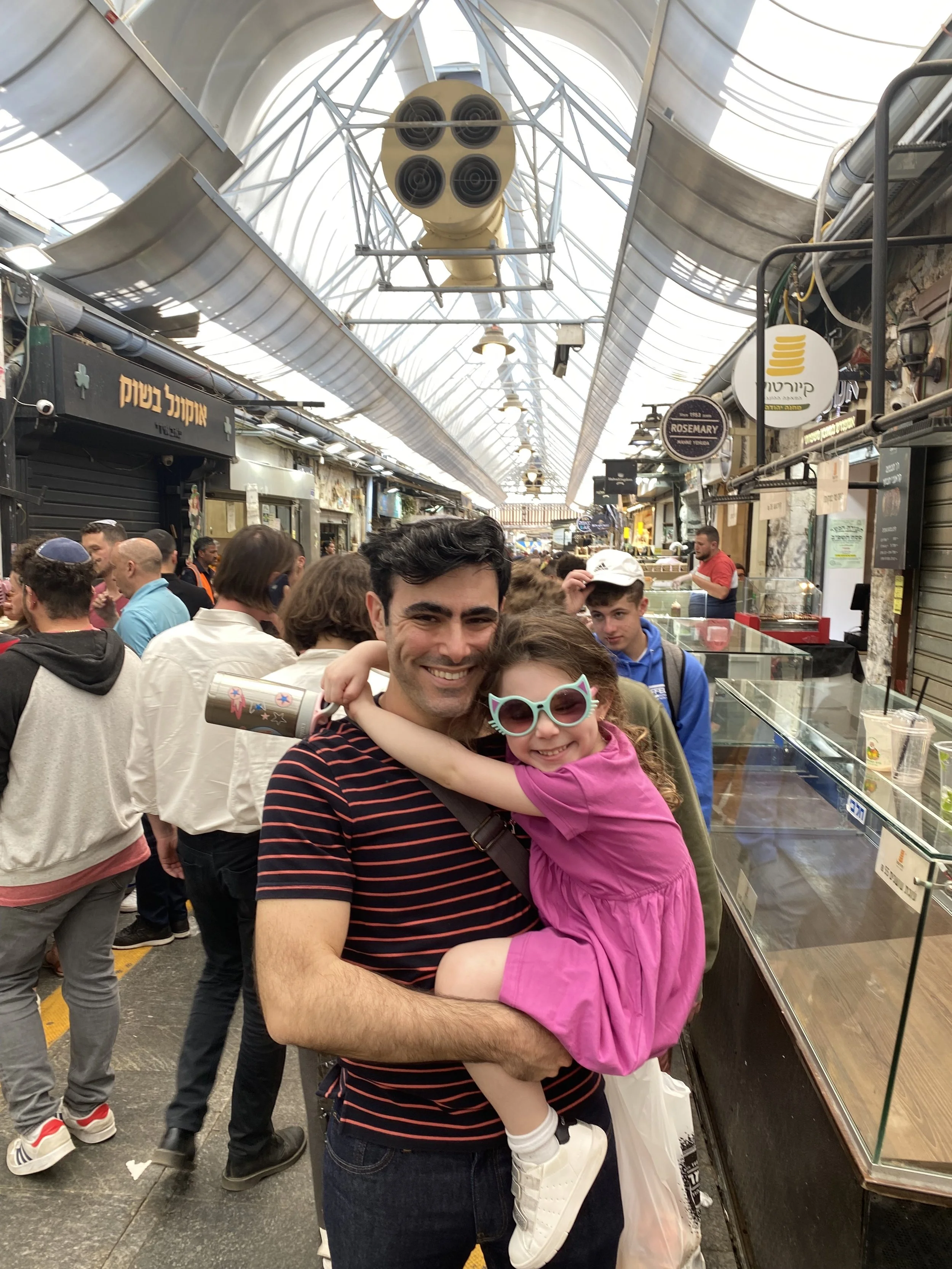 We decided to venture out! We took a cab to Machane Yehuda. We’ve given up on safety here on Day 1 and are just holding Madeleine on our laps in the taxi. We arrived at Rosemary, where we get all of our (overpriced but delicious) dried fruit. Madeleine was so excited because we were at the “mango store.” We walked around some more and ended up stopping at Roladin for snacks and iced coffee. Apparently the ice café (not iced coffee) is Kitniyot. Who knew? (And who cares?). We also had some borekas, which basically tasted like regular non-Pesach borekas. The girls enjoyed watching the light rail go back and forth. We got some strawberries (it’s amazing how good the fruit is here, probably because it's freshly picked on some kibbutz and shipped directly to the shuk) and bucket hats, because those are apparently a thing now. Then we got a taxi to my parents’ brand new apartment.