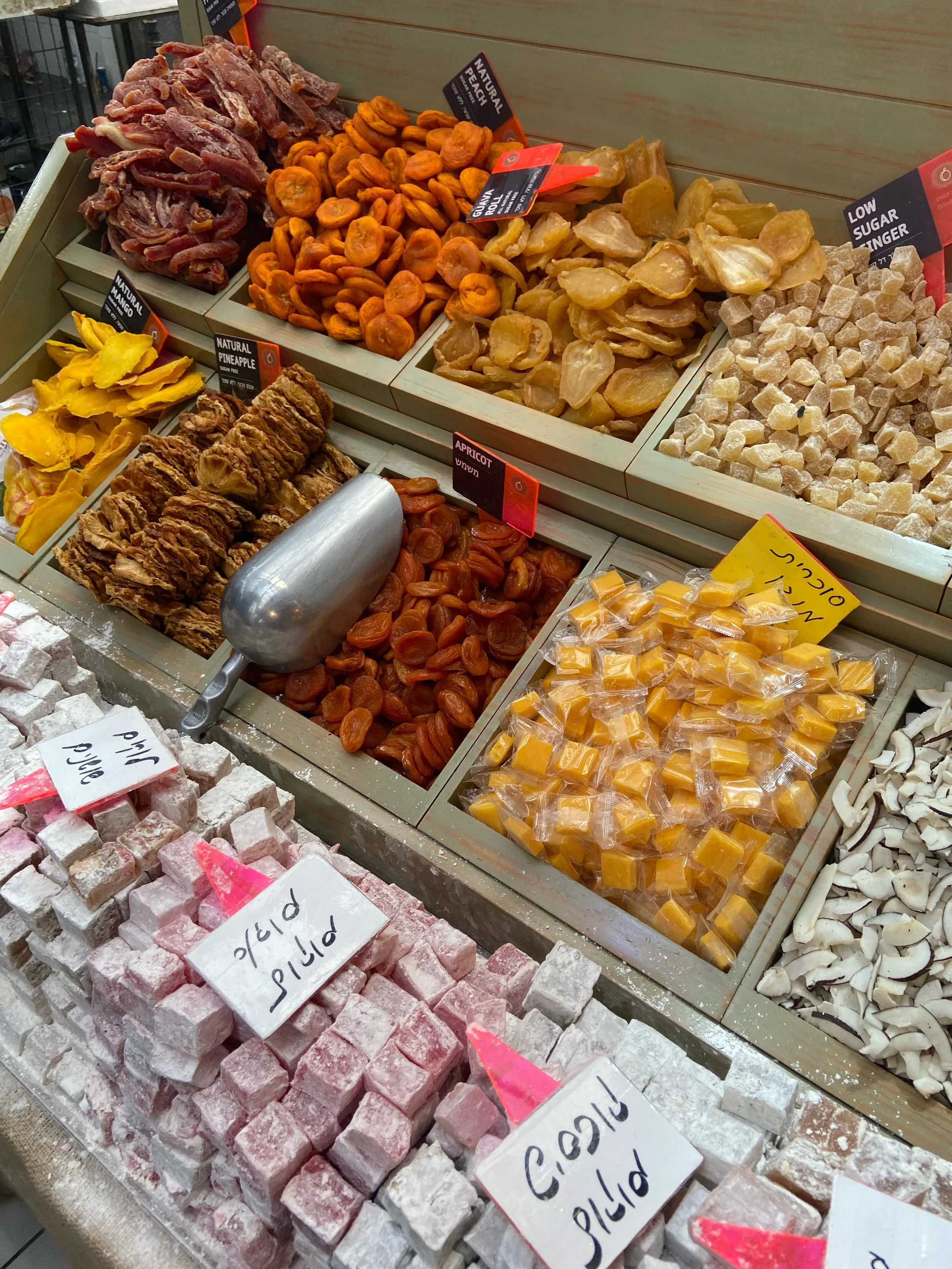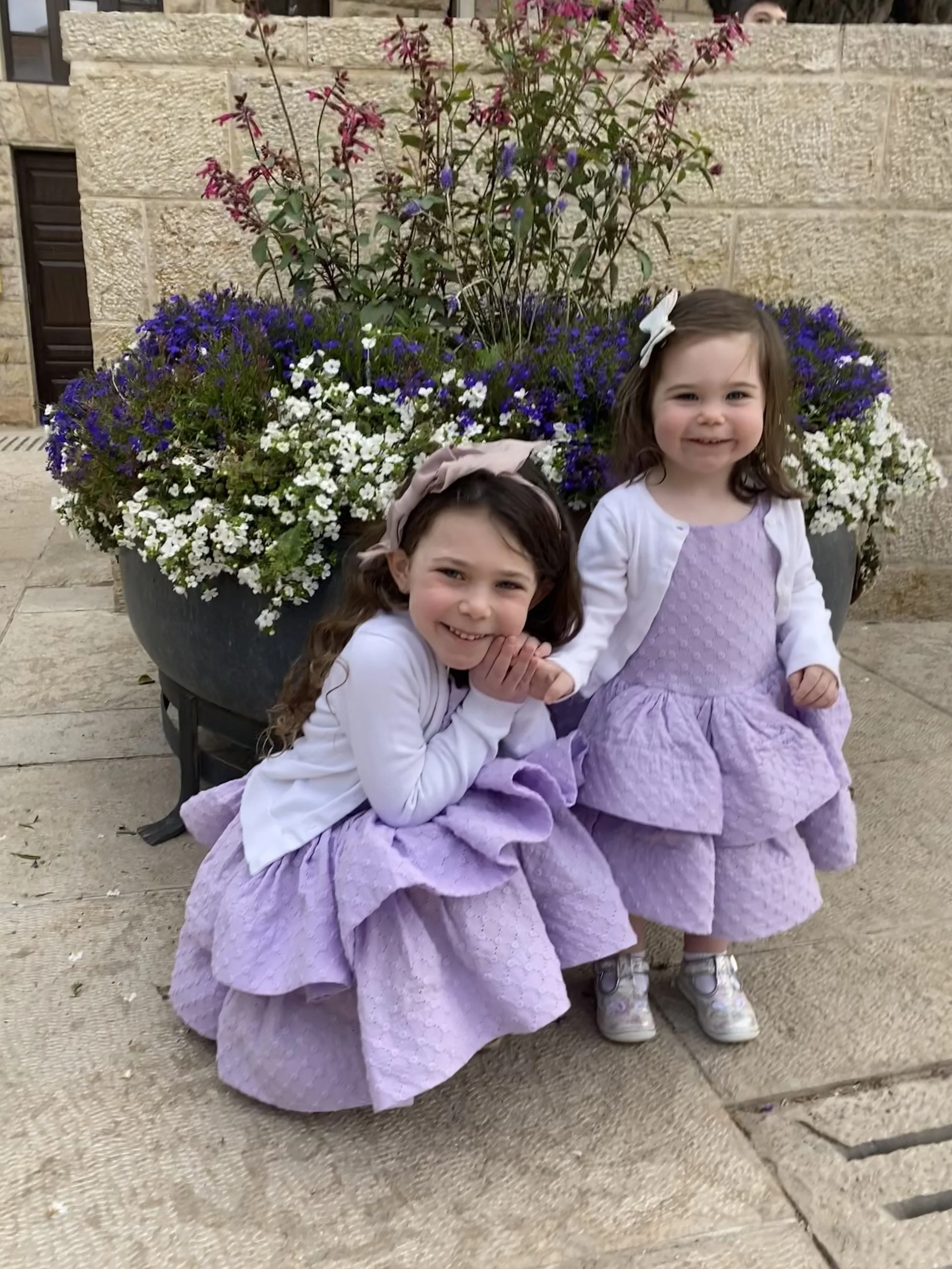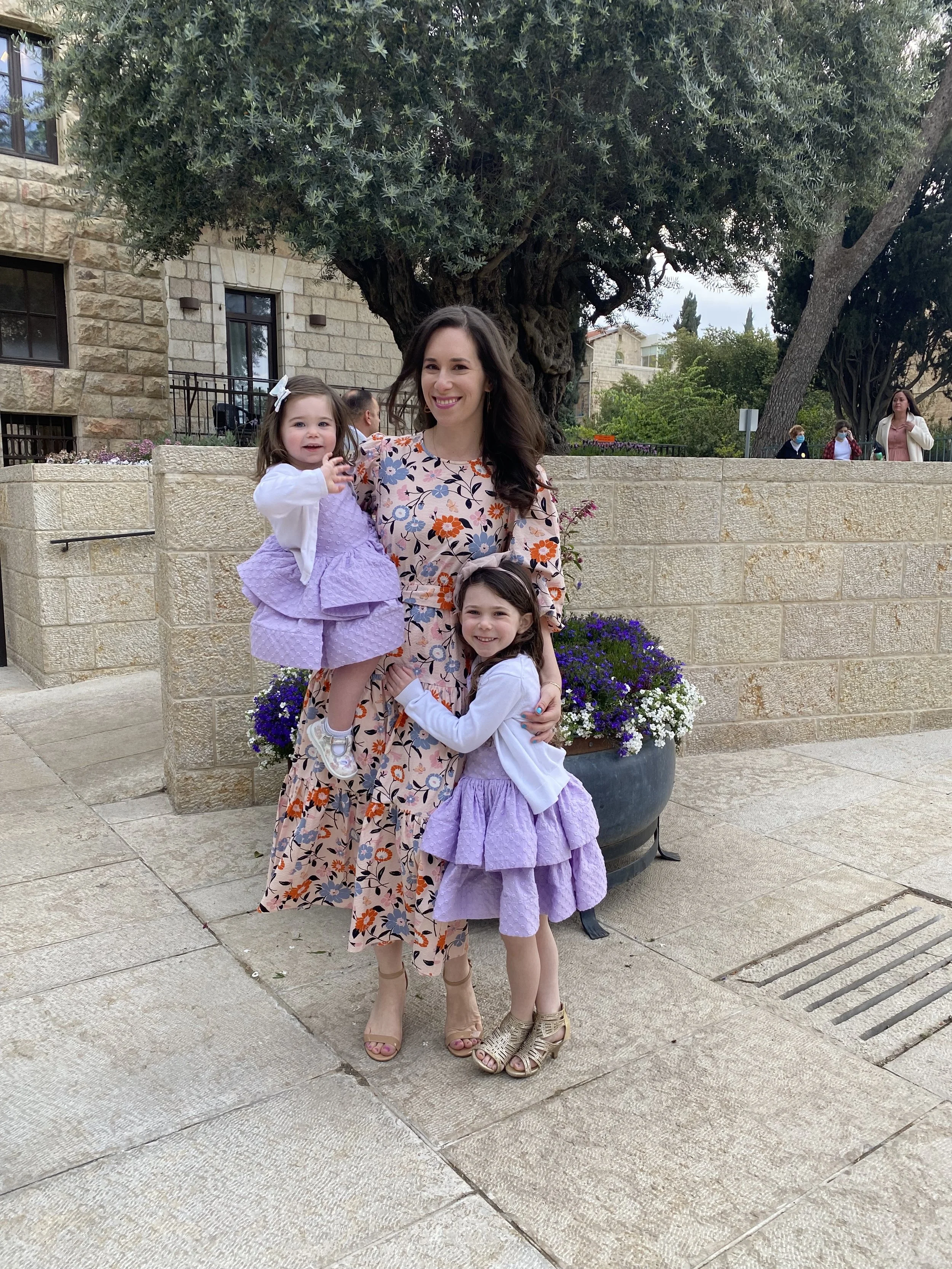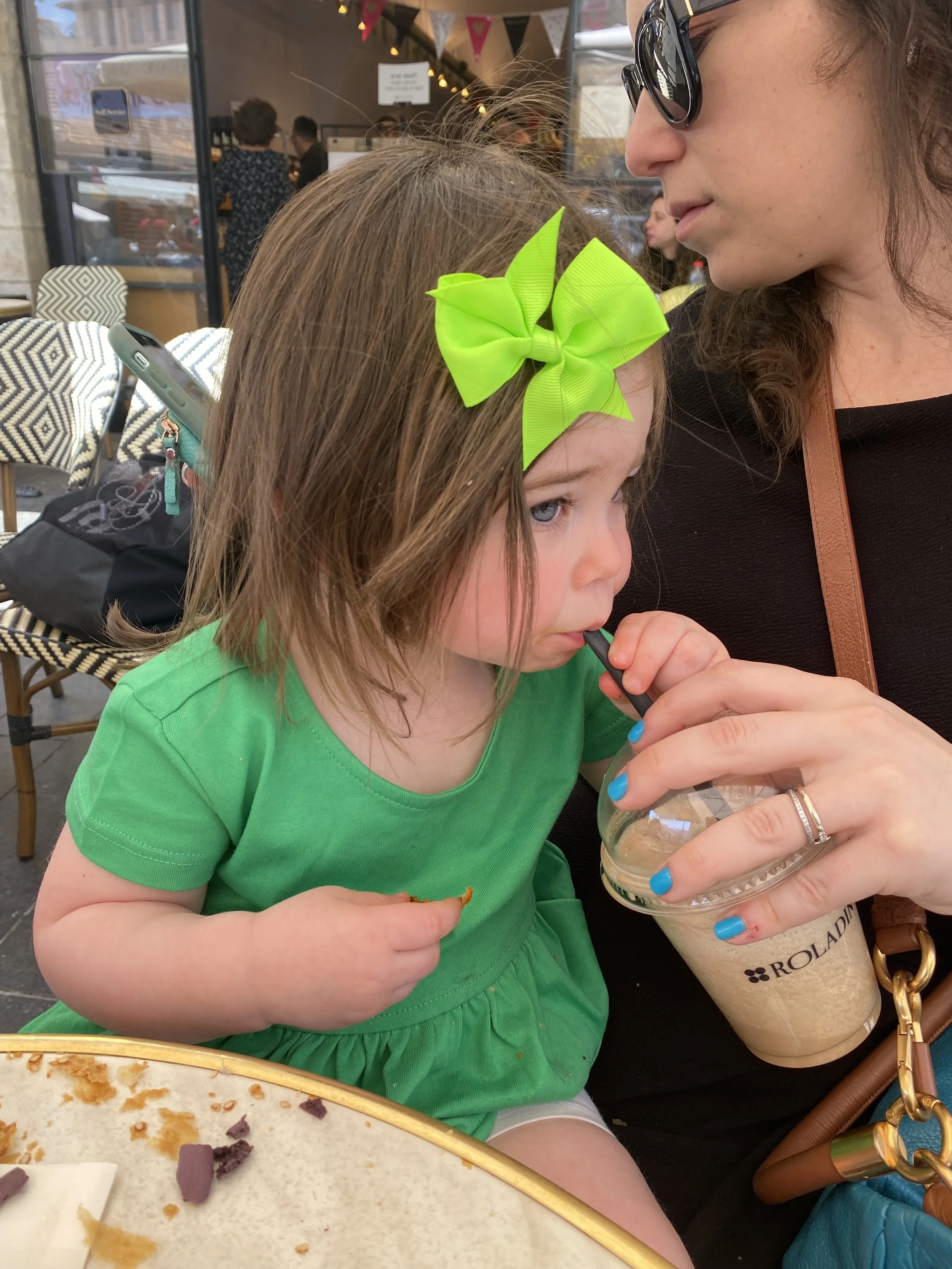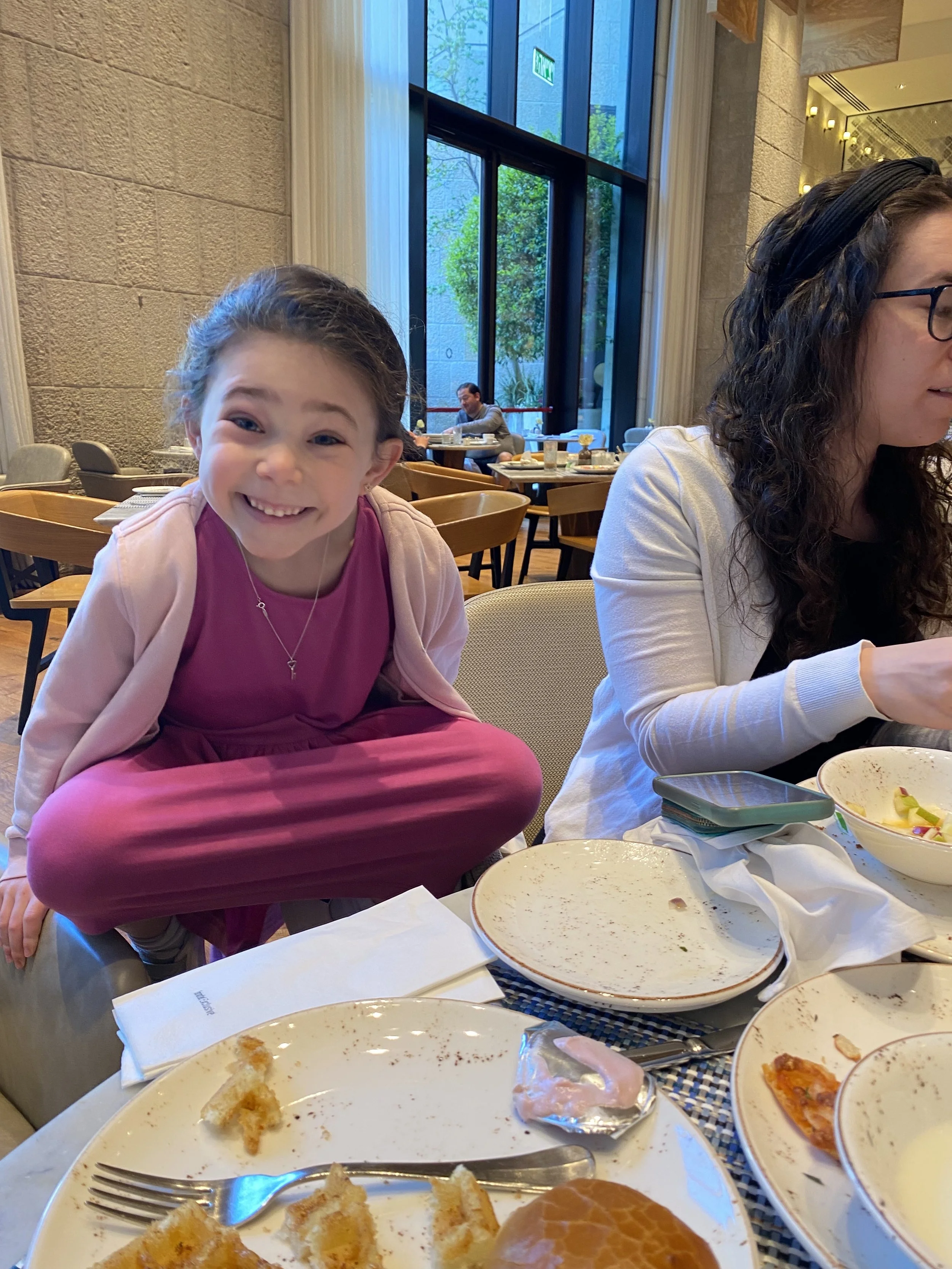 We decided to venture out! We took a cab to Machane Yehuda. We’ve given up on safety here on Day 1 and are just holding Madeleine on our laps in the taxi. We arrived at Rosemary, where we get all of our (overpriced but delicious) dried fruit. Madeleine was so excited because we were at the “mango store.” We walked around some more and ended up stopping at Roladin for snacks and iced coffee. Apparently the ice café (not iced coffee) is Kitniyot. Who knew? (And who cares?). We also had some borekas, which basically tasted like regular non-Pesach borekas. The girls enjoyed watching the light rail go back and forth. We got some strawberries (it’s amazing how good the fruit is here, probably because it's freshly picked on some kibbutz and shipped directly to the shuk) and bucket hats, because those are apparently a thing now. Then we got a taxi to my parents’ brand new apartment.