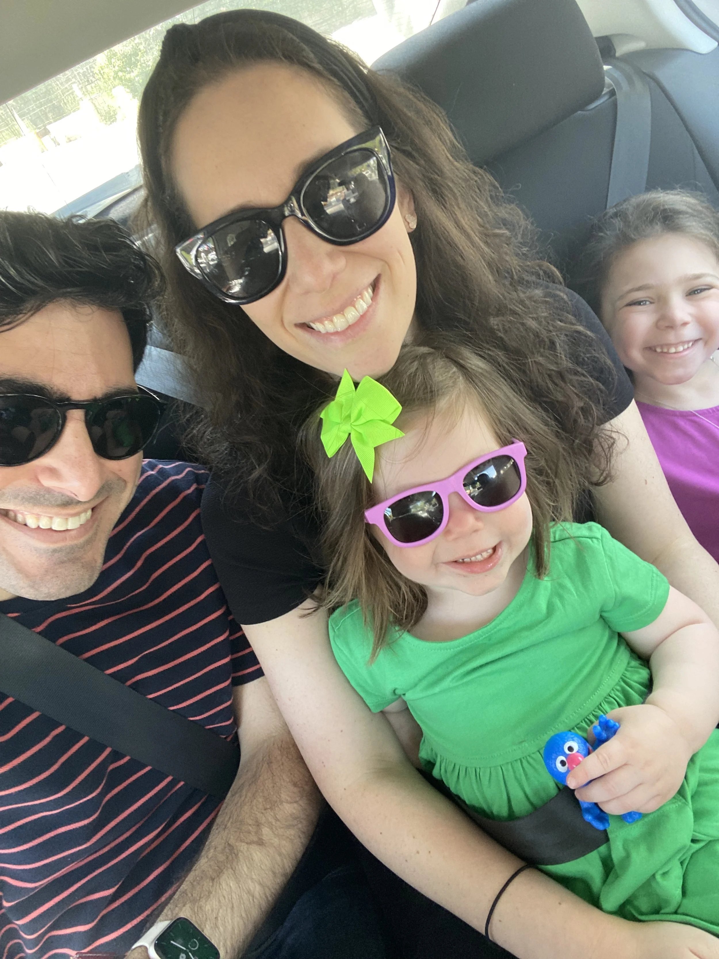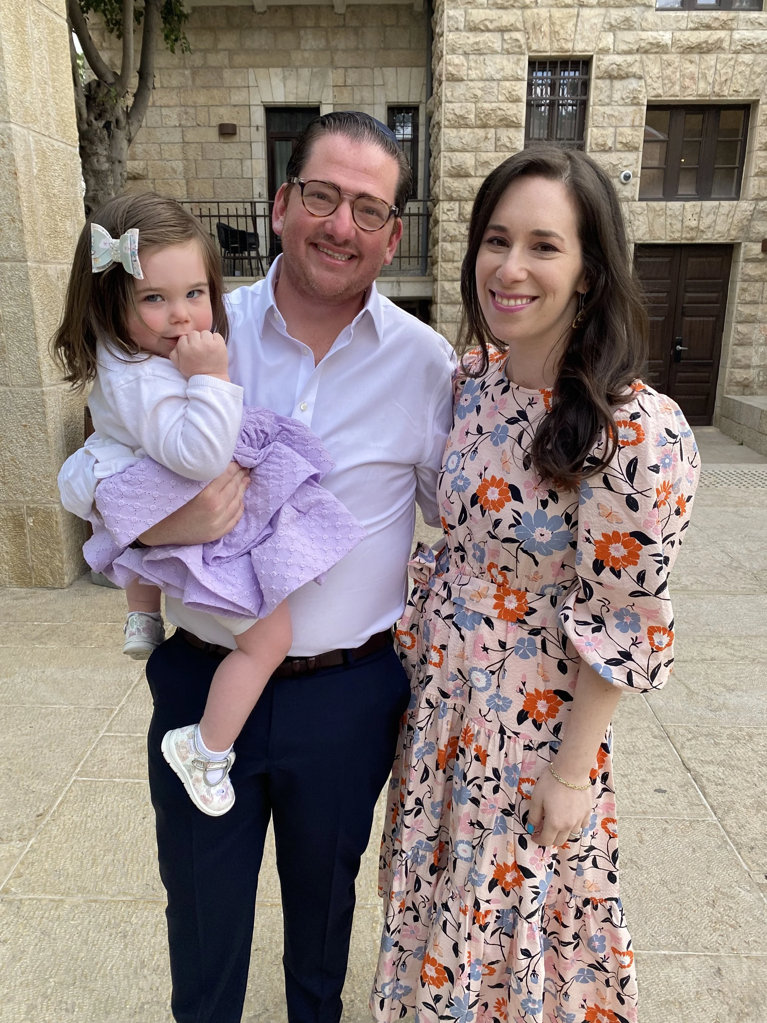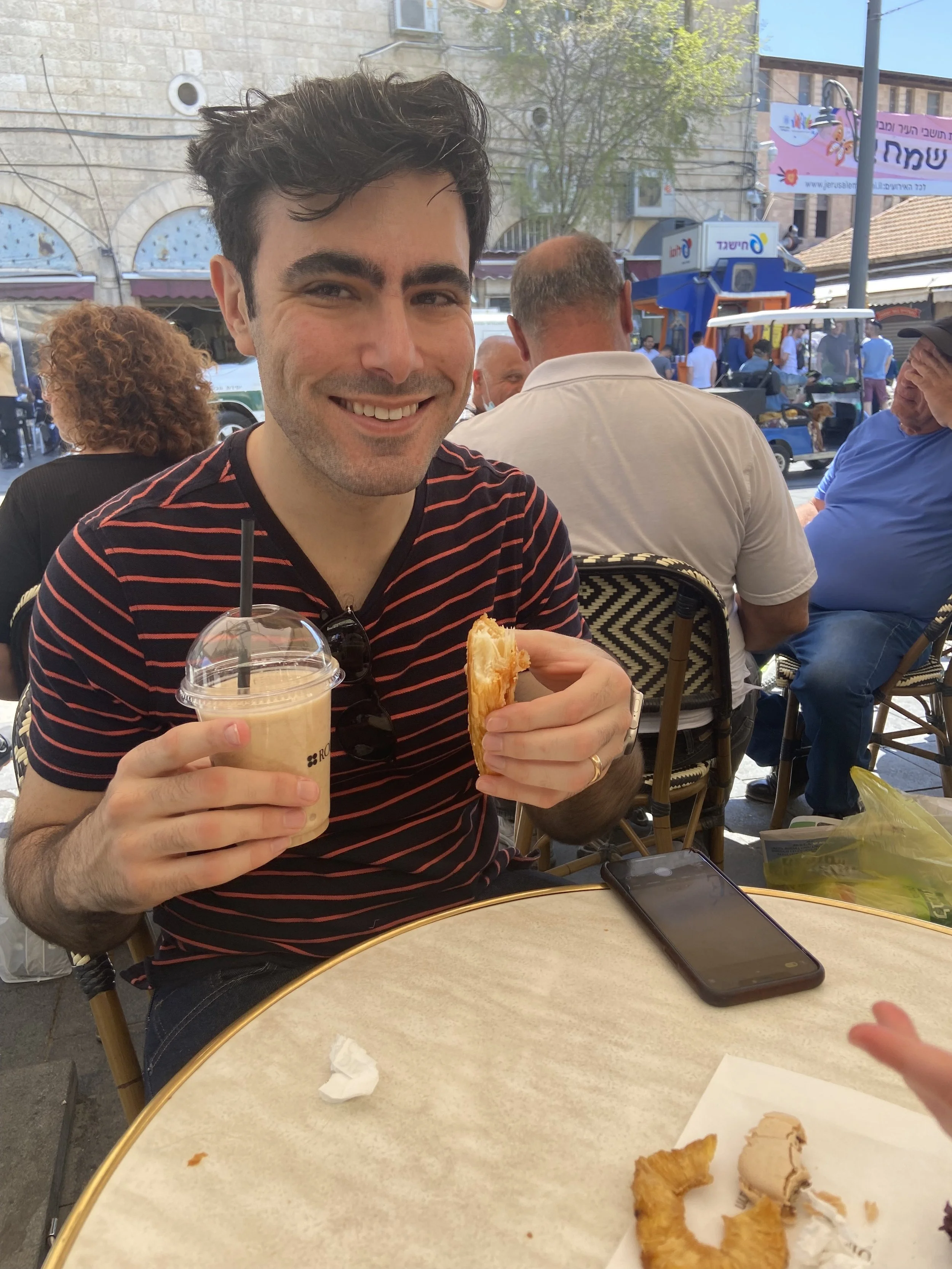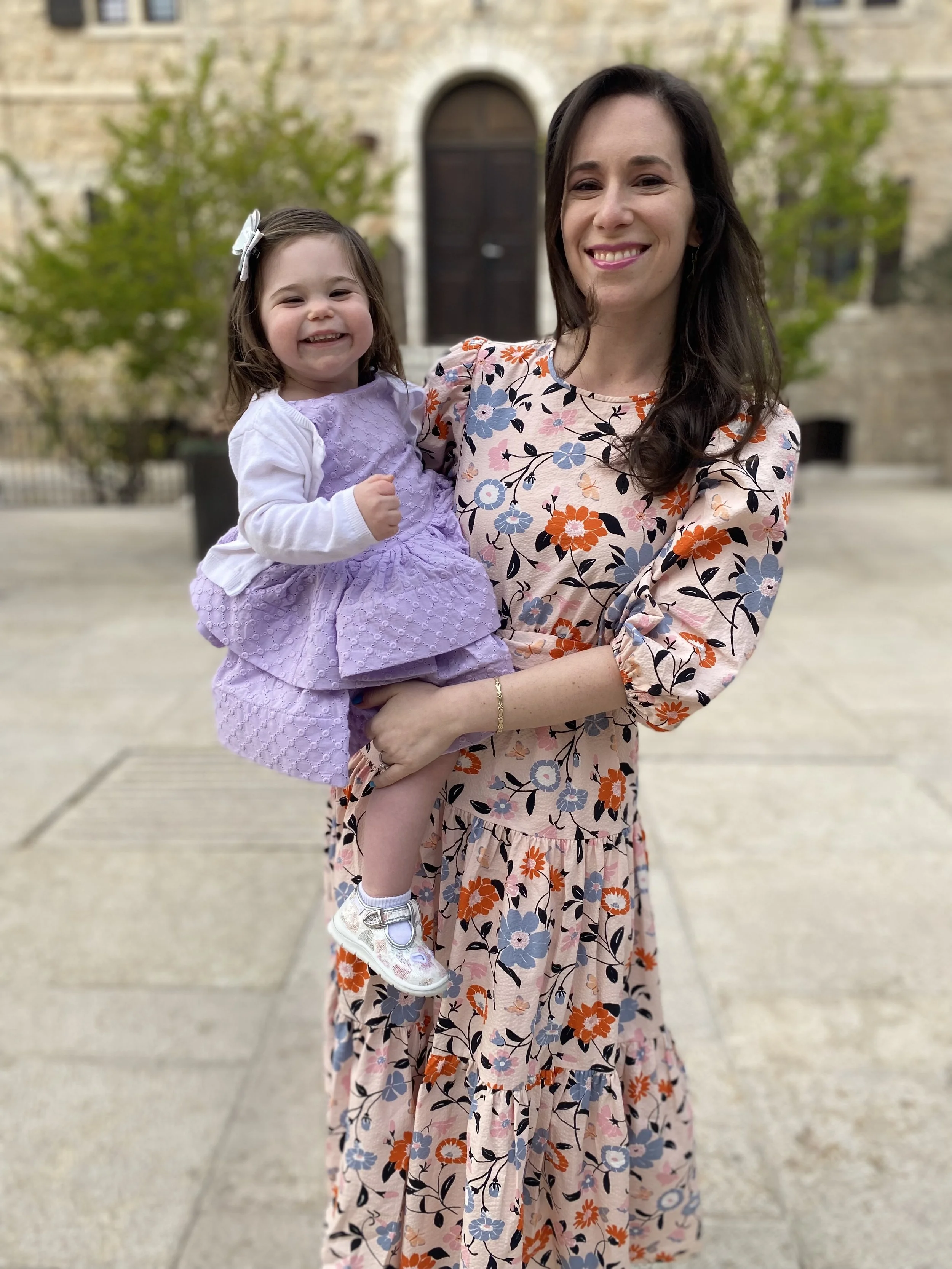 We decided to venture out! We took a cab to Machane Yehuda. We’ve given up on safety here on Day 1 and are just holding Madeleine on our laps in the taxi. We arrived at Rosemary, where we get all of our (overpriced but delicious) dried fruit. Madeleine was so excited because we were at the “mango store.” We walked around some more and ended up stopping at Roladin for snacks and iced coffee. Apparently the ice café (not iced coffee) is Kitniyot. Who knew? (And who cares?). We also had some borekas, which basically tasted like regular non-Pesach borekas. The girls enjoyed watching the light rail go back and forth. We got some strawberries (it’s amazing how good the fruit is here, probably because it's freshly picked on some kibbutz and shipped directly to the shuk) and bucket hats, because those are apparently a thing now. Then we got a taxi to my parents’ brand new apartment.