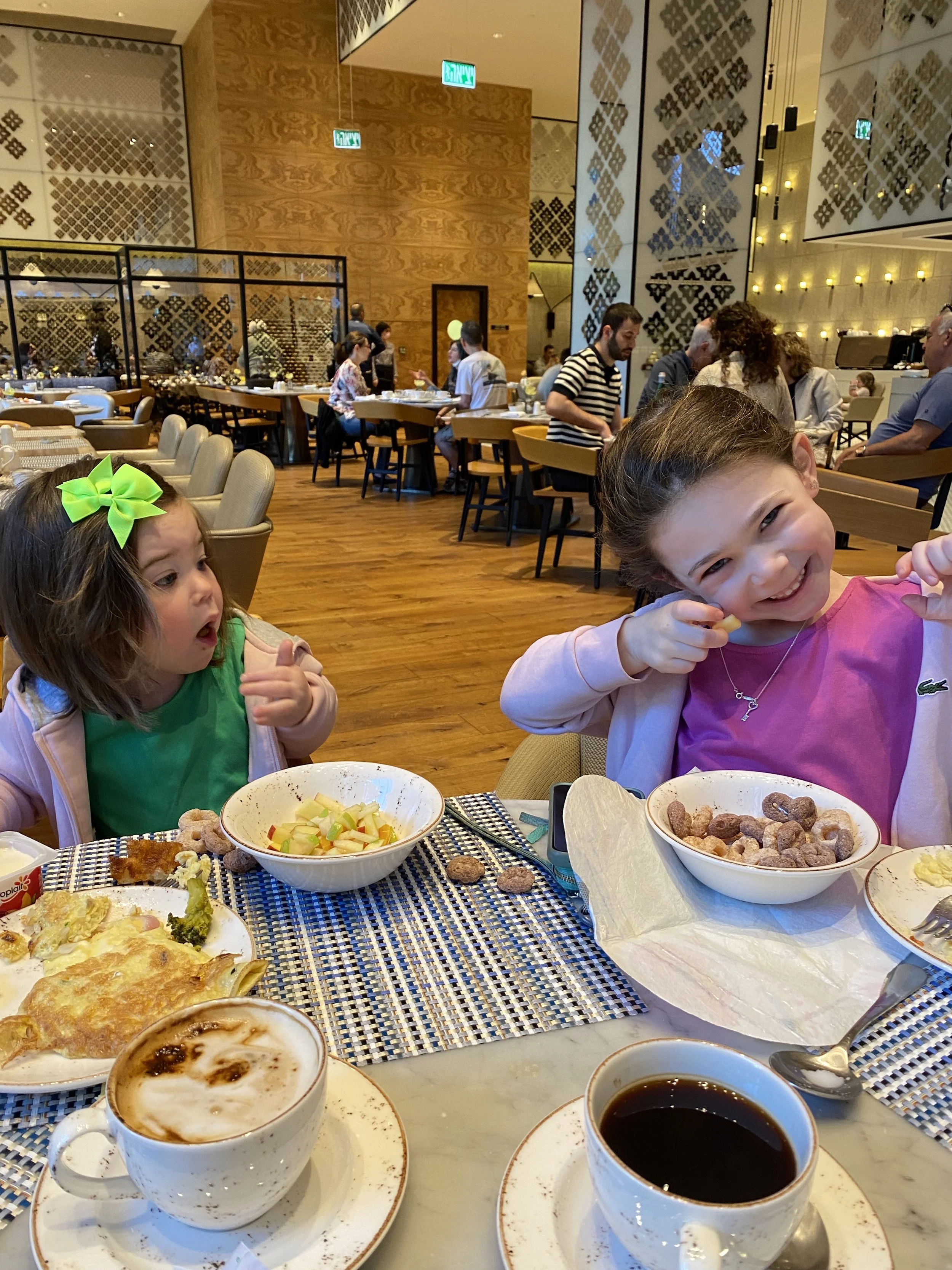 We didn’t actually get up until 10ish when we got a call from my mom that breakfast was ending soon. Well, we sprang into action and got ready in minutes and made it to breakfast with a few minutes to spare. Everything was already pesach, but still a good breakfast. Obviously it’s better if you love dairy and all the vegetables. The girls didn’t care for the pancakes or waffles, but we managed.