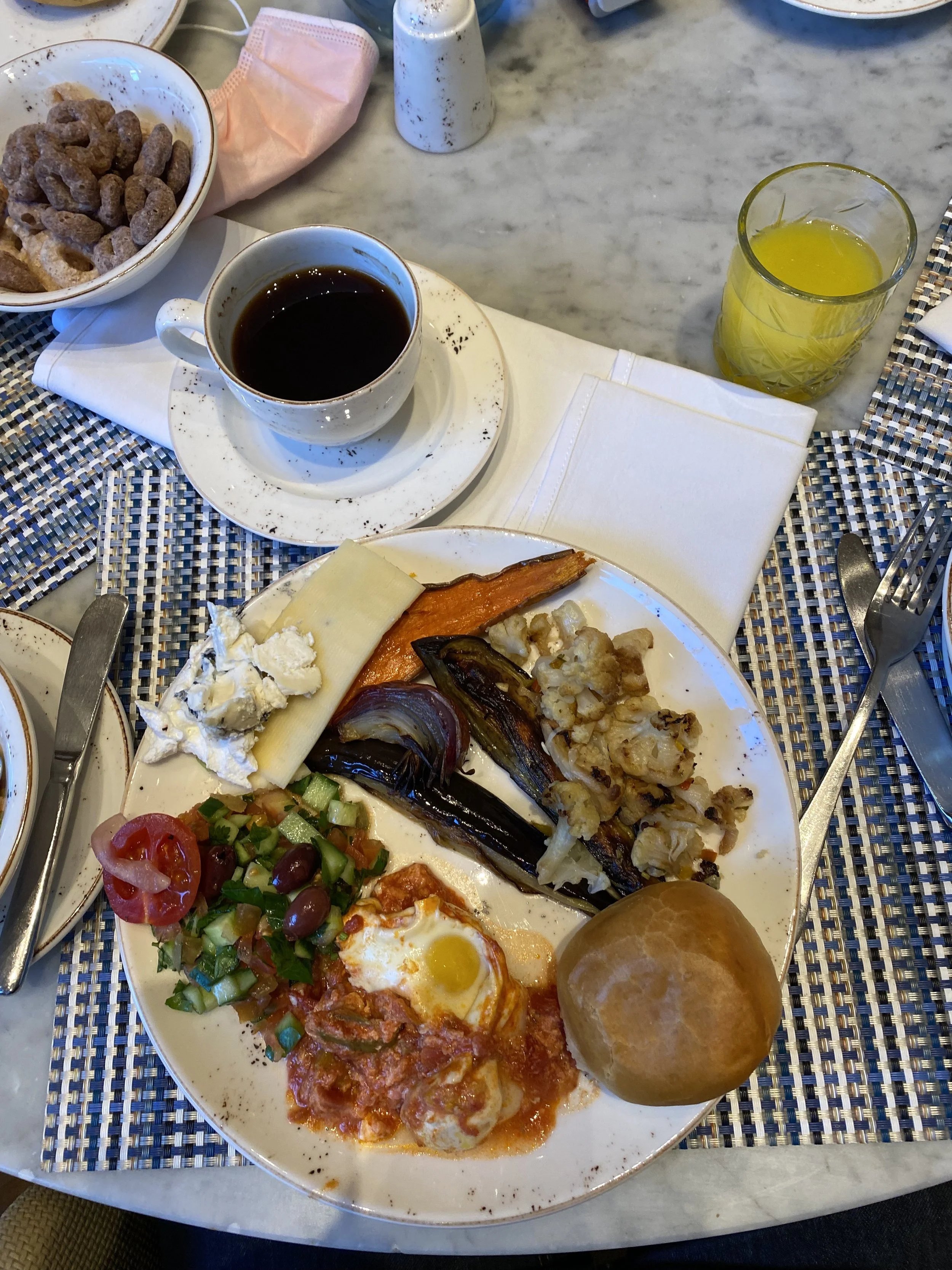 The actual food for the seder was good too. It was all buffet, and Tzvi instructed everyone on how to organize their courses. To start, we did a fish course, which meant gefilte fish, ceviche (for those who ate it), and some kind of whitefish and potato salad with hard boiled egg that Tzvi really liked. Next was the soup course – they had chicken soup with matzo balls and a carrot ginger soup; both were good. After that we did a meat appetizer course, consisting of some kind of dried meat that I think was a dried duck breast, chopped liver, and foie gras. (I didn’t eat any of those but Tzvi loved it all.). Next up was the salad course – there was a full table of leafy salads, israeli salad, cold grilled veggies, matbucha, etc. Finally, if you were still hungry, you could move on to the entrée course. Thankfully there were very large plates and Tzvi filled his with entrecote (steak), pargiot, carved lamb, veal and goose leg. I think there were also some hot veggies on that same plate. It was quite a feast. Oh, and I forgot to mention dessert – there was of course a full table of little cakes, macarons, merengues, mouse cups and pastries (I think the best was a little pecan tart), as well as a mouse crumble with nuts and caramel sauce. Most of the desserts were actually really good.