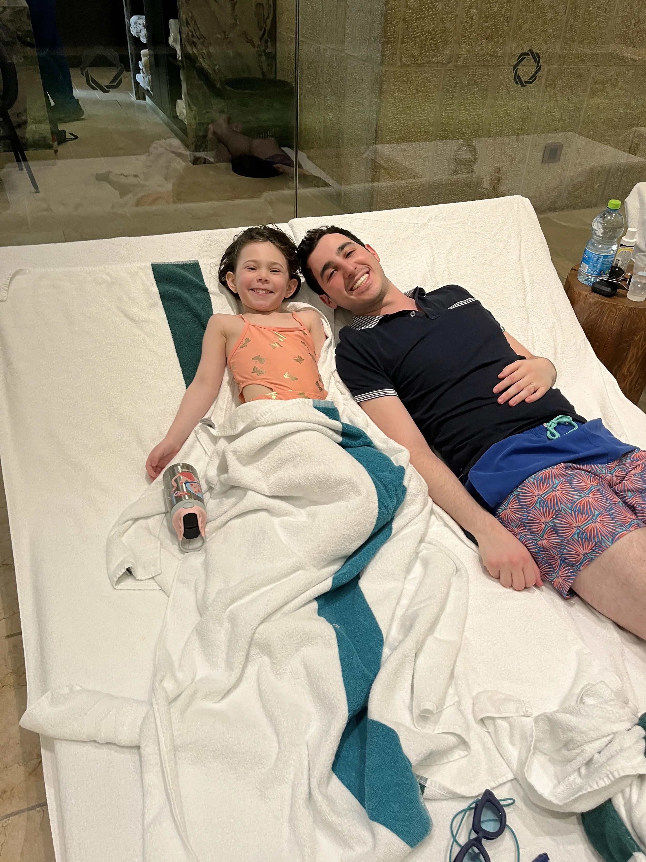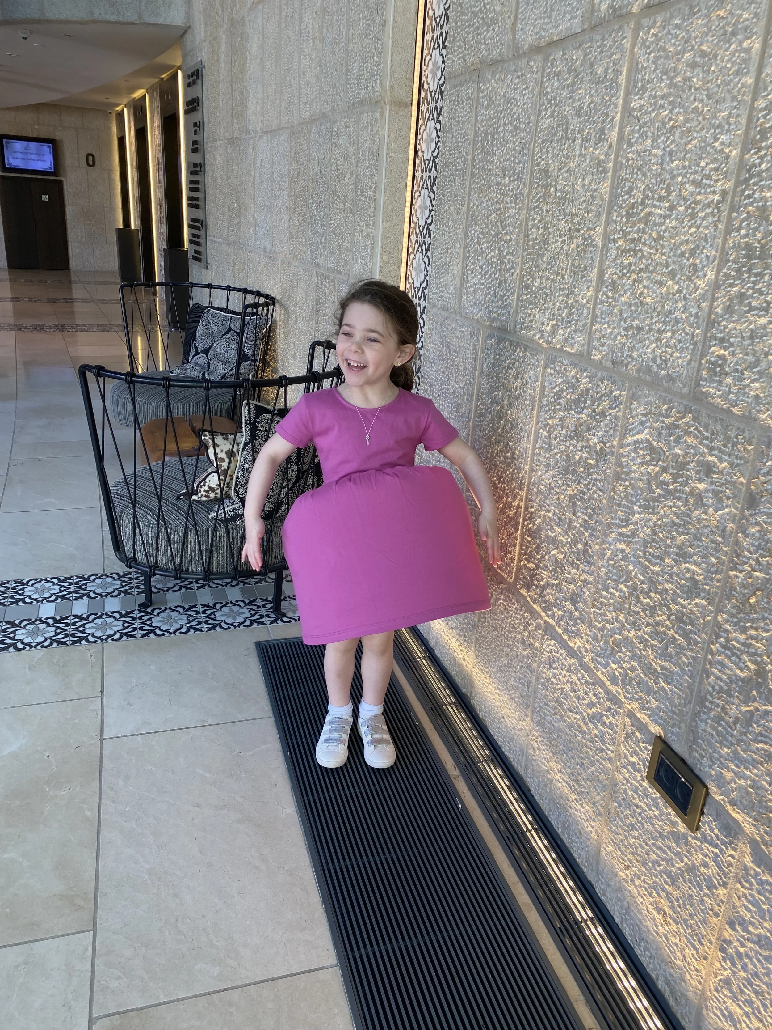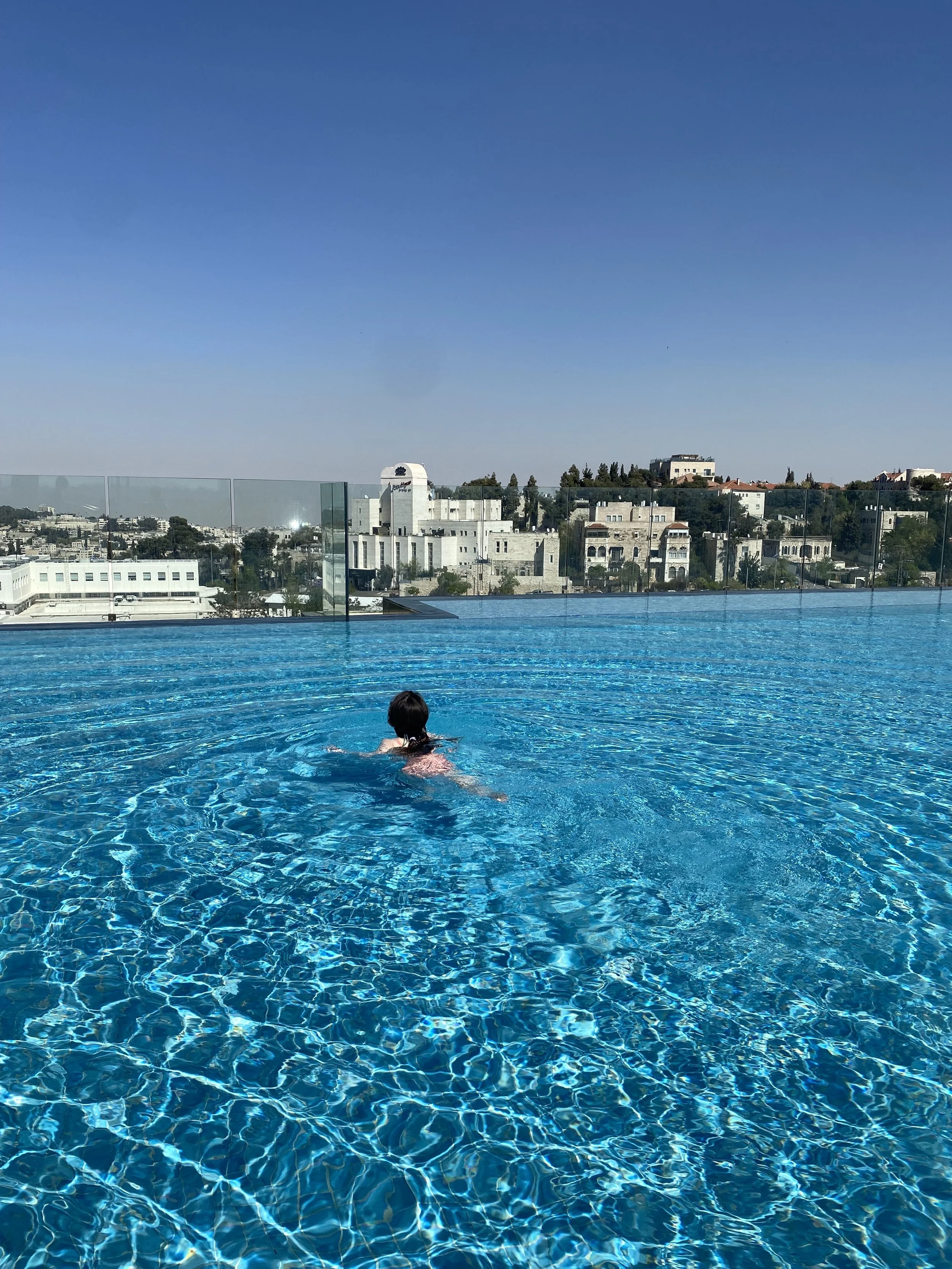 Back at the hotel we put Madeleine for a nap and Tzvi took Hallie to the pool. [Tzvi: We started at the rooftop pool. The rooftop is very nice. Most of the seating is sort-of uncomfortable chairs, and there’s only a few day beds where you can actually lay down. The view is incredible and you can basically see Jerusalem in every direction. We got chairs and Hallie went in the pool, but it was freezing cold (I guess it’s not heated) and I couldn’t get in, so we abandoned the rooftop and moved down to the indoor spa pool, which was heated to about 85 degrees. Avery joined us at the pool and Hallie had a lot of fun.]