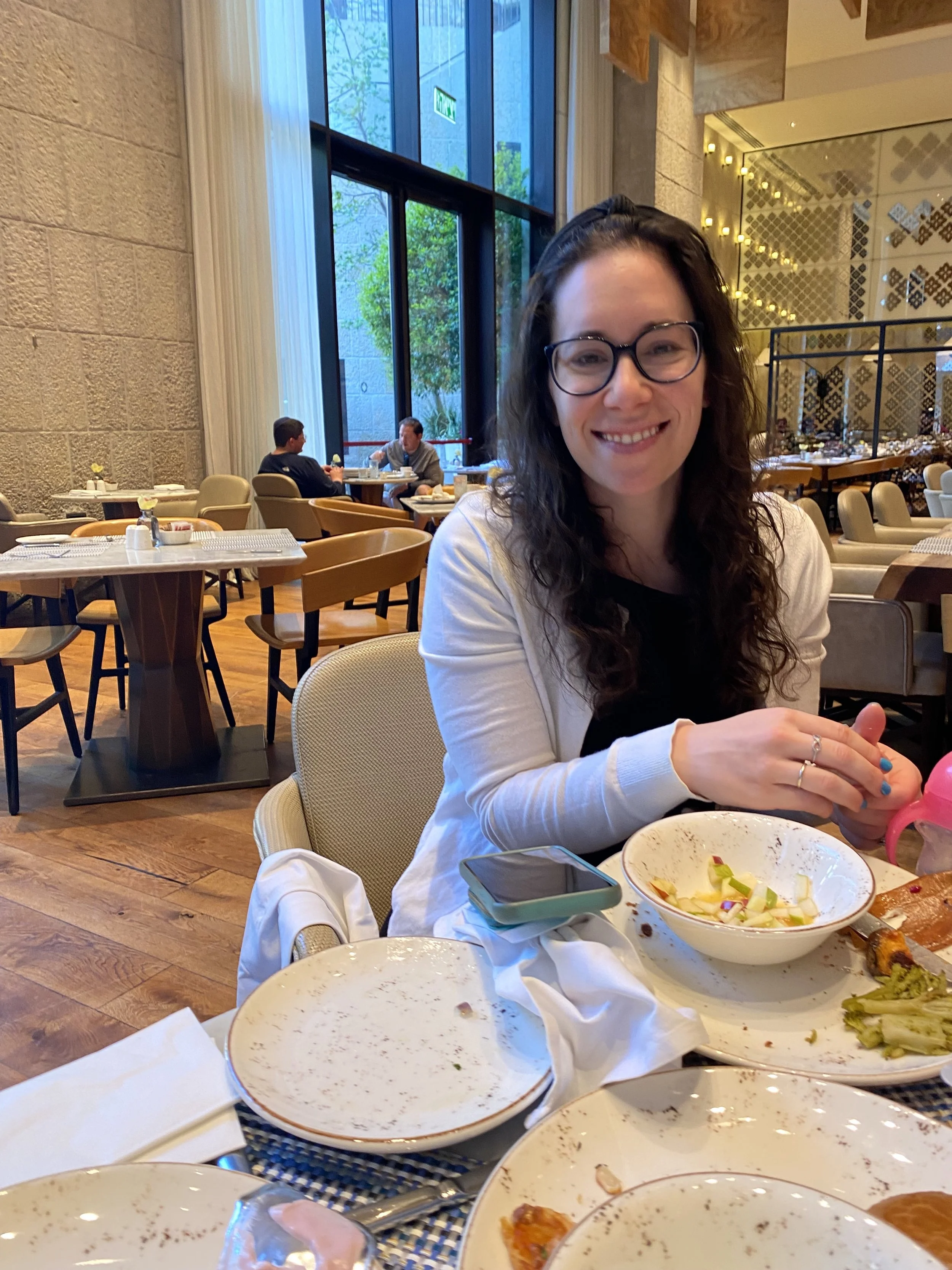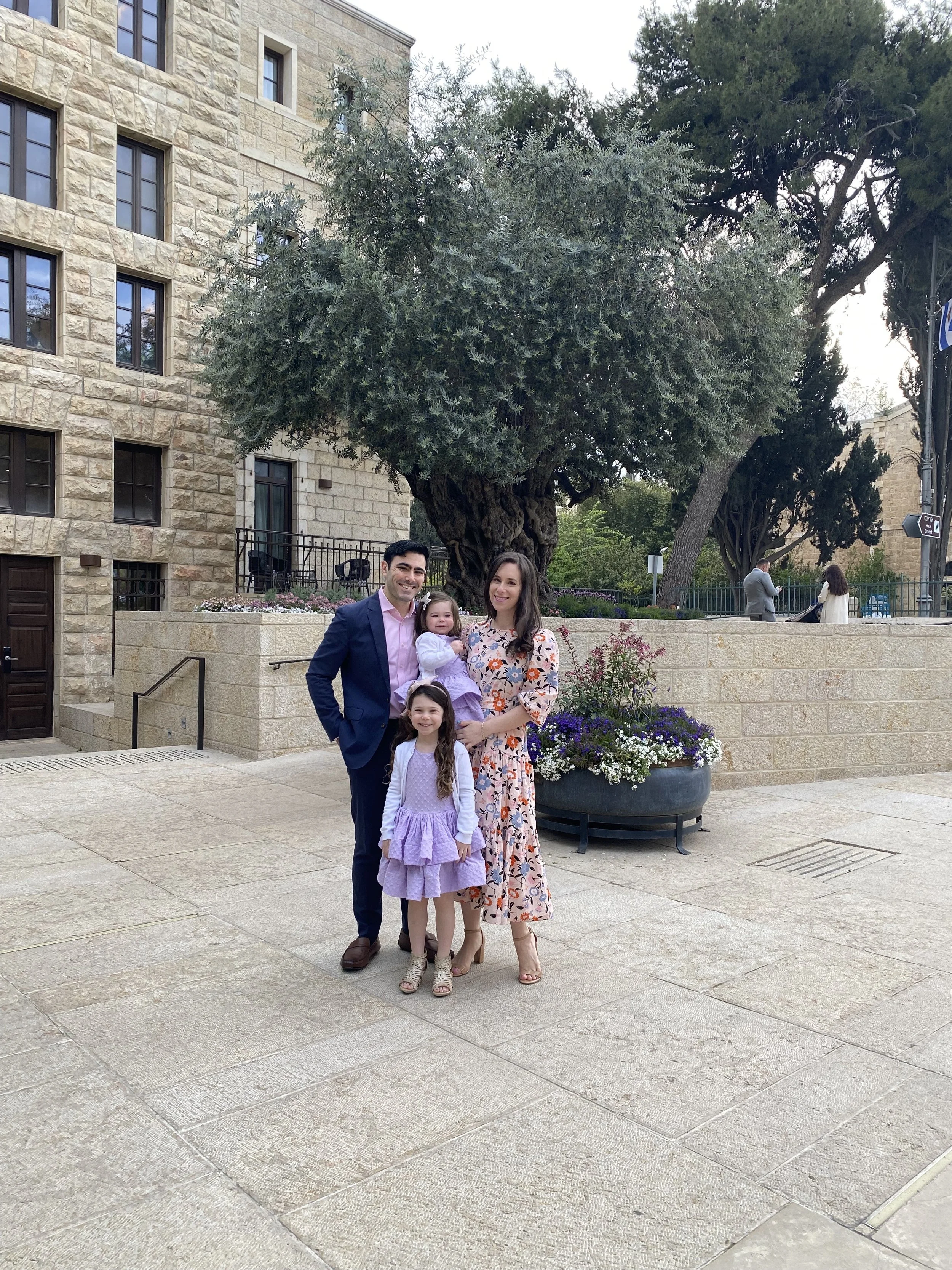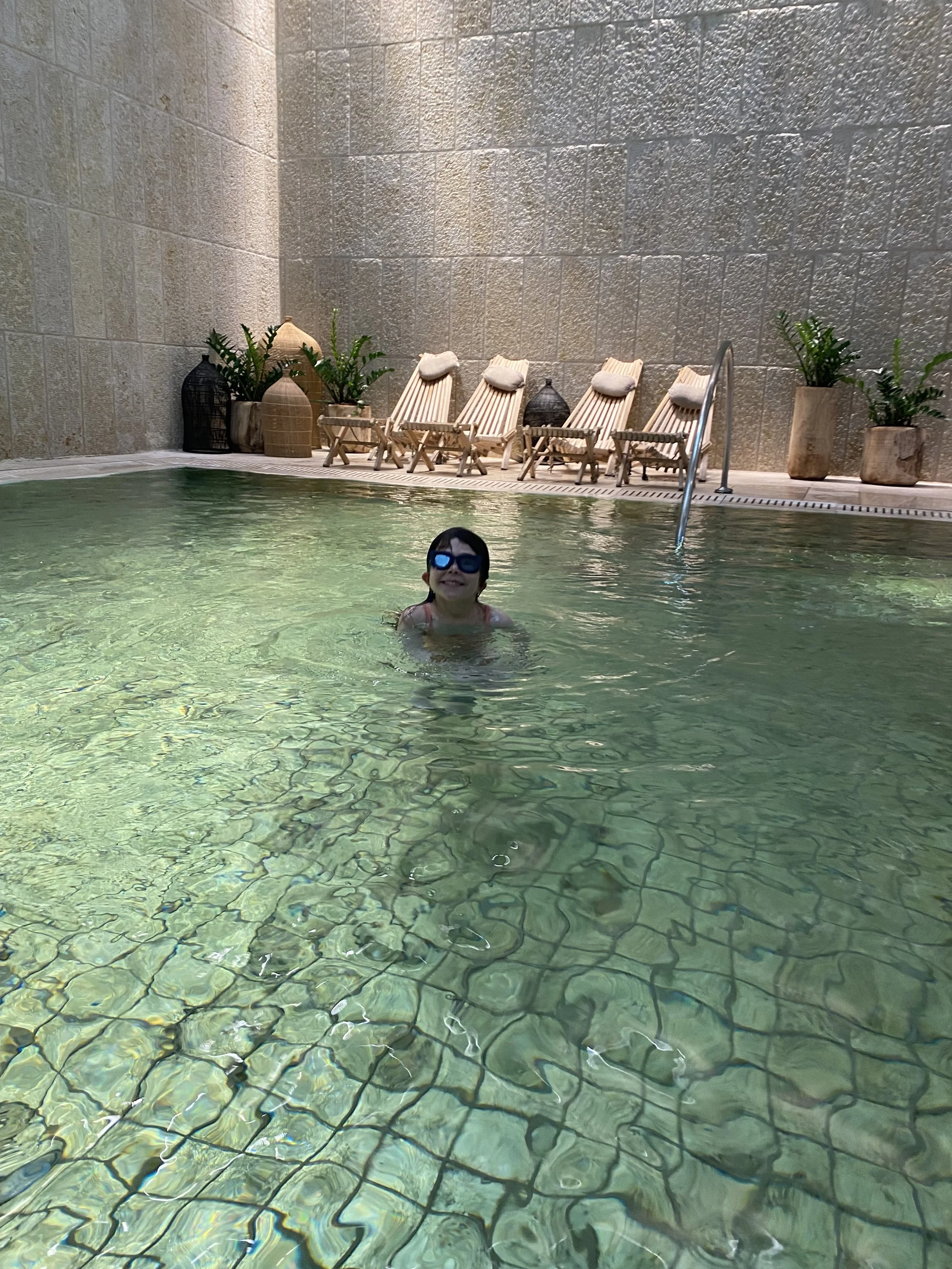 Back at the hotel we put Madeleine for a nap and Tzvi took Hallie to the pool. [Tzvi: We started at the rooftop pool. The rooftop is very nice. Most of the seating is sort-of uncomfortable chairs, and there’s only a few day beds where you can actually lay down. The view is incredible and you can basically see Jerusalem in every direction. We got chairs and Hallie went in the pool, but it was freezing cold (I guess it’s not heated) and I couldn’t get in, so we abandoned the rooftop and moved down to the indoor spa pool, which was heated to about 85 degrees. Avery joined us at the pool and Hallie had a lot of fun.]