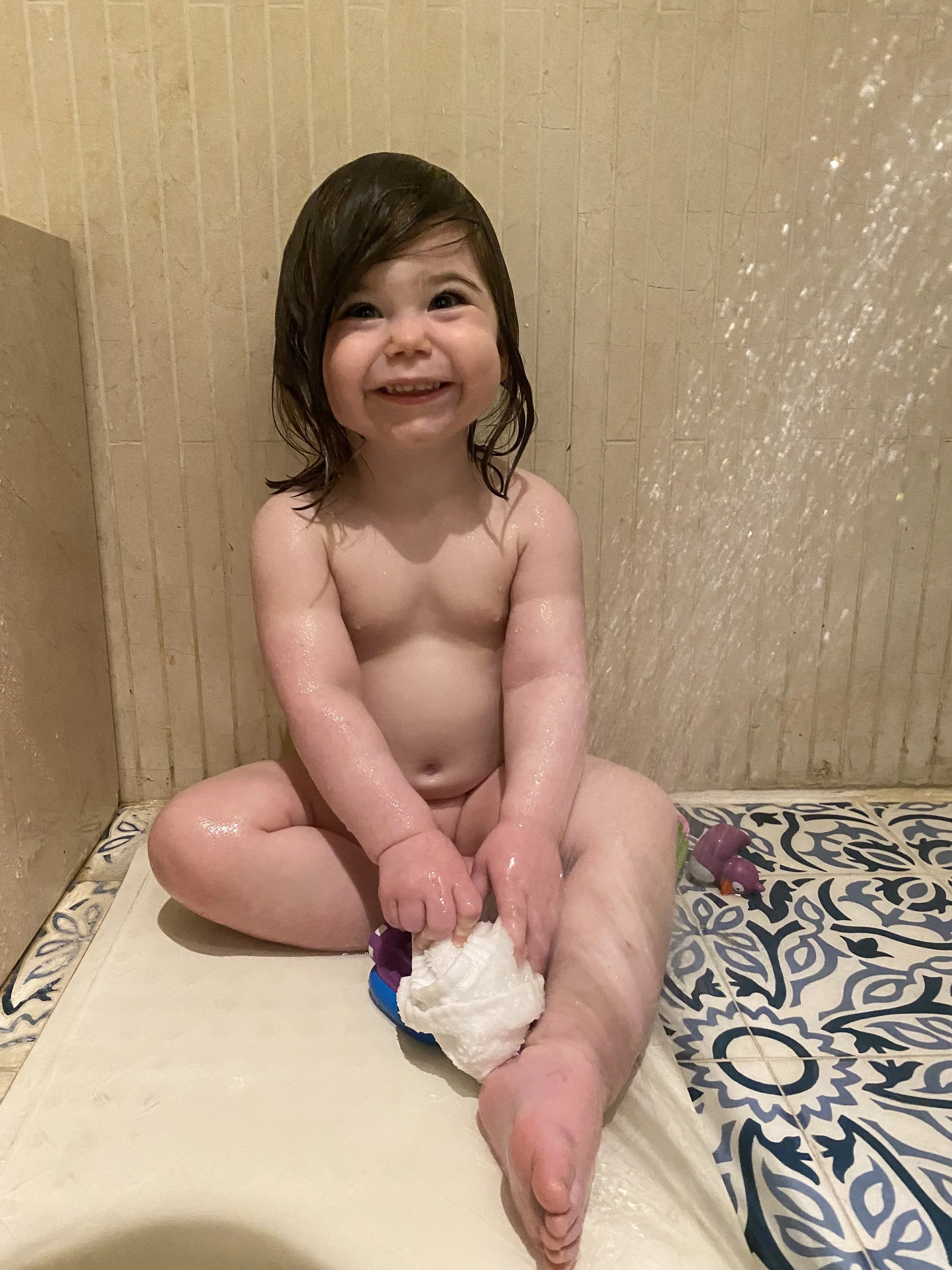 We all got ready for the seder. For the girls that meant taking a shower, which meant them sitting on the floor of the shower while Tzvi held the handheld shower head and sprayed them.