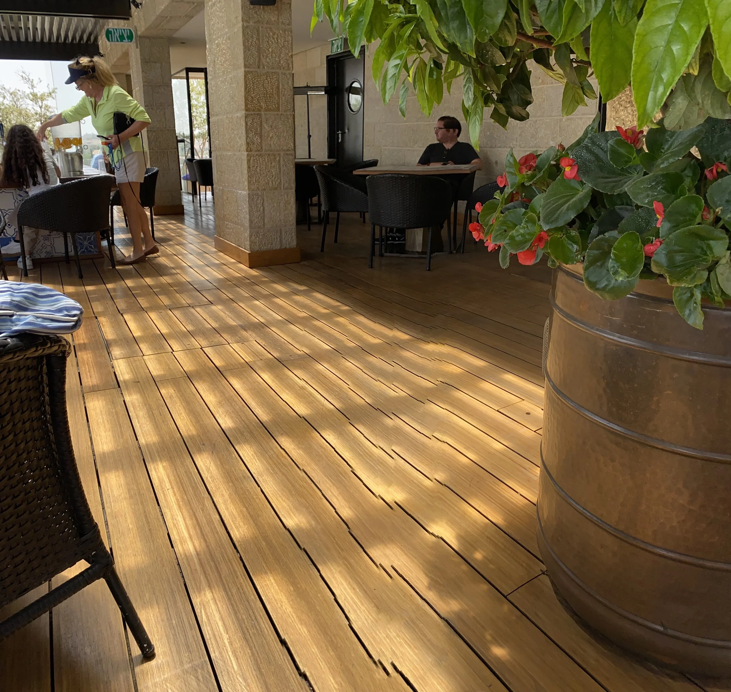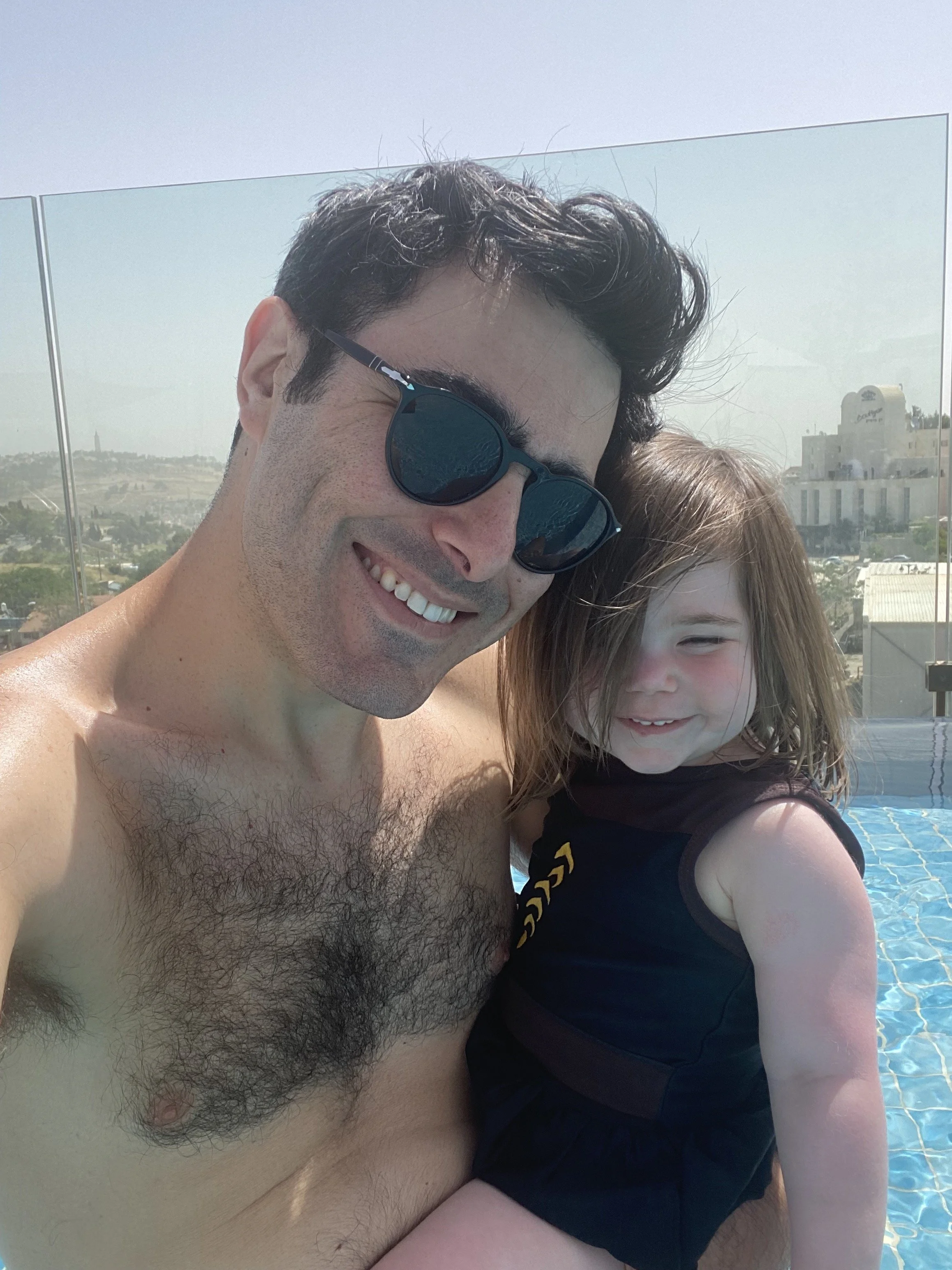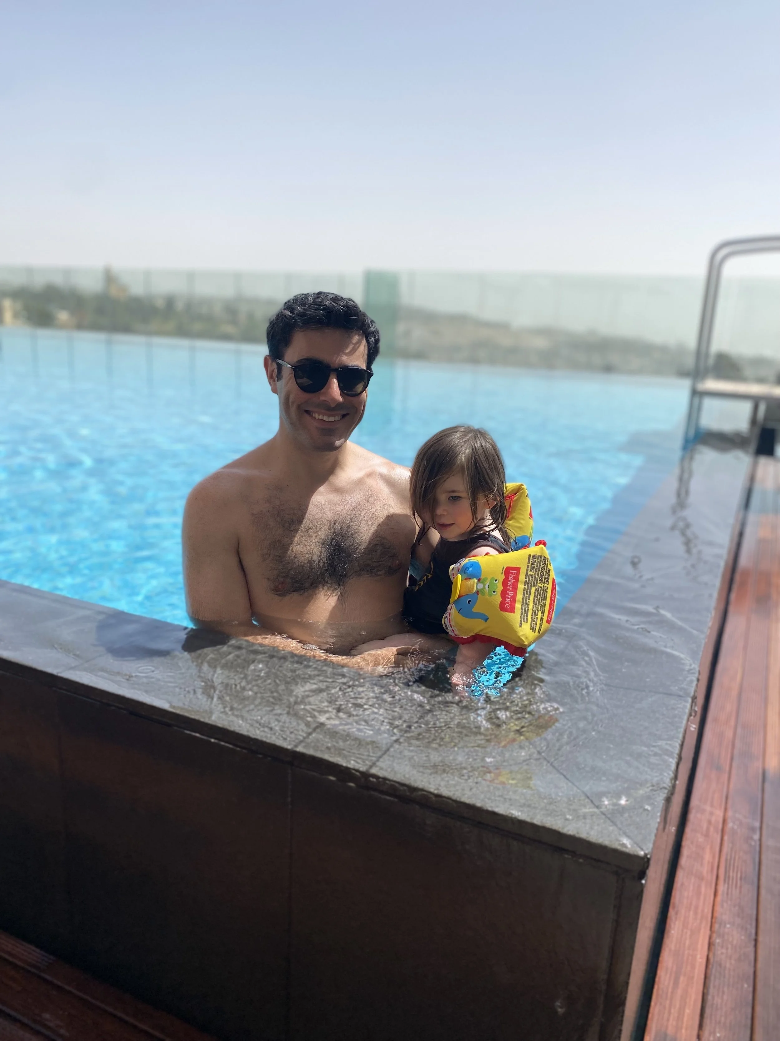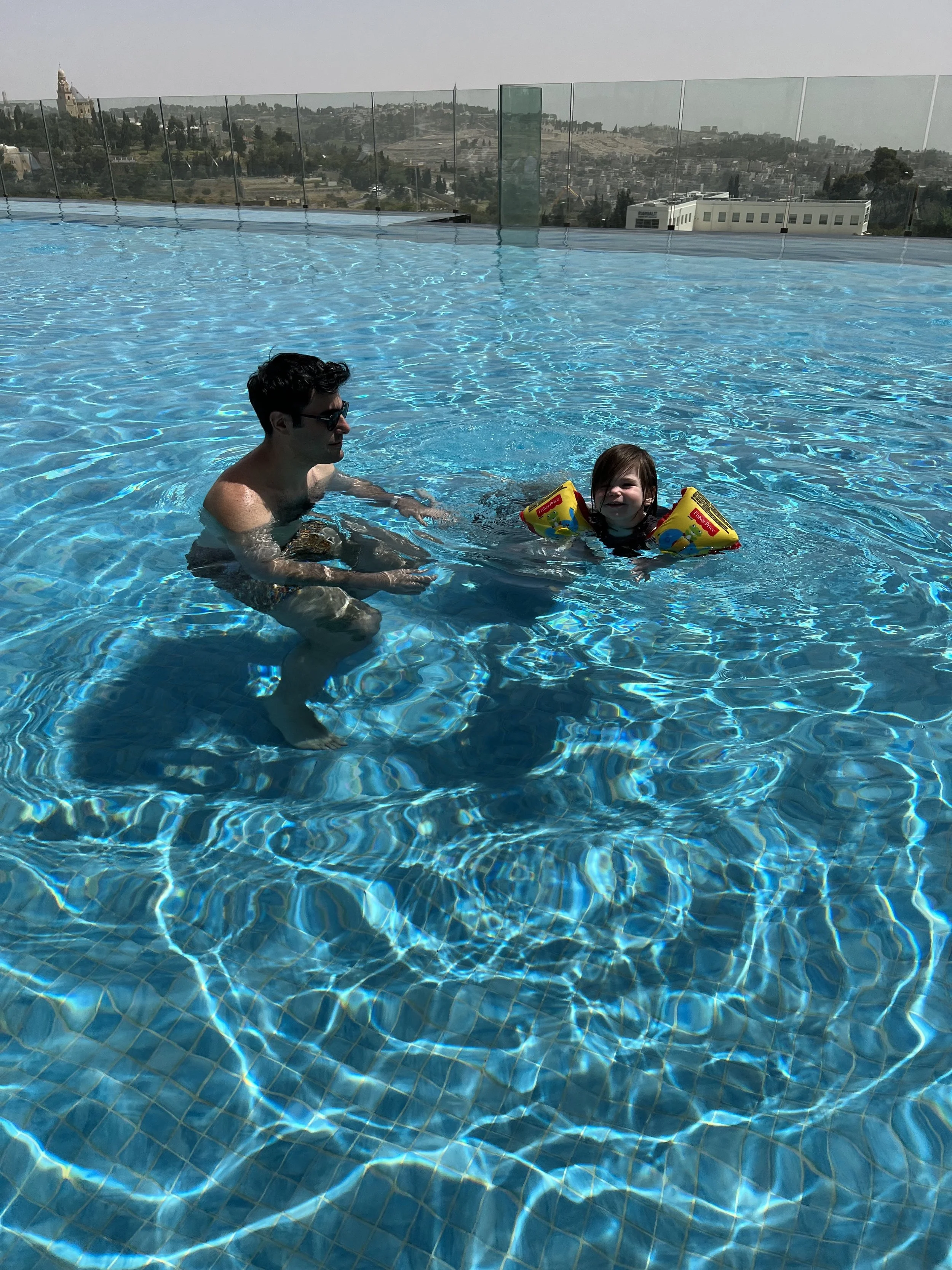 [Tzvi: We stayed at breakfast until about 10:15, then went to the room to change and headed to the pool. We had no problem getting day beds since it seems everyone has left the hotel now that chag is over. There was another family in the pool with little kids who were wearing floaties. As soon as they saw Madeleine they came over to me and said ‘you know they have floaties in the closet.’ Excuse me? You mean all this time when the life guard kept telling me Madeleine couldn’t swim without floaties and I told him that we didn’t have floaties, they actually had extra floaties that we could’ve been using? Amazing. Anyway, I asked the lifeguard and he gave me a pair of floaties, which were actually great because they’re fabric (instead of just plastic), so they’re really easy to get on and off. Madeleine absolutely loved swimming with the floaties and kept saying “No hold me! No hold me!” She had the best time and stayed in the pool for over an hour. By the end I had to pee really badly, but she didn’t want to get out.]