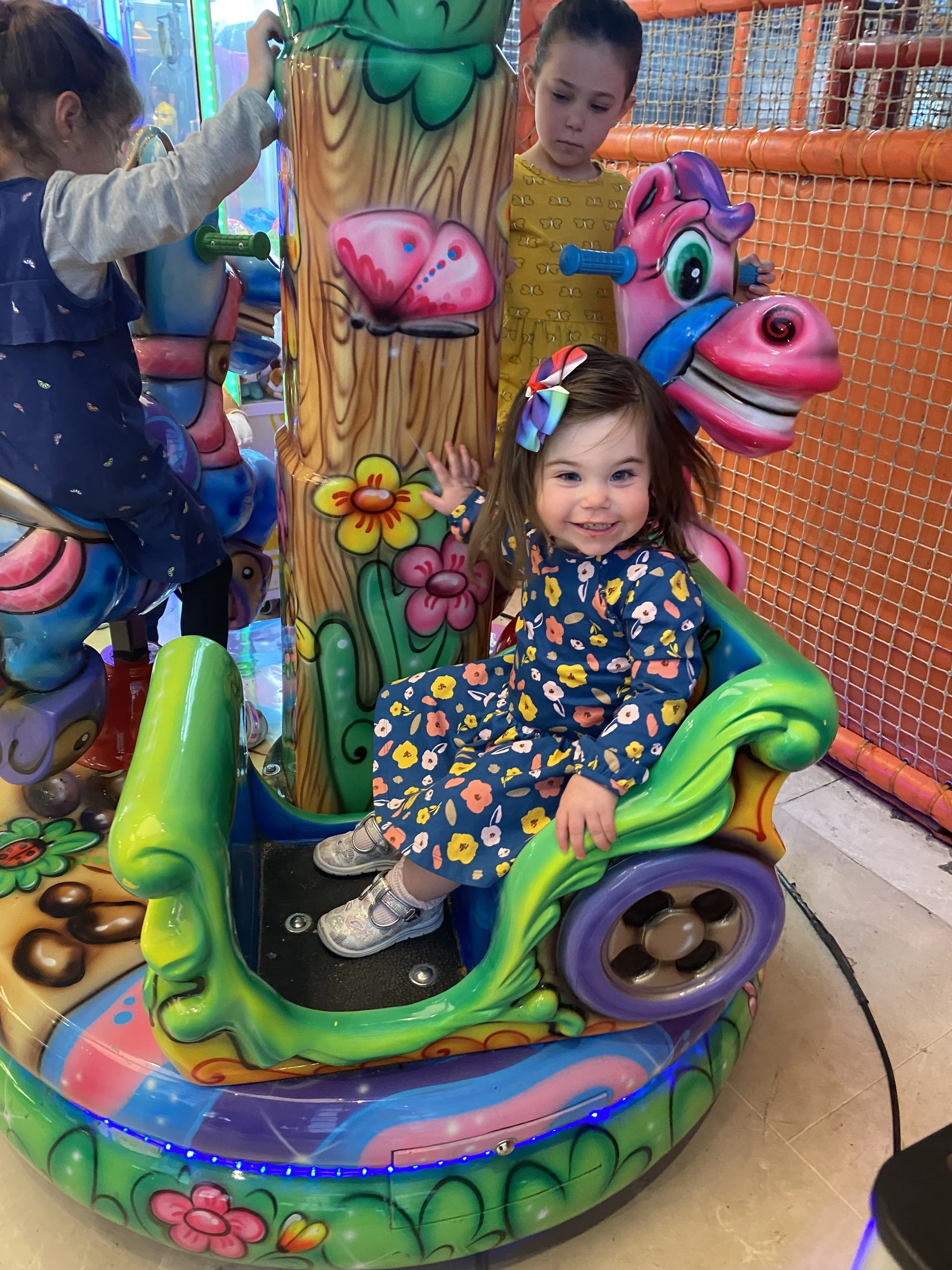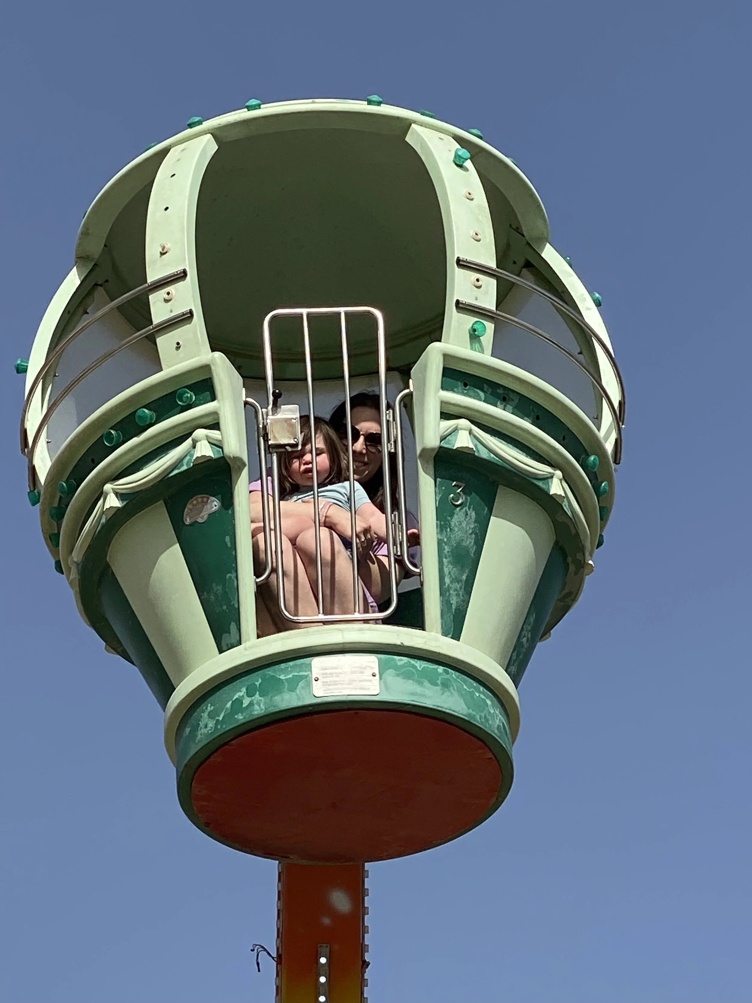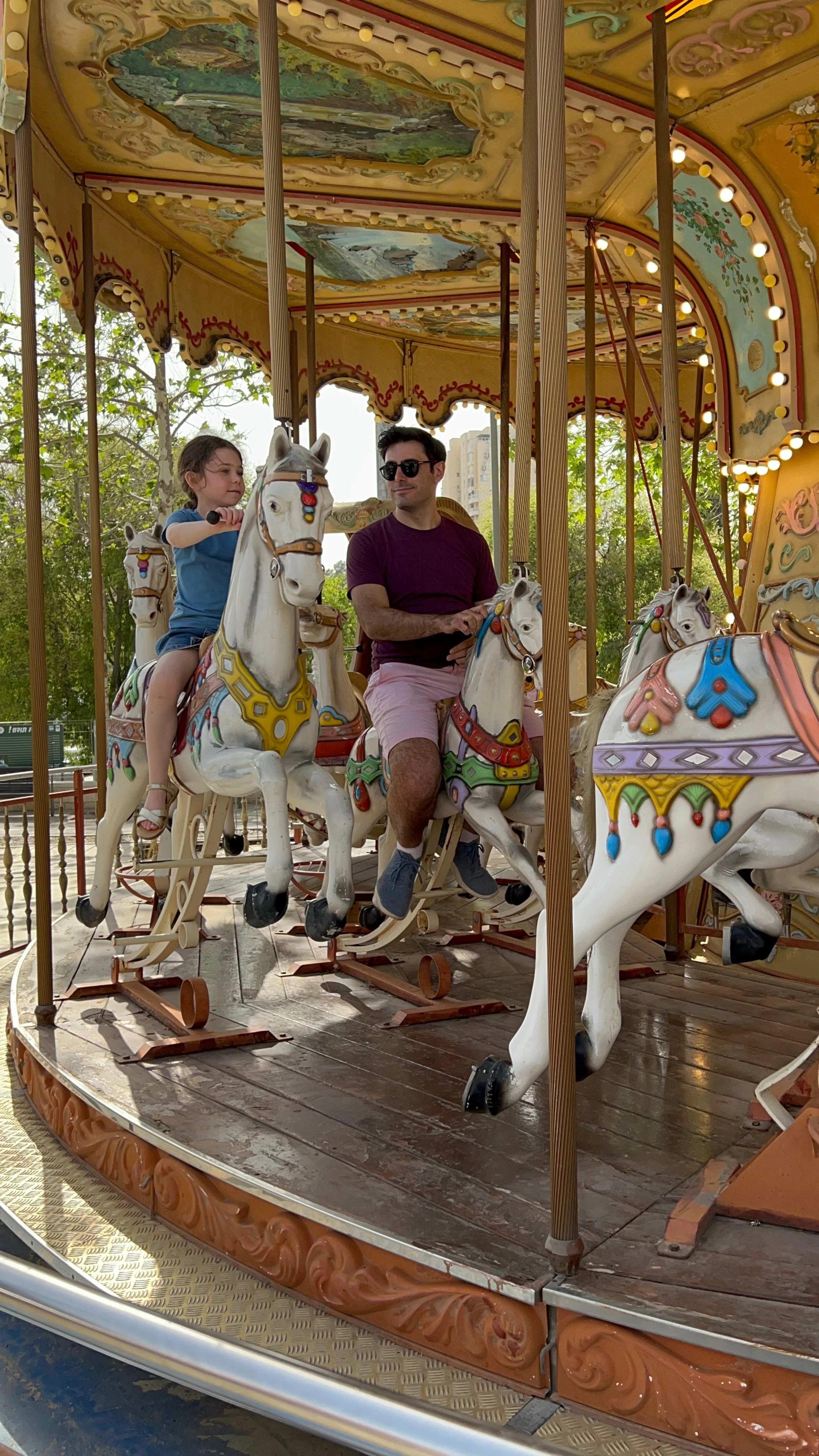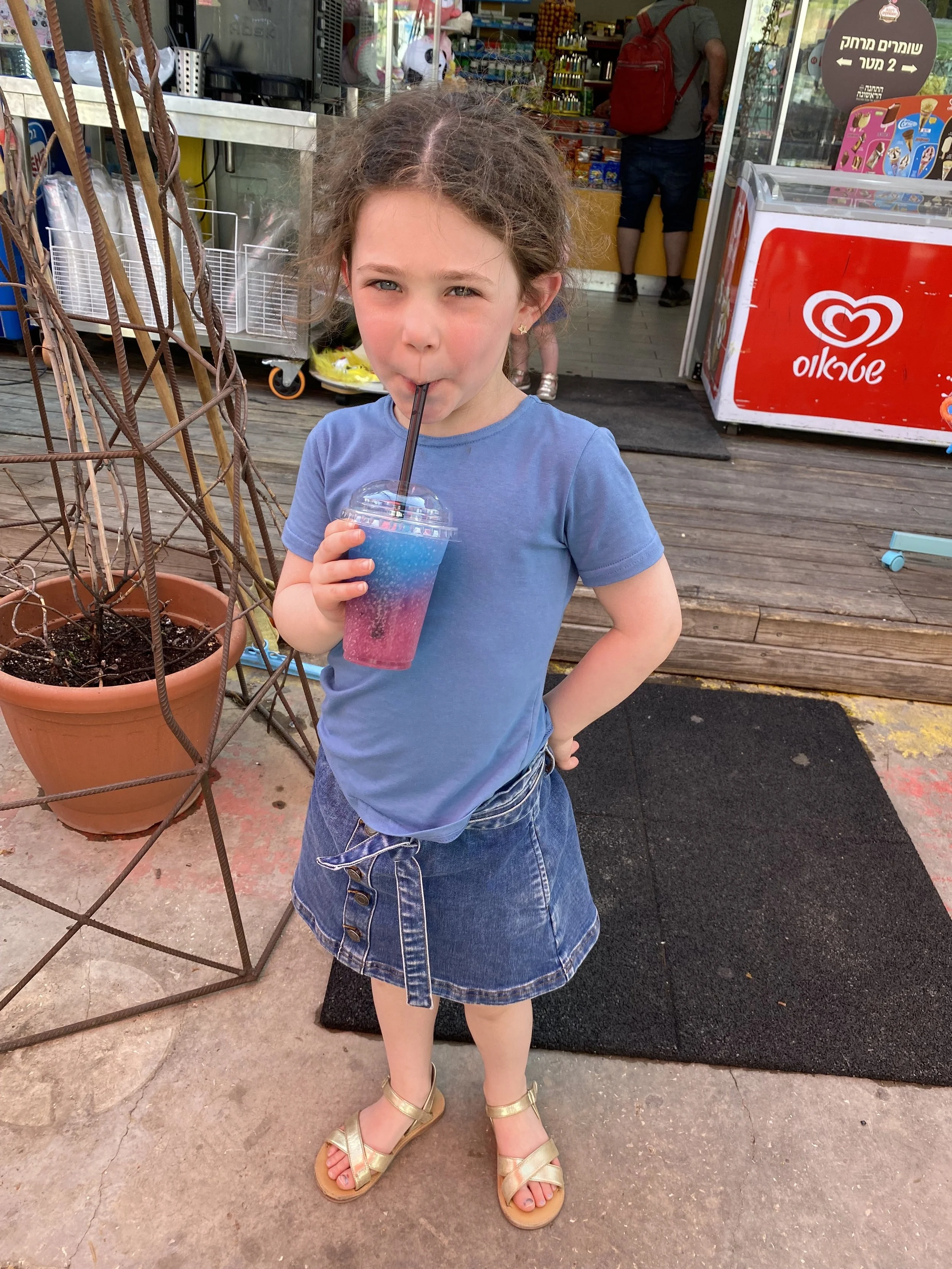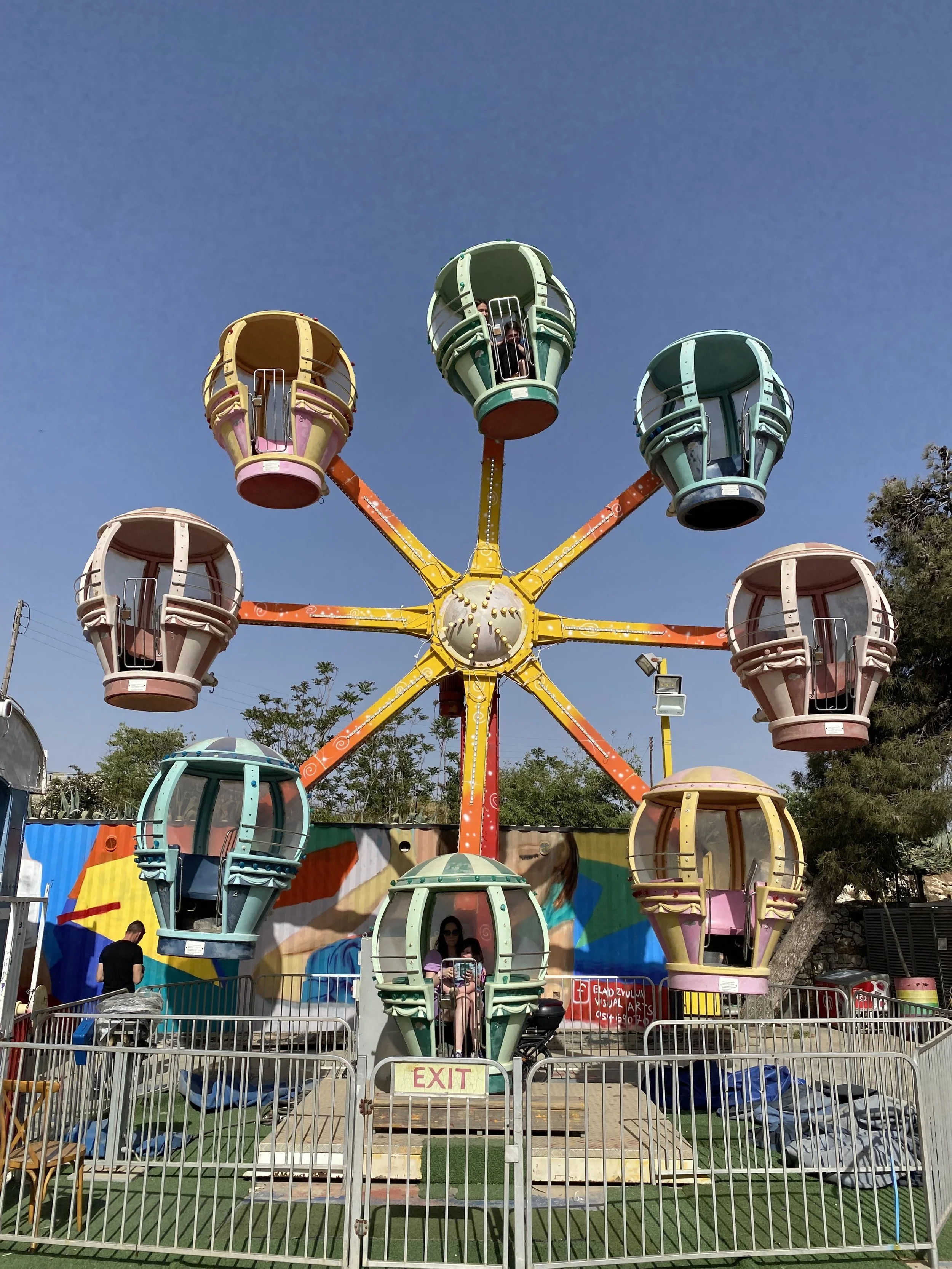We walked all the way back to the hotel, which took about 20 minutes. When we got back, Robyn and Hallie met us across the street at the Tachana. Now that the chag was over the station was pretty empty. We rode all of the rides – the little train that goes from one end of the station to the other, the carousel and the Ferris wheel. The girls had fun. Hallie also got a slushy that was blue and pink. Like I think that was the flavor – blue and pink.