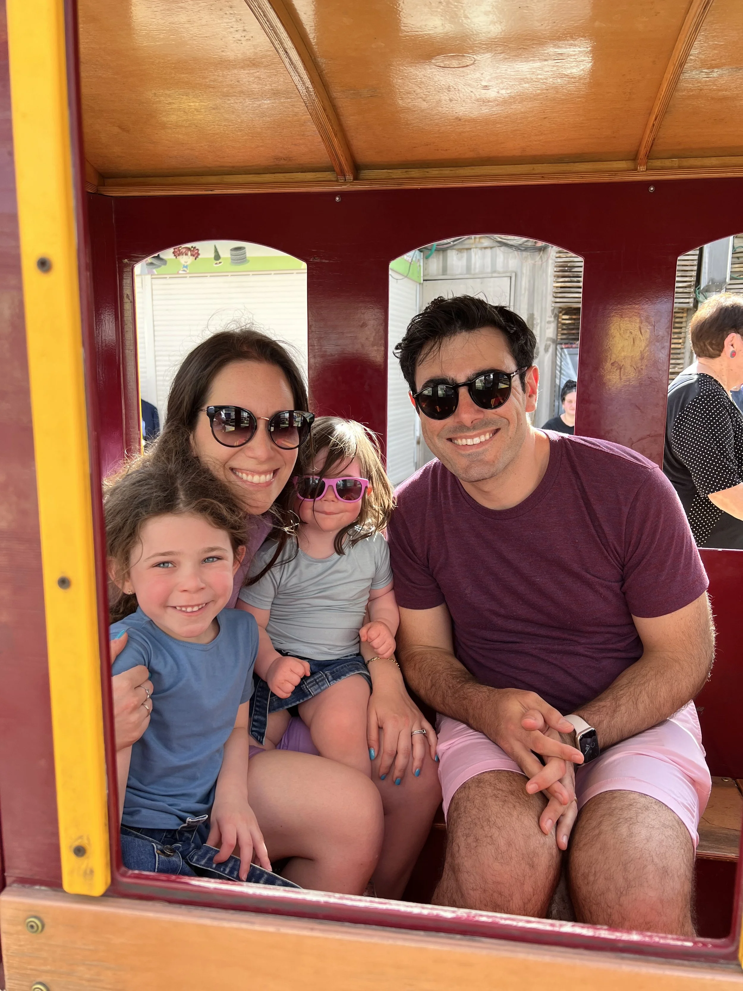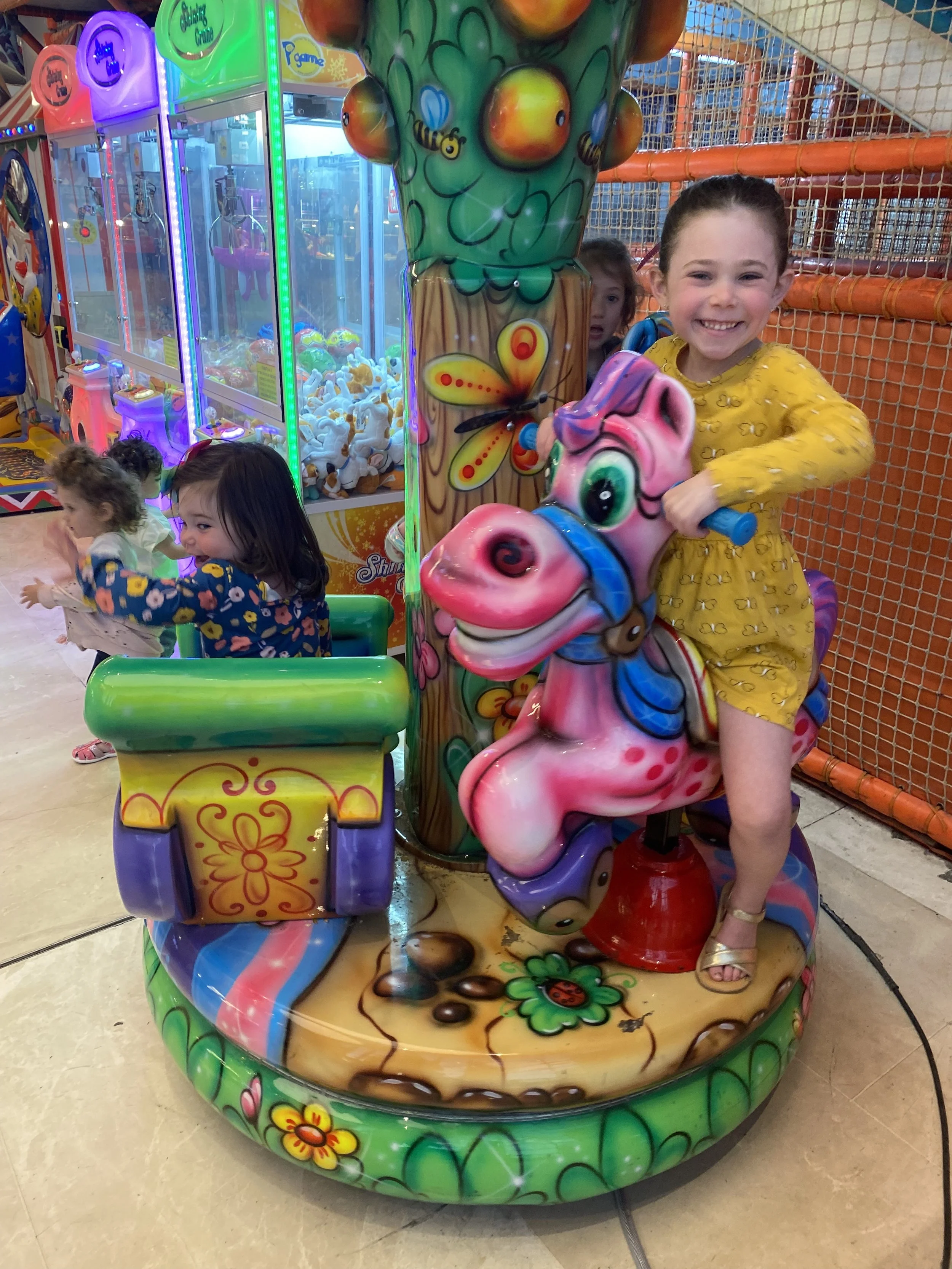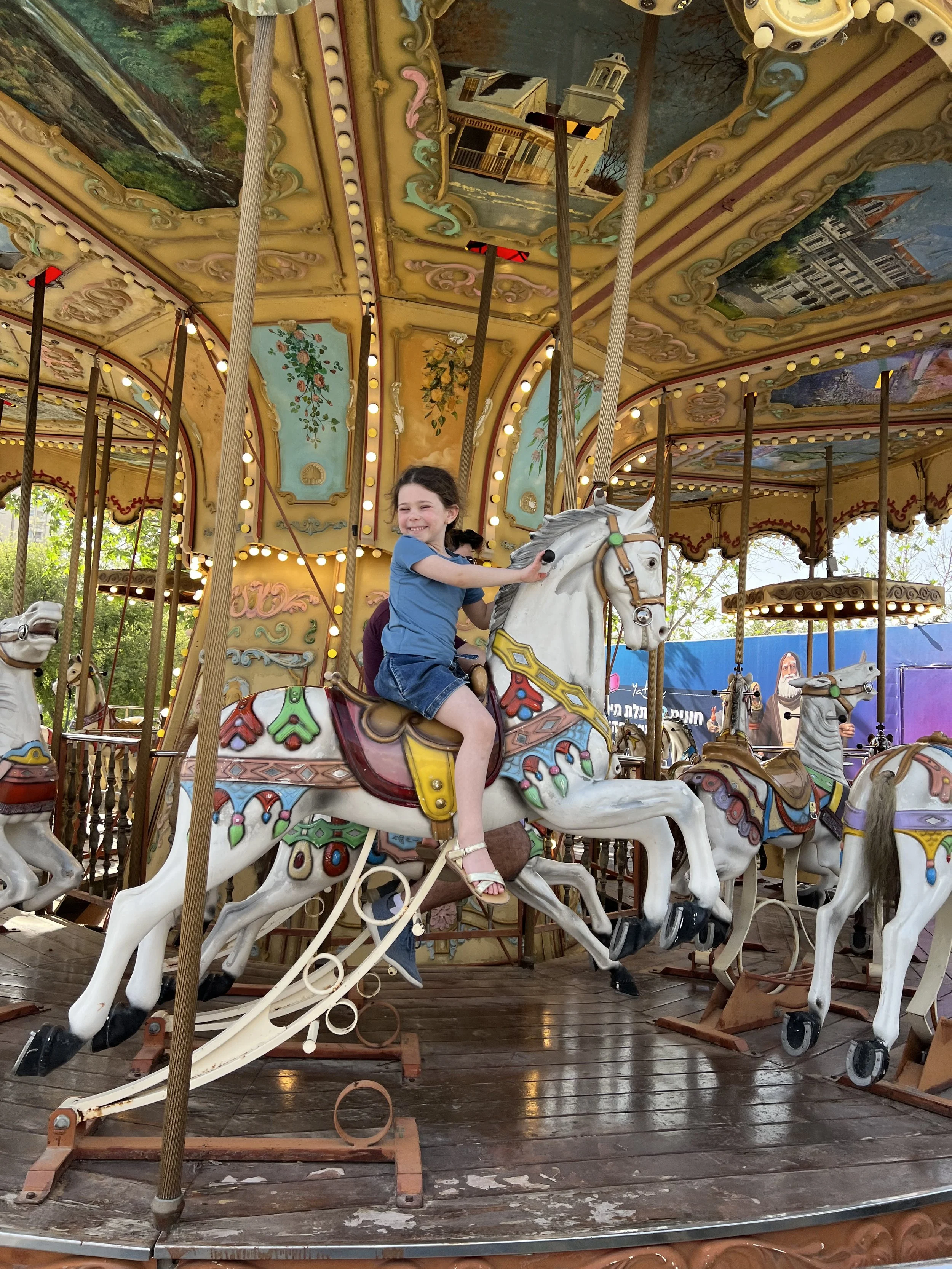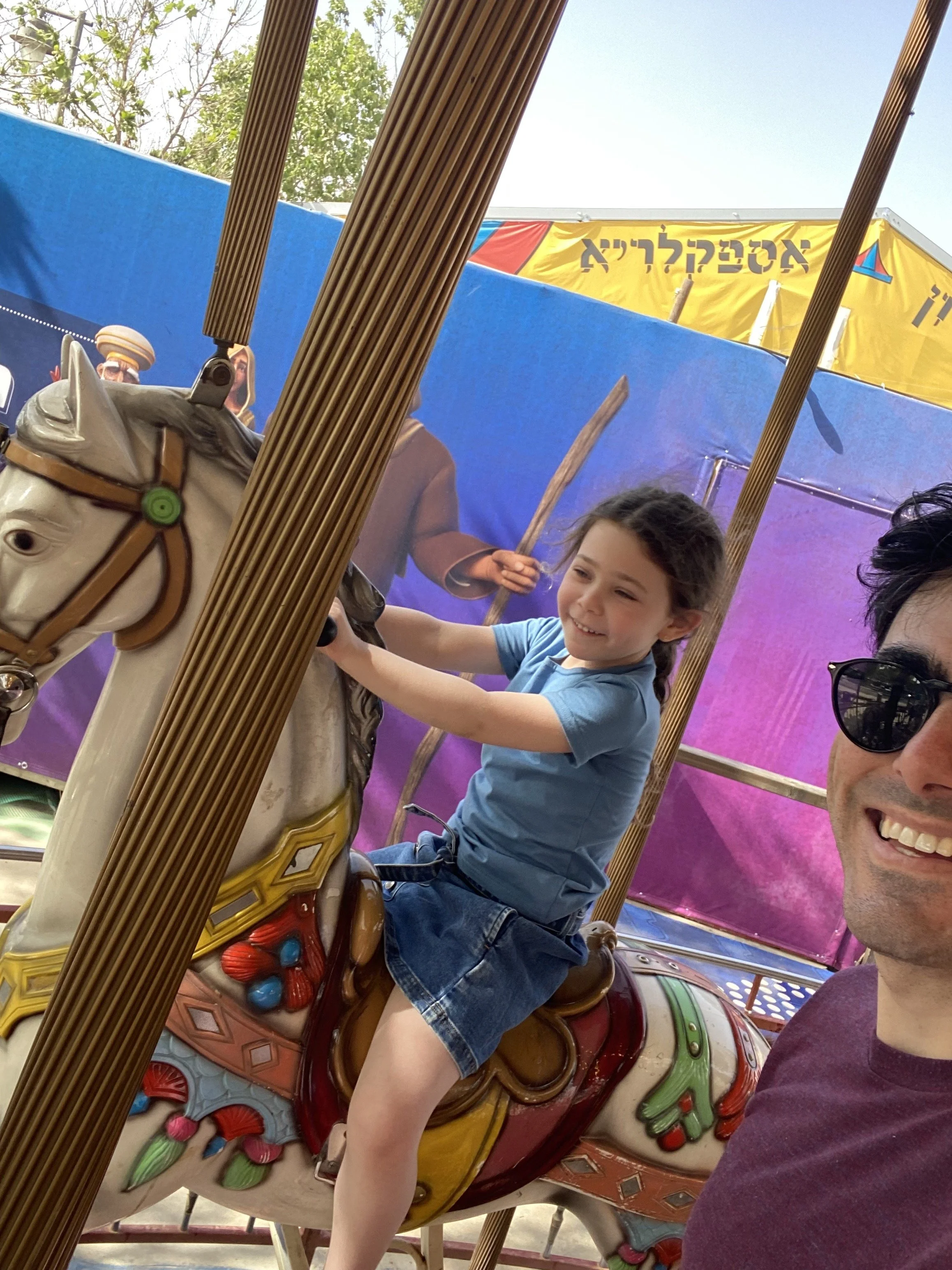 We showered and decided that it was too much to do another sit down dinner at a restaurant, so we decided to go to the Malcha Mall. I feel like we used to go there on every Israel trip but then we just stopped at some point. I had forgotten that it’s actually not so close to the center of Jerusalem and took almost a half hour to get to. It was really nice though. I had my one and only schwafel (shawarma + felafel in a laffa) of the trip, Tzvi had a sabich sandwich (fried eggplant in a pita) and the kids had pizza. The girls also had fun riding the little carousel in the food court. It had three seats, so we paid for it and then another girl randomly jumped on the empty seat. It was fine though because then another kid came and paid and Hallie and Madeleine got a free ride.