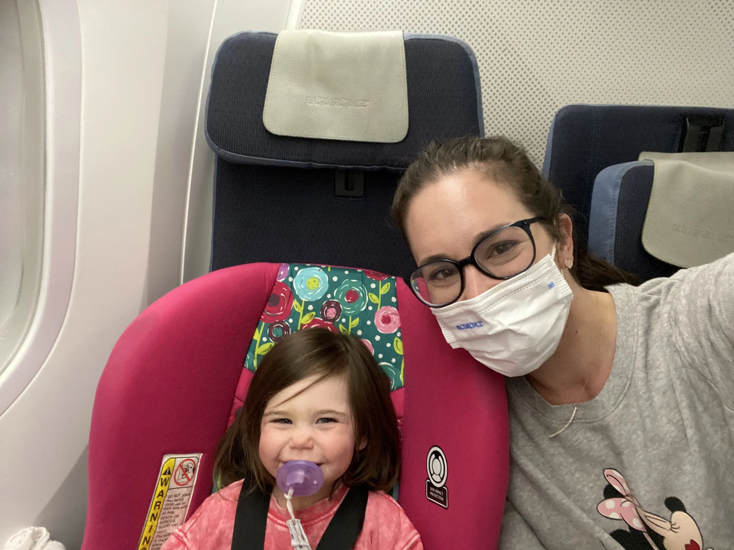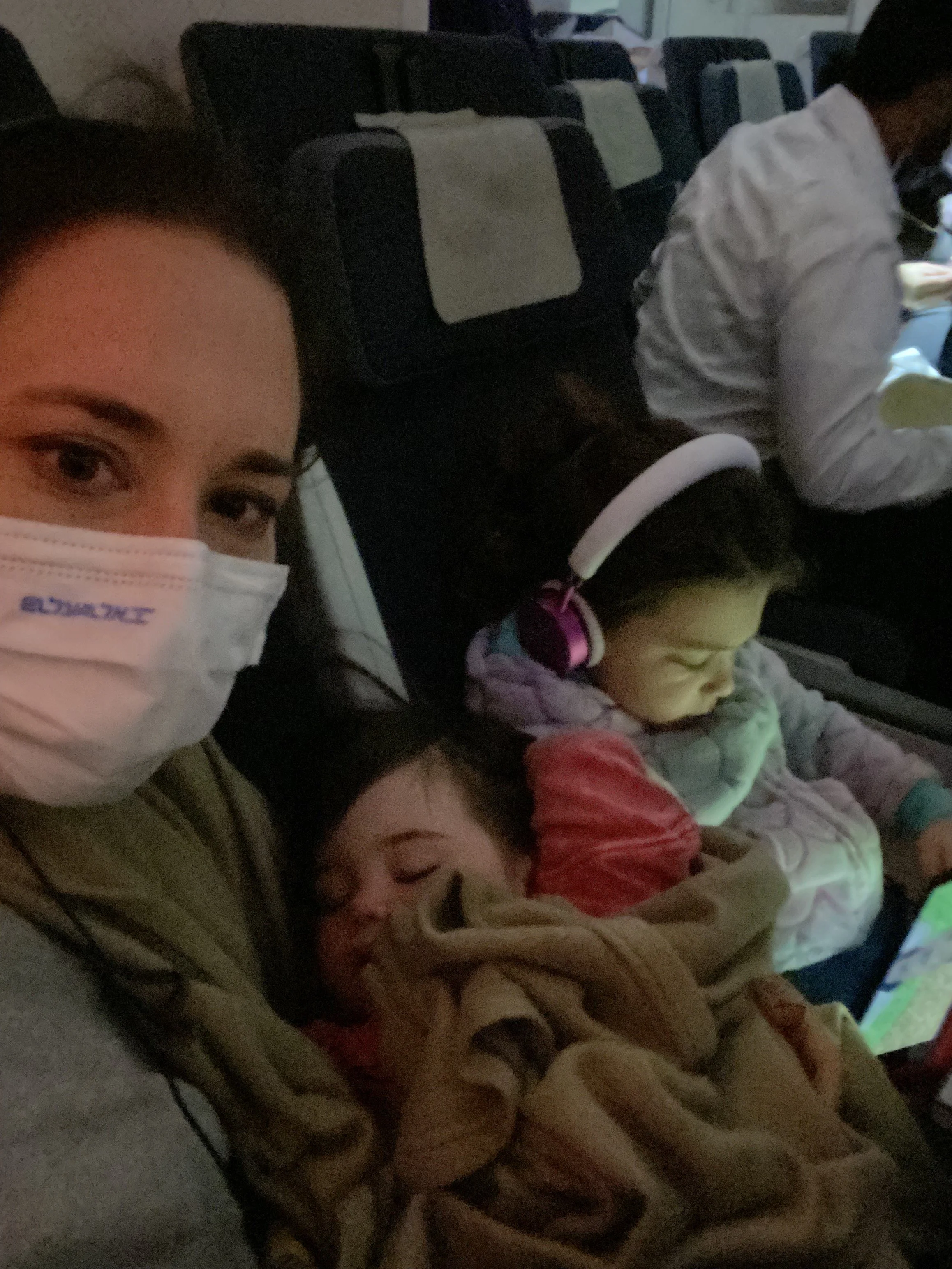 Anyway, I didn’t get up for nine hours because Madeleine slept in the car seat for a while and then wanted out and I had to hold her, and Hallie was sleeping on me, and by the end I needed to pee so badly and my tushy was going numb. I thought I was going to get pressure sores. It was just crazy. Overall the flight was fine, but it was just ridiculous.
