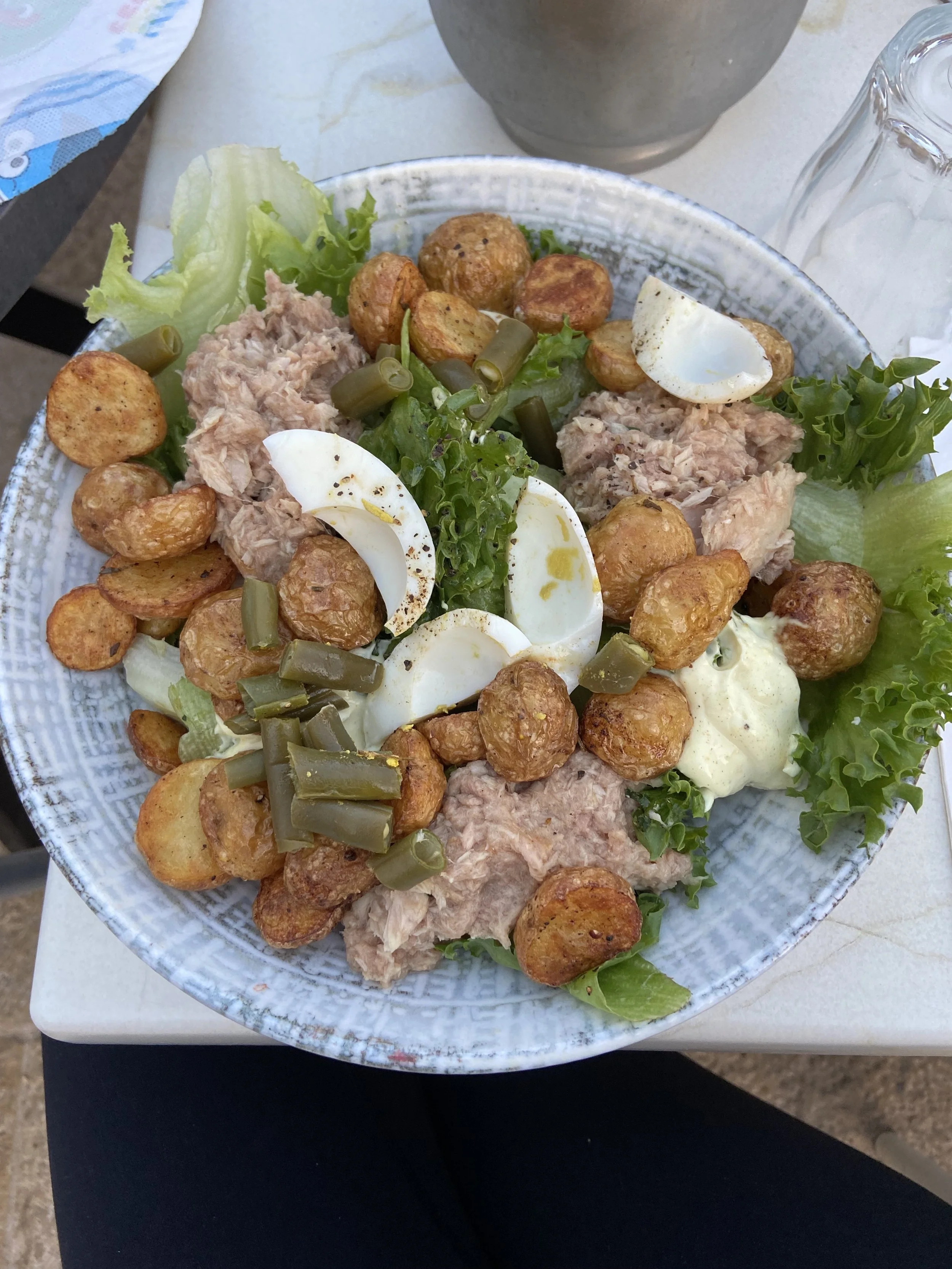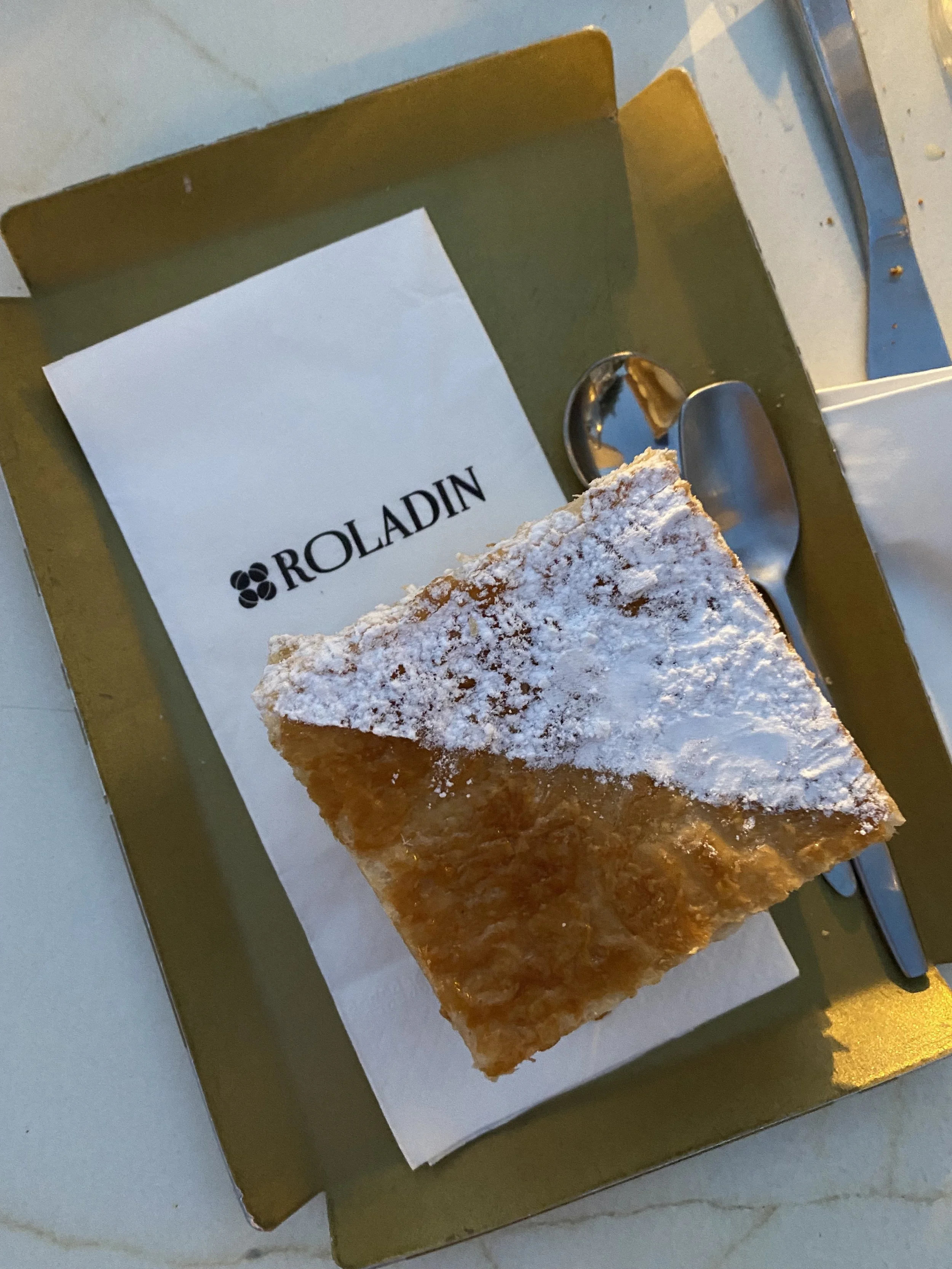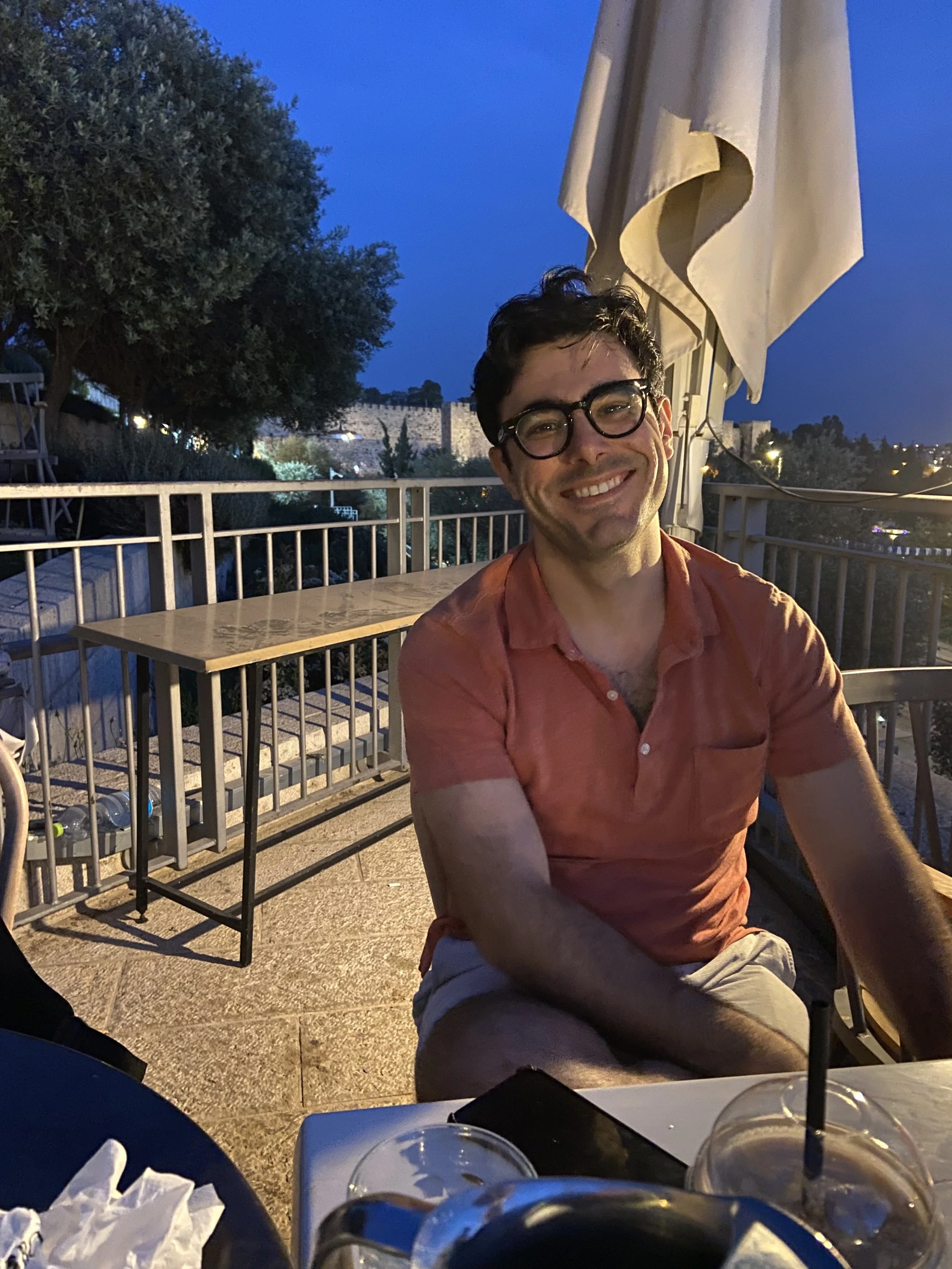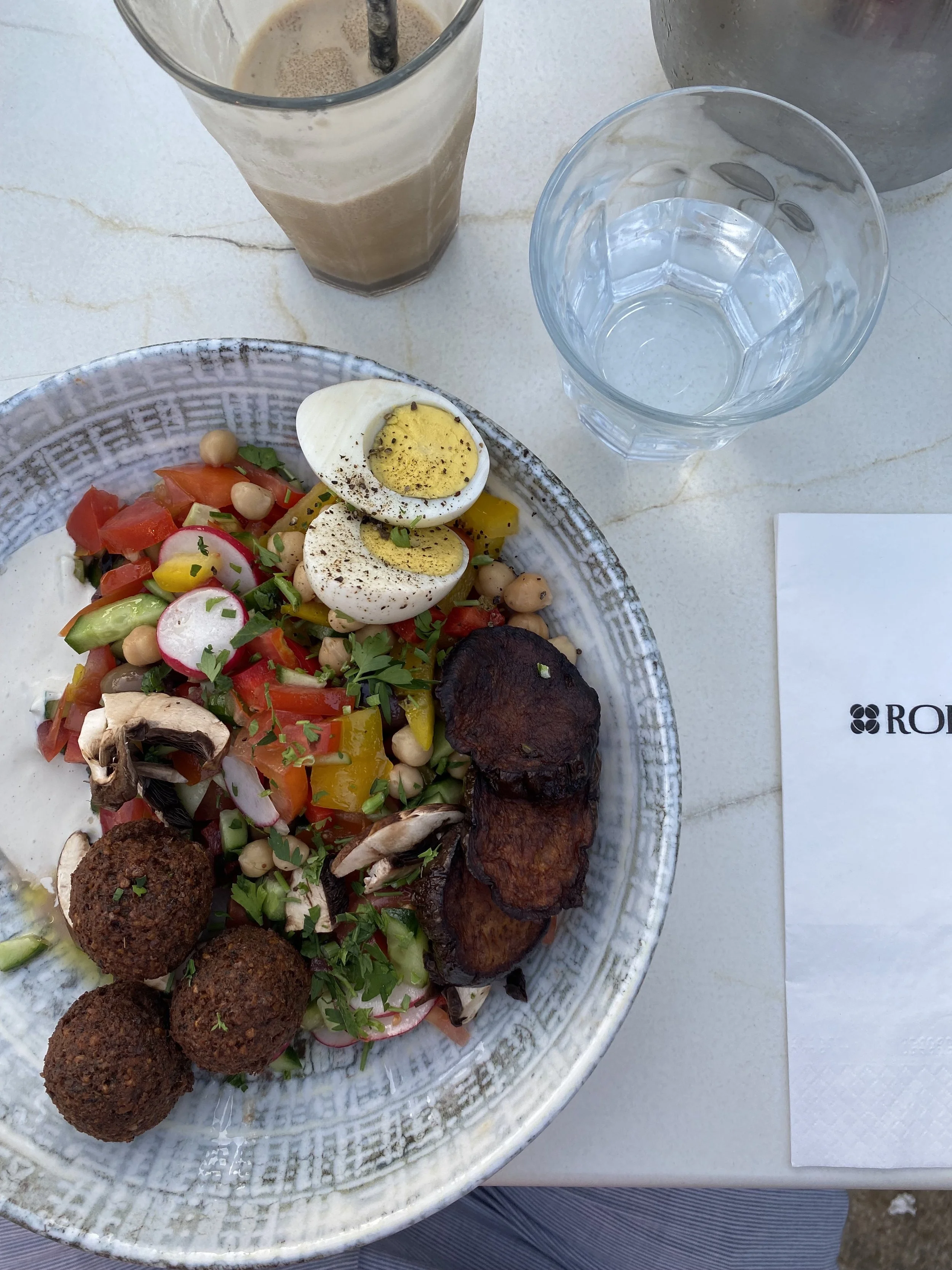 Then we went back to the room, showered, really finished packing, and got ready for dinner. We had to be out of the room by 6pm, so we left all of our stuff in the lobby and my dad came and picked us up in his rental car. We drove to Mamilla and had dinner at Roladin with a lovely view of the old city. Madeleine got spaghetti, which she somehow managed to burn her neck on, so that was fun. I had a tuna salad, which was ok; it was a little wet (too much dressing). Tzvi had a shuk salad with felafel balls that Hallie ate, and we had multiple slushy iced coffees.
