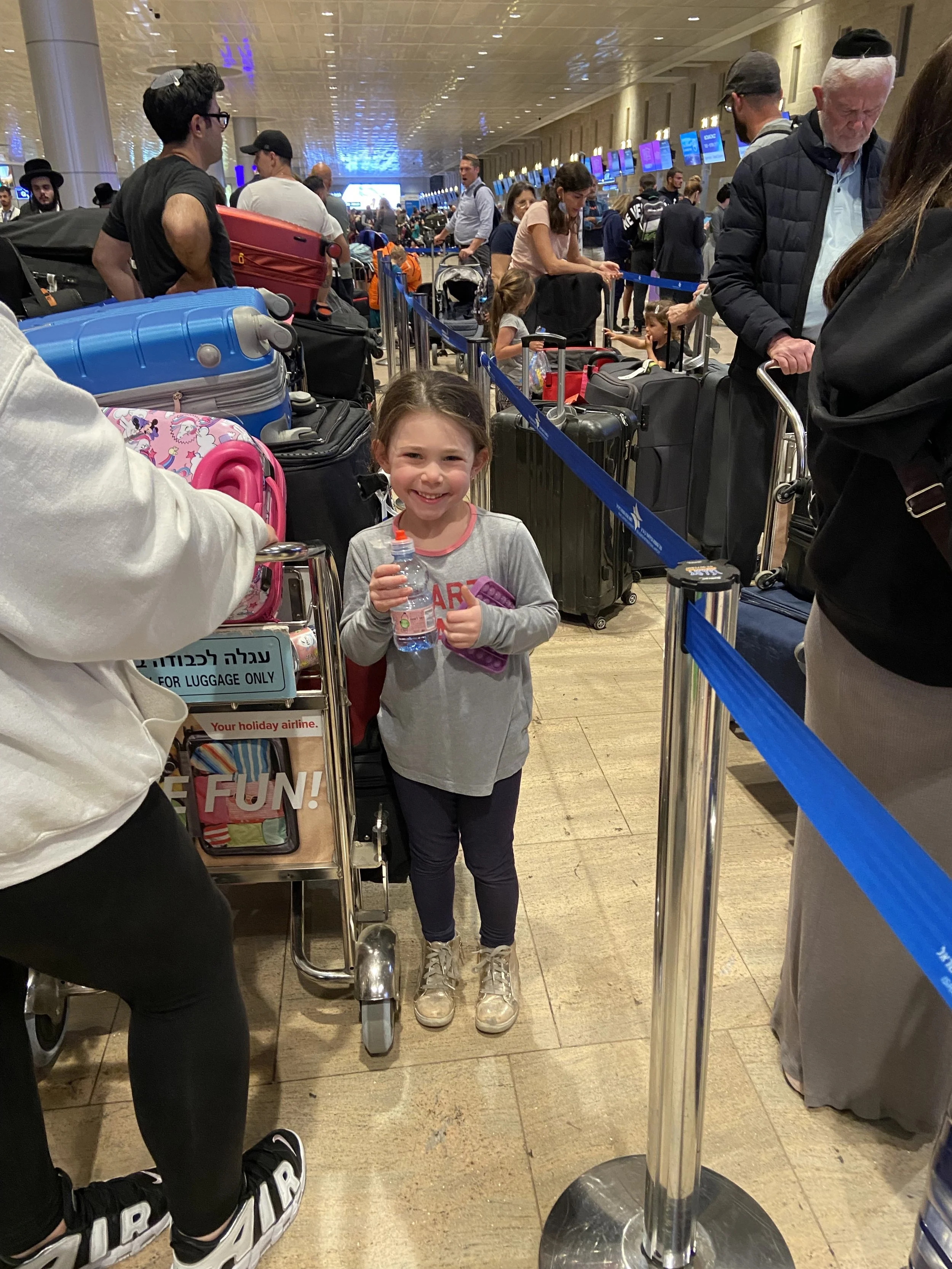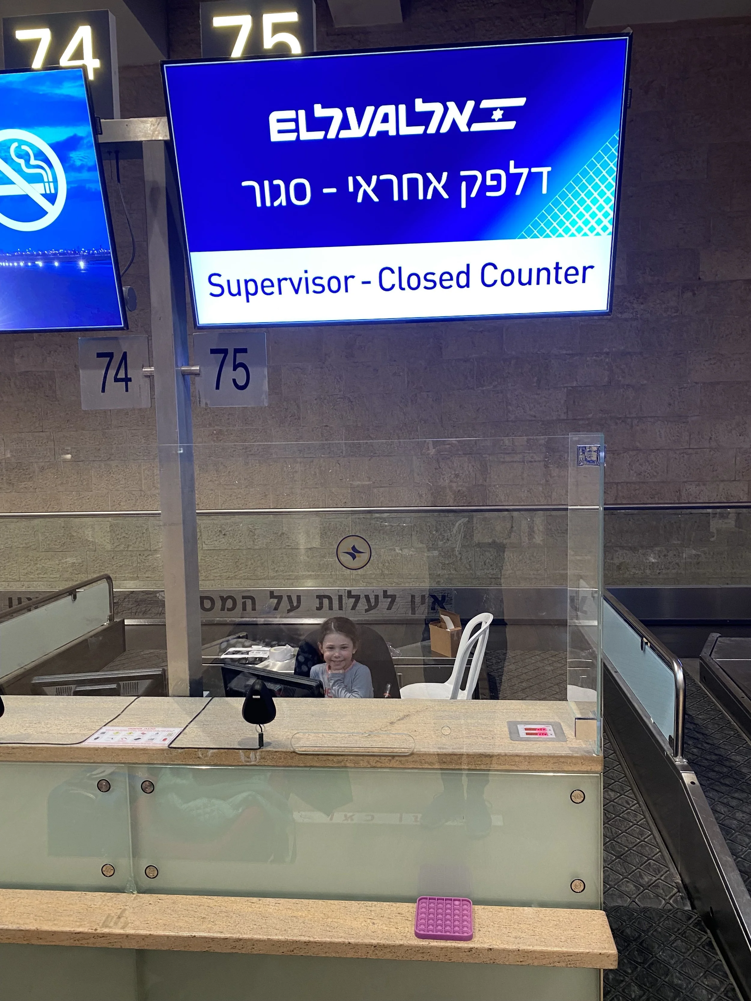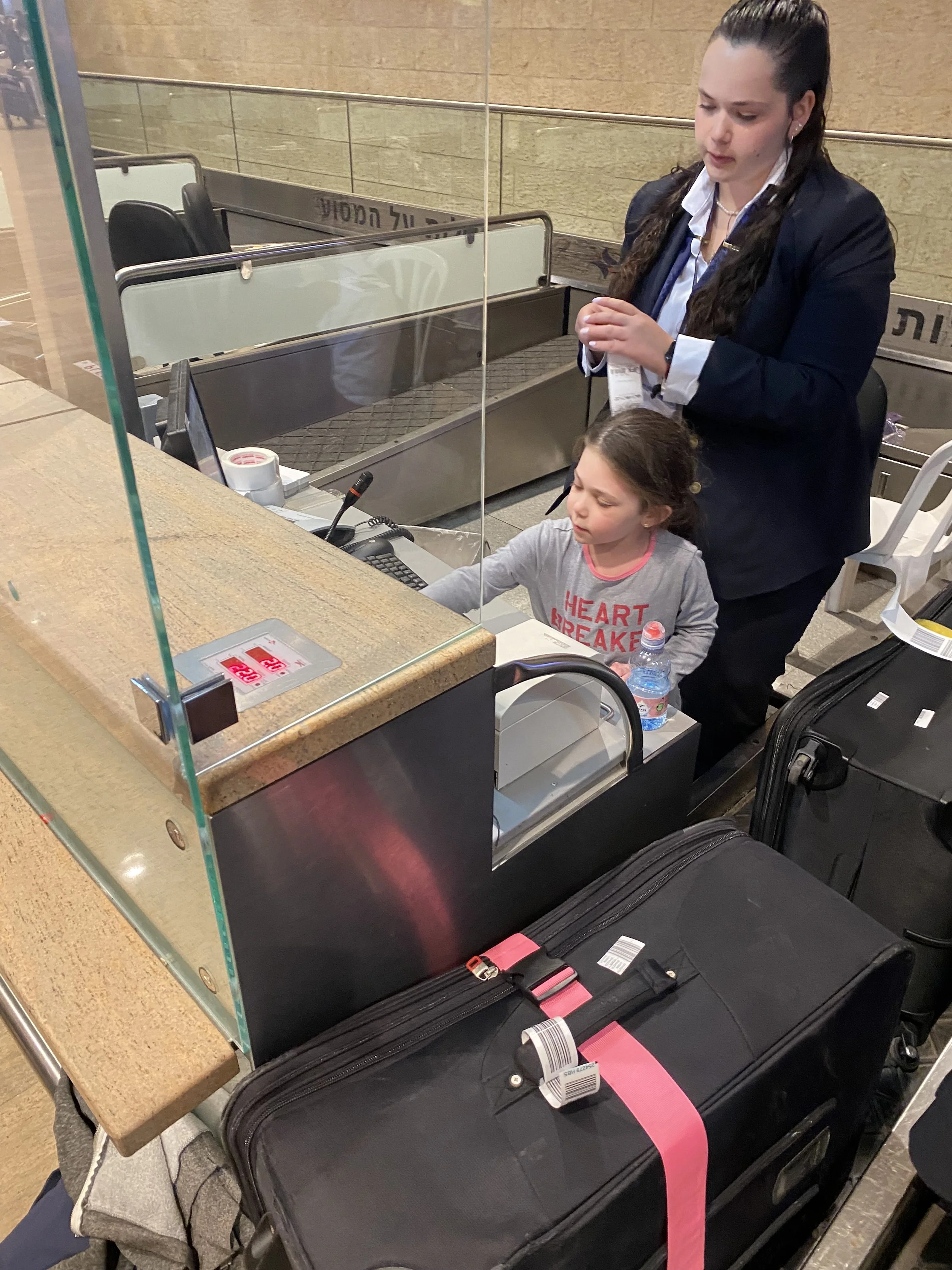Next was the line for check in, which was another half hour. It was so long that they were giving out water bottles and chocolate. When we were almost to the very front Einav arrived to start her shift and pulled us off the line and took us to do check in at her own check in counter. It was really cute because she took Hallie behind the counter and let Hallie put the bar code stickers on the luggage and then press the button to send the bags away. Hallie loved it but Madeleine was jealous. Hope all of our bags make it.