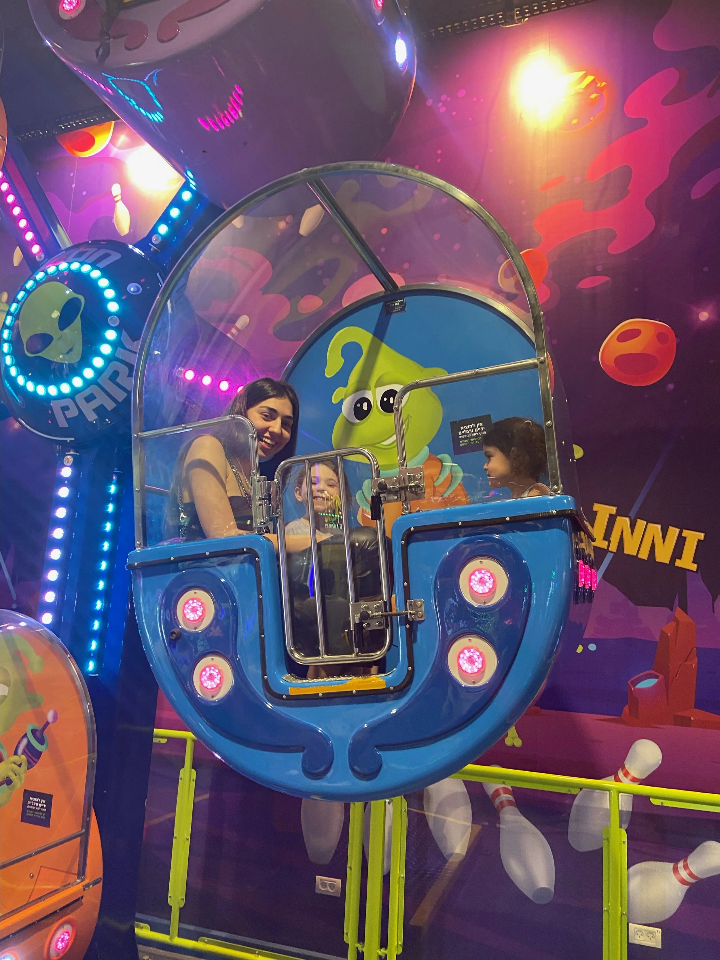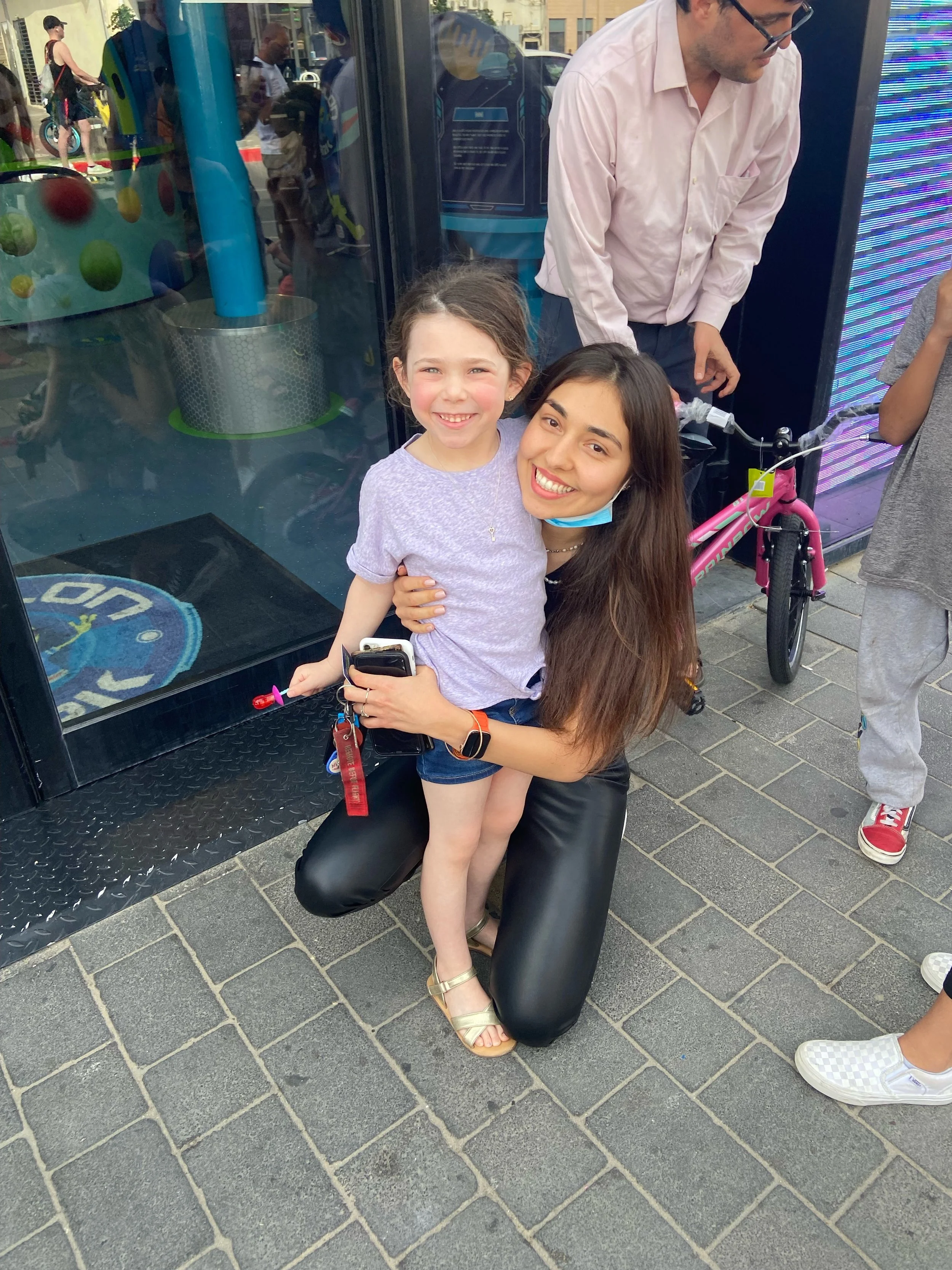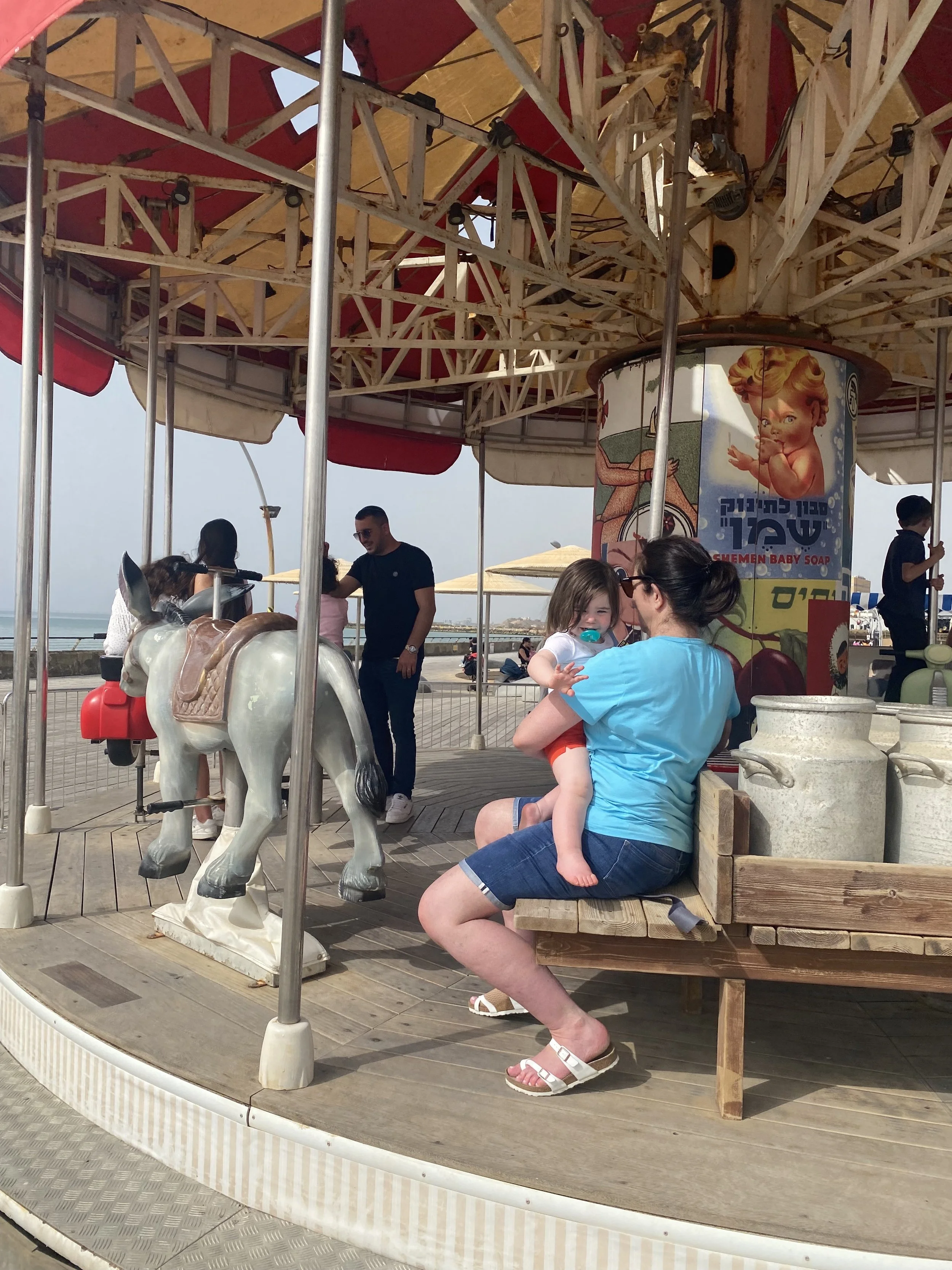 We stayed for a while and then got back on the bus and planned to go to the port. The driver said it would take 15-20 minutes. Now, the problem was this driver wasn’t using Waze. Also, this man has lived in Israel for 30 years so he should know that this main road in Tel Aviv is always packed. Anyway, the drive ended up taking about 45 minutes. All this time I had been texting Ofek, our first au pair, because we wanted to see her. She watches kids during the day so she ended up brining the three kids to meet us at the port. Hallie had no idea what we were planning and when she saw Ofek she was so excited and gave her the biggest hug. It was such a nice reunion for the both of them. I stayed with Hallie and Ofek (and the three kids she was watching) at this indoor arcade, while everyone else walked around the port. The arcade had some cute rides and Hallie had a really nice time. She kept saying she just wanted to stay with Ofek but we all had to go home eventually.