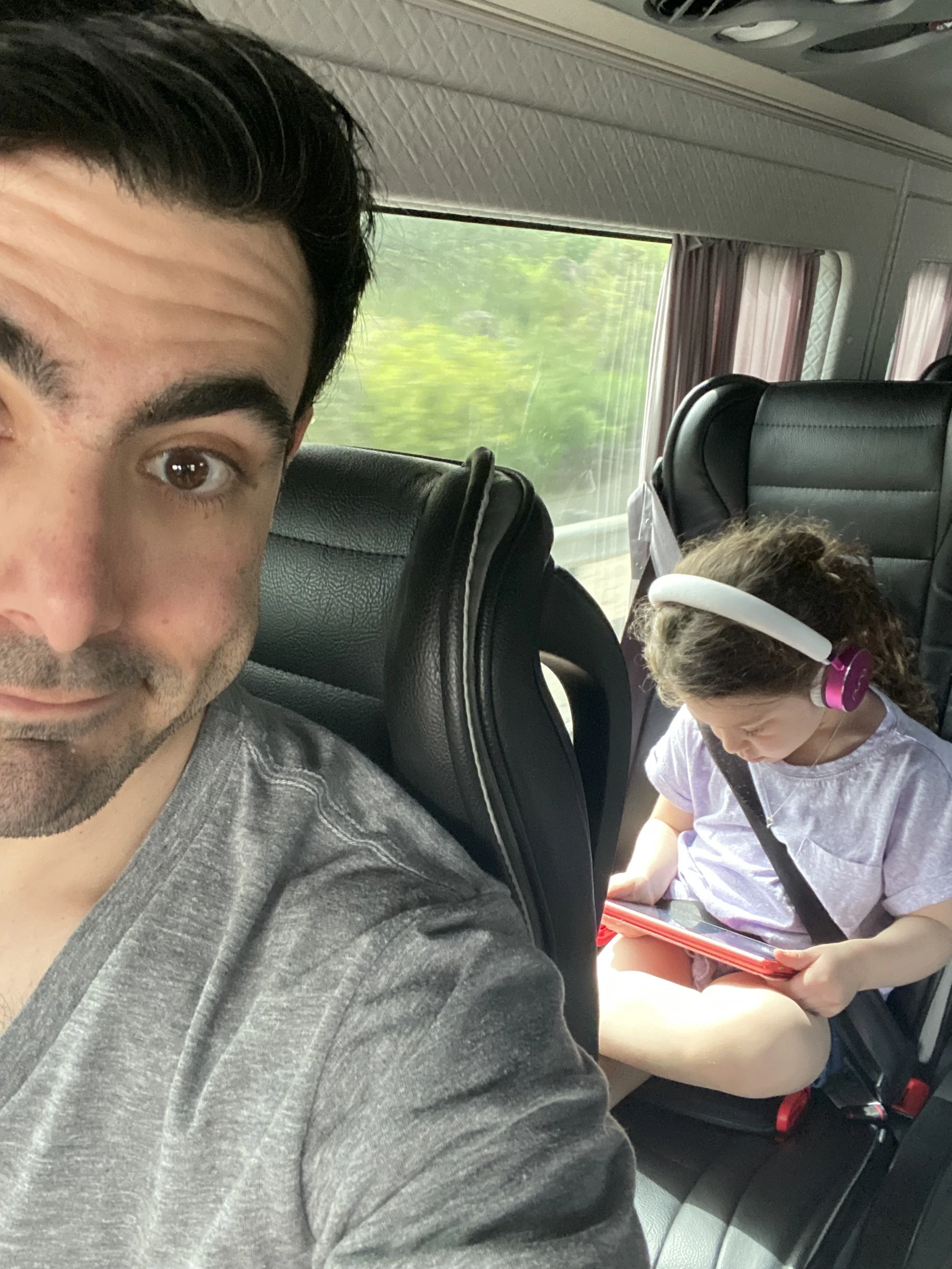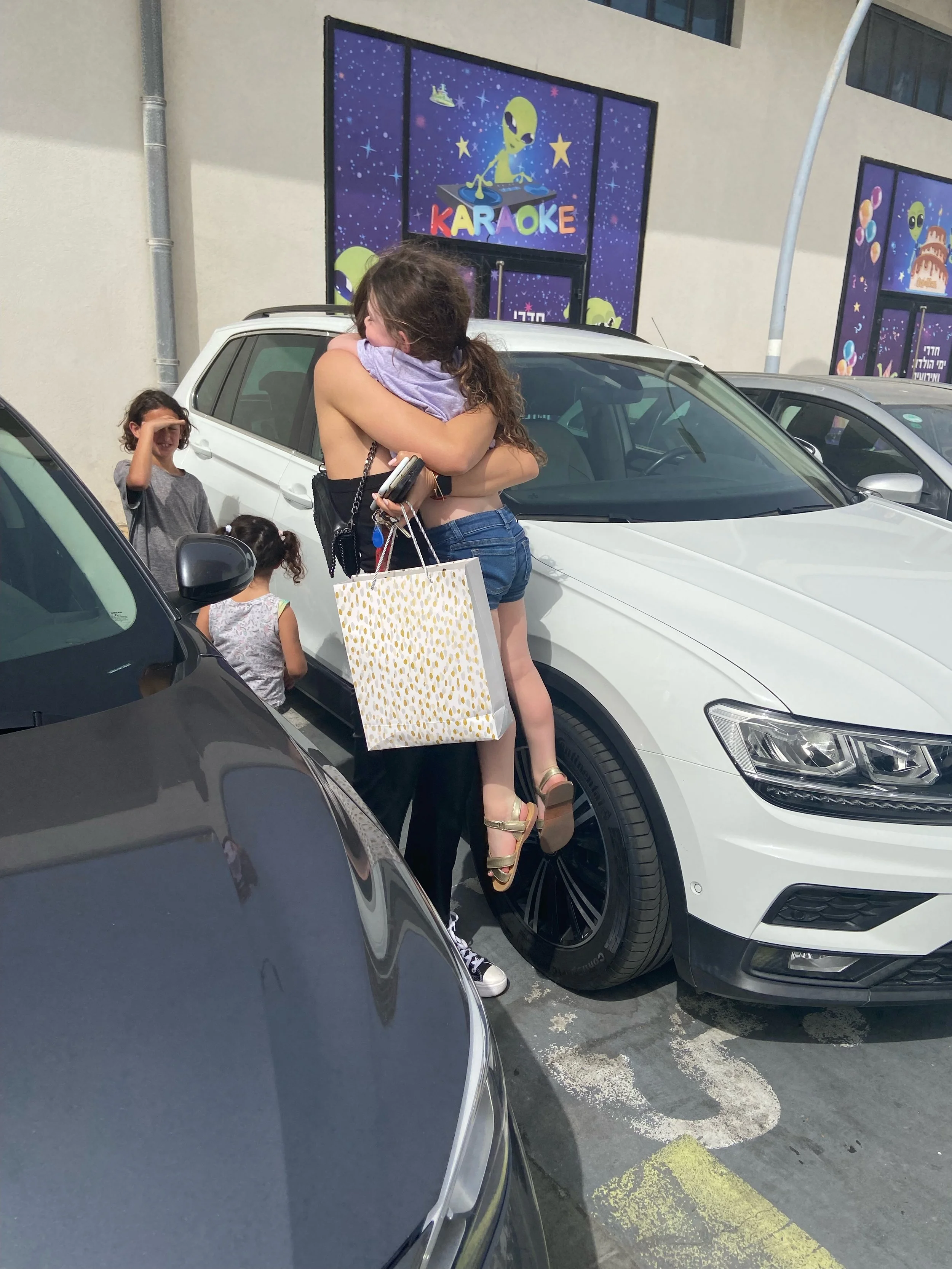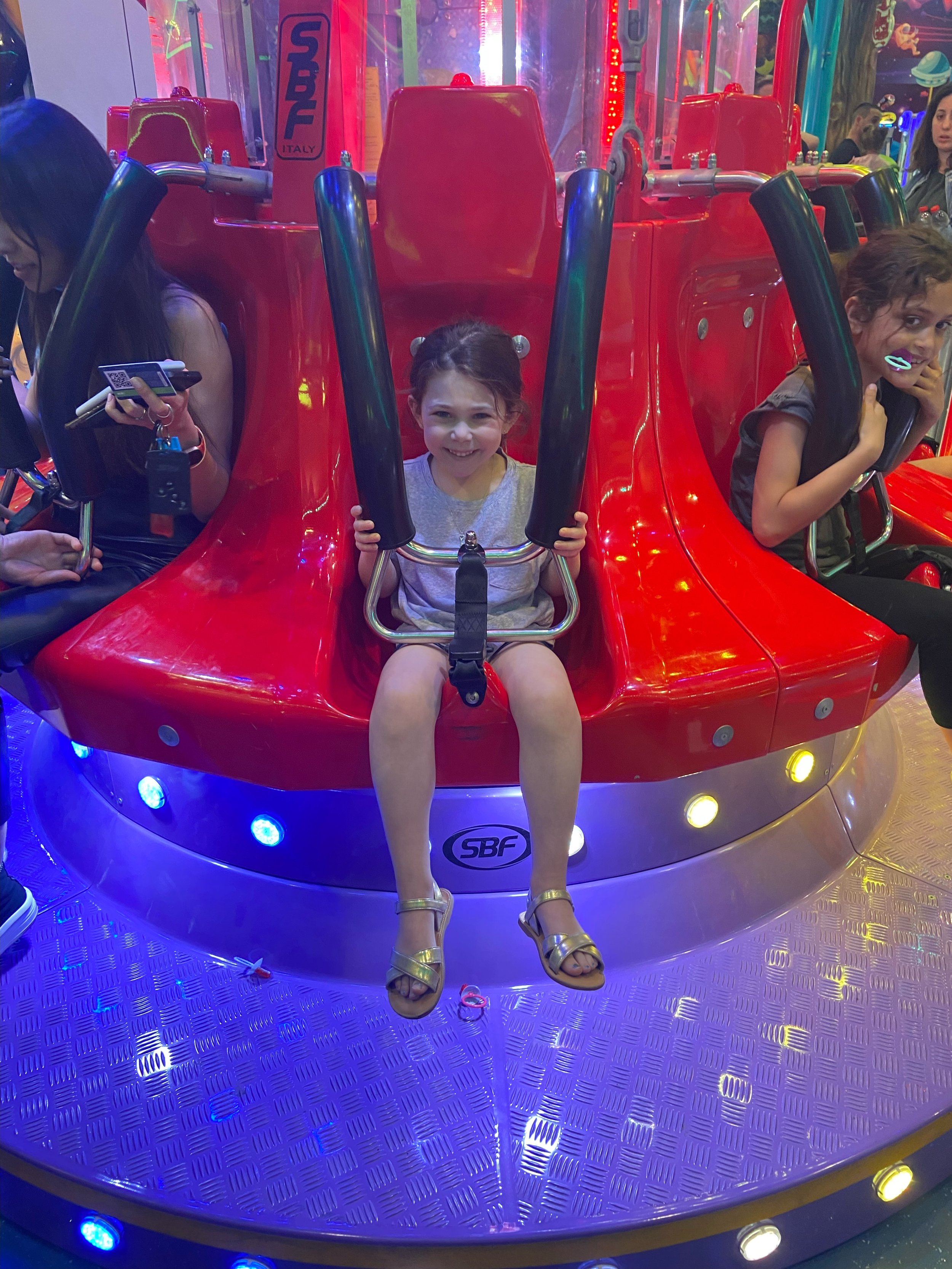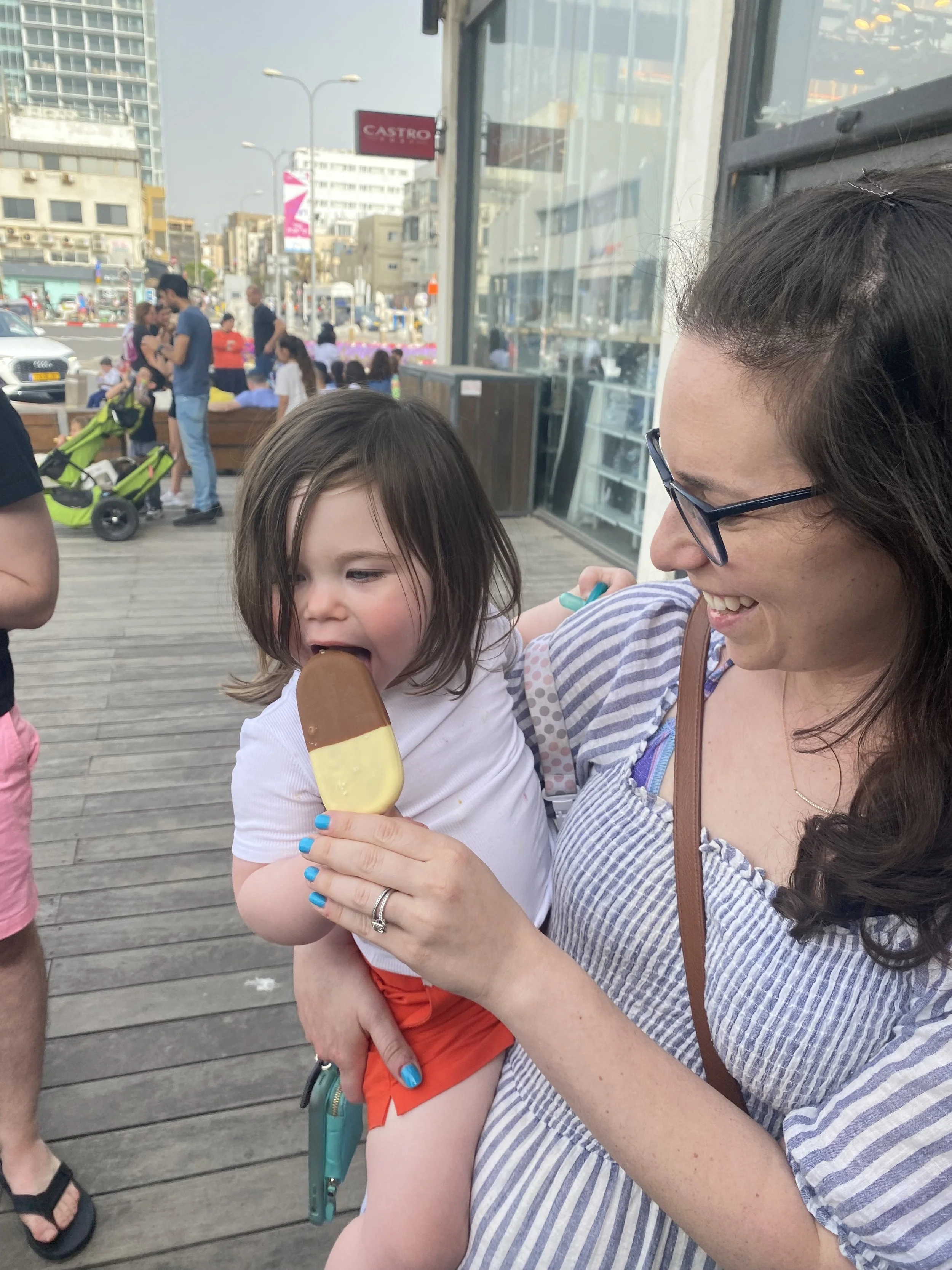 We stayed for a while and then got back on the bus and planned to go to the port. The driver said it would take 15-20 minutes. Now, the problem was this driver wasn’t using Waze. Also, this man has lived in Israel for 30 years so he should know that this main road in Tel Aviv is always packed. Anyway, the drive ended up taking about 45 minutes. All this time I had been texting Ofek, our first au pair, because we wanted to see her. She watches kids during the day so she ended up brining the three kids to meet us at the port. Hallie had no idea what we were planning and when she saw Ofek she was so excited and gave her the biggest hug. It was such a nice reunion for the both of them. I stayed with Hallie and Ofek (and the three kids she was watching) at this indoor arcade, while everyone else walked around the port. The arcade had some cute rides and Hallie had a really nice time. She kept saying she just wanted to stay with Ofek but we all had to go home eventually.