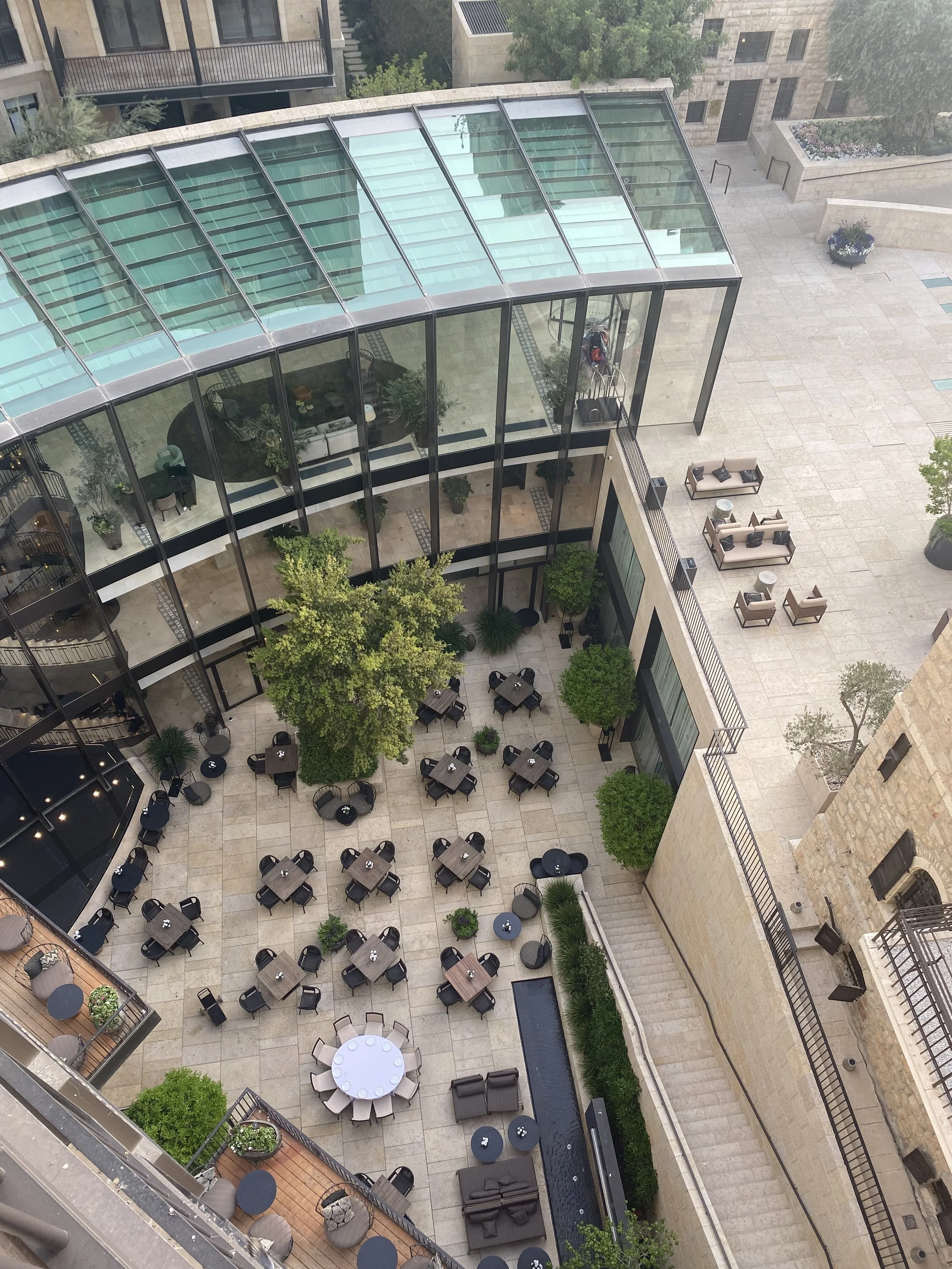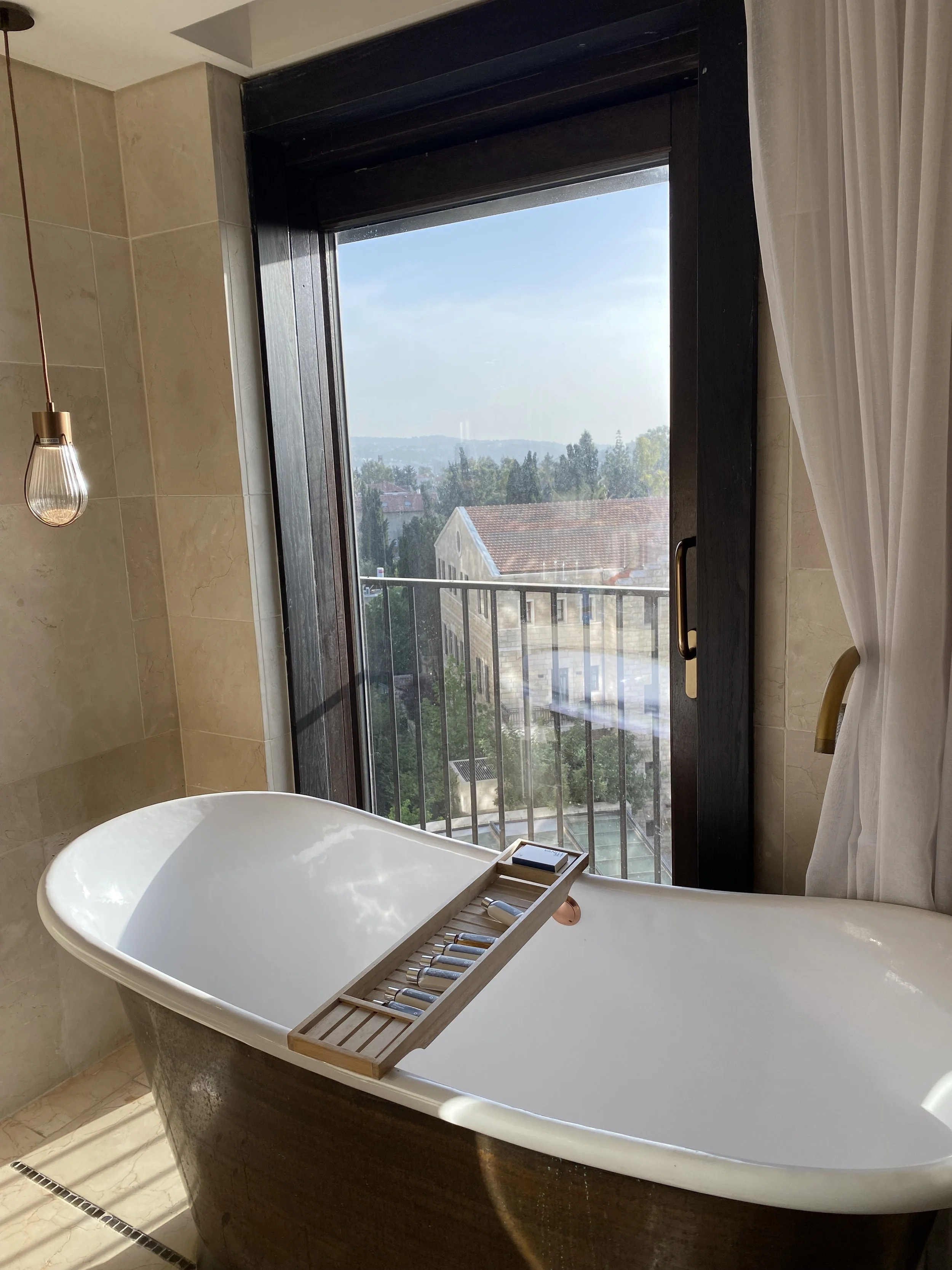 We got back on the bus and headed back to Jerusalem. I think we observed that for a guy who drives for a living, this driver didn’t seem to enjoy driving. Anyway, the drive back was fine. Tablets were used by both children and when we finally arrived at the hotel all our luggage was moved into our new room! Our new room is in the main building on the 6th floor. It’s a corner room, so, similar to the previous room setup there’s an outer door that closes off the hallway outside our rooms so you can just keep the two room doors open and have a two room suite. The rooms are so much more modern and luxurious feeling than the boutique rooms we started with. Both rooms have tubs and balconies. Our room is actually the corner of the hotel, so we have a balcony overlooking the old city, and then our bathroom has a balcony overlooking the front of the hotel. We also have a big clawfoot tub next to the window, so we’ll be able to bathe and watch people coming and going in the front of the hotel.