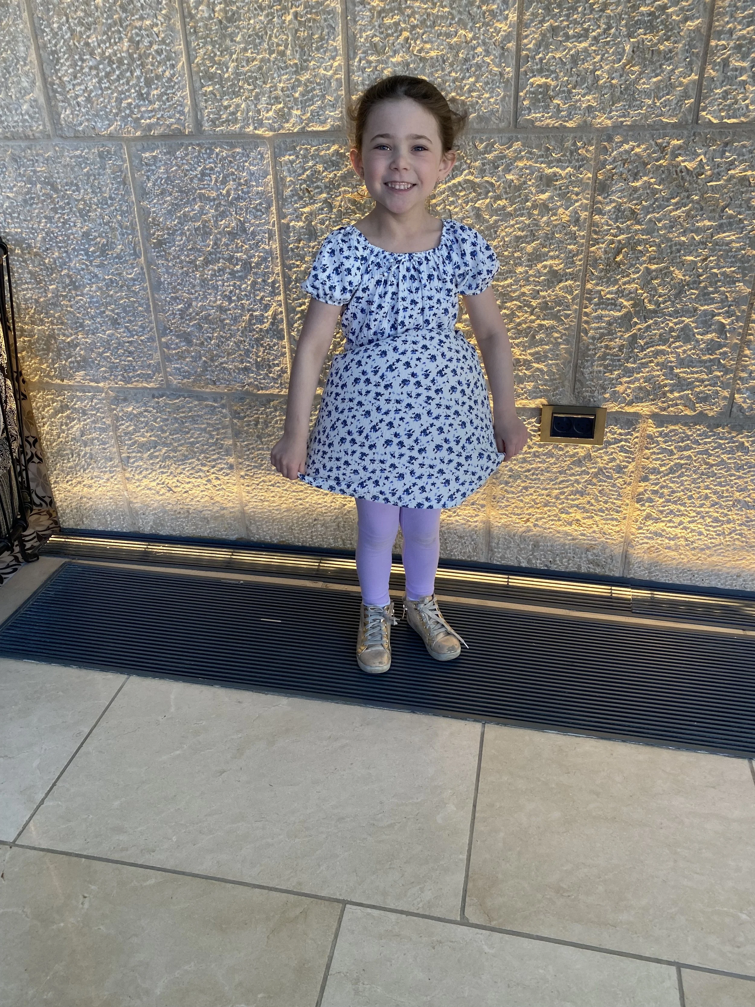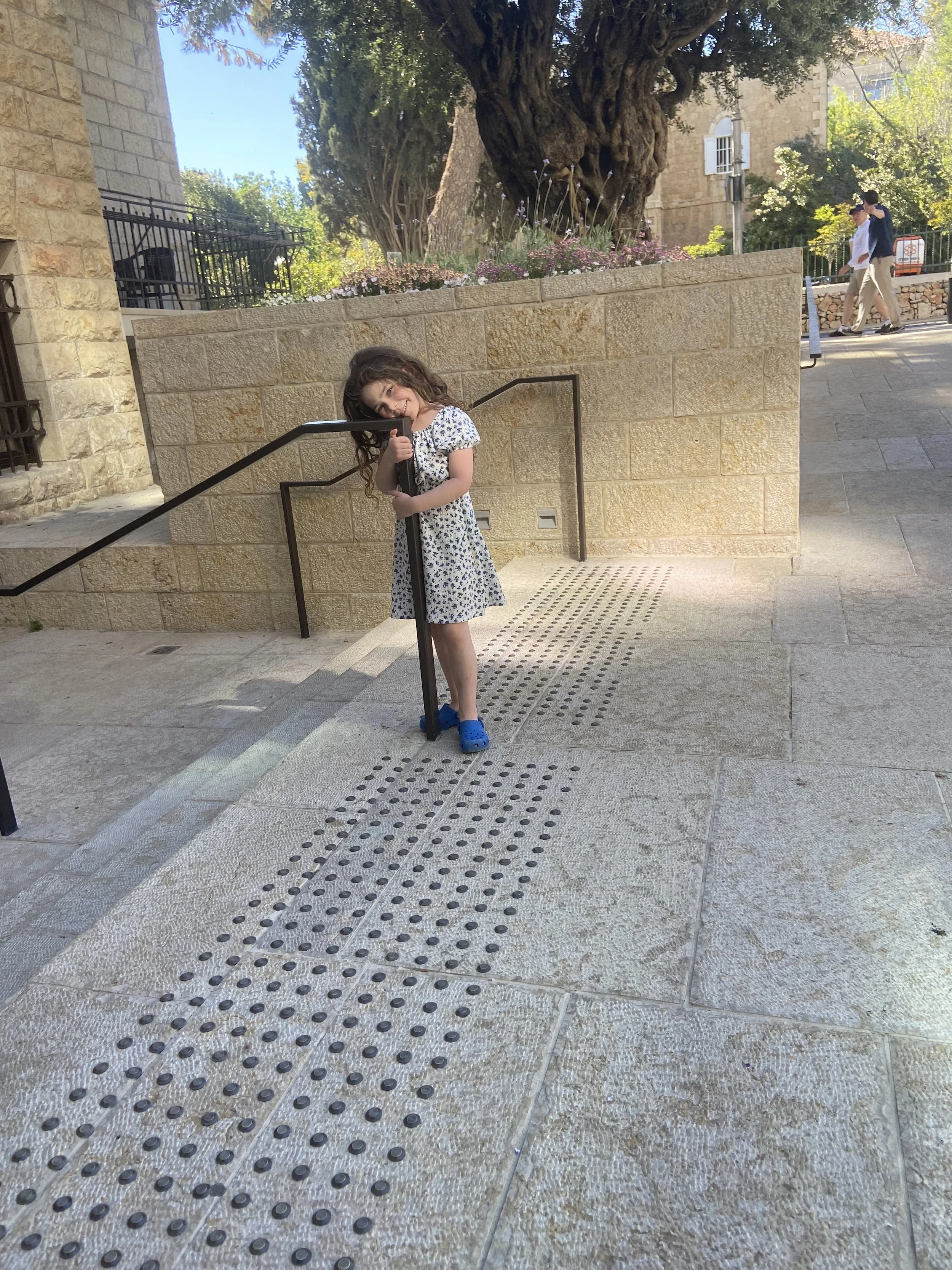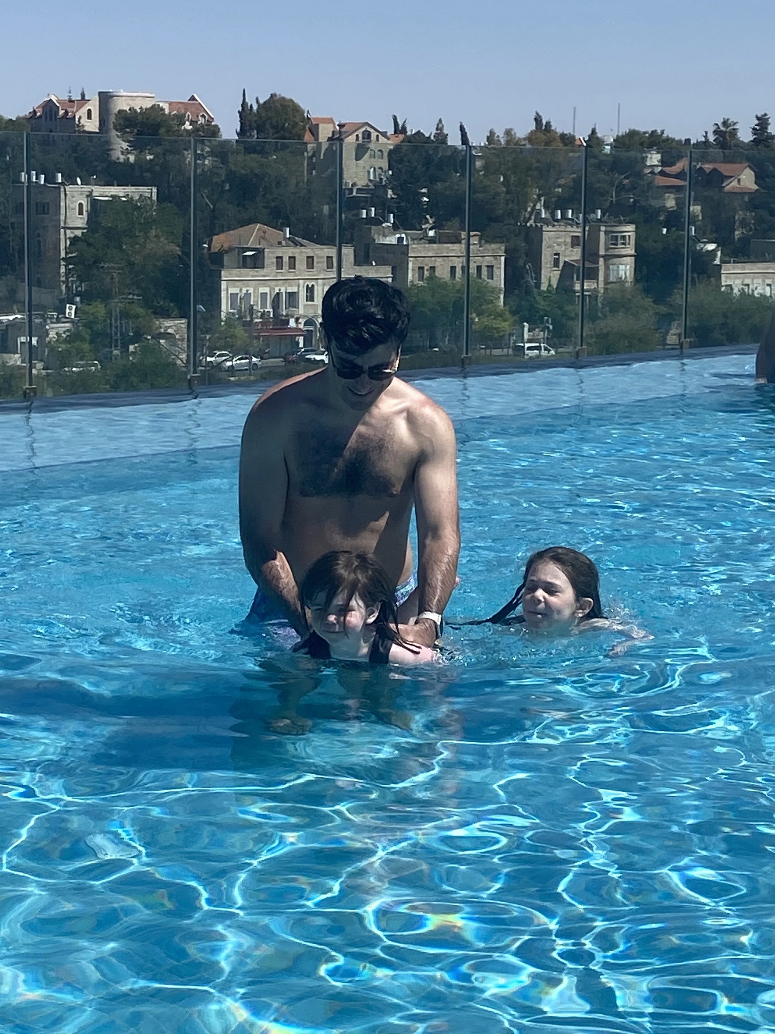 Tzvi went back to the pool while I stayed in front of the hotel so the girls could run around and play. Eventually Robyn came back (she had taken the bus from her kibbutz). We’re grateful that she actually returned to us.