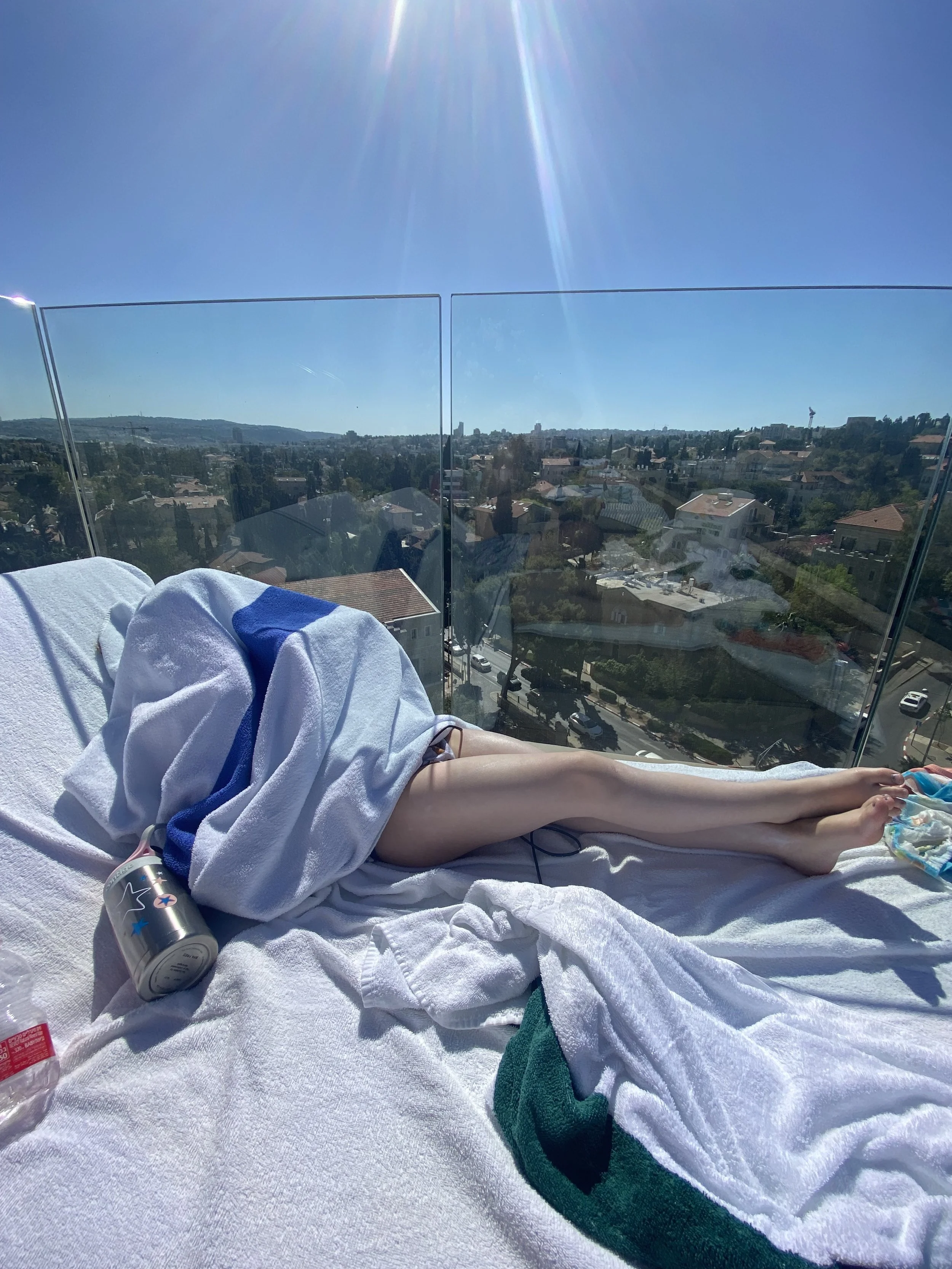 Anyway, we got a daybed with a view of the Old City walls which was pretty nice. Eventually I went to meet him and we sat there for a little while. Around 12 I went down to the lobby to the yuntev meal reservation desk, because my mother told me (three times) that it opened at noon and I needed to be there early to make sure we got a reservation. Well, I went right at noon and they told me that we were all set and there was no need to have come to the desk. [Tzvi: For the record, I told her that she didn’t need to go to that desk, but no one listens to me.]
