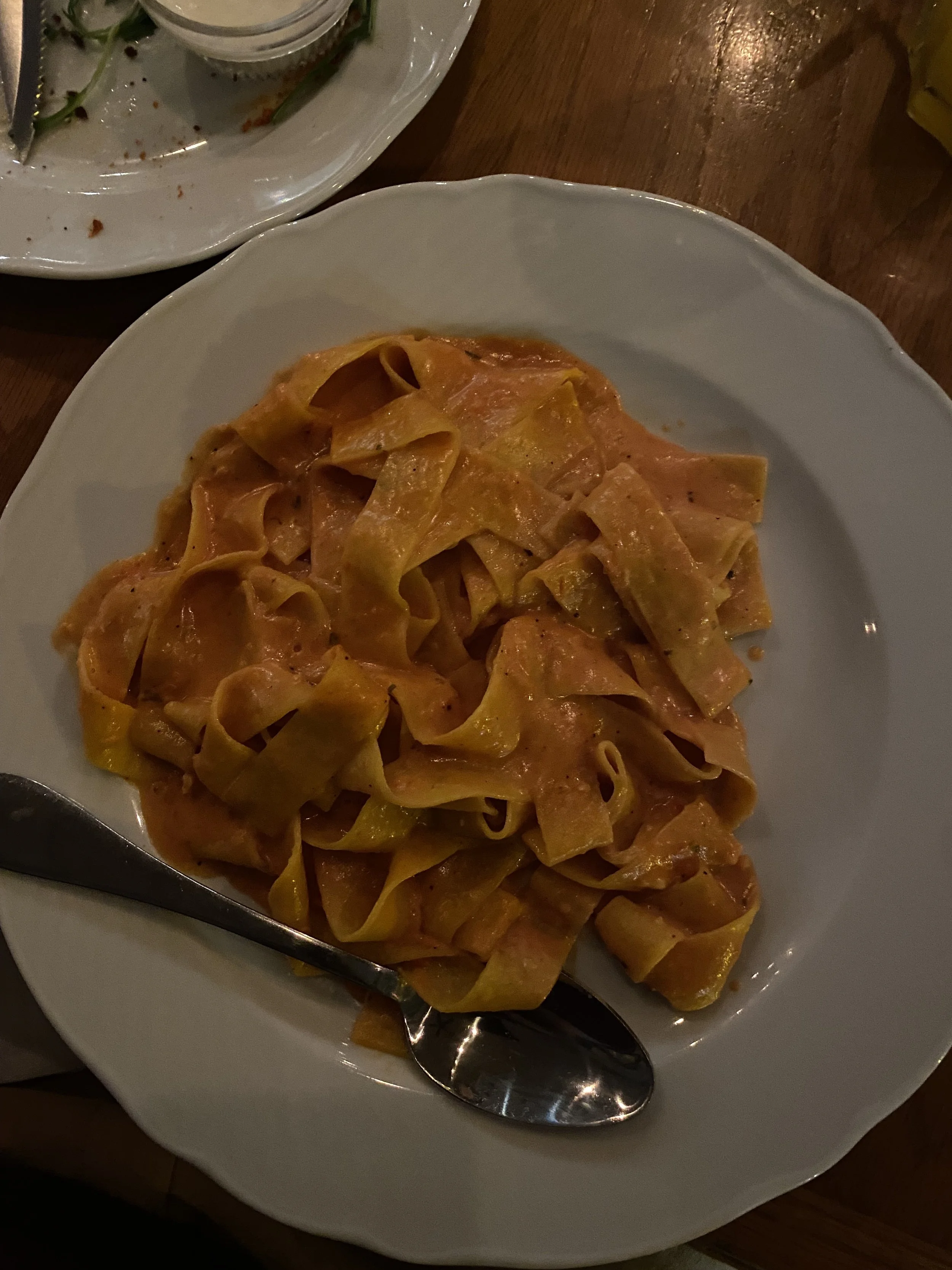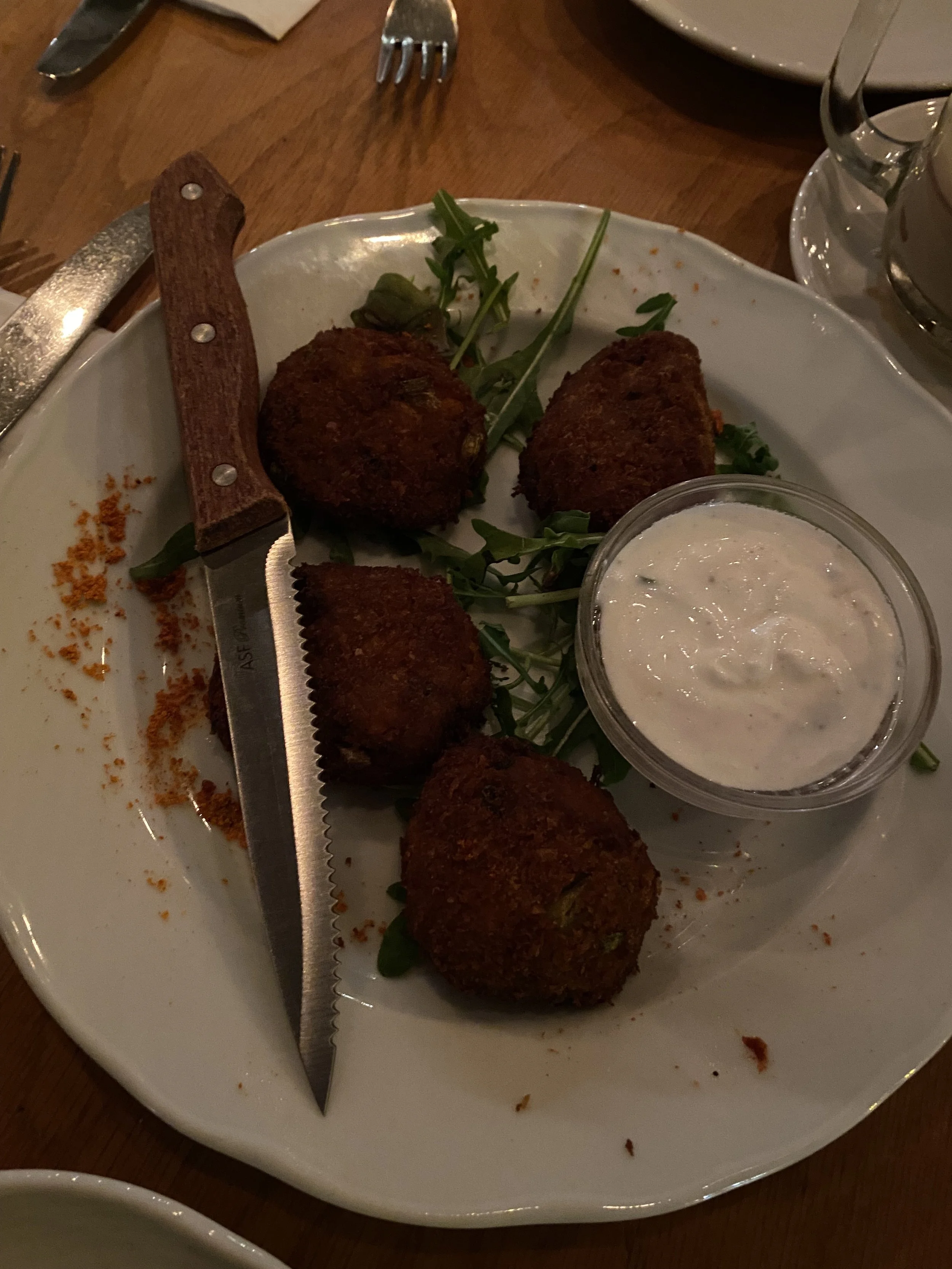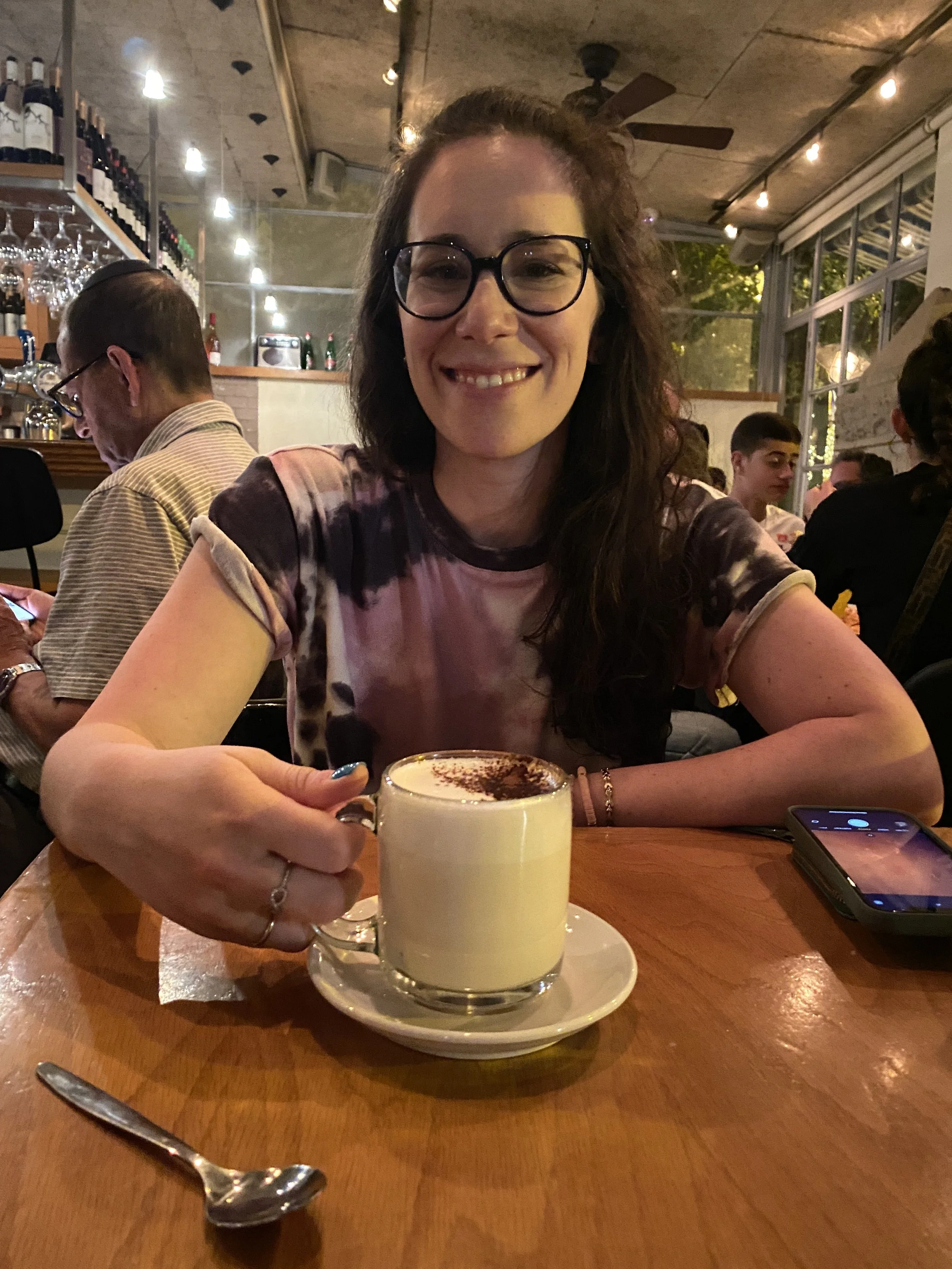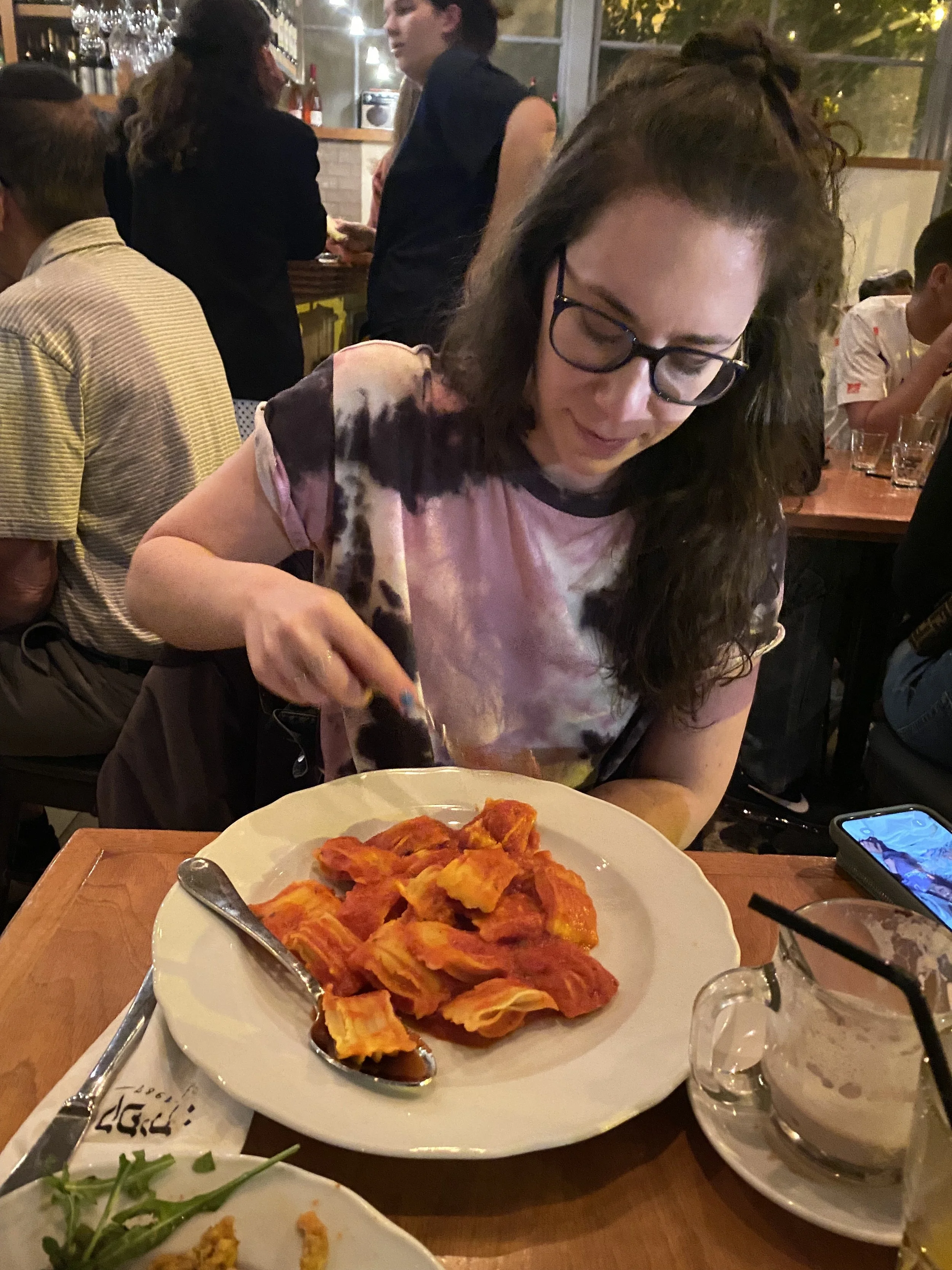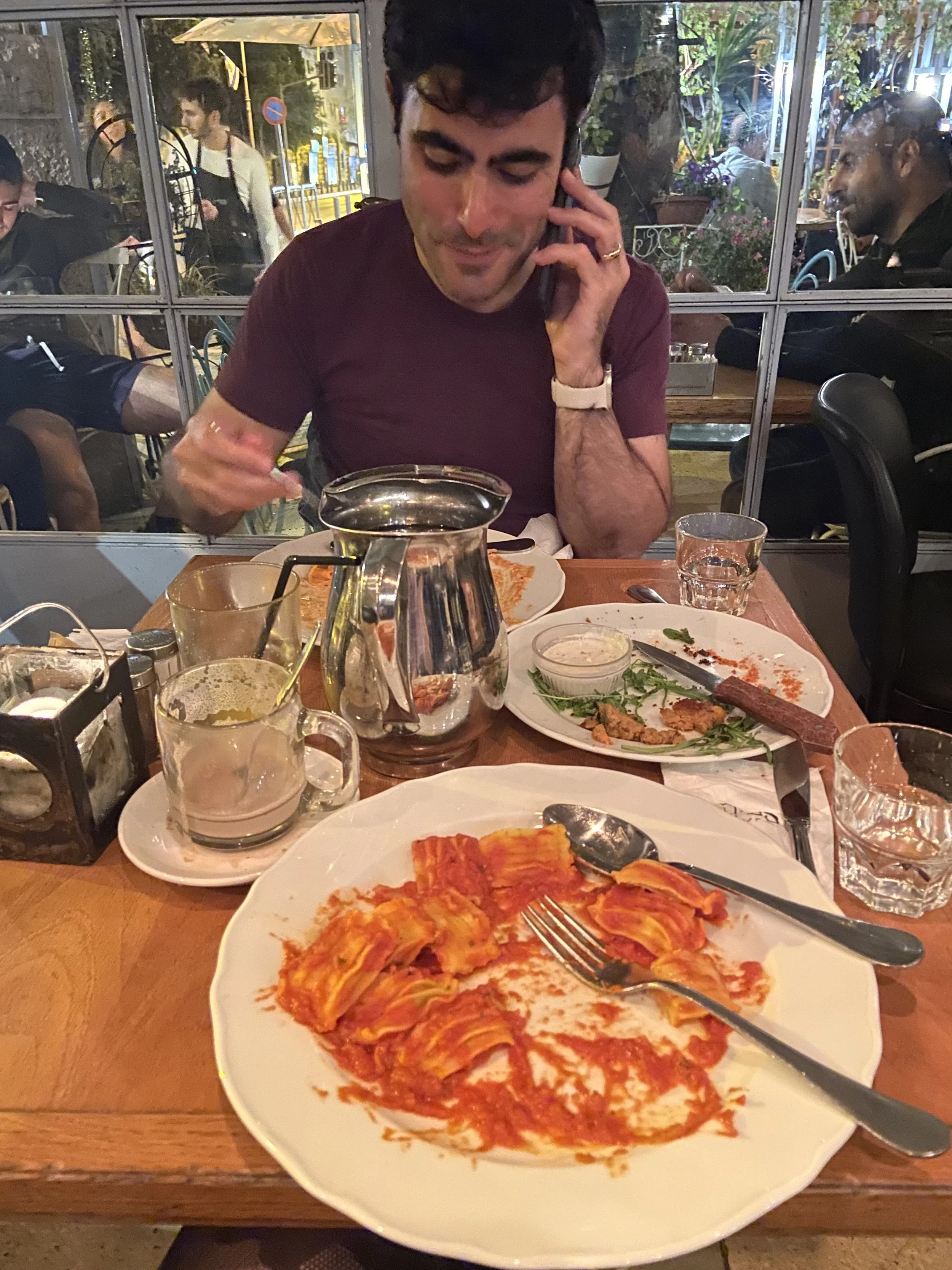 We walked down Emek Refaim but it didn’t seem that much was open. We made it all the way to the end where the Waffle Bar used to be – the one we went to after Pesach ended in 2017 – but it’s a real estate office now. So we walked back and got a table at Cafit, which was the only thing open. It was so hot in the restaurant but I saw a bailey’s hot chocolate on the menu and couldn’t resist. It was really good. Tzvi needed a cold drink but their coffee machine wasn’t working yet, so he ended up with fresh squeezed orange juice, which was actually very good. We shared sweet potato pancakes, which were ok. Pasta was the only real chametz they had (it was too soon to have any bread), so I had sweet potato ravioli, which was pretty good, and Tzvi had pappardelle with a tomato cream sauce.