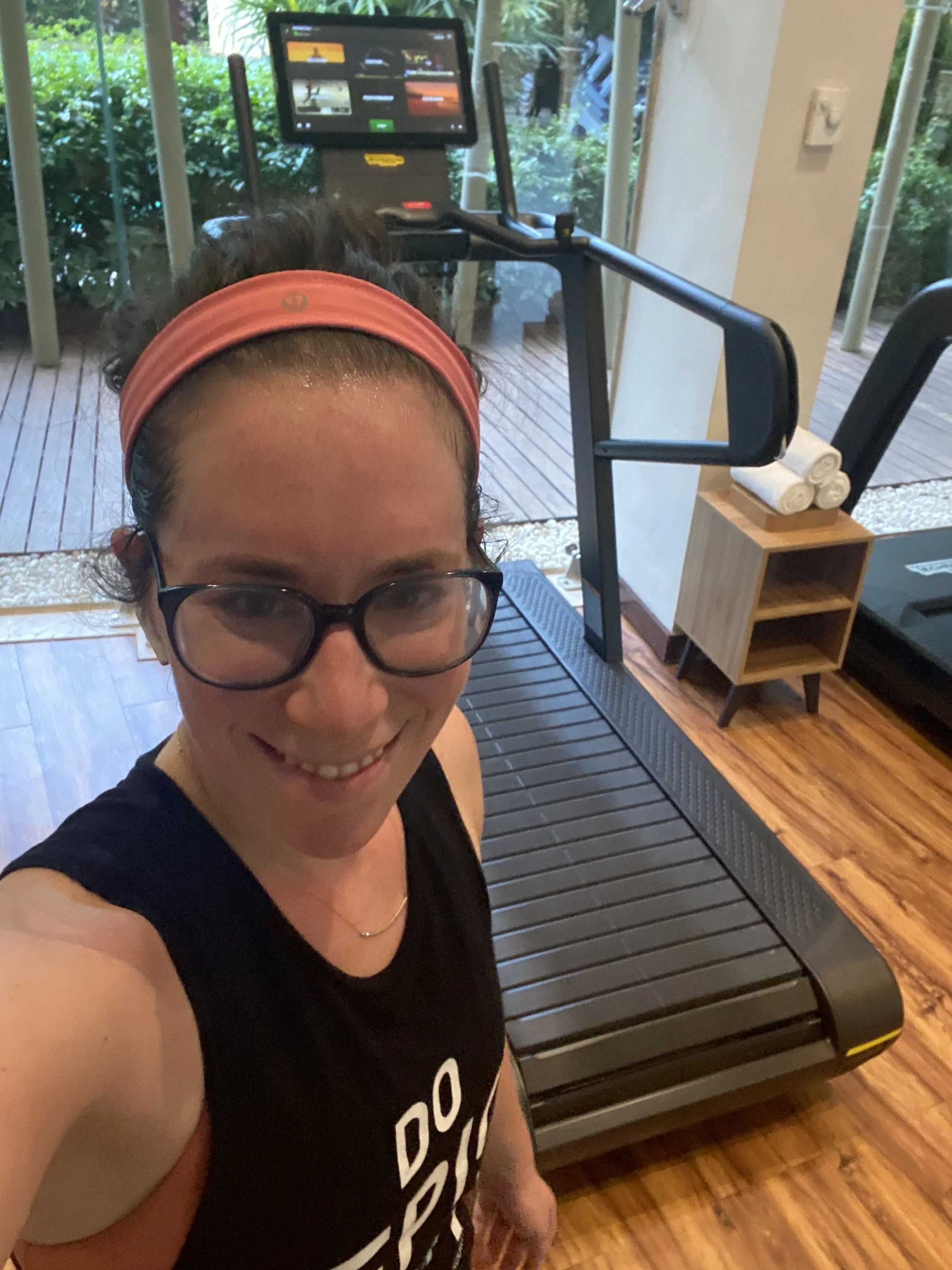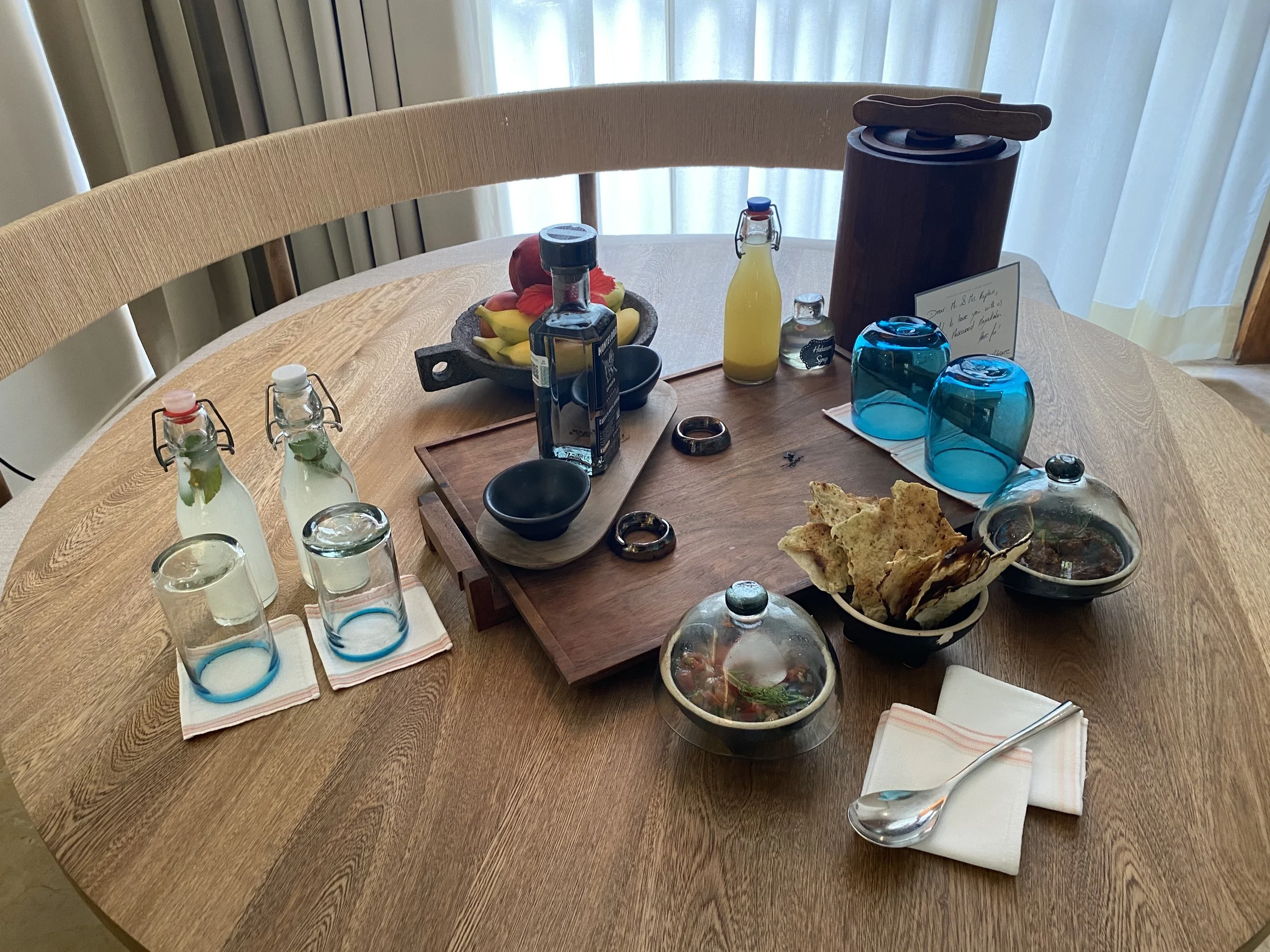 We walked into the suite and our butler gave us a tour of the room and made us a Mezcal cocktail. There were also delicious fresh chips and salsa. We decided to go for a quick swim in the plunge pool and then I went to the gym. It’s a nice gym (with Pelotons) but today I opted for a tread bootcamp with Jess Sims. They have a treadmill with slats here so I always like to take advantage of that. I came back and we got ready for dinner.
