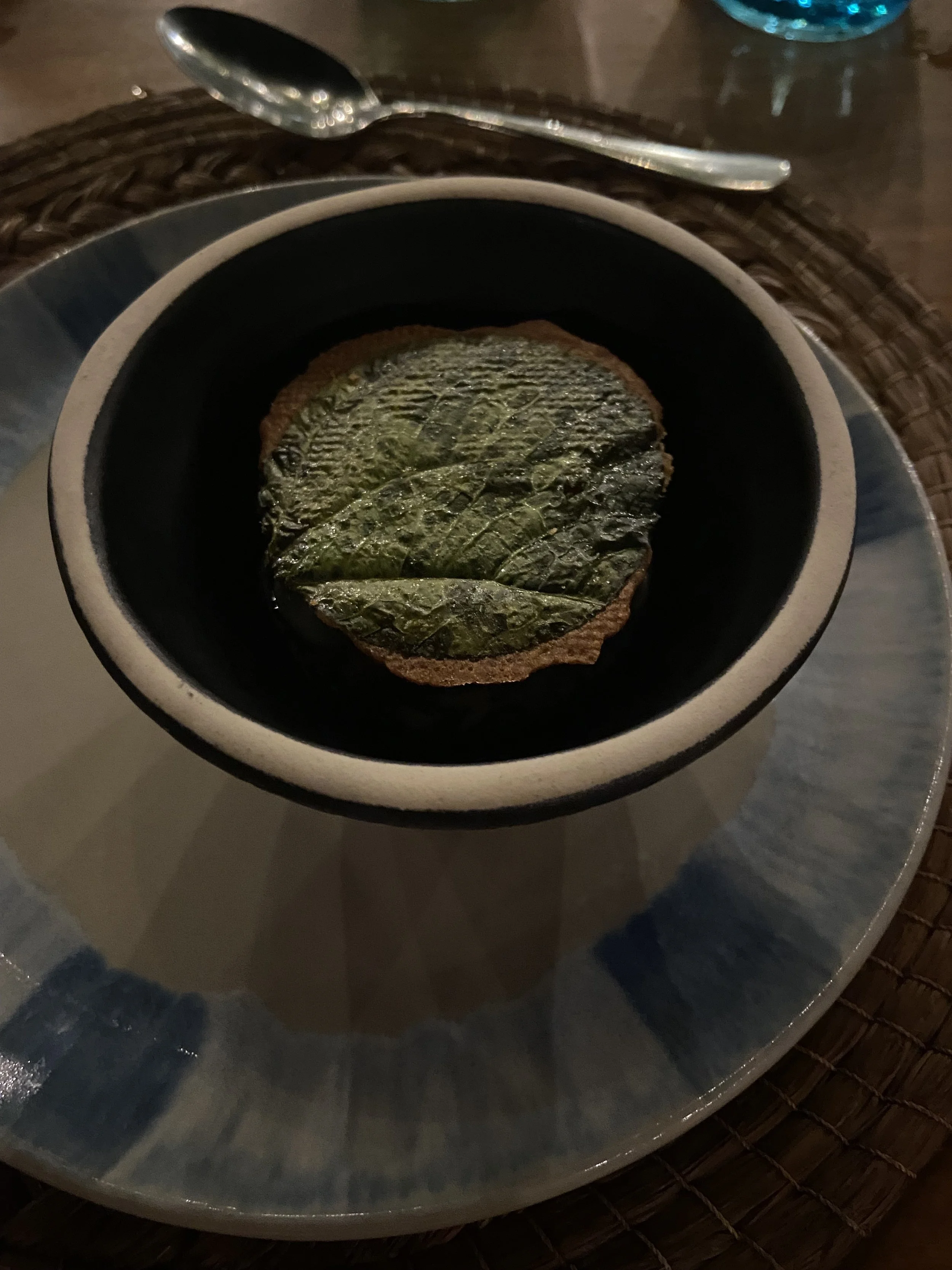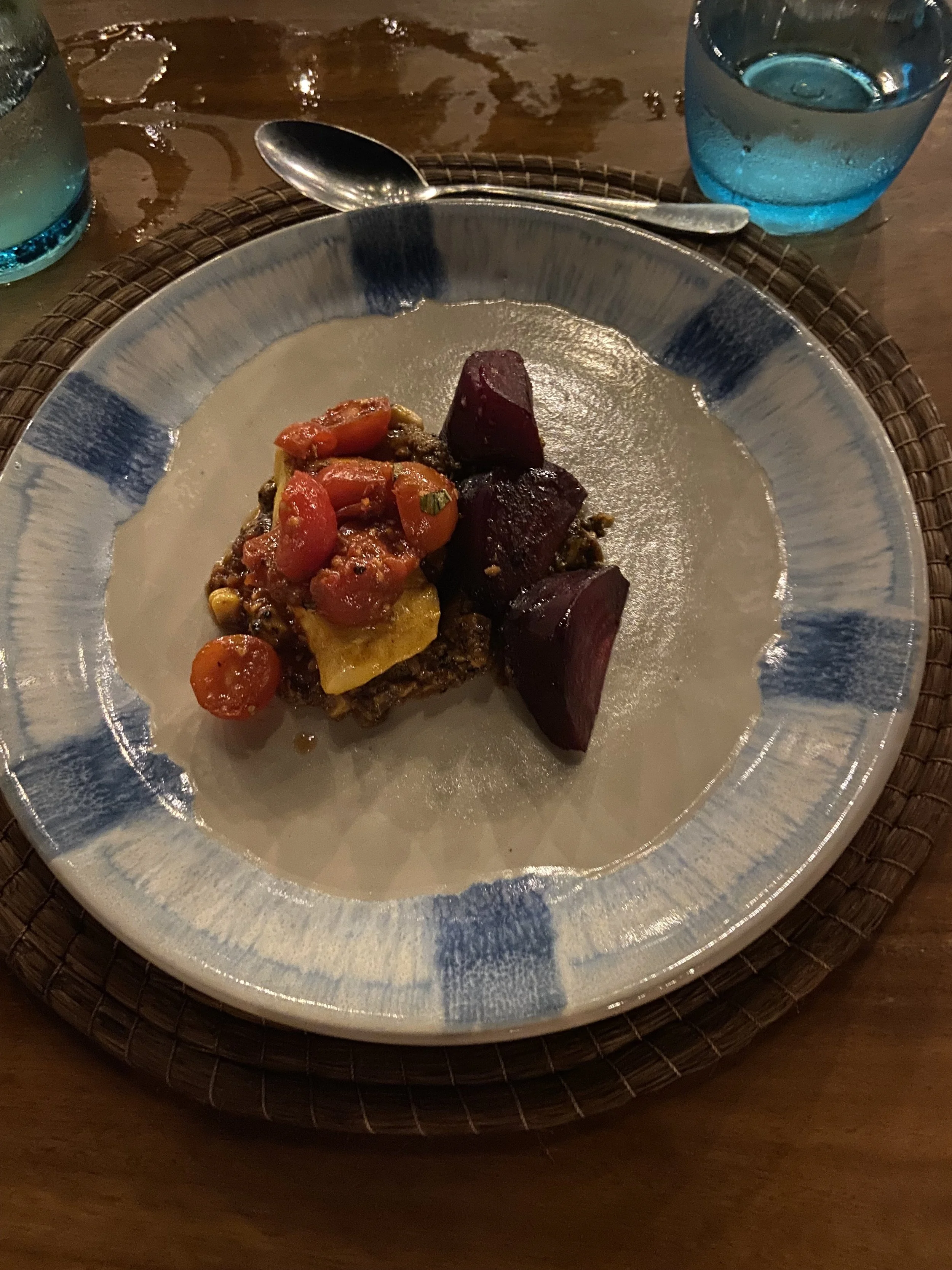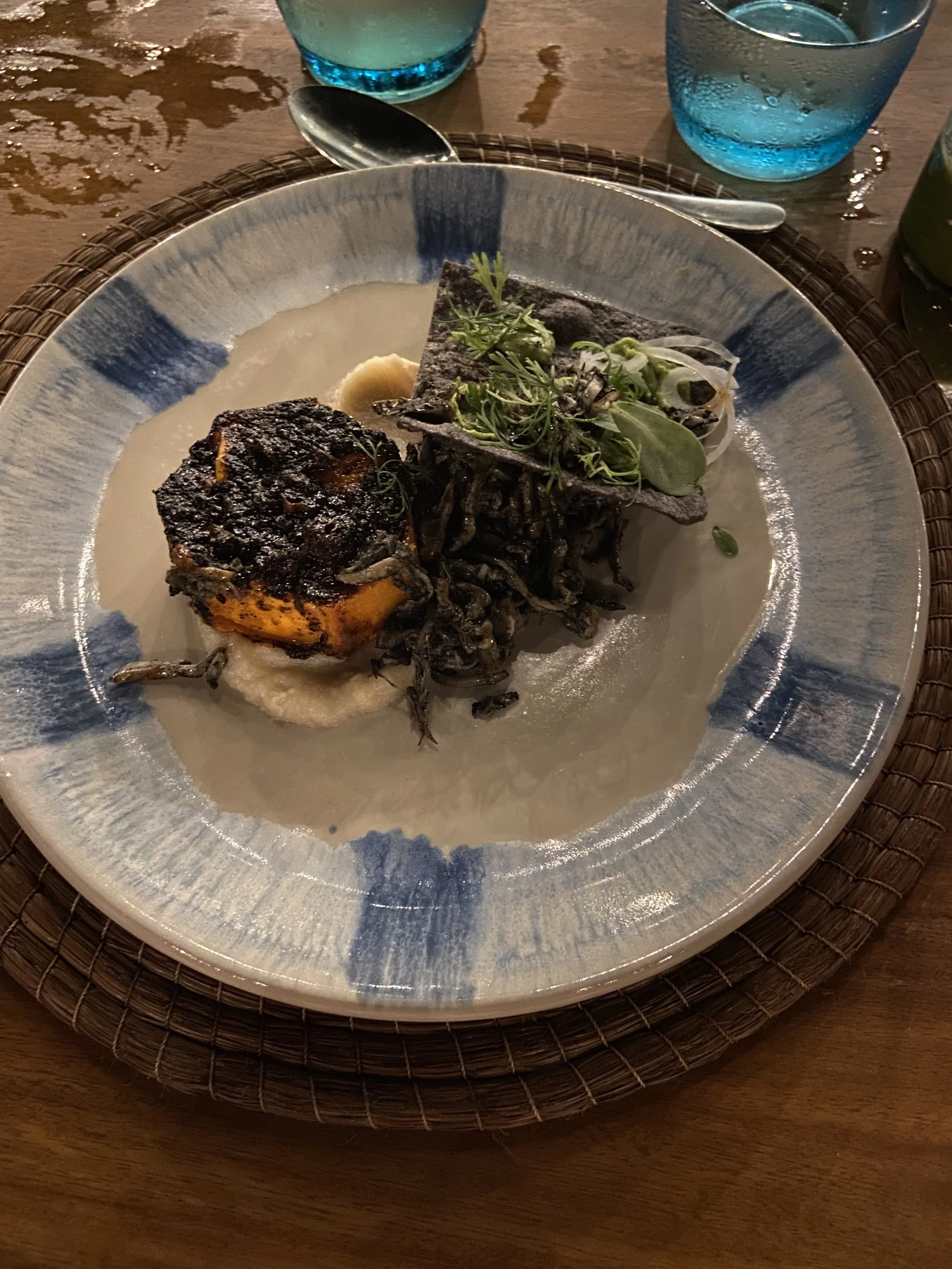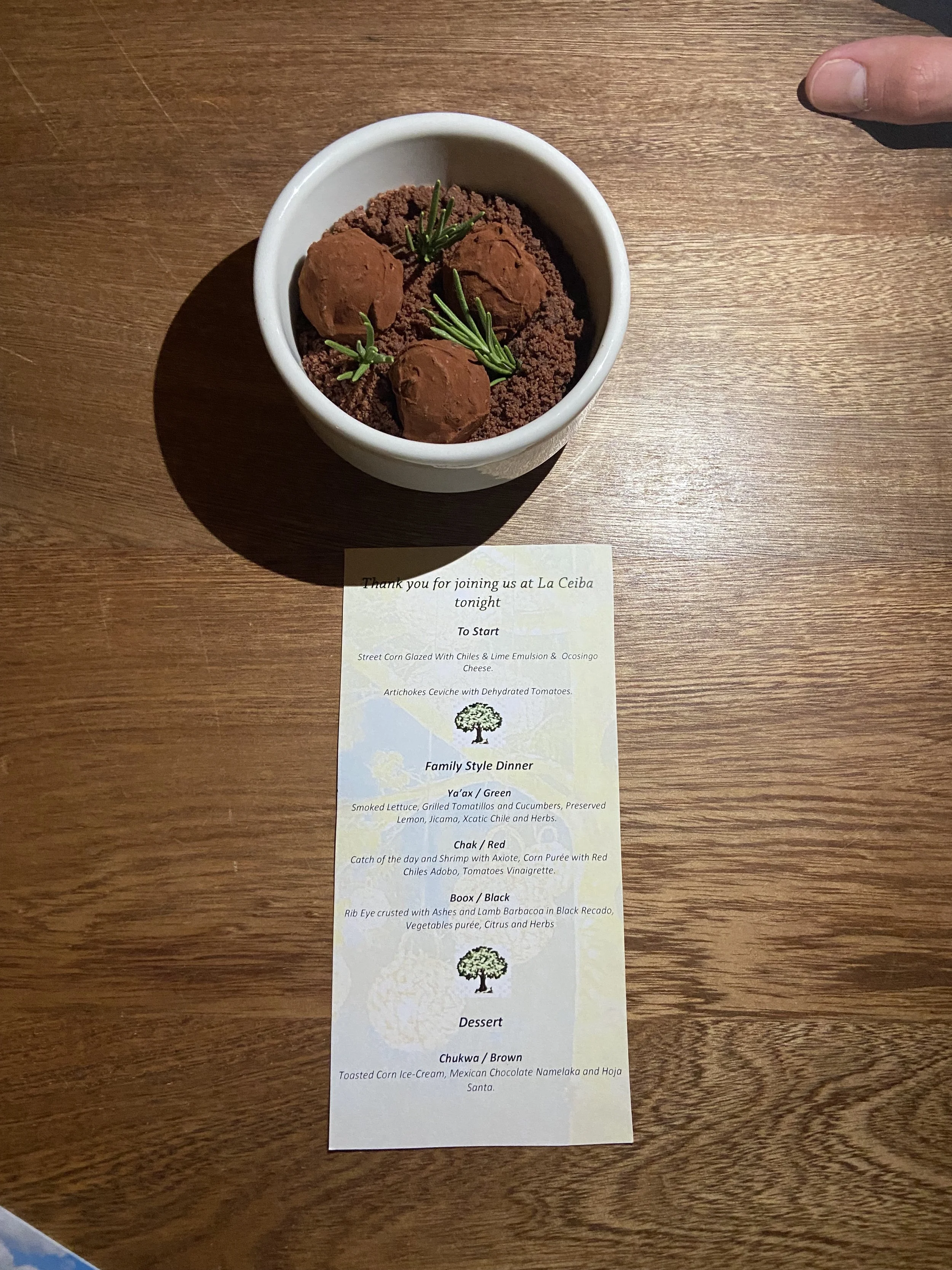Anyway, they started dinner by having Nacho give an introduction of the experience and the garden. Then chef Jorge “presented the menu”, which was written on a huge board being held up by two of the hotel staff. He went through each course and explained that corn was the central theme of the evening and would be in every dish. Then the meal started and we went course by course; of course we had a vegetarian version of each dish.