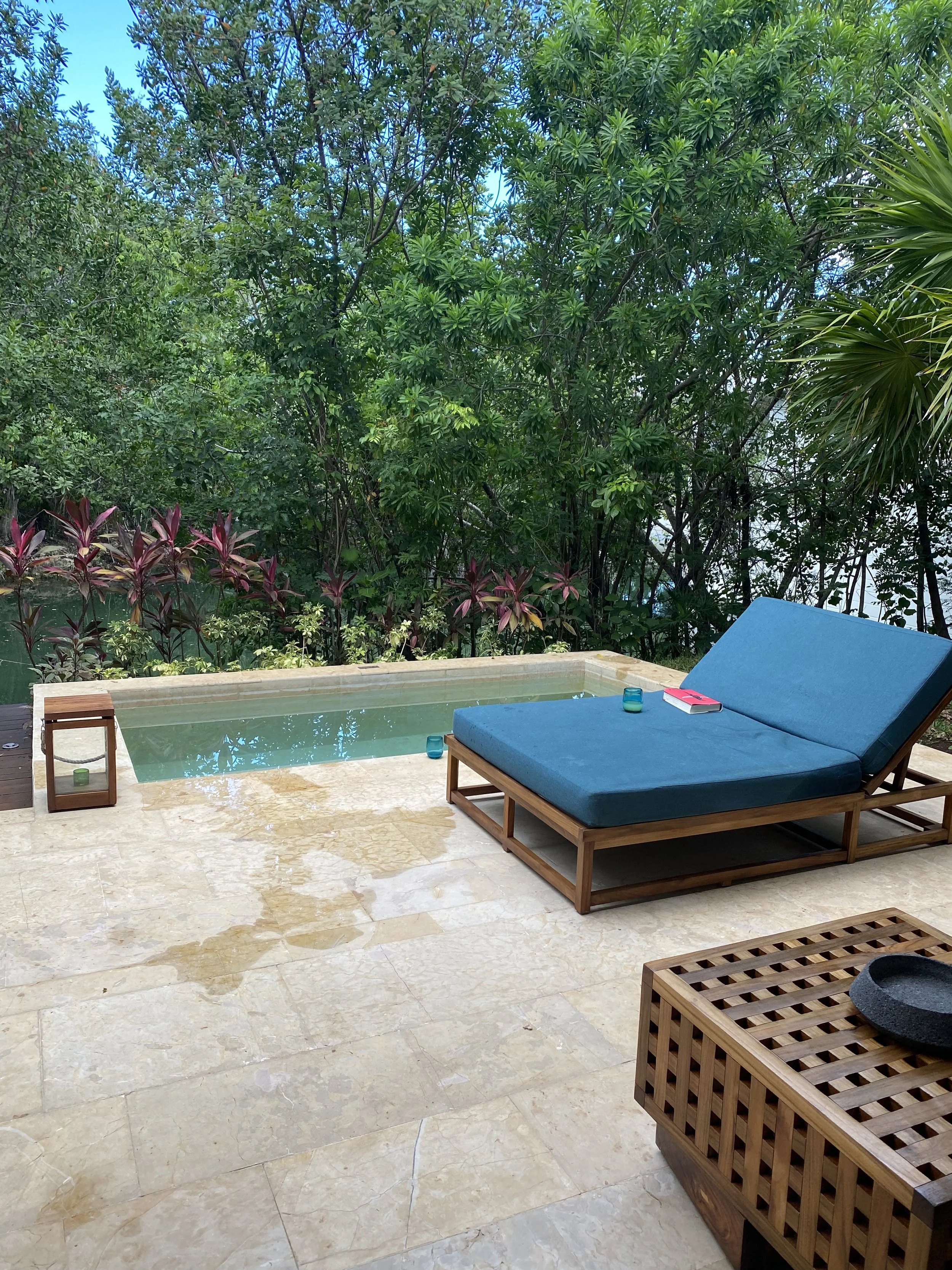 Our suite is the same type of room as last time, but this time I think there is less vanity space because it is a connecting room. The suite has an eating area, a bar, a couch and then a big bathroom with the world’s largest bathtub and a shower, which itself has a door that leads to an outdoor garden with another shower. We have a large outdoor space with a sofa, chairs, a table and a private plunge pool, all secluded and overlooking the lagoon.