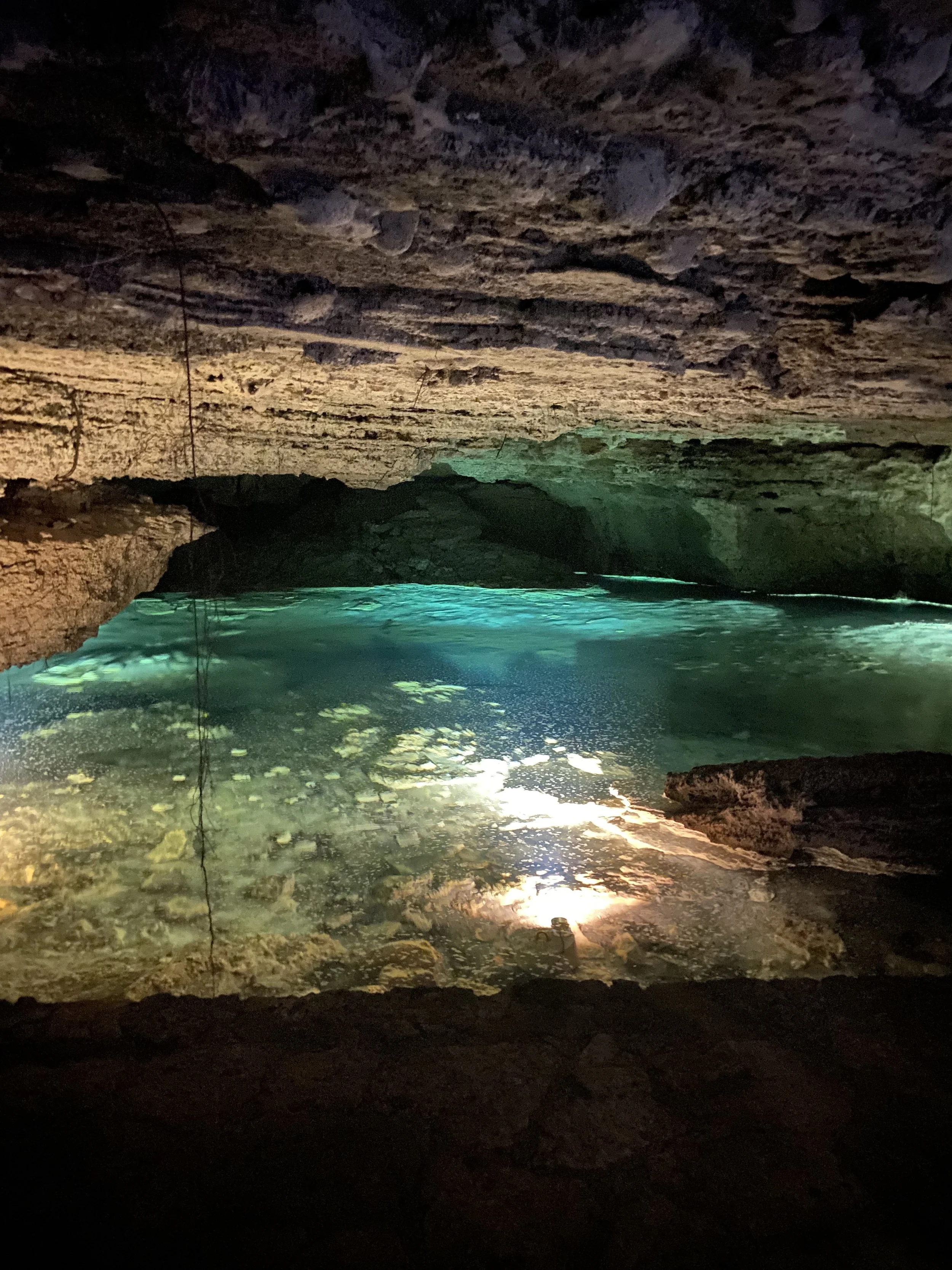 After getting set up I decided that I was going to go to the Pueblito today! Tzvi didn’t want to come with me so he stayed at the pool and read. The Pueblito is the little village within Mayakoba (so you need to leave the hotel, but not the larger complex that has the four hotels). I rode my bike to the front of the hotel and got a (fancier) golf cart to take me to the Pueblito. We drove out of the resort and about one minute into the ride we turned around and went back to the hotel because another family wanted to go to the Pueblito, but then they decided to bike so that was five minutes lost. Anyway, off we went. On the ride the driver asked if I had visited the Cenote – an underground cave next to the Pubelito - and I told him I hadn’t. I decided to go there first. A guide took me down and showed me the clear water that is full of minerals and then a ton of bats. Before we went down he asked me if I was okay with the bats and I was like ‘well, are they ok with me?’ It was very cool.