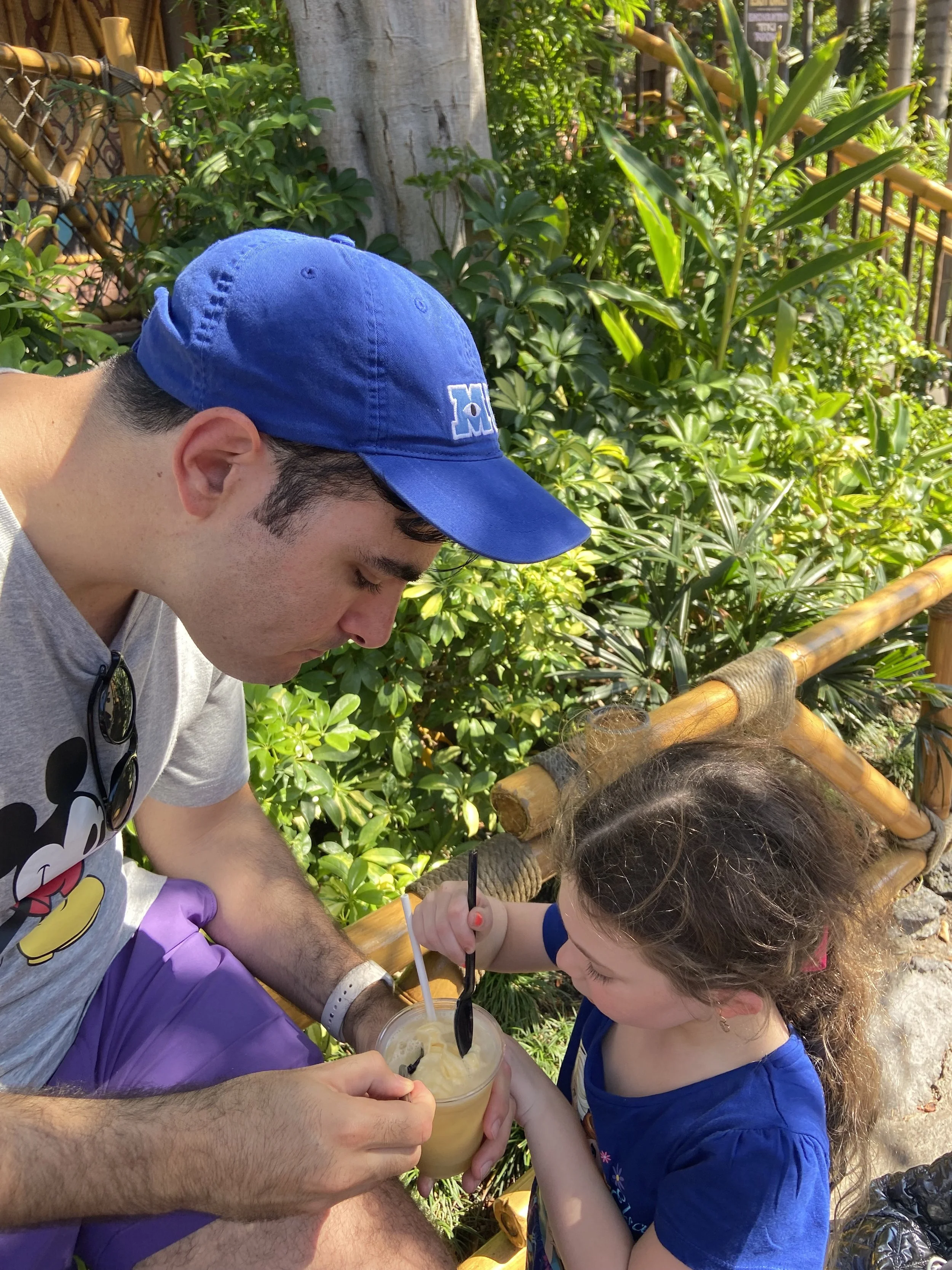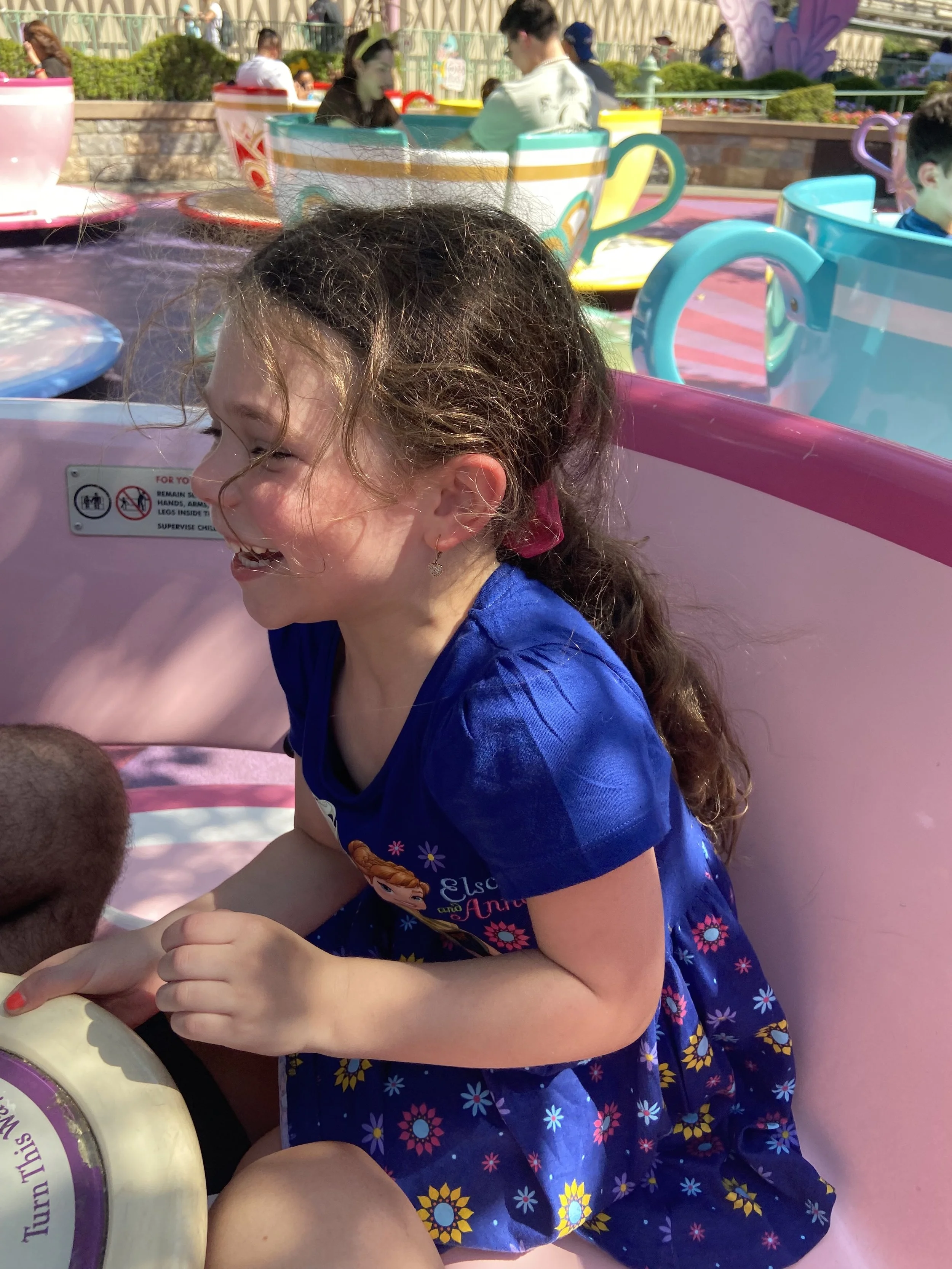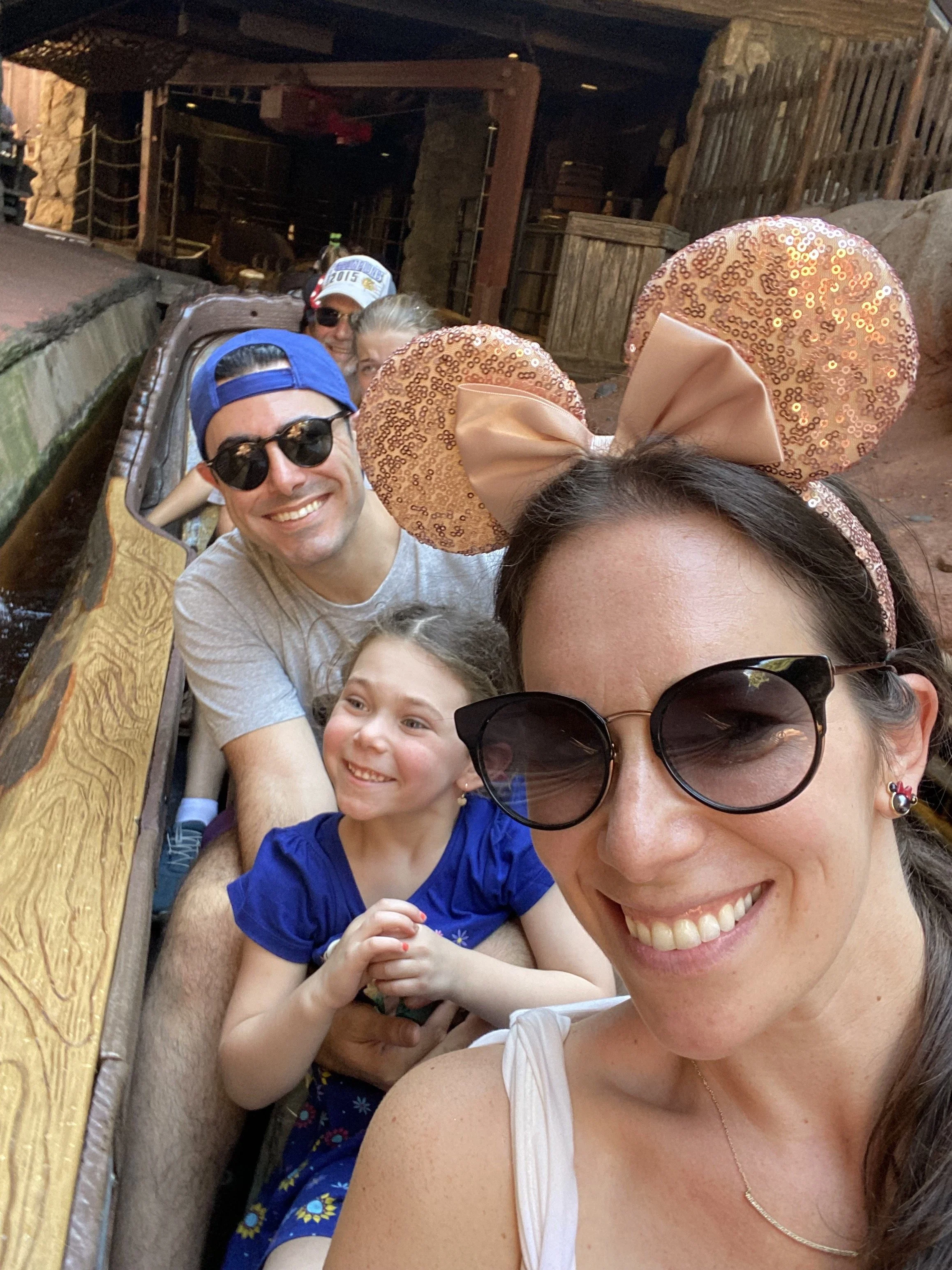 We met back up with the girls and did the teacups ride, then mobile ordered a dole whip, said hi to Alice (in Wonderland), rode Winnie the Pooh, and finished off with Splash Mountain. Hallie was excited to go on Splash Mountain but then we got on and there are a bunch of little drops and Tzvi kept saying ‘this is the big one’ and she kept getting scared, and by the end she was just crying, so she didn’t really enjoy it. Its like he doesn’t even follow Big Little Feelings (which he does, and should know better.) And also we got soaking wet, probably the wettest in years. So Hallie wasn’t thrilled, but then when Robyn asked her how it was, she said it was good. Anyway, I walked around the rest of the night in wet denim. It was pleasant.