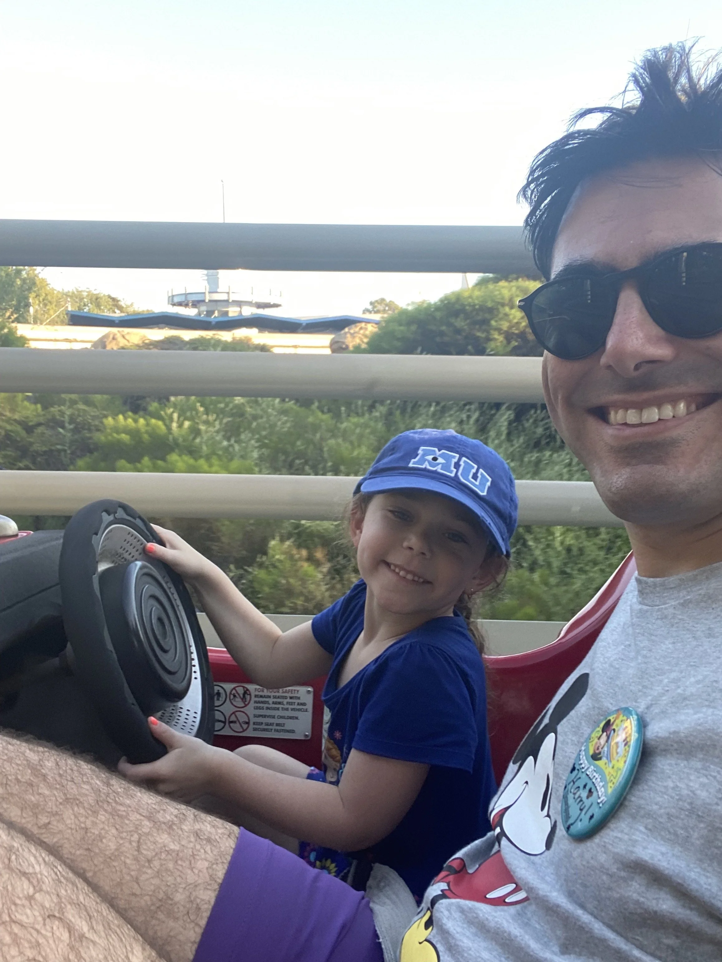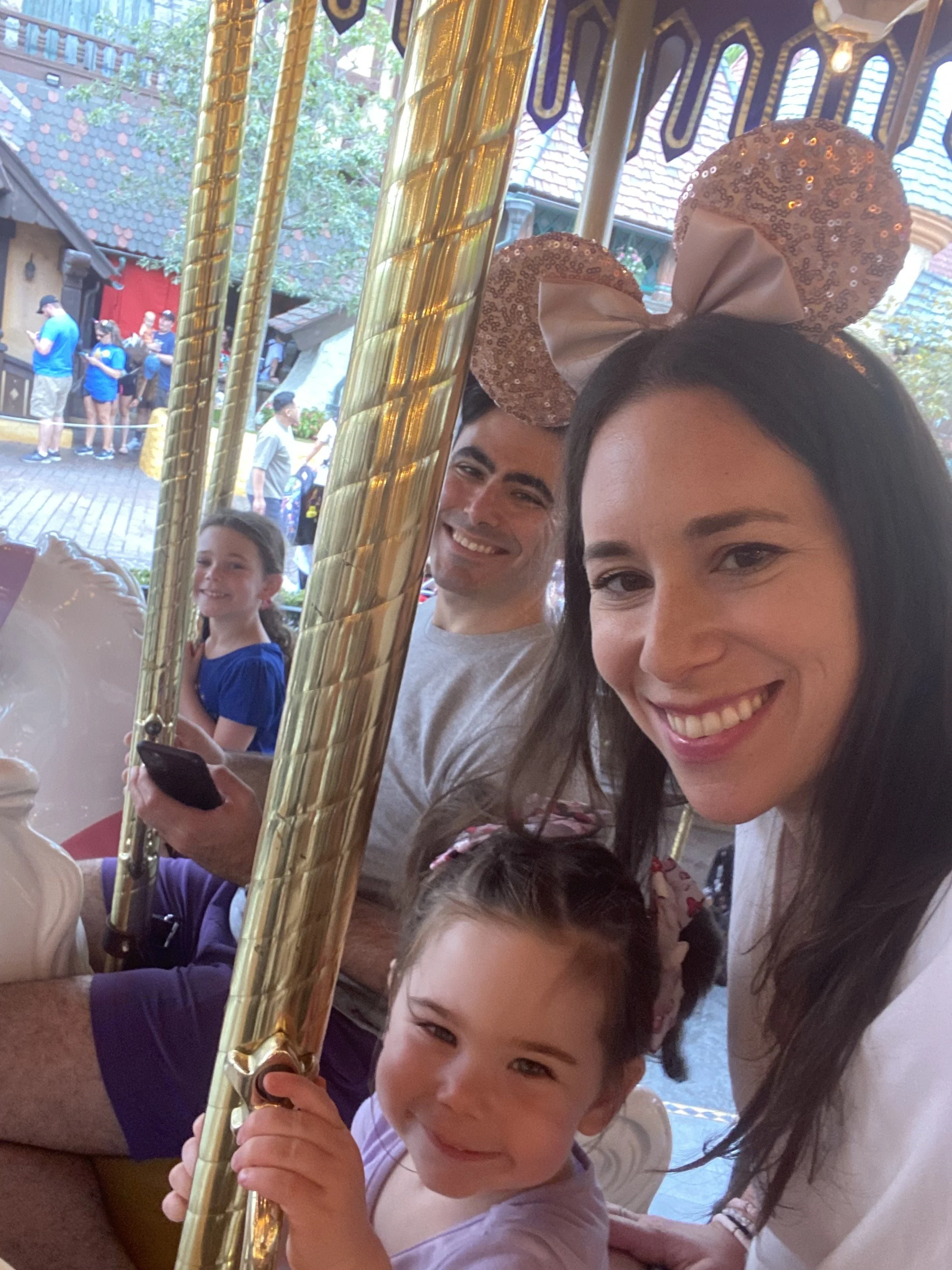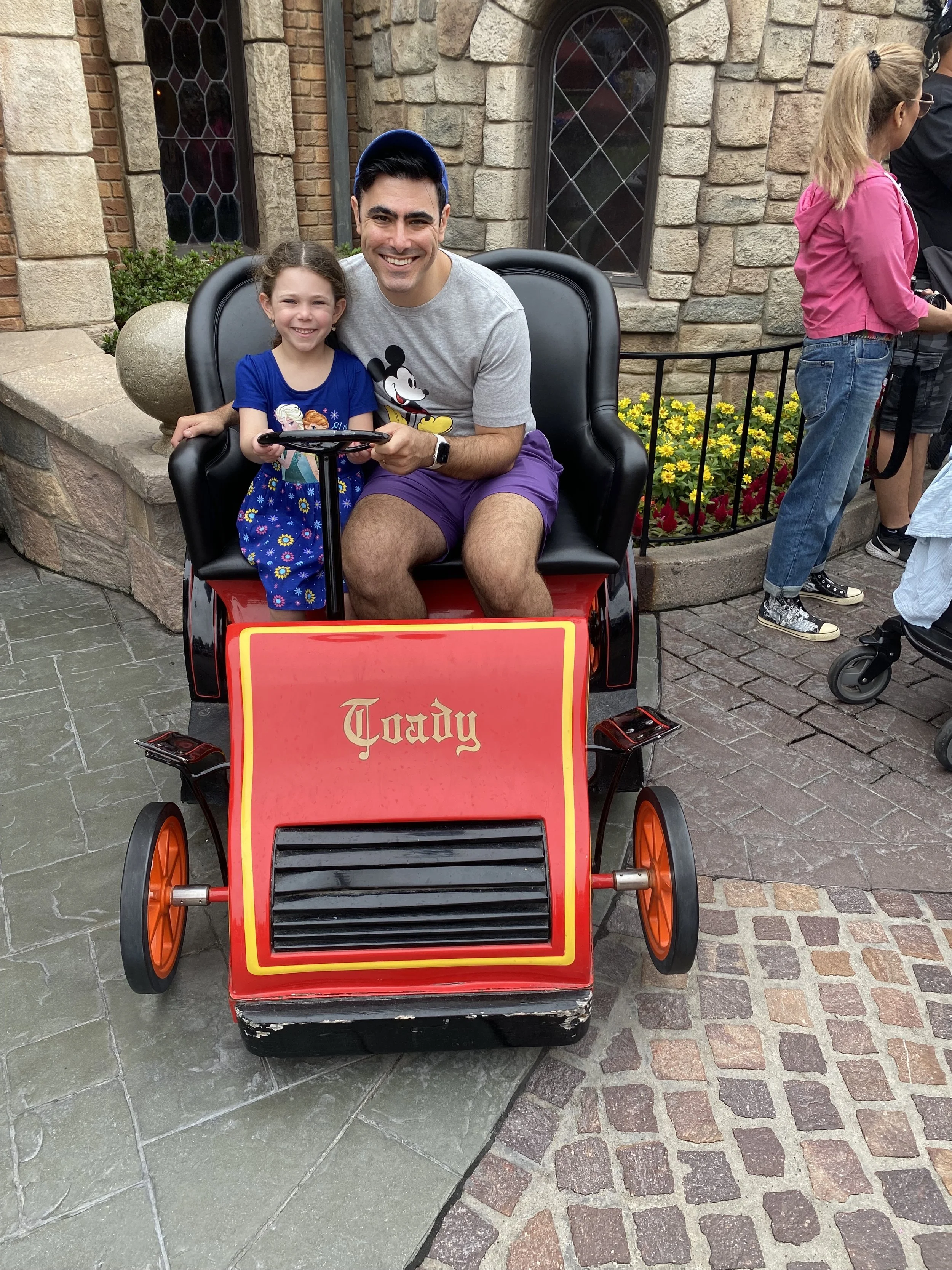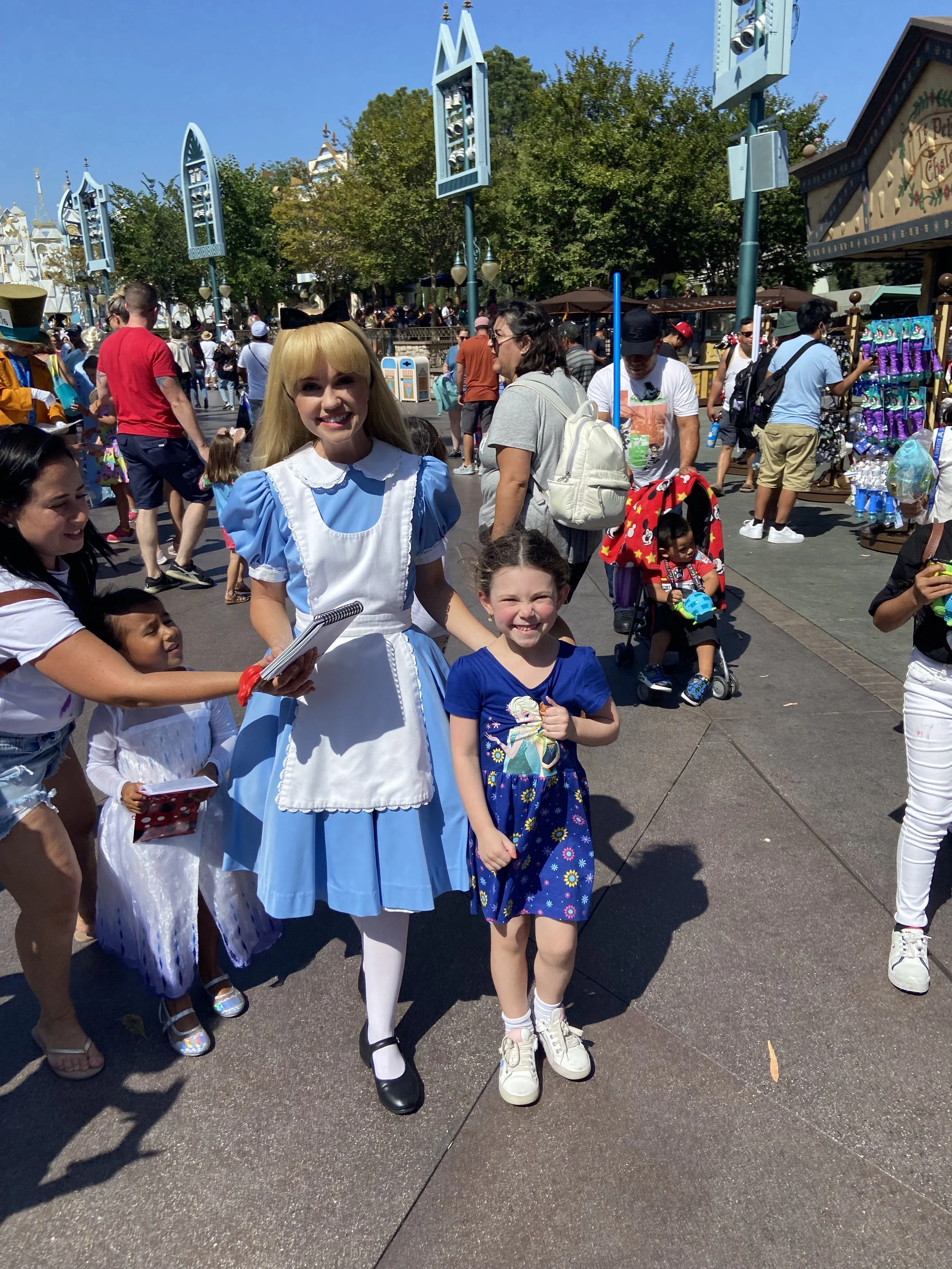 We met back up with the girls and did the teacups ride, then mobile ordered a dole whip, said hi to Alice (in Wonderland), rode Winnie the Pooh, and finished off with Splash Mountain. Hallie was excited to go on Splash Mountain but then we got on and there are a bunch of little drops and Tzvi kept saying ‘this is the big one’ and she kept getting scared, and by the end she was just crying, so she didn’t really enjoy it. Its like he doesn’t even follow Big Little Feelings (which he does, and should know better.) And also we got soaking wet, probably the wettest in years. So Hallie wasn’t thrilled, but then when Robyn asked her how it was, she said it was good. Anyway, I walked around the rest of the night in wet denim. It was pleasant.