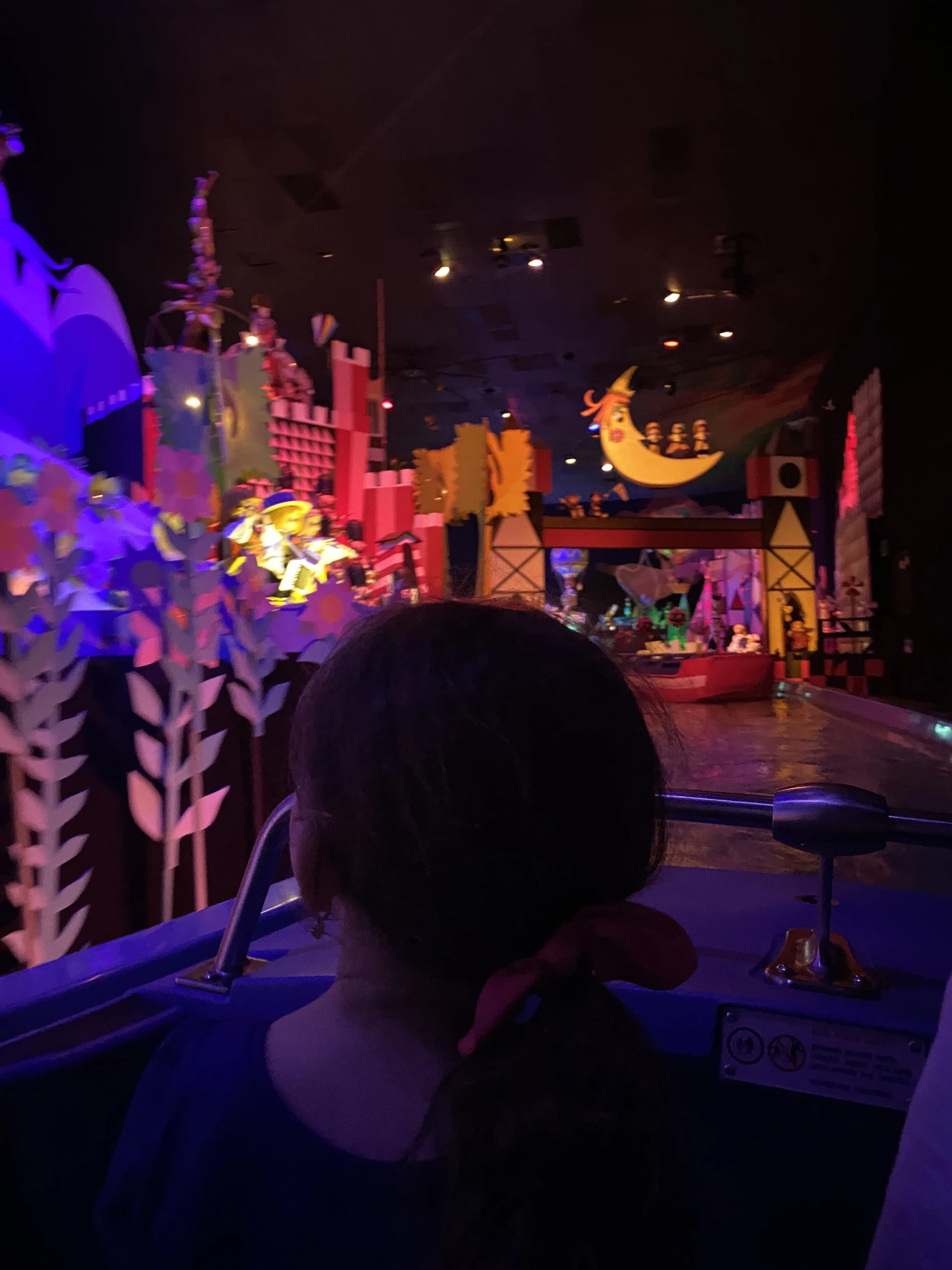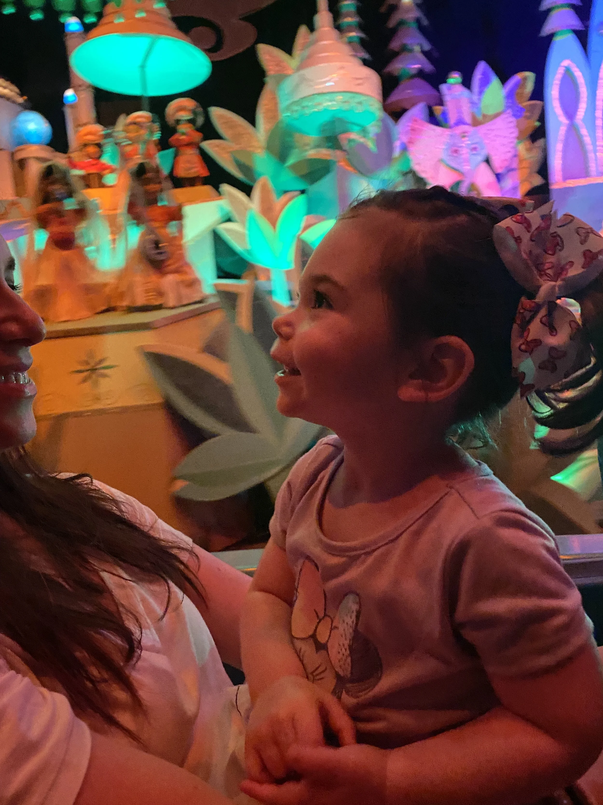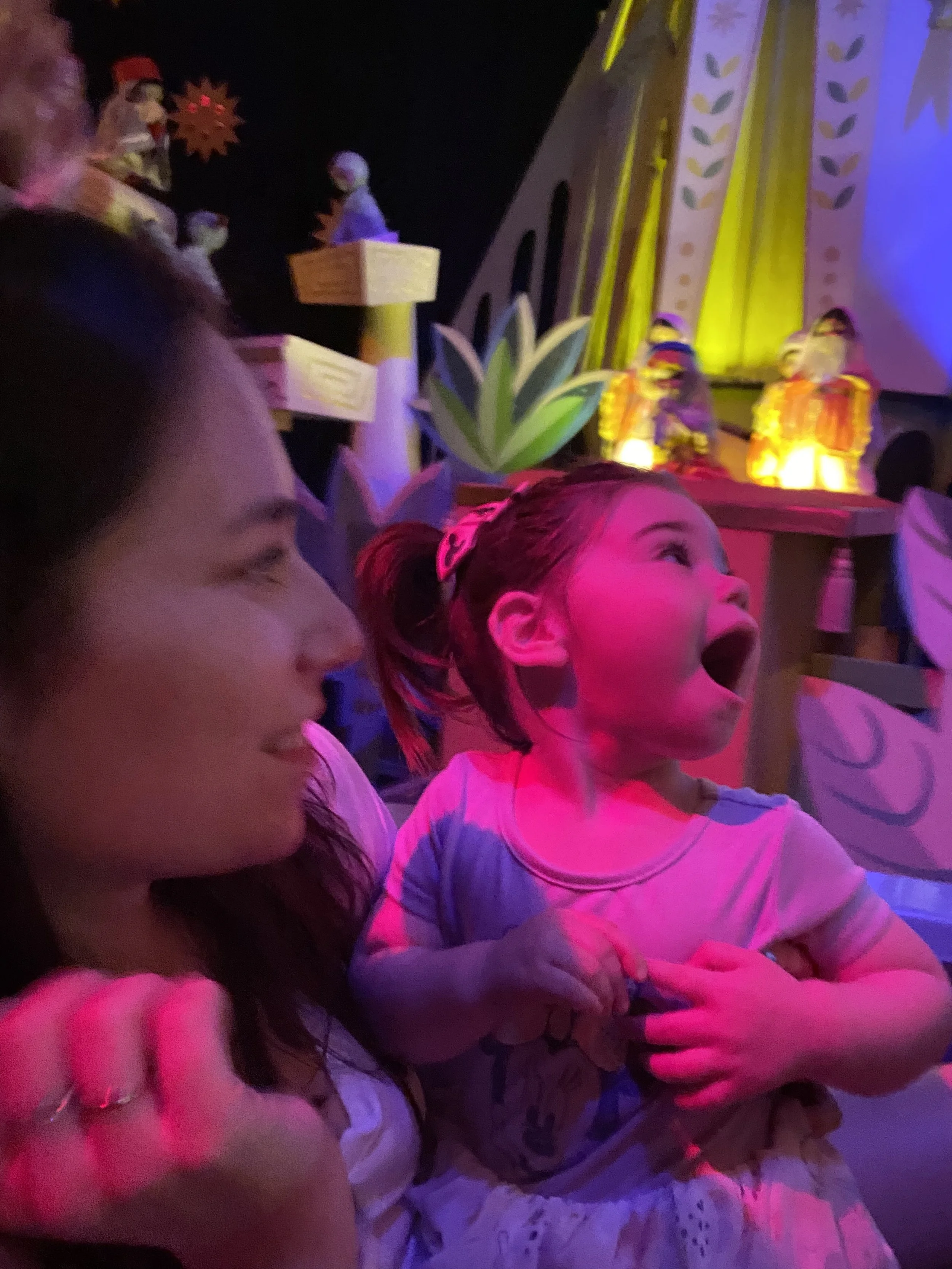We rode a lot of rides. We started with the Carousel, which Madeleine enjoyed. Then we went on Mr. Toad, which neither Hallie nor Madeleine enjoyed; Hallie cried and Madeleine was just scared, though to be fair it is a literal drive through hell. Next we did Small World which both girls loved. I like the Small World here because it has characters from all the Disney movies sprinkled around in each land, so like China has Mulan and Hawaii has Stitch. It’s cute.