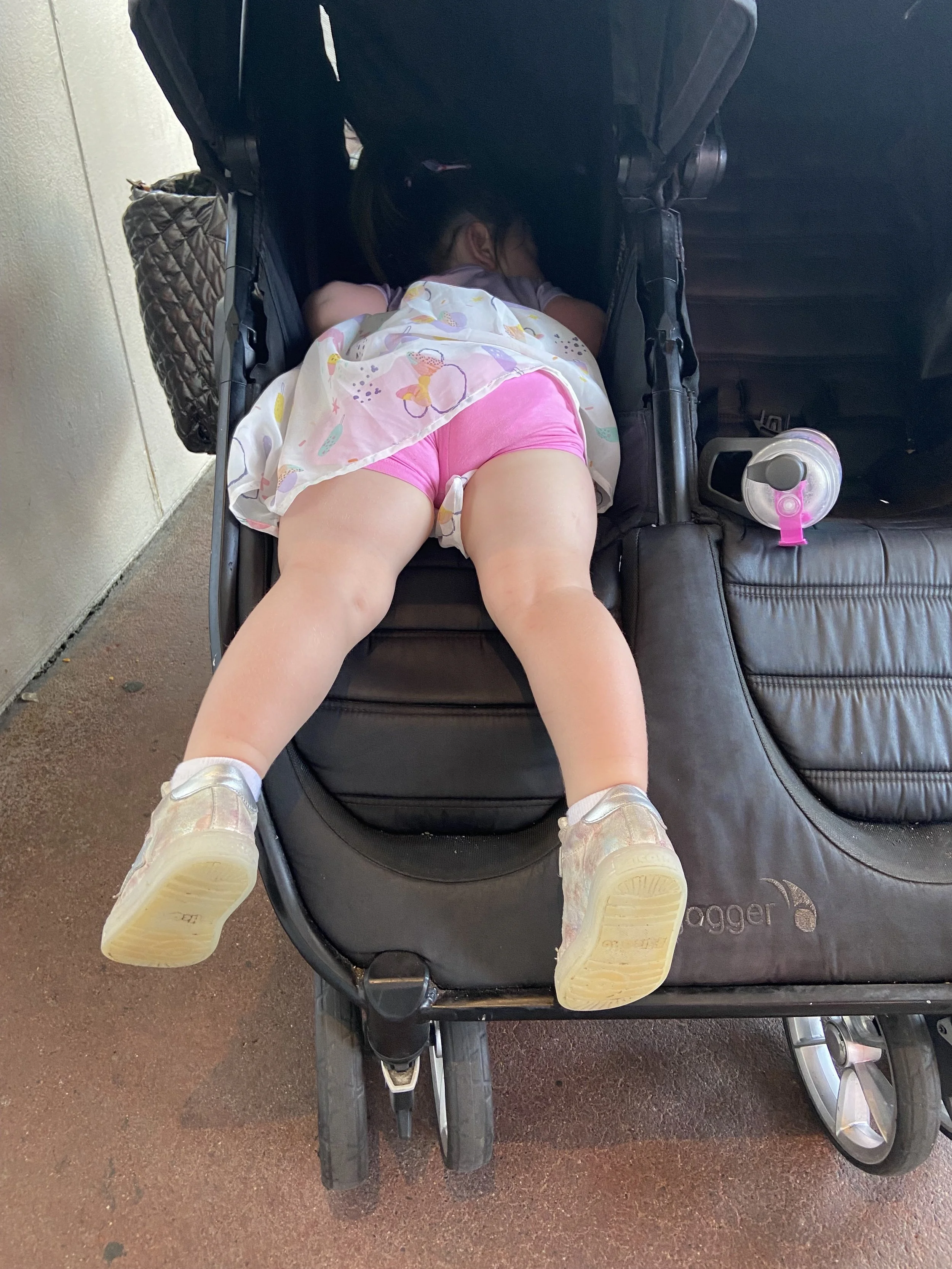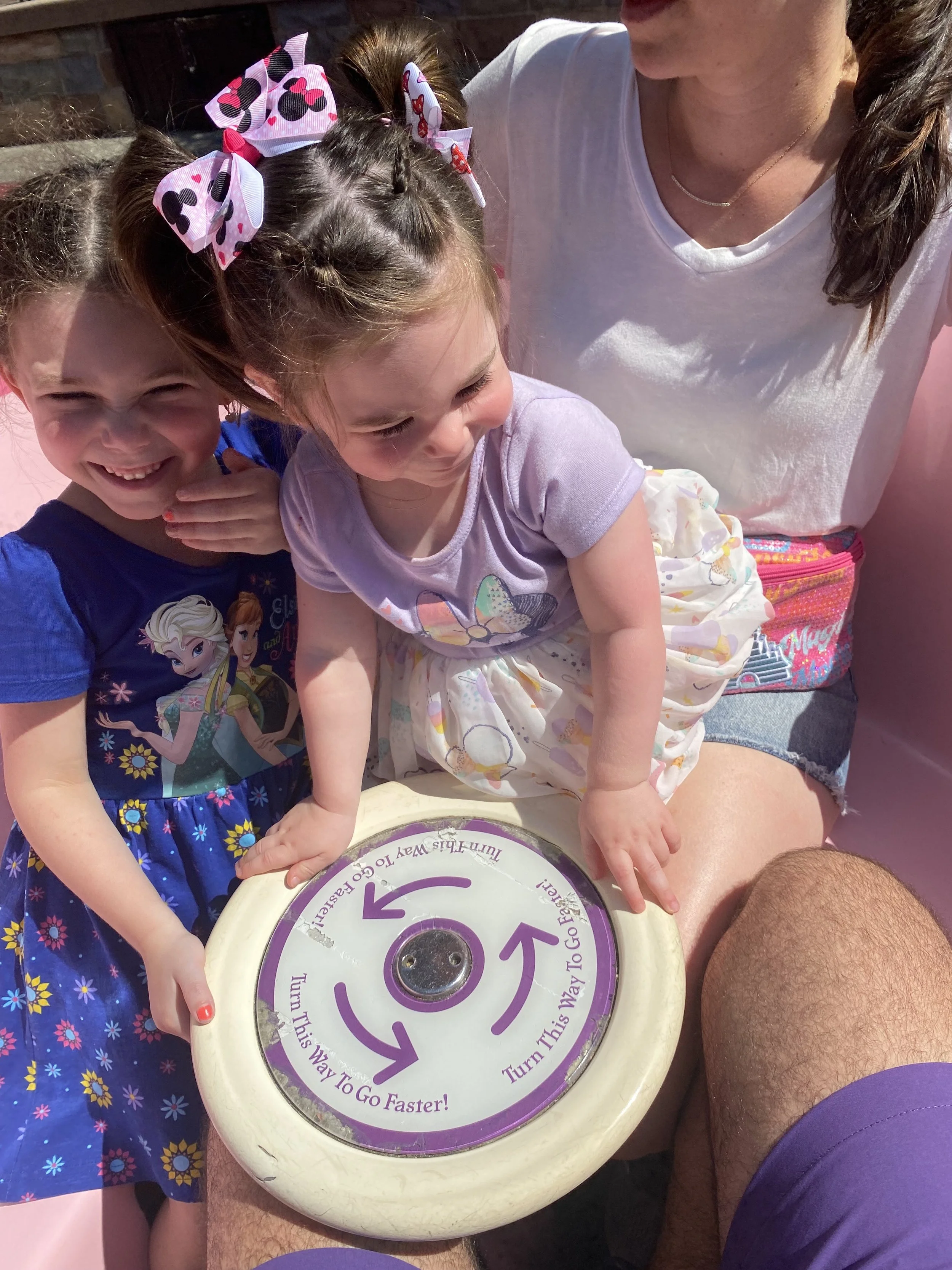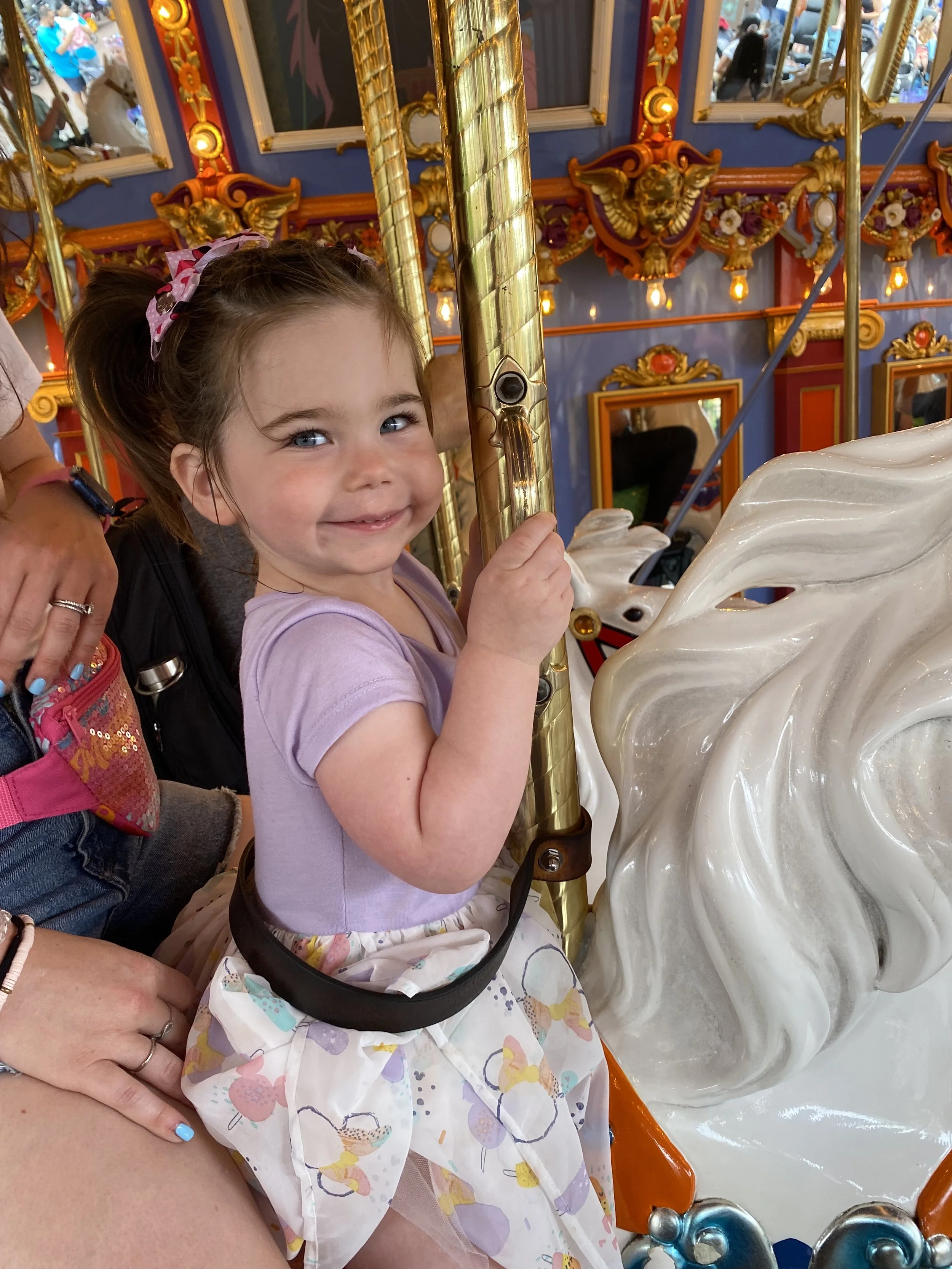 We rode a lot of rides. We started with the Carousel, which Madeleine enjoyed. Then we went on Mr. Toad, which neither Hallie nor Madeleine enjoyed; Hallie cried and Madeleine was just scared, though to be fair it is a literal drive through hell. Next we did Small World which both girls loved. I like the Small World here because it has characters from all the Disney movies sprinkled around in each land, so like China has Mulan and Hawaii has Stitch. It’s cute.