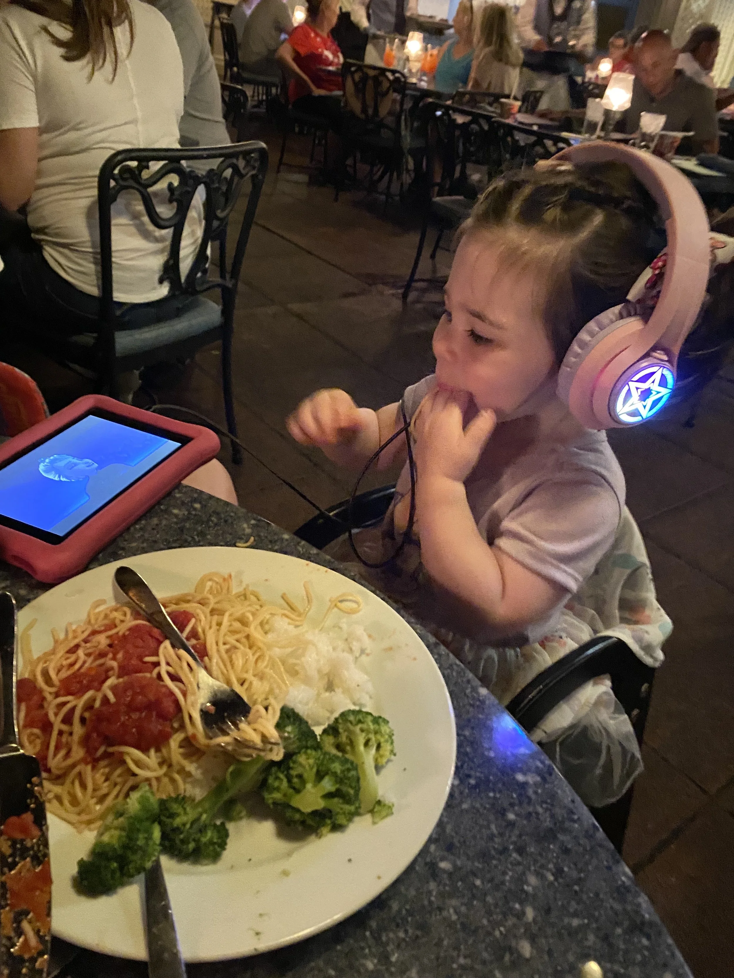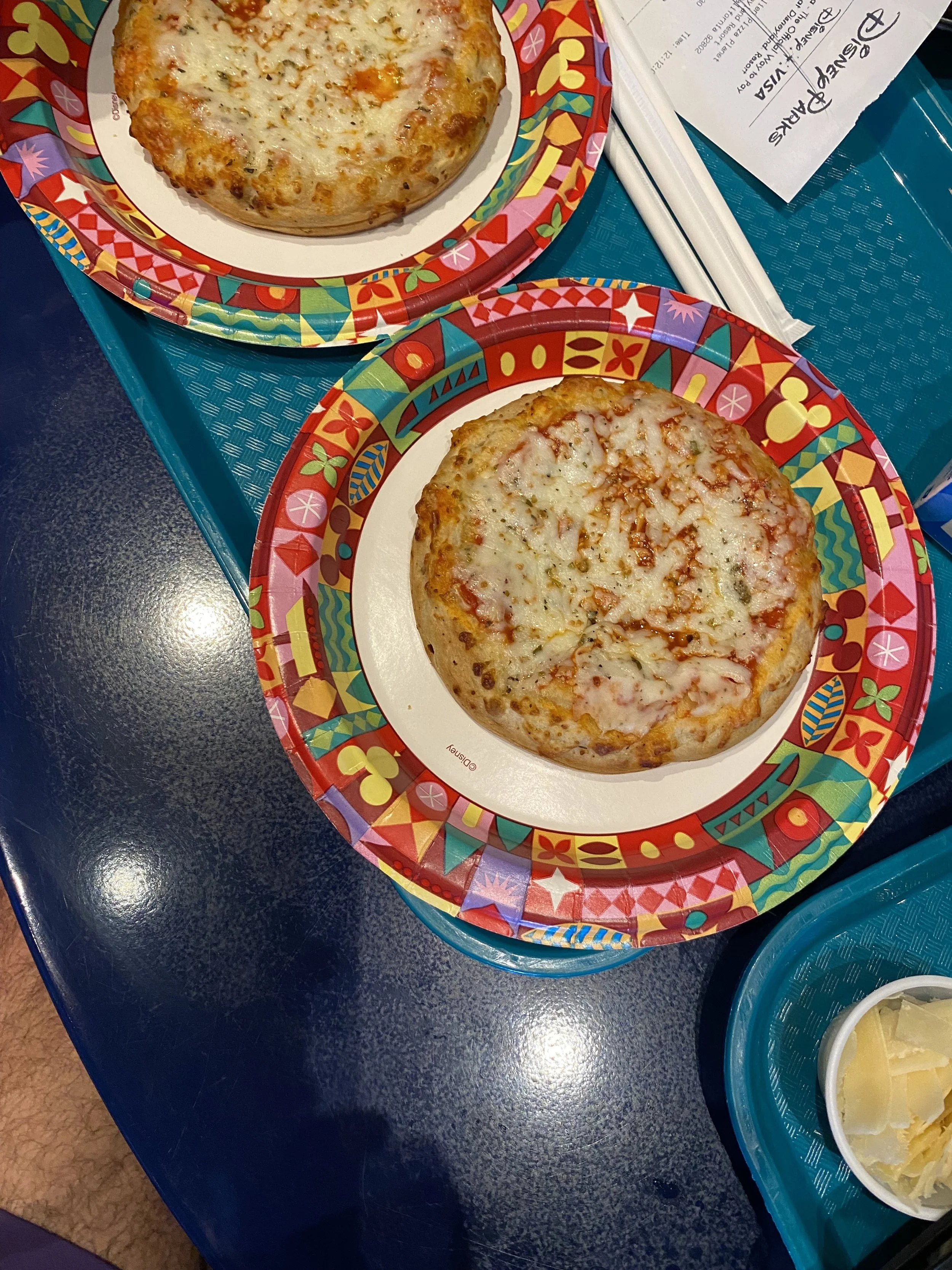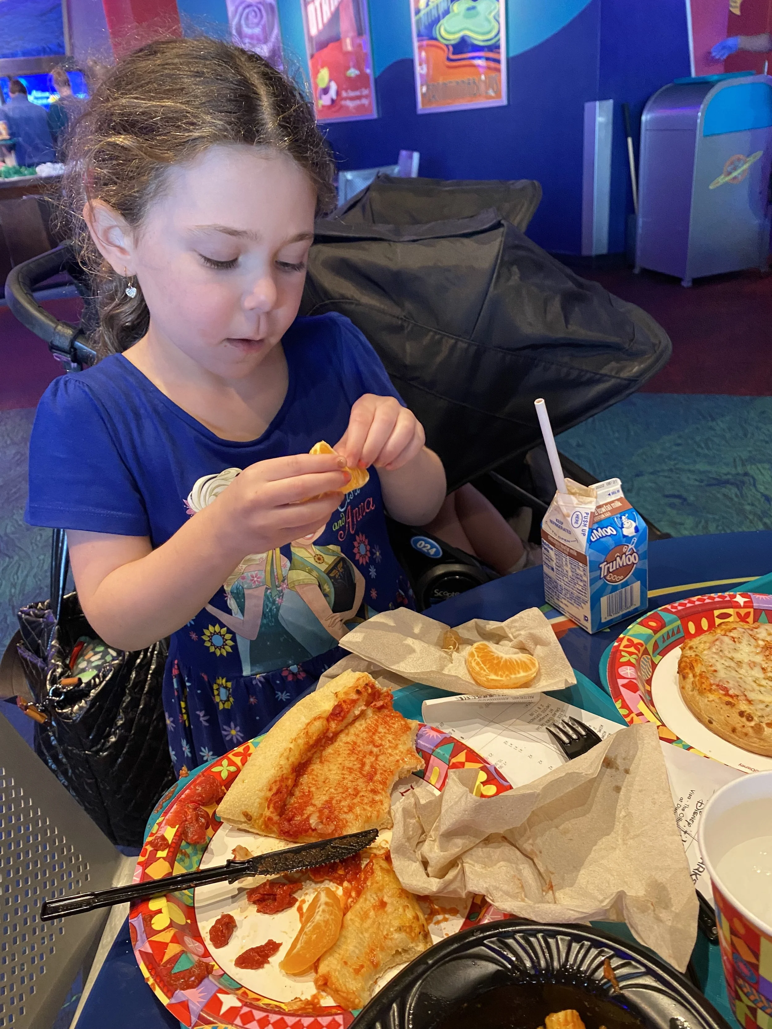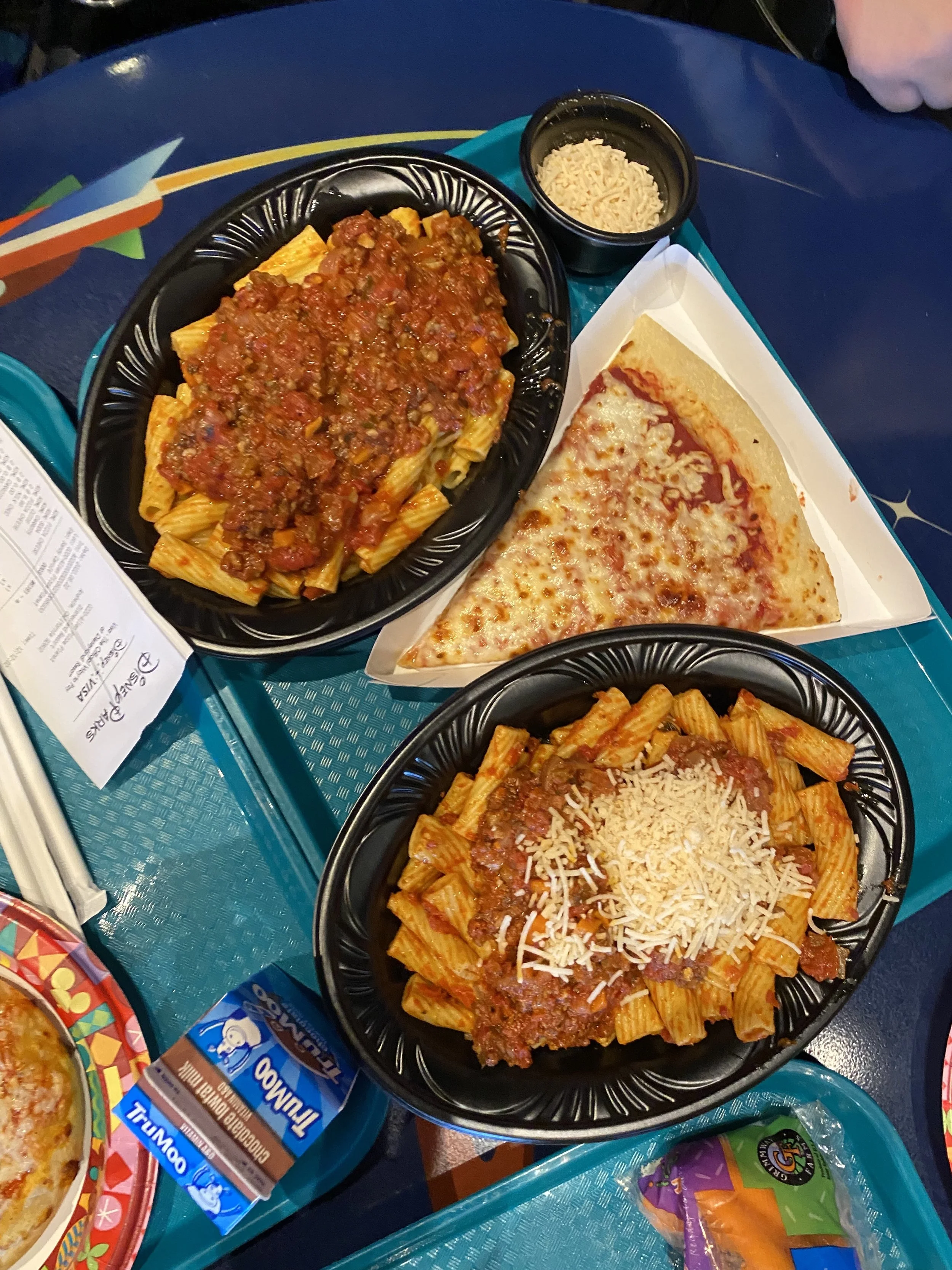 For lunch we couldn’t decide what we were going to eat and finally got on line at the Alien Pizza Planet restaurant where we got pizza and pasta with impossible Bolognese, which was actually pretty good. Hallie didn’t like the small round kids pizza and wanted to eat Tzvi’s regular slice, so she took off all of the cheese and ate half of it, then said she was done, which killed Tzvi. Madeleine napped through all of this.