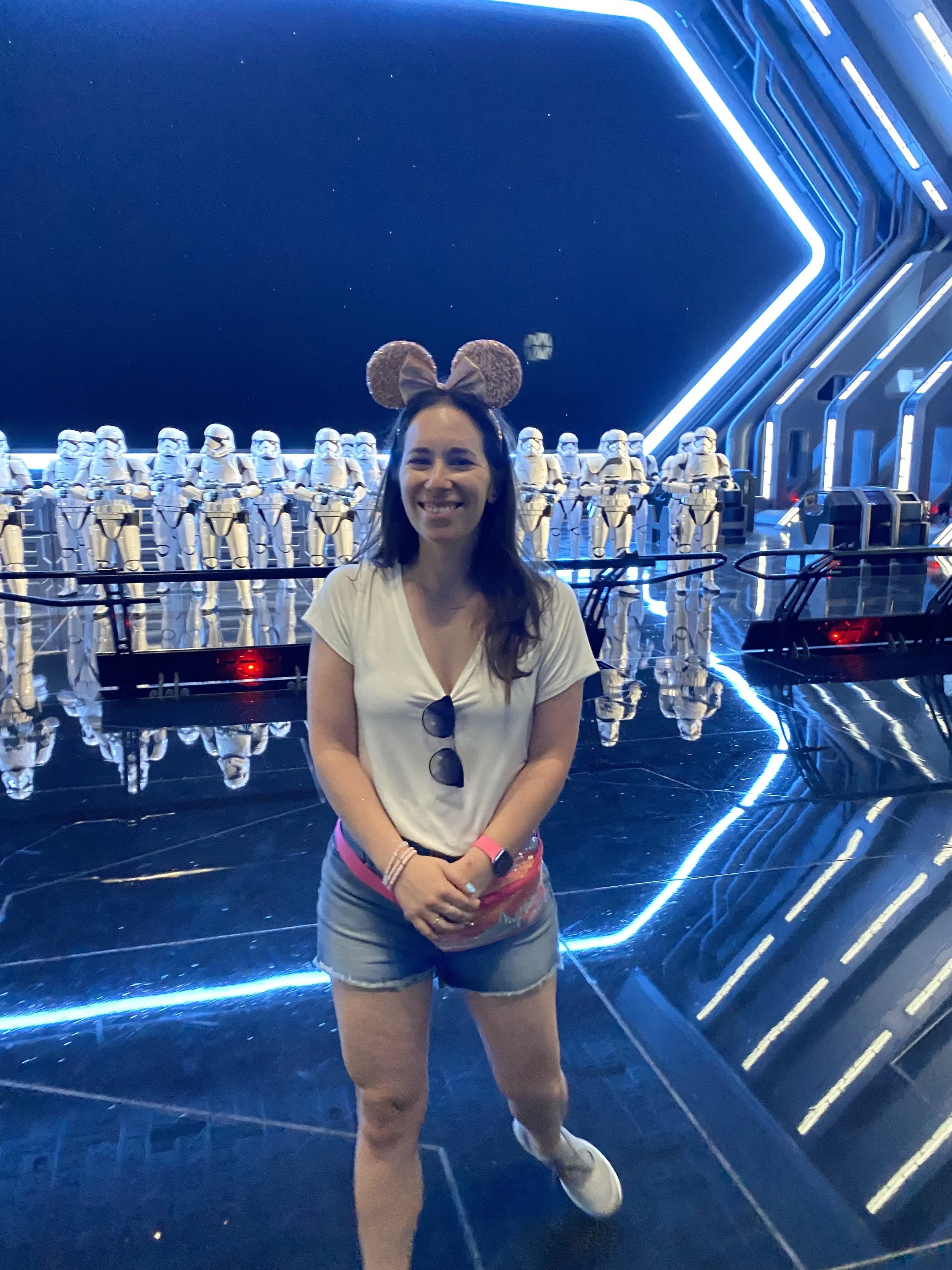After that it was time for Star Wars Rise of the Resistance. We had to pay $20 to get the Lightening Lane on that one (it’s not included in the regular Genie +), but it was totally worth it. Such a phenomenal ride. It’s the same as Disney World, and they’ve really recreated Galaxy’s Edge the same as Disney World as well. We found another photo pass photographer and he started asking us to do all these different poses and it ended up basically as a whole photo shoot. I should have brought outfit changes. It felt kind of like we were on a cruise ship.