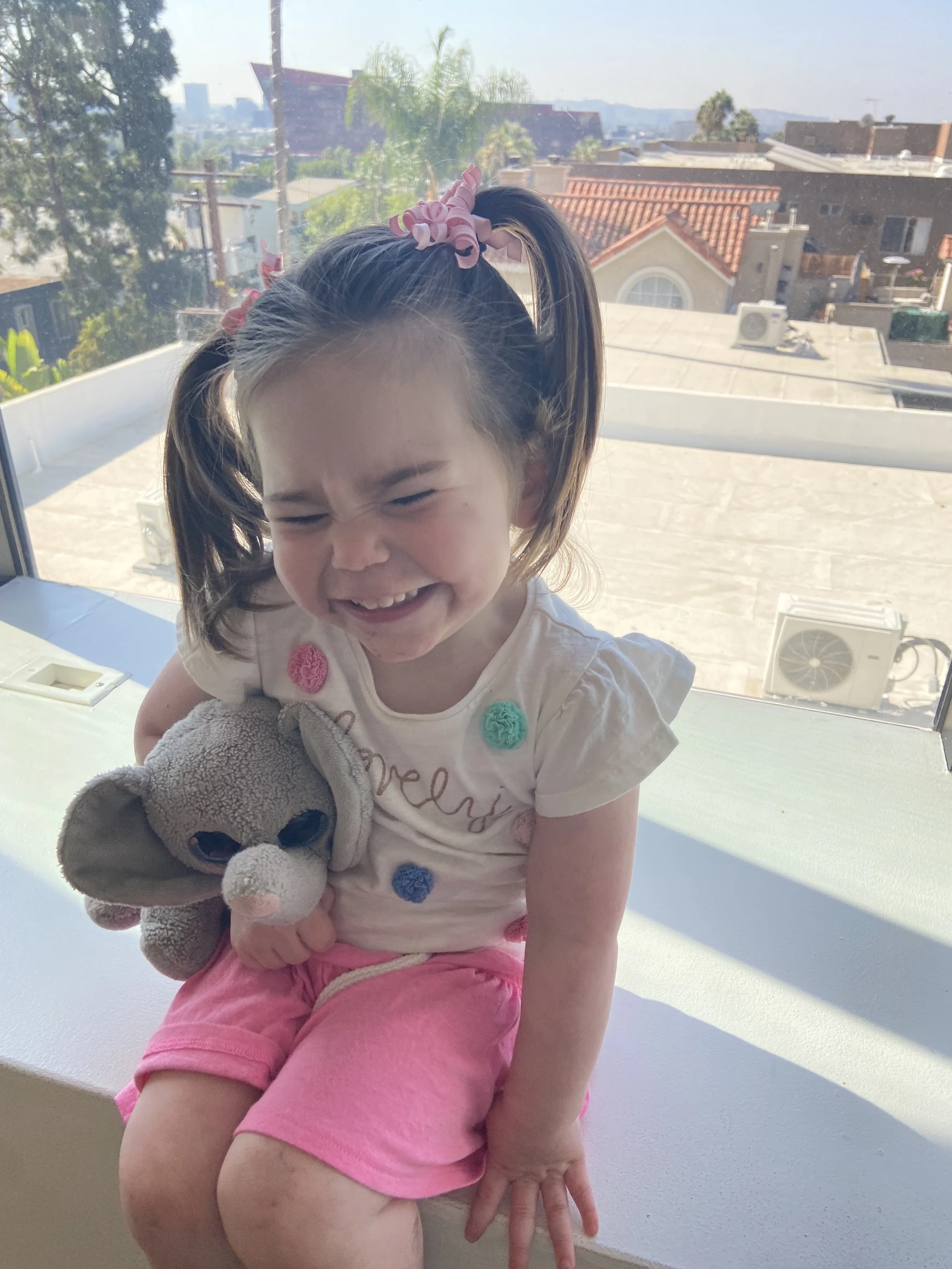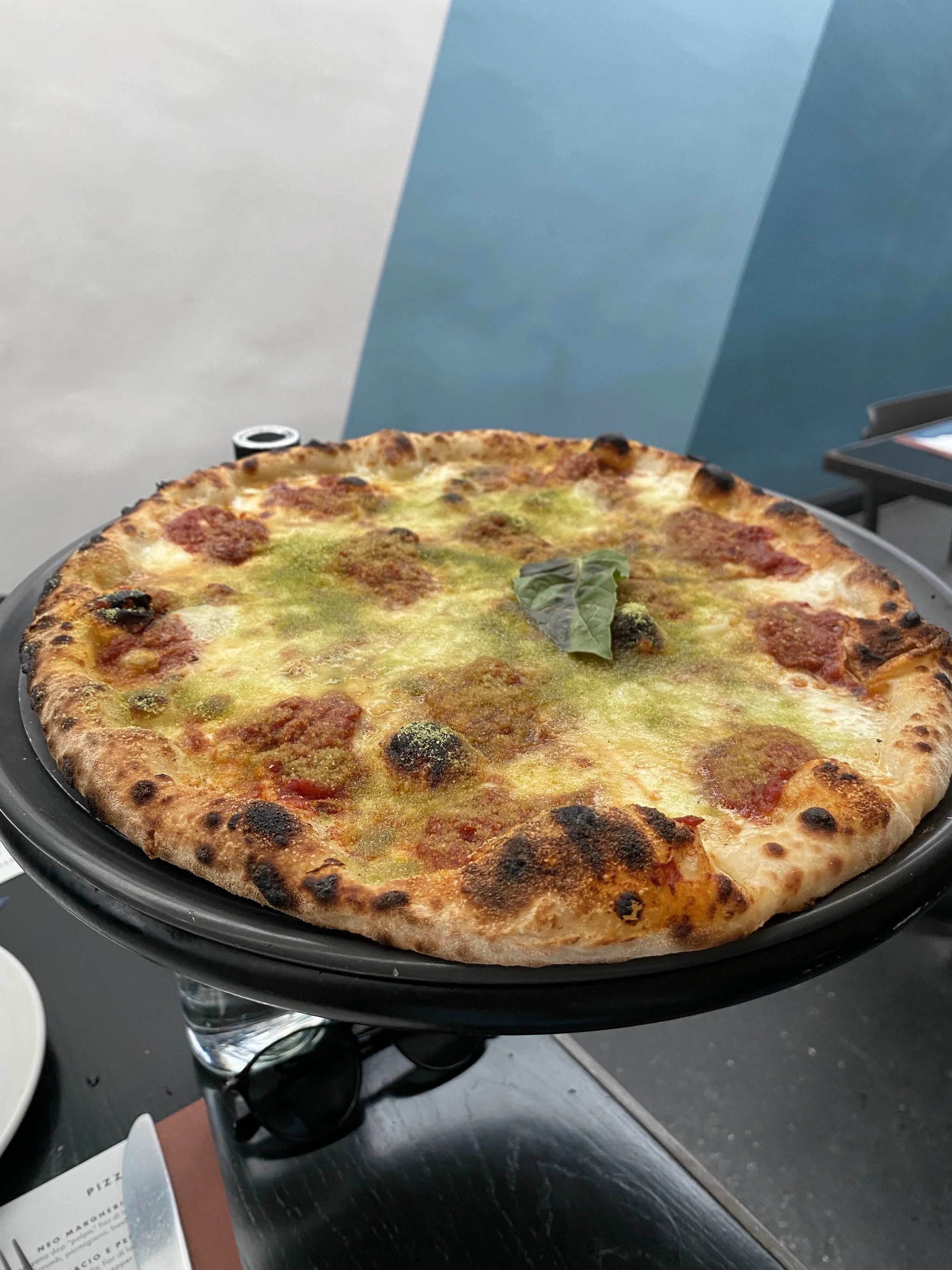 From there we drove to Beverly Hills and Madeleine fell asleep in the car. We were still hungry, so we stopped at Pizzana, a pizza place that Tzvi had read about and that was supposed to be really good. They only had outdoor seating, but it wasn’t too bad, though it was hot enough for the waiter to give Hallie a free lemonade. We ordered a margherita pizza and a “neo-margherita” pizza. [Tzvi: both were very good. The neo-margherita was kind of like an inverted margherita, with cheese on the bottom and tomato sauce dolloped on top. There was also basil breadcrumbs and it was kind of spicy.]. We also had a brussels sprouts salad that was very good. We ordered a fried cauliflower, but it never came. Womp Womp.